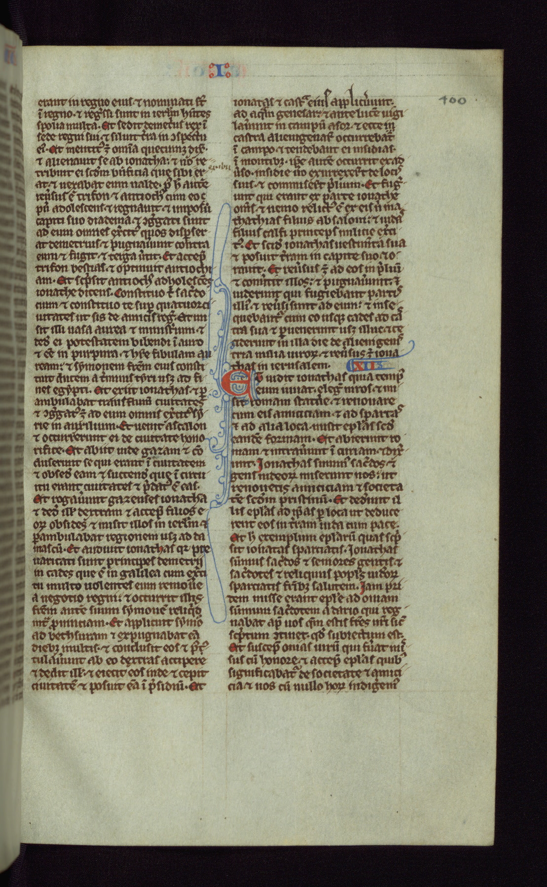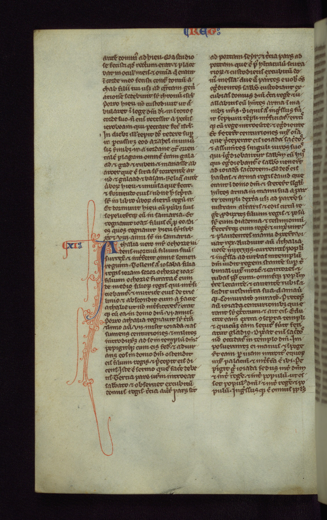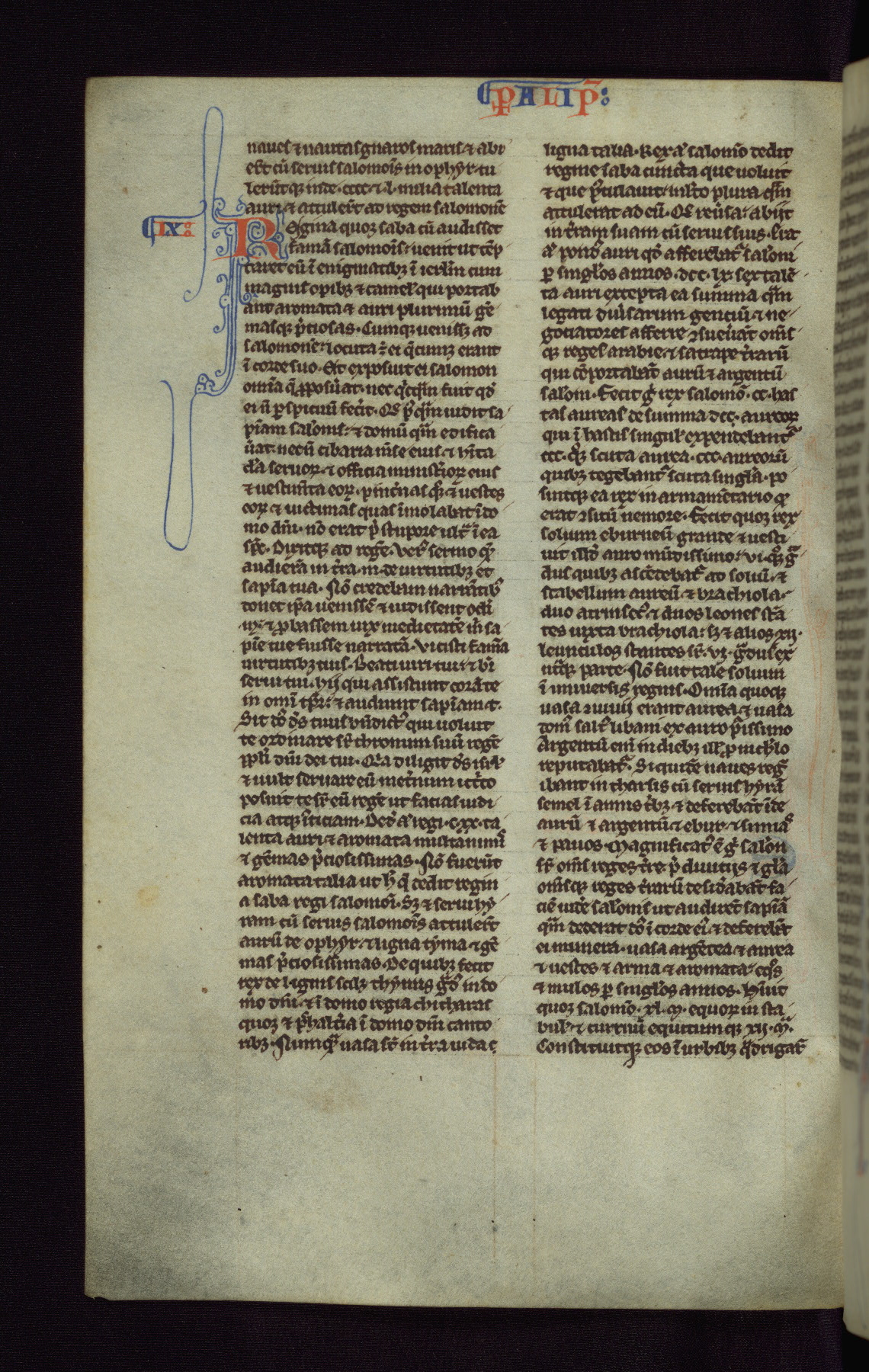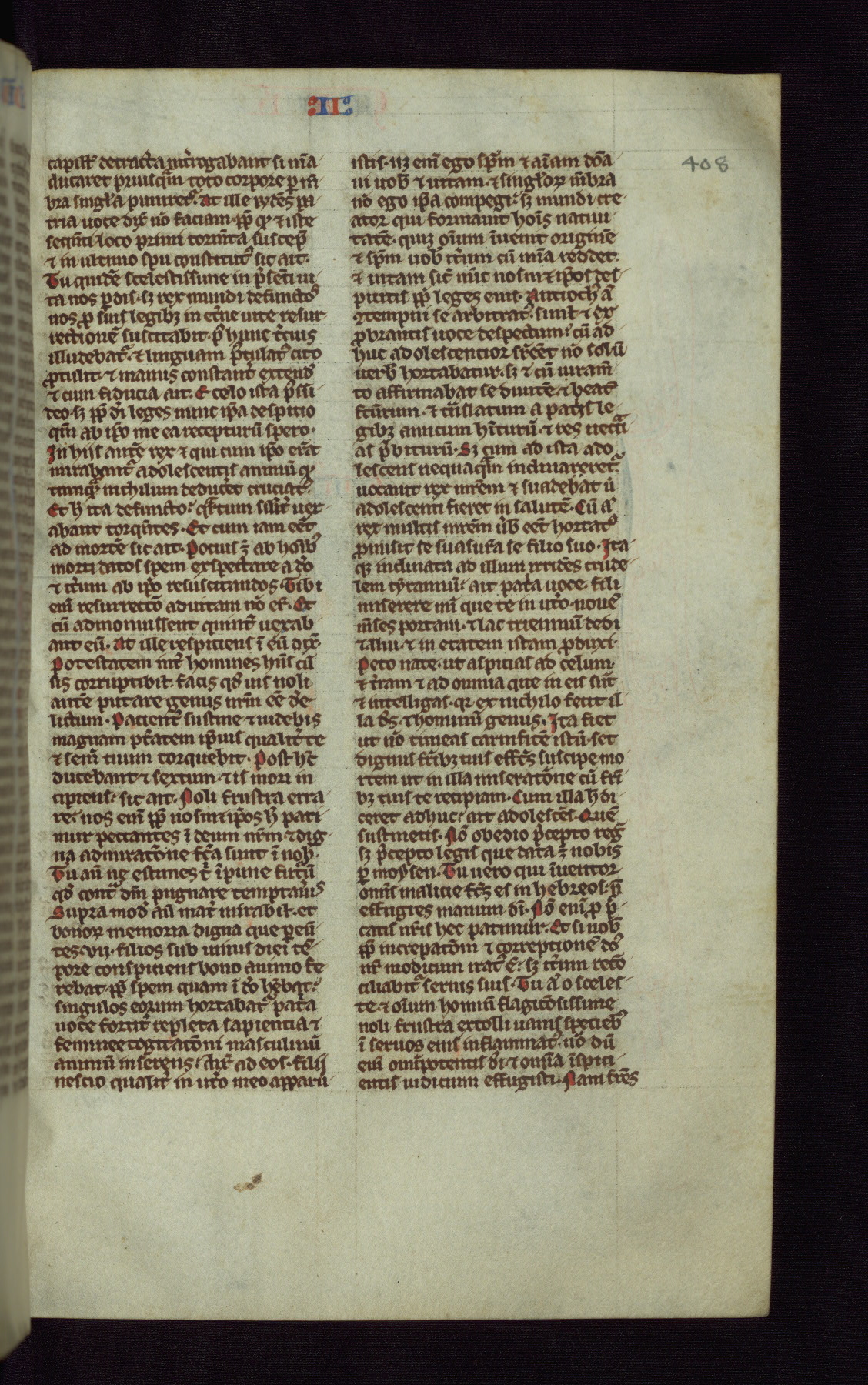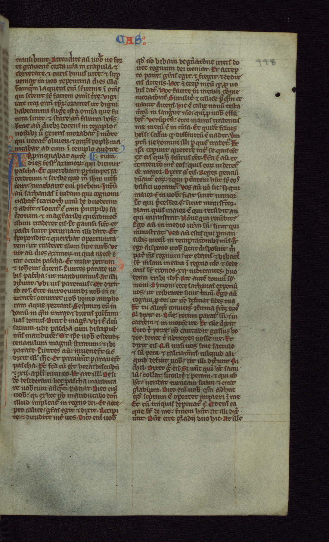 This pocket-size Bible was created around the middle of the thirteenth century in England. It contains the Vulgate text of the Old and New Testaments, arranged in order and divided into chapters. Such Bibles, designed for individual rather than institutional use, began to be created on a large scale during the thirteenth century, especially in Paris. This manuscript is illuminated with a large number of small historiated initials, and also includes a somewhat later image of the Three Living and the Three Dead, a popular scene based on a French poem of the same century.
