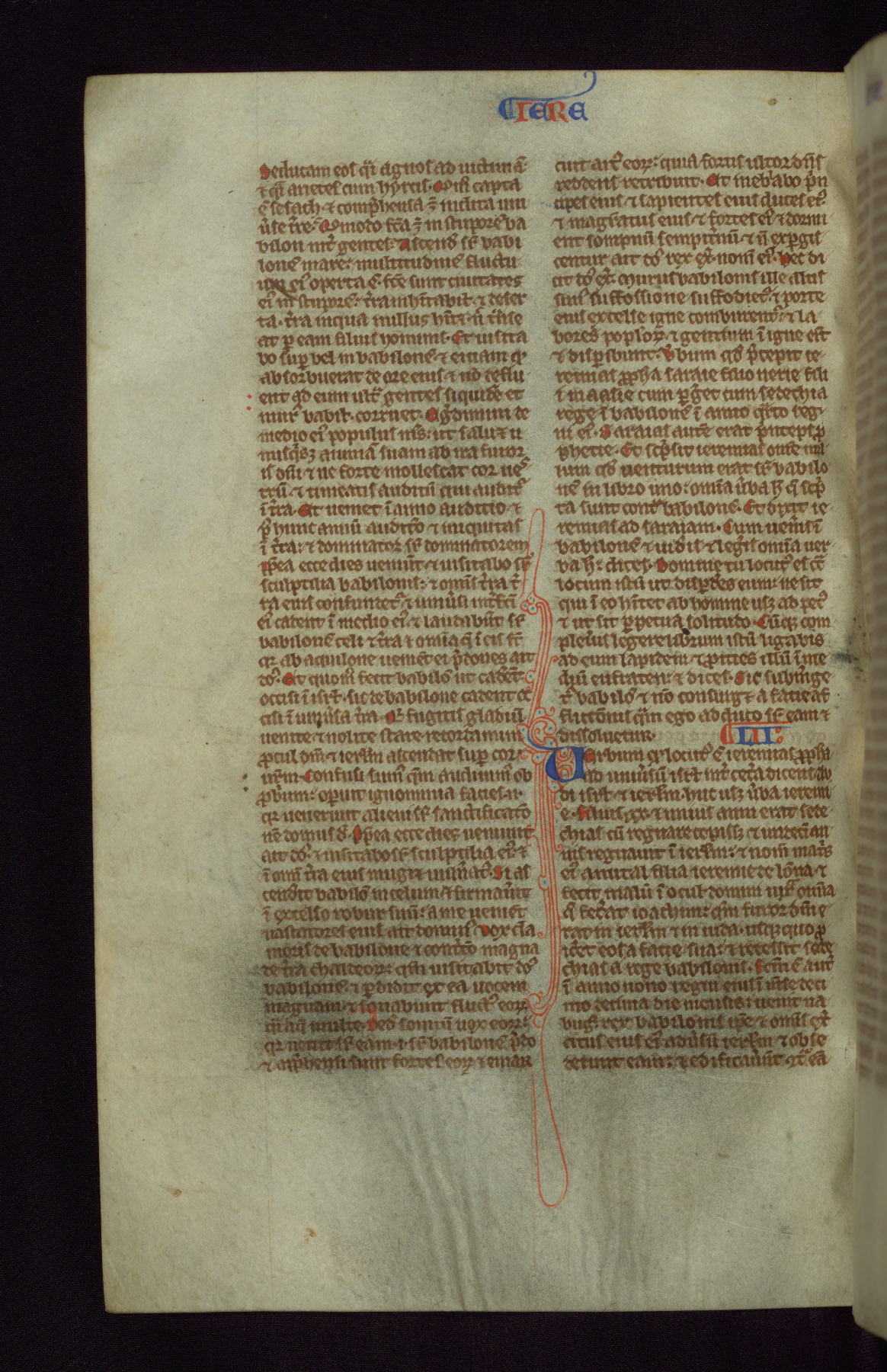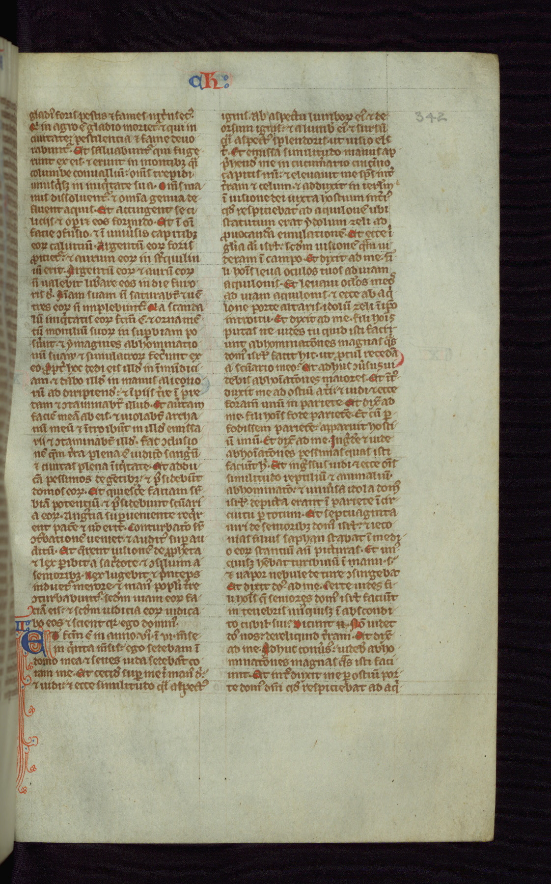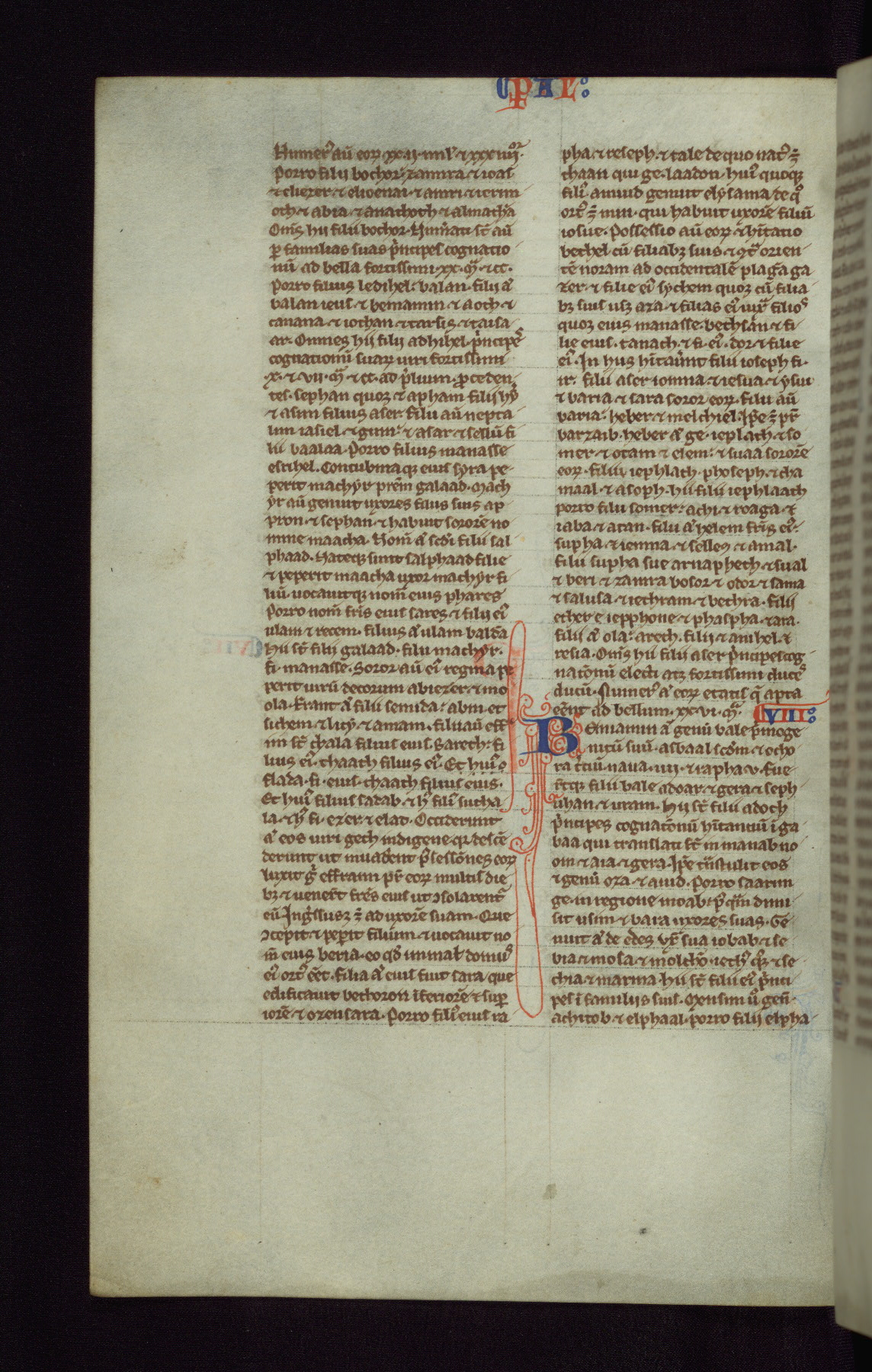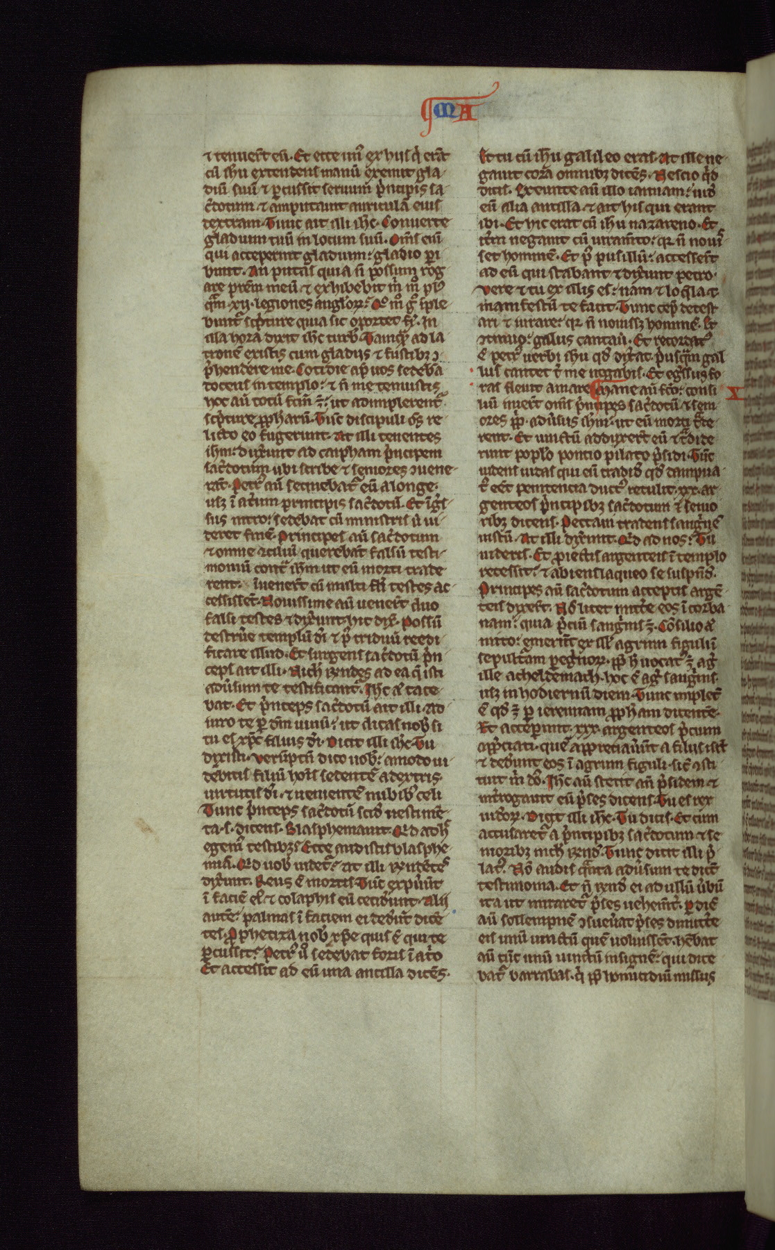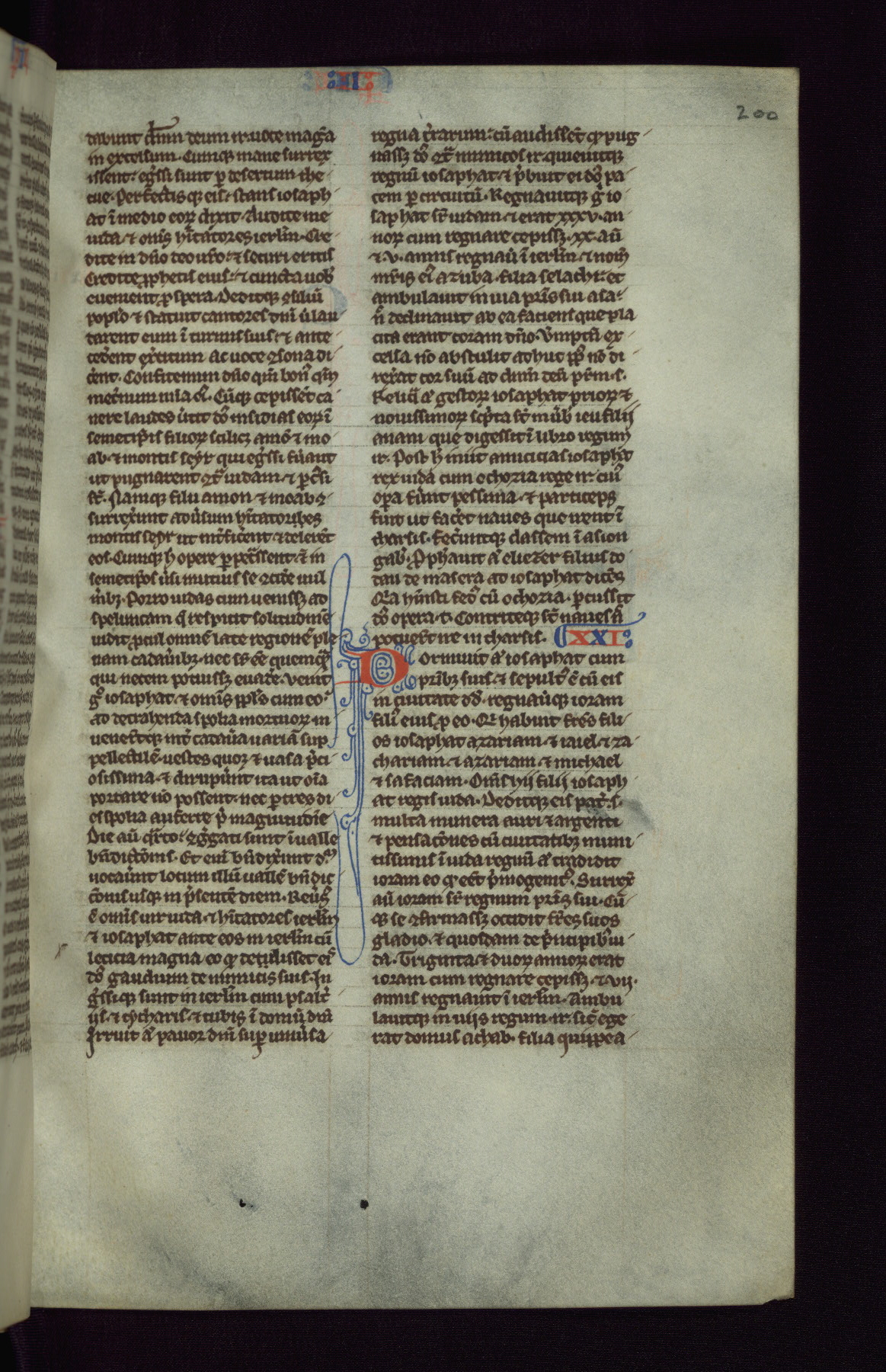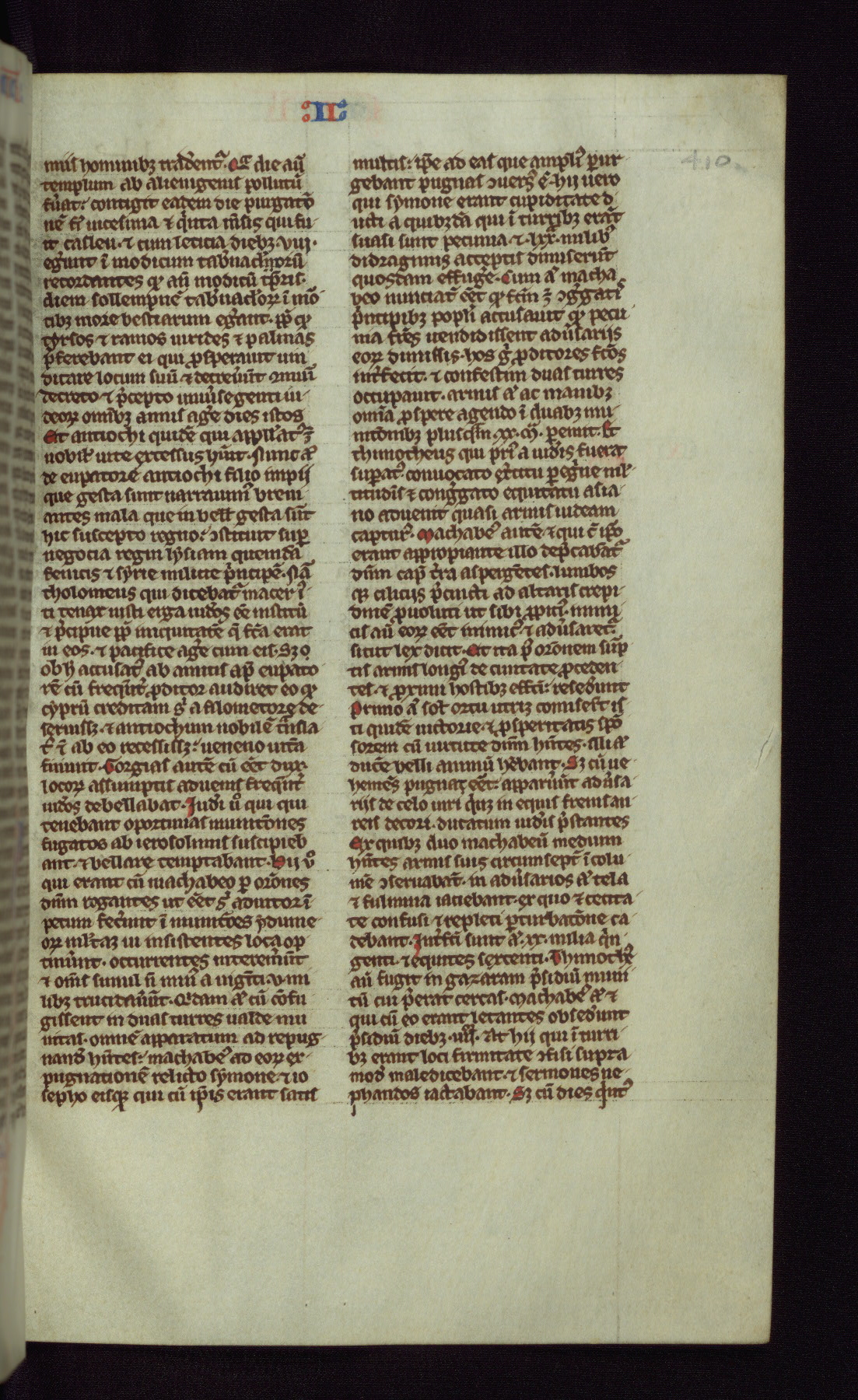 This pocket-size Bible was created around the middle of the thirteenth century in England. It contains the Vulgate text of the Old and New Testaments, arranged in order and divided into chapters. Such Bibles, designed for individual rather than institutional use, began to be created on a large scale during the thirteenth century, especially in Paris. This manuscript is illuminated with a large number of small historiated initials, and also includes a somewhat later image of the Three Living and the Three Dead, a popular scene based on a French poem of the same century.