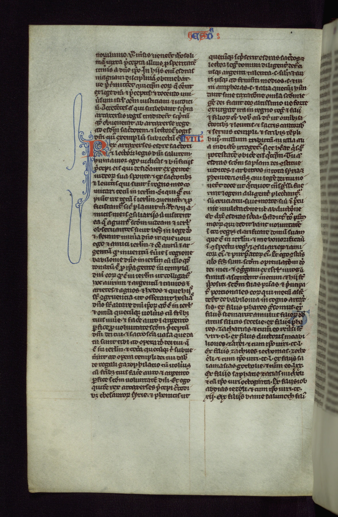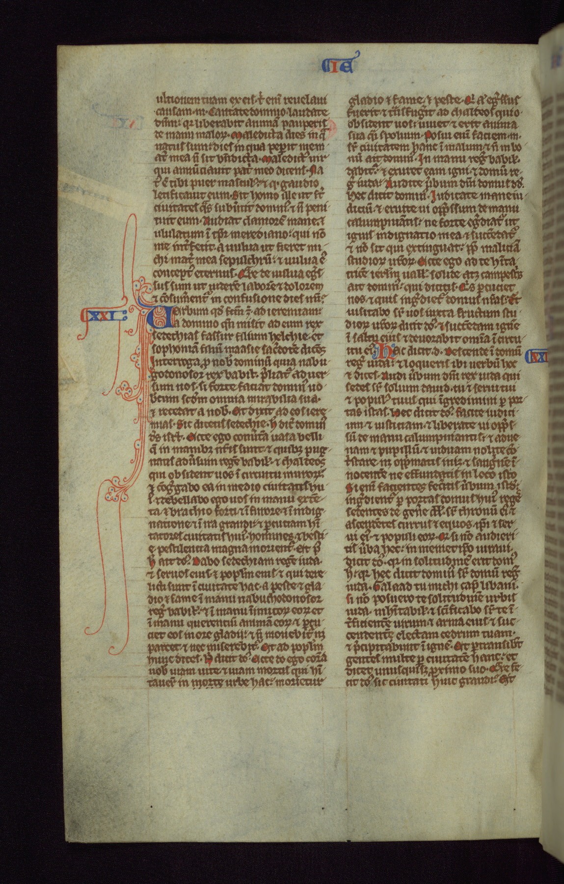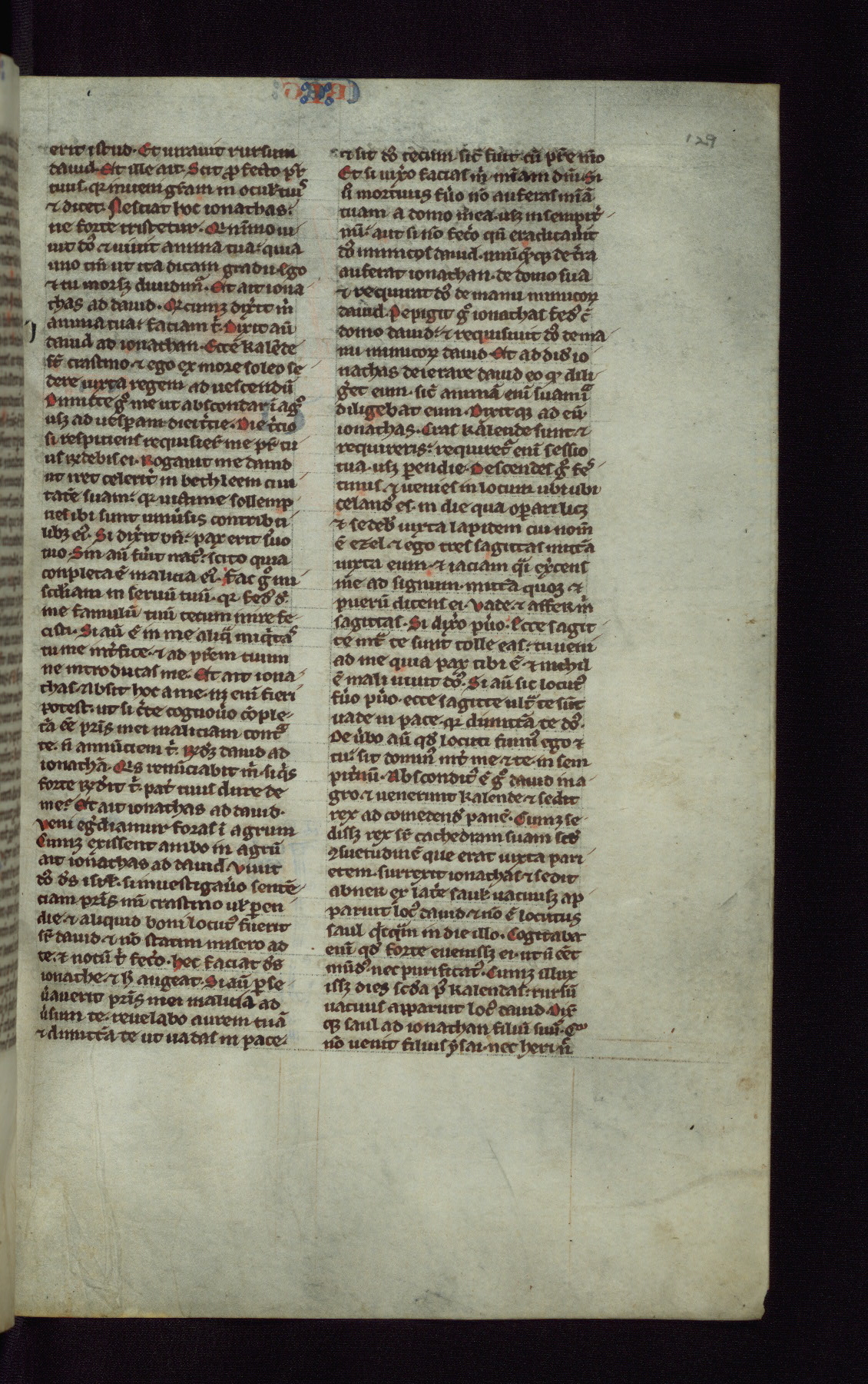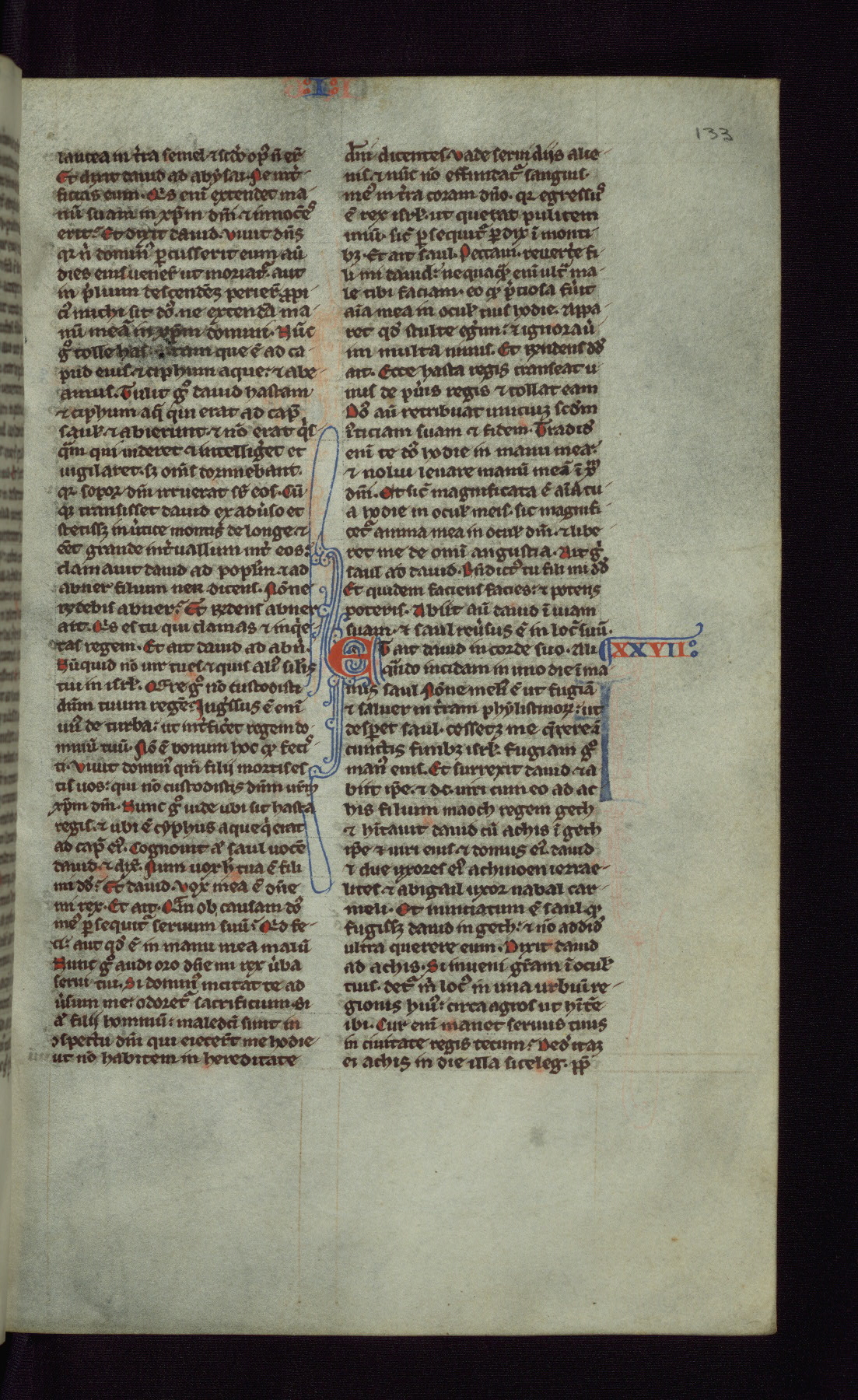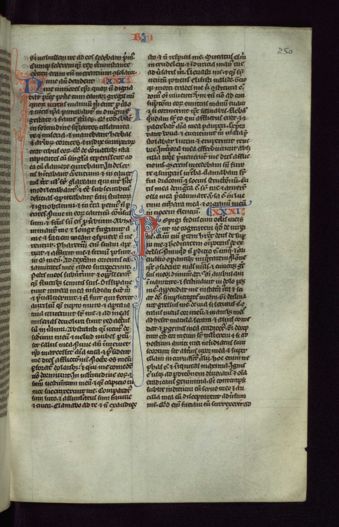 This pocket-size Bible was created around the middle of the thirteenth century in England. It contains the Vulgate text of the Old and New Testaments, arranged in order and divided into chapters. Such Bibles, designed for individual rather than institutional use, began to be created on a large scale during the thirteenth century, especially in Paris. This manuscript is illuminated with a large number of small historiated initials, and also includes a somewhat later image of the Three Living and the Three Dead, a popular scene based on a French poem of the same century.