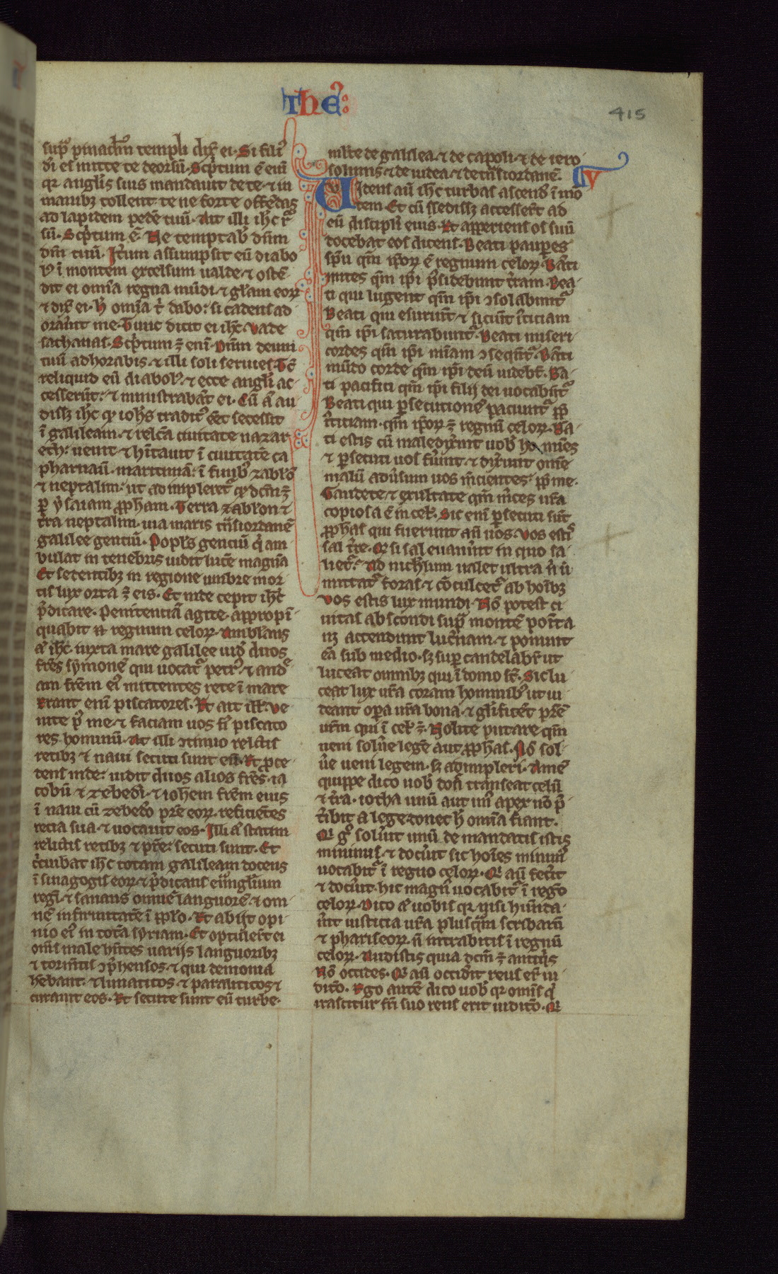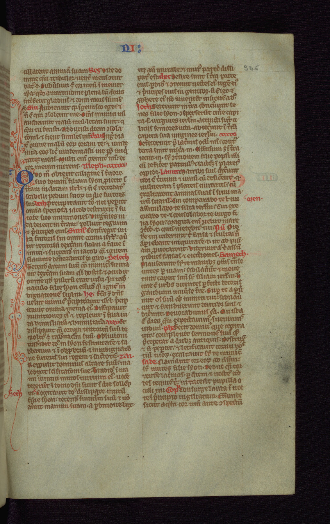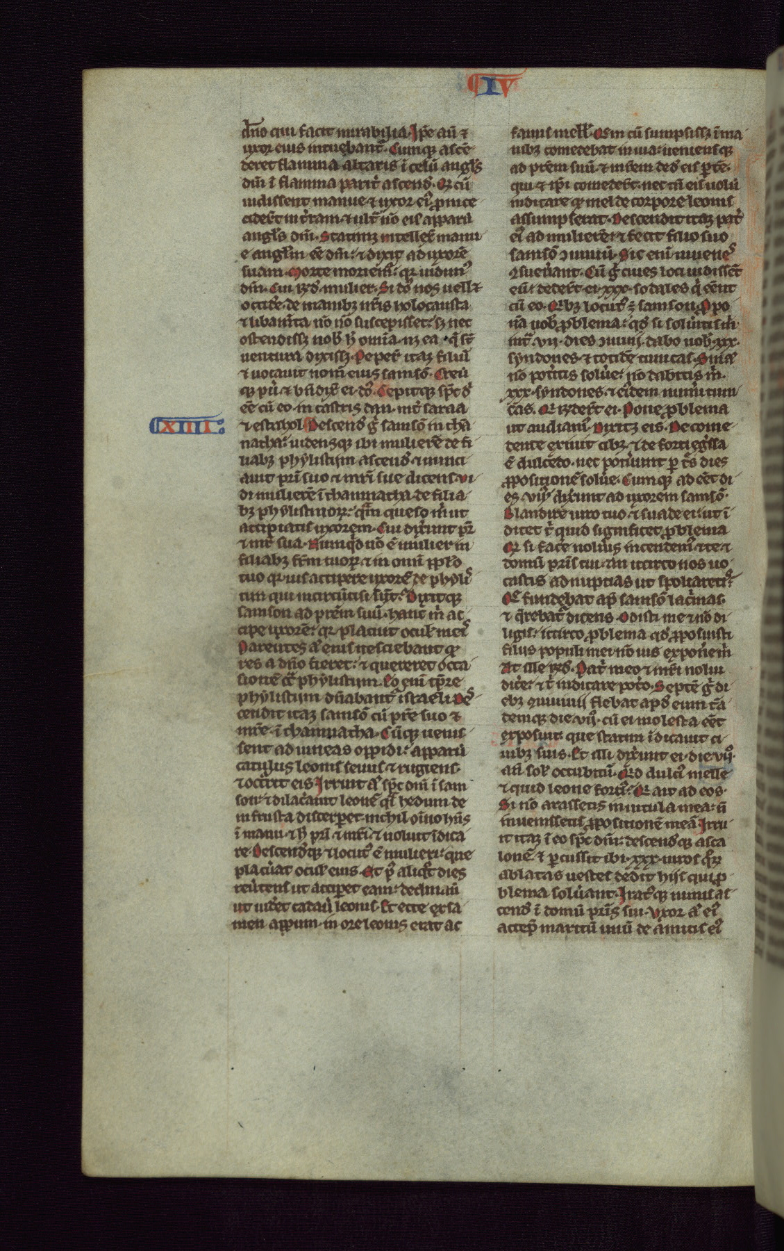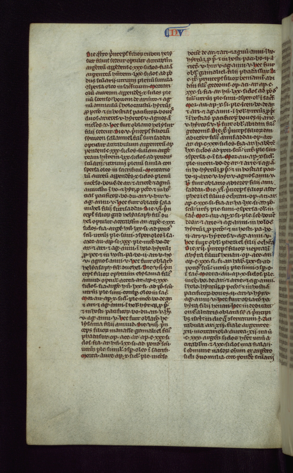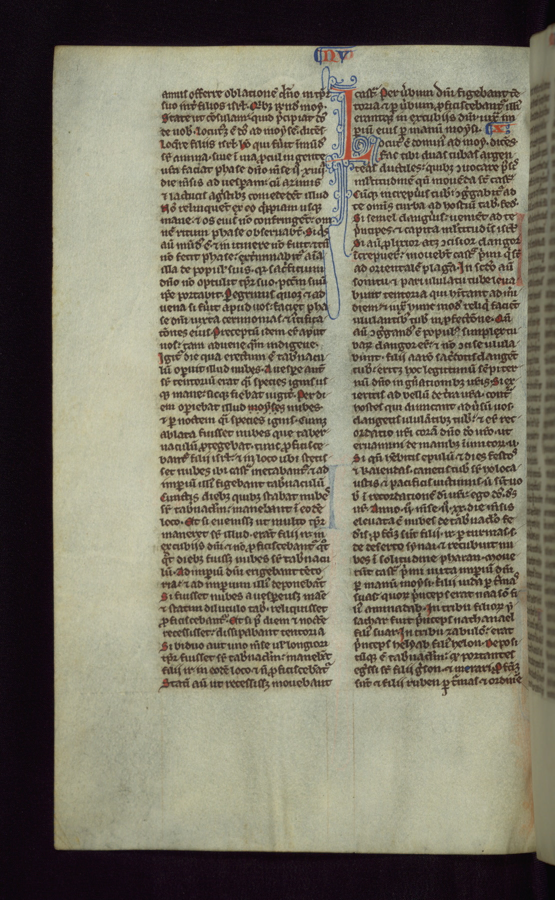 This pocket-size Bible was created around the middle of the thirteenth century in England. It contains the Vulgate text of the Old and New Testaments, arranged in order and divided into chapters. Such Bibles, designed for individual rather than institutional use, began to be created on a large scale during the thirteenth century, especially in Paris. This manuscript is illuminated with a large number of small historiated initials, and also includes a somewhat later image of the Three Living and the Three Dead, a popular scene based on a French poem of the same century.