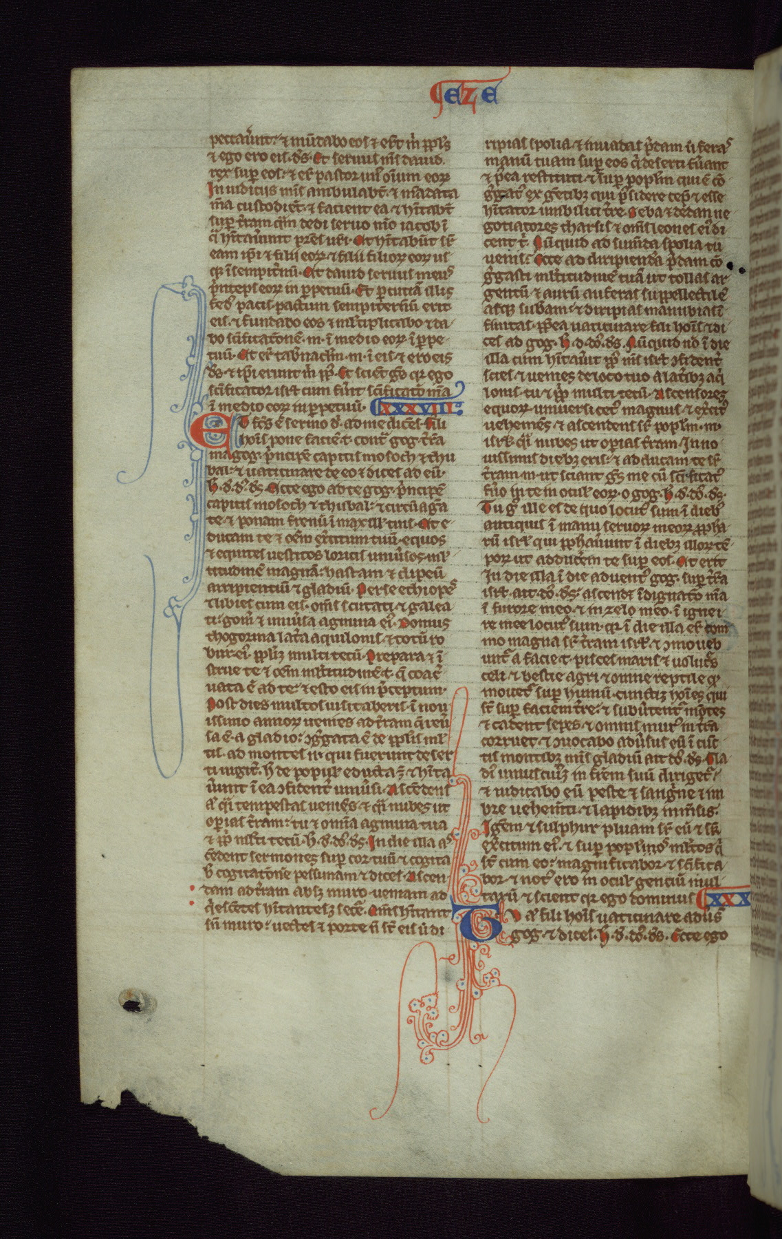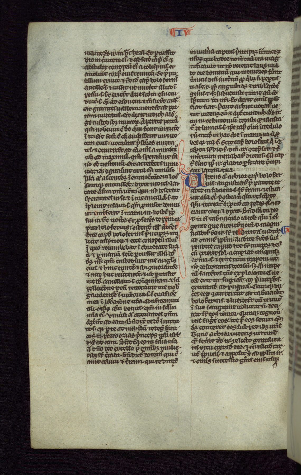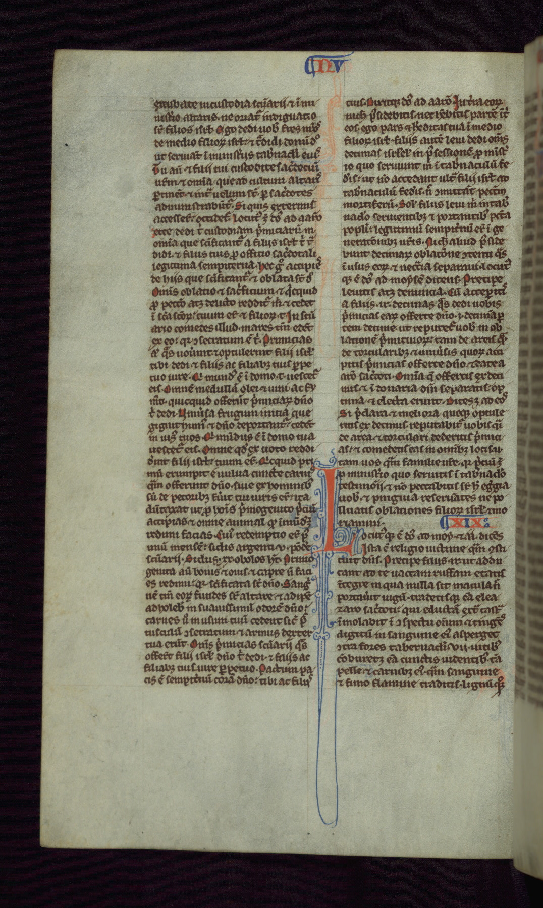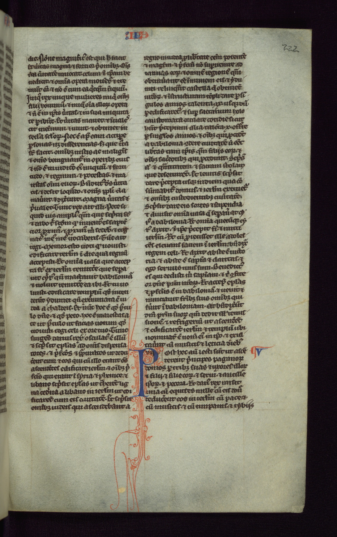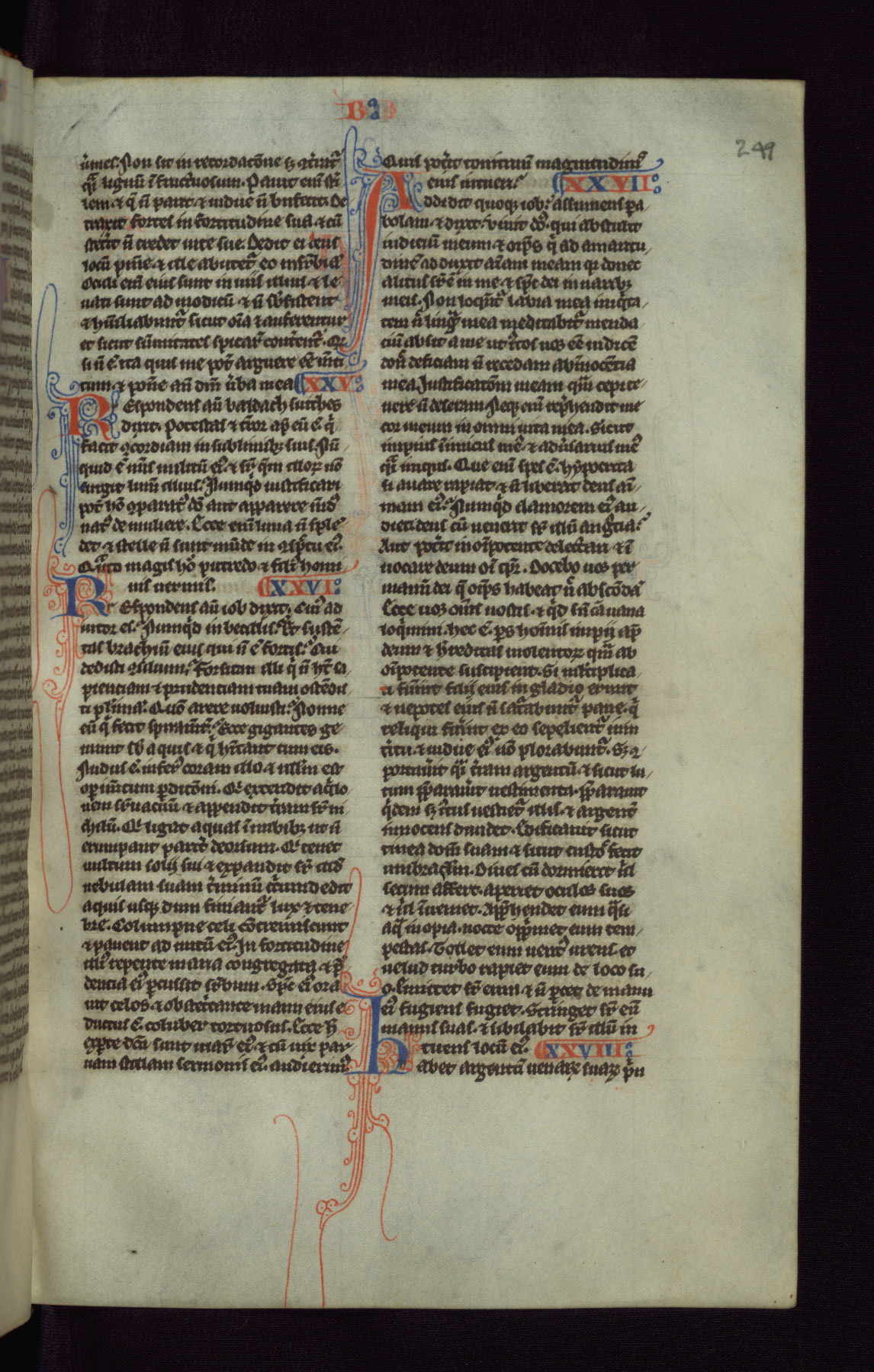This pocket-size Bible was created around the middle of the thirteenth century in England. It contains the Vulgate text of the Old and New Testaments, arranged in order and divided into chapters. Such Bibles, designed for individual rather than institutional use, began to be created on a large scale during the thirteenth century, especially in Paris. This manuscript is illuminated with a large number of small historiated initials, and also includes a somewhat later image of the Three Living and the Three Dead, a popular scene based on a French poem of the same century.