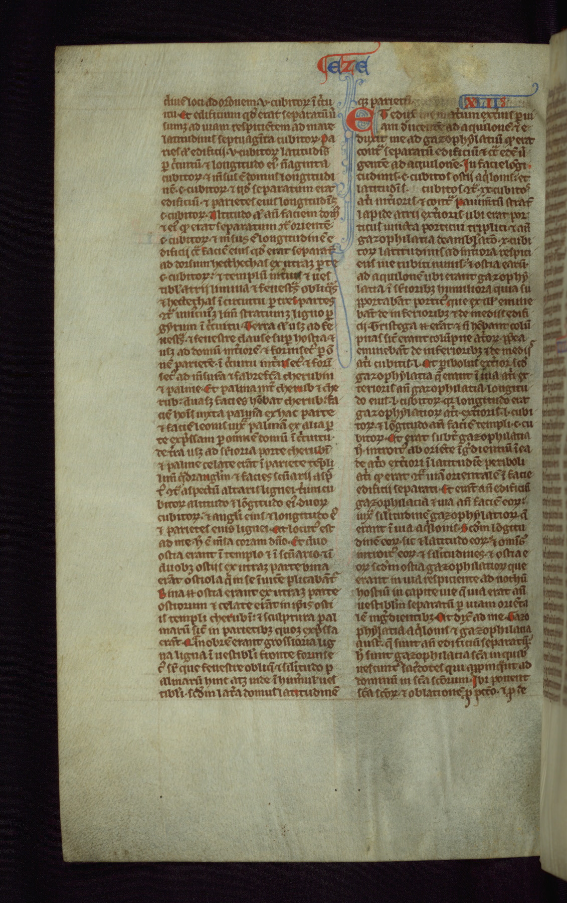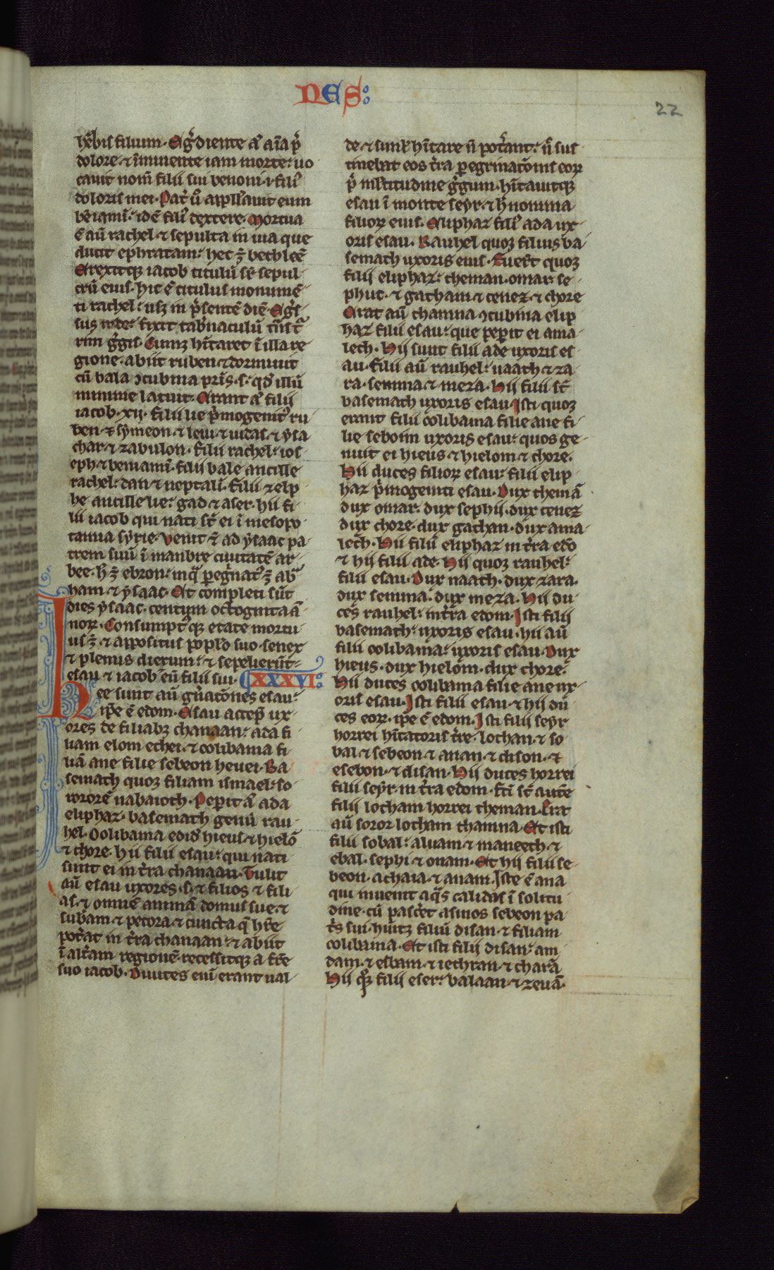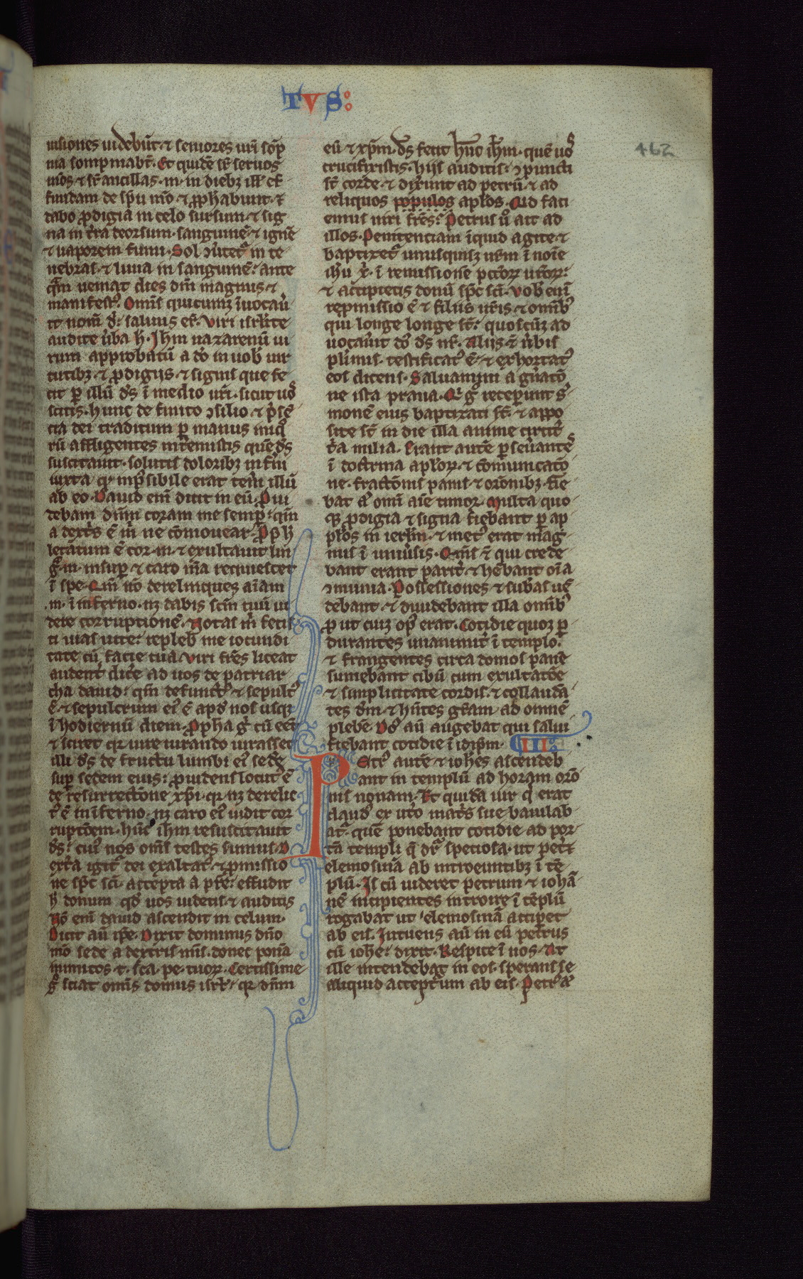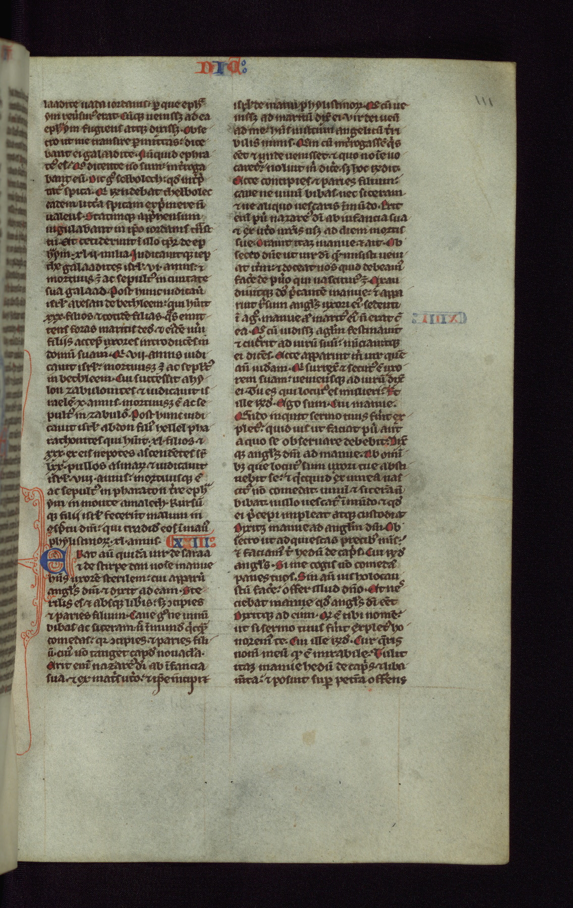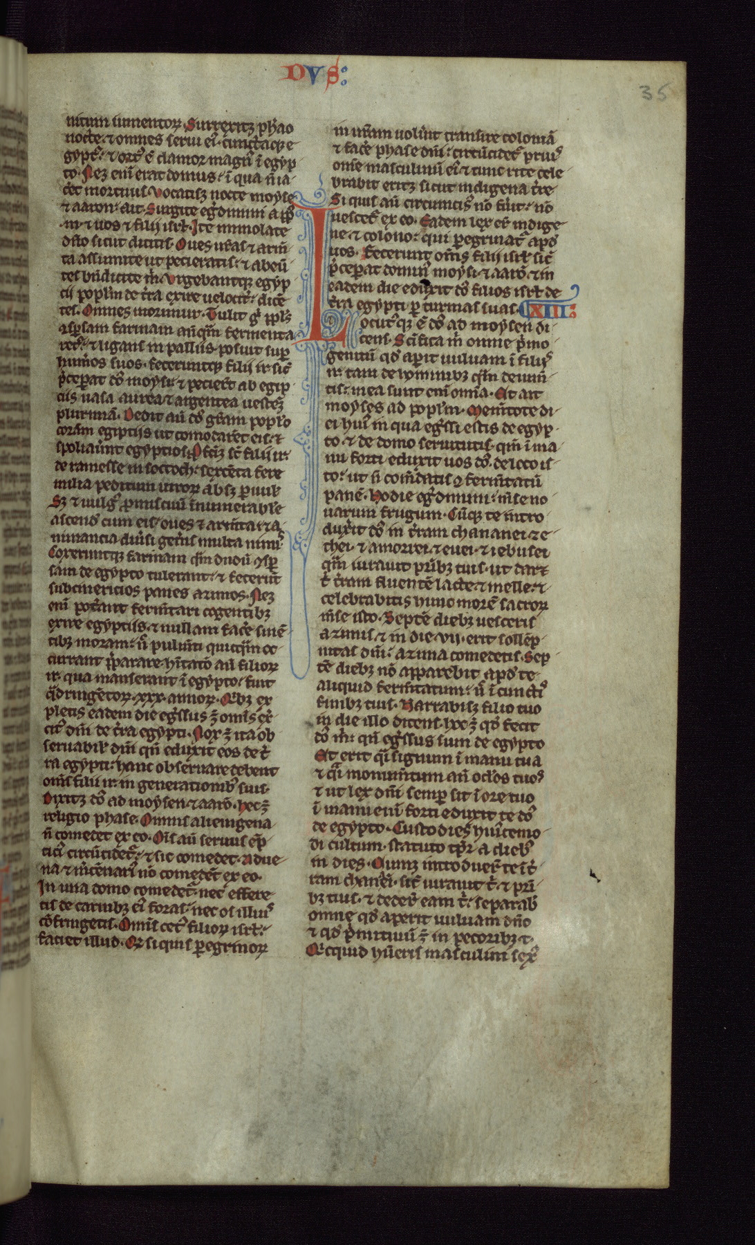 This pocket-size Bible was created around the middle of the thirteenth century in England. It contains the Vulgate text of the Old and New Testaments, arranged in order and divided into chapters. Such Bibles, designed for individual rather than institutional use, began to be created on a large scale during the thirteenth century, especially in Paris. This manuscript is illuminated with a large number of small historiated initials, and also includes a somewhat later image of the Three Living and the Three Dead, a popular scene based on a French poem of the same century.