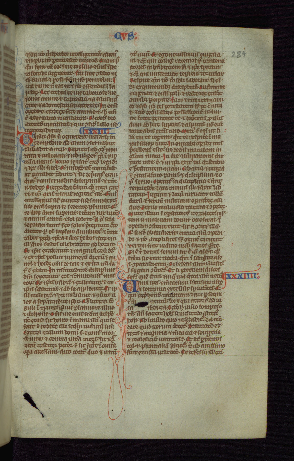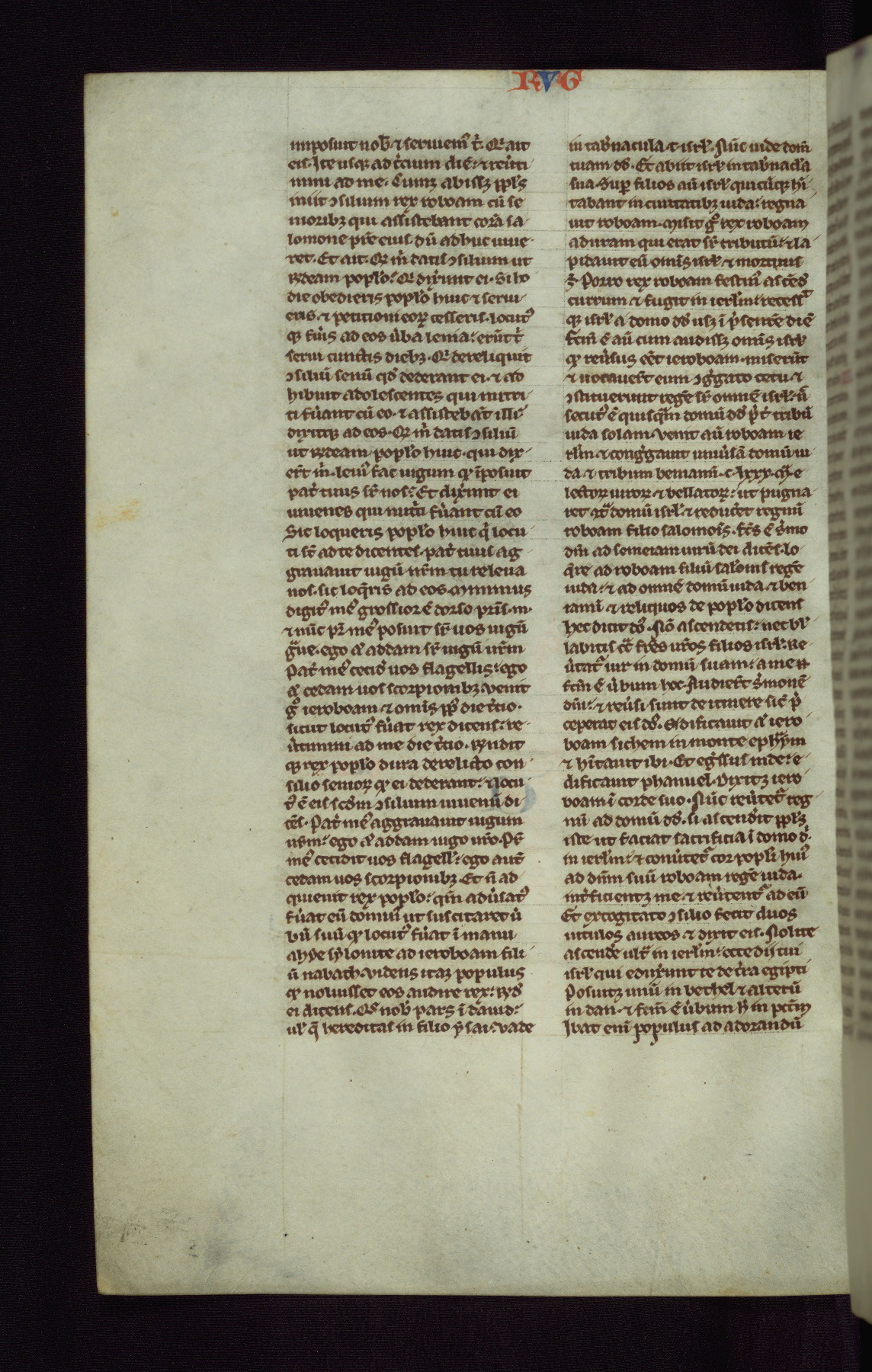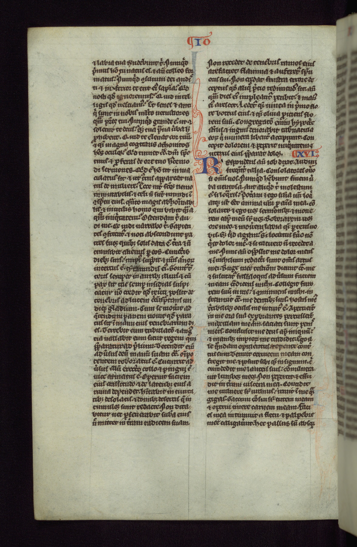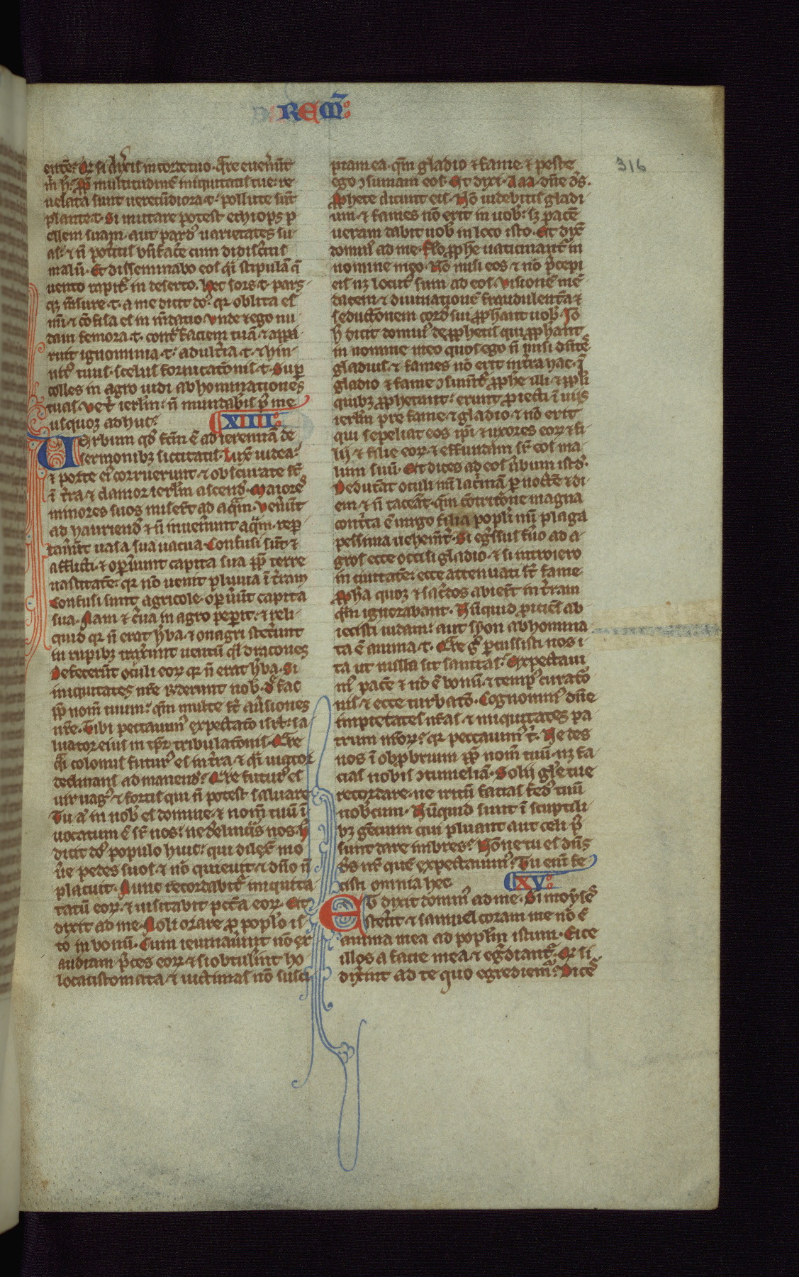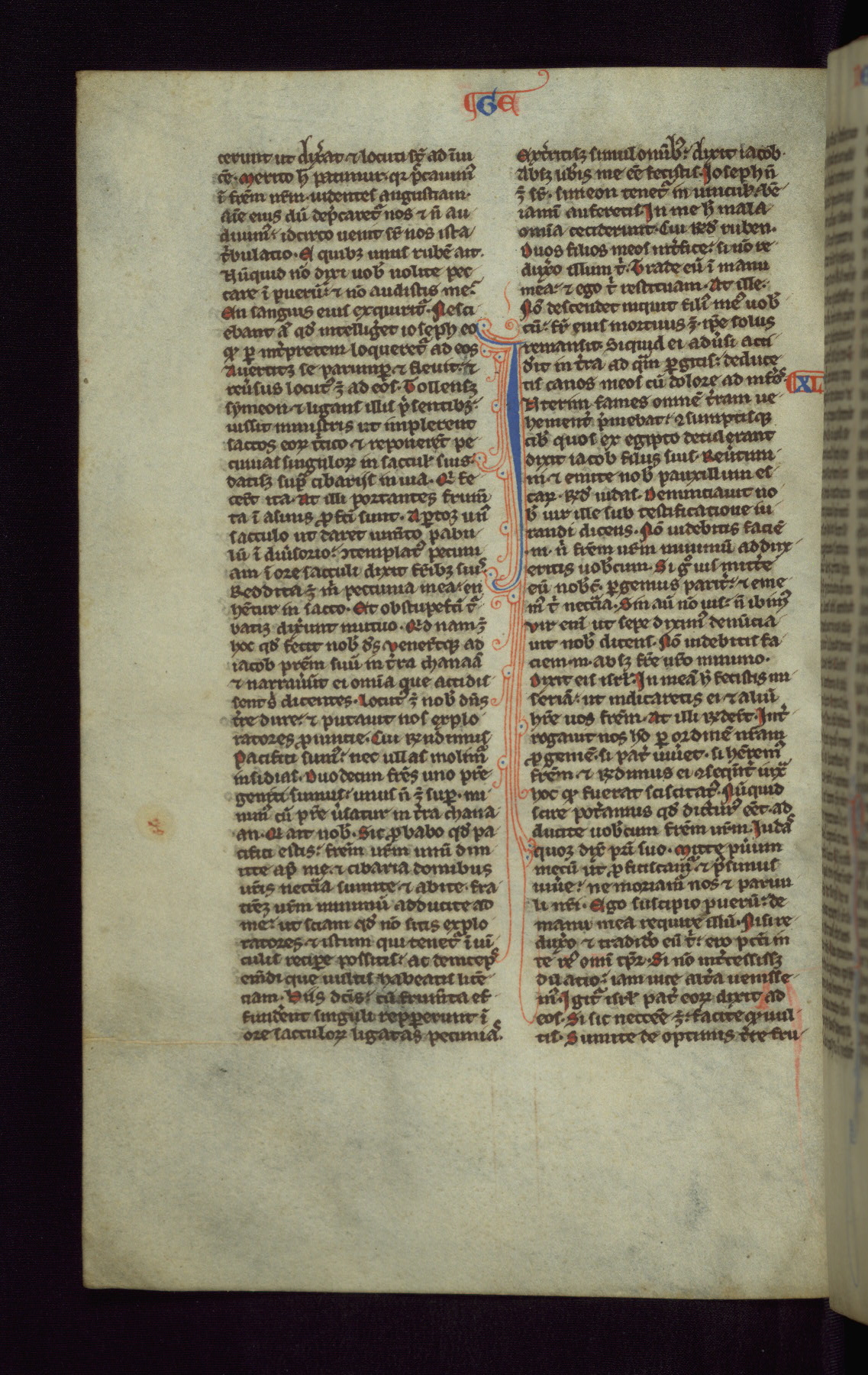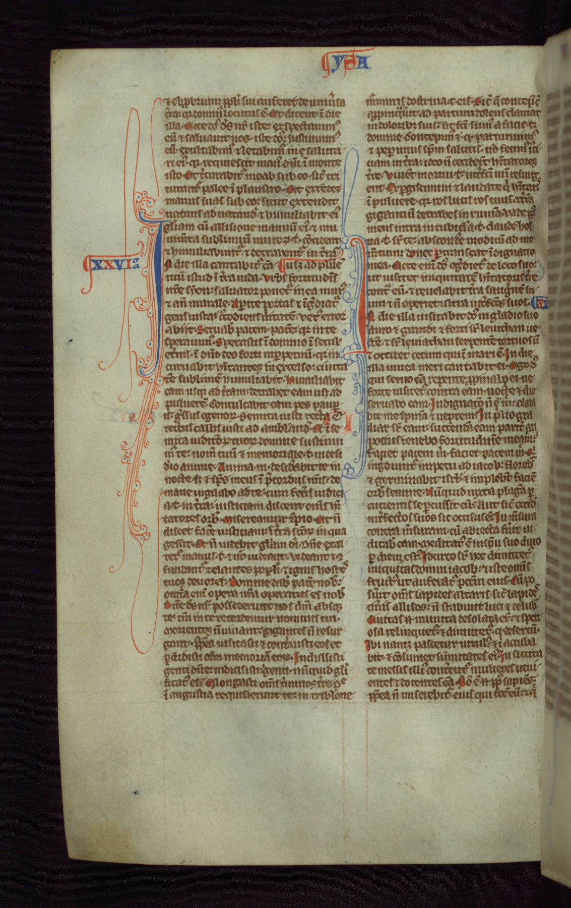 This pocket-size Bible was created around the middle of the thirteenth century in England. It contains the Vulgate text of the Old and New Testaments, arranged in order and divided into chapters. Such Bibles, designed for individual rather than institutional use, began to be created on a large scale during the thirteenth century, especially in Paris. This manuscript is illuminated with a large number of small historiated initials, and also includes a somewhat later image of the Three Living and the Three Dead, a popular scene based on a French poem of the same century.