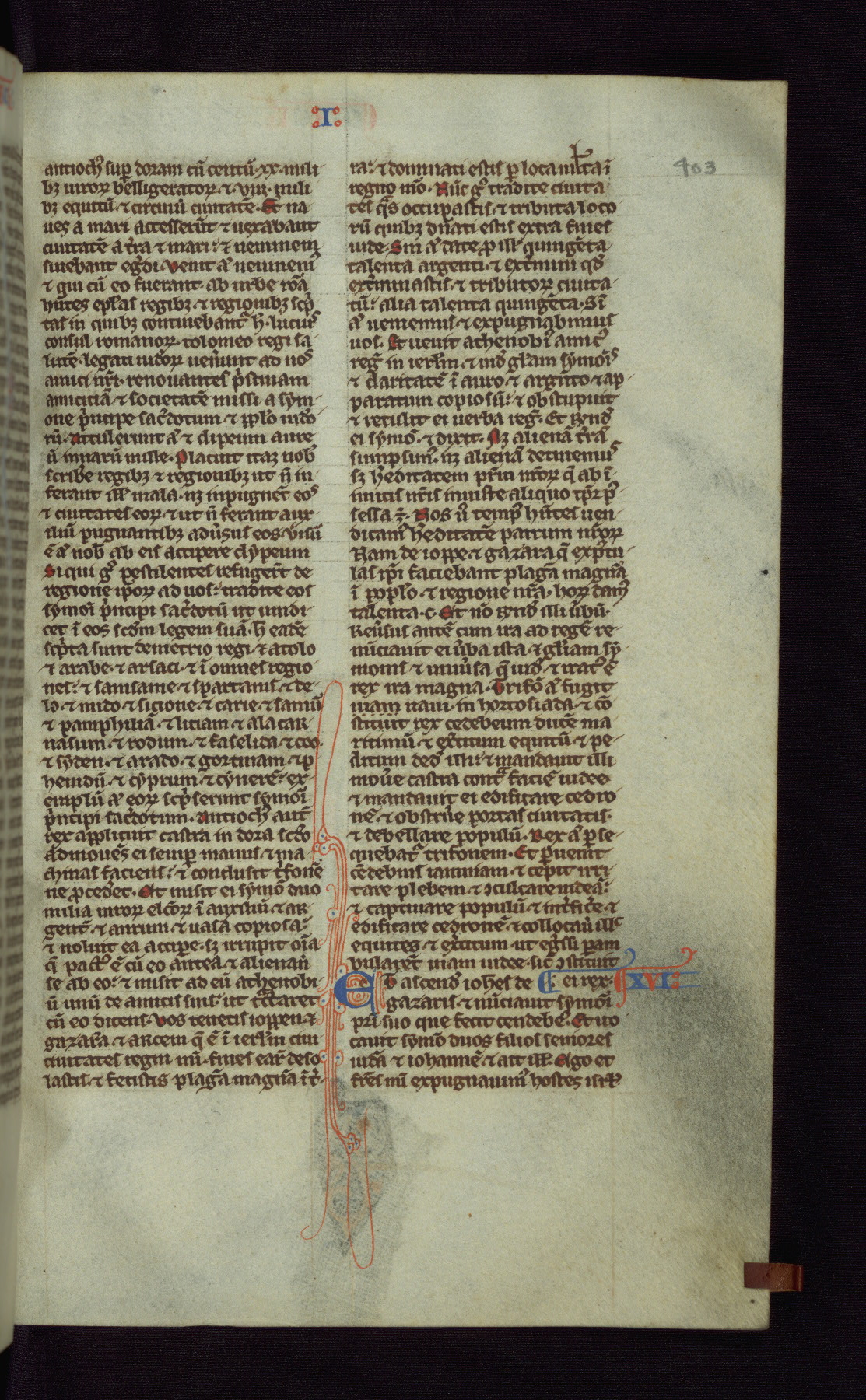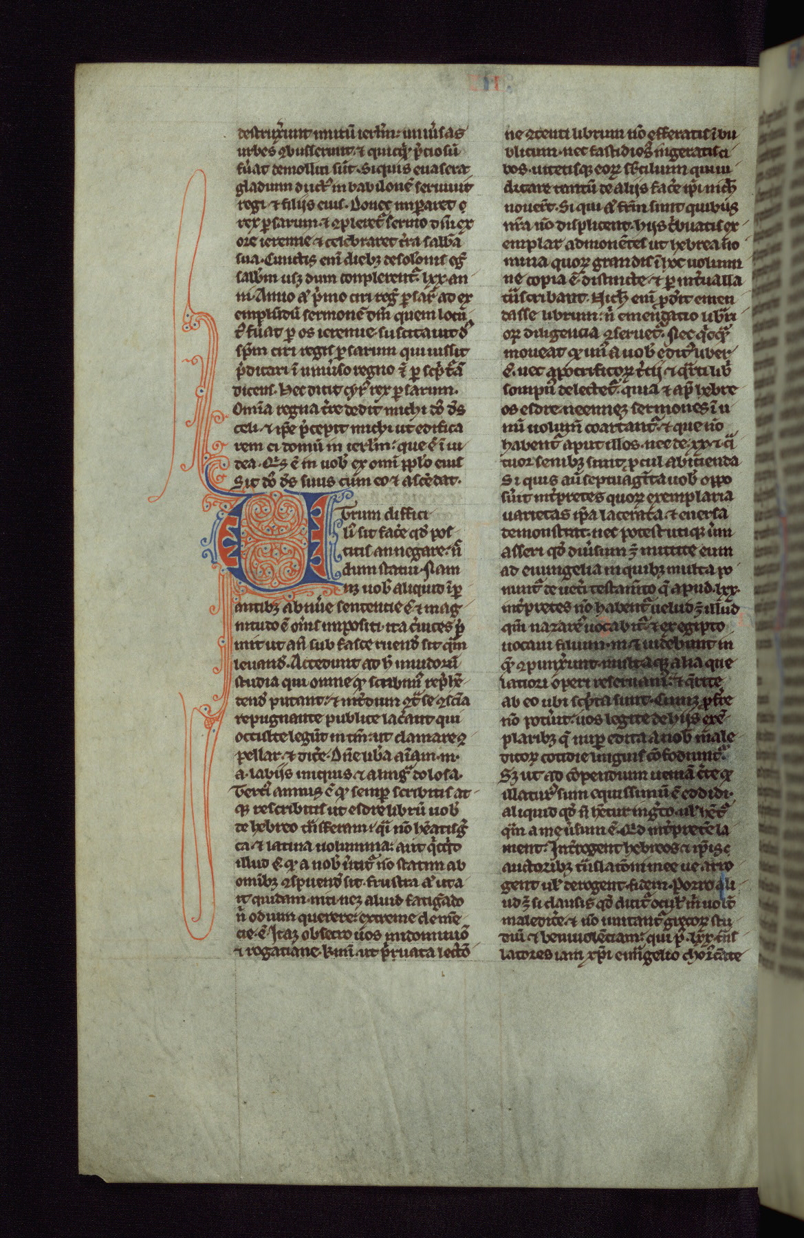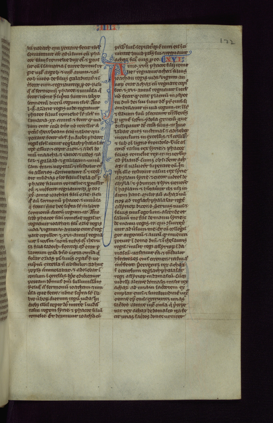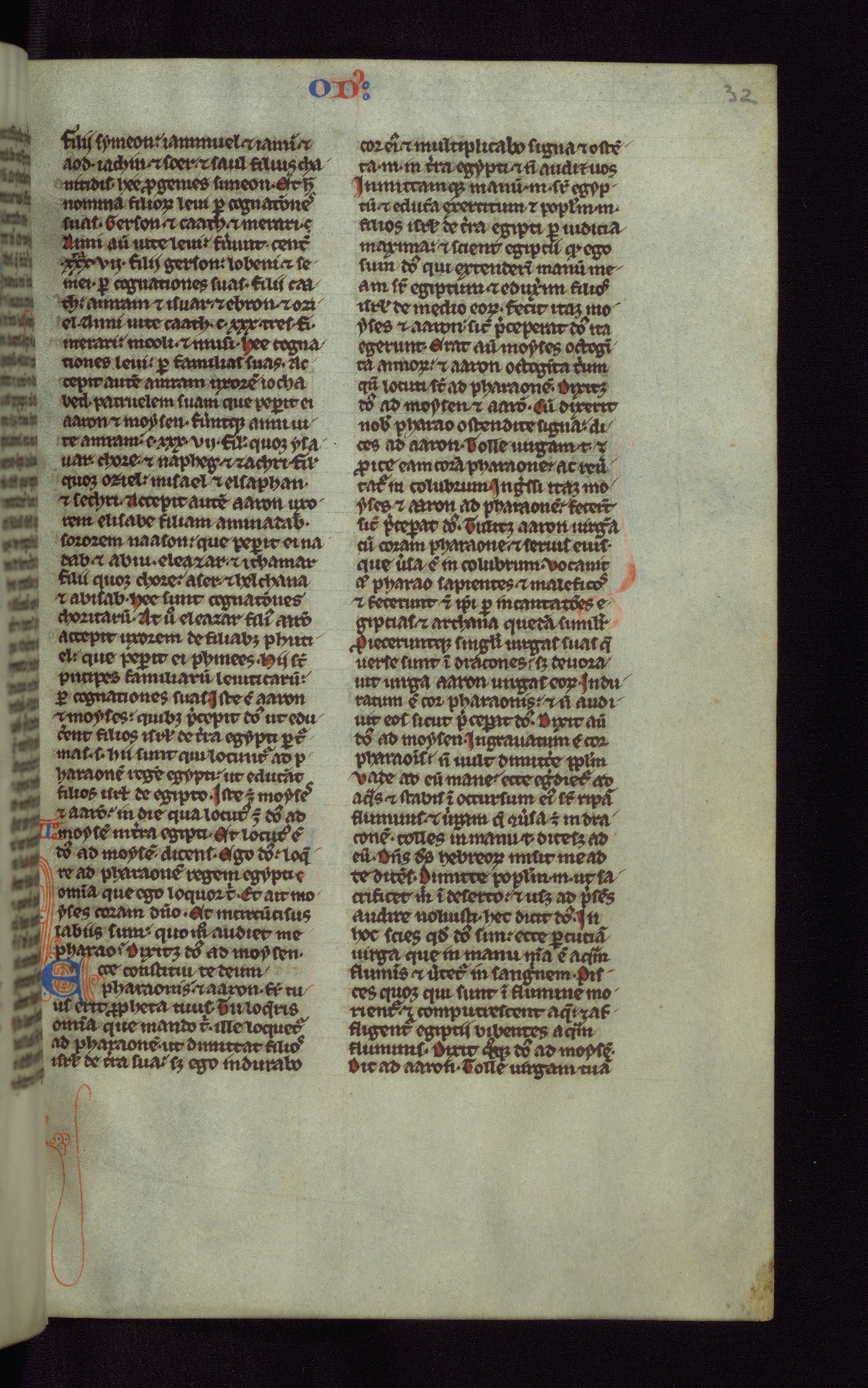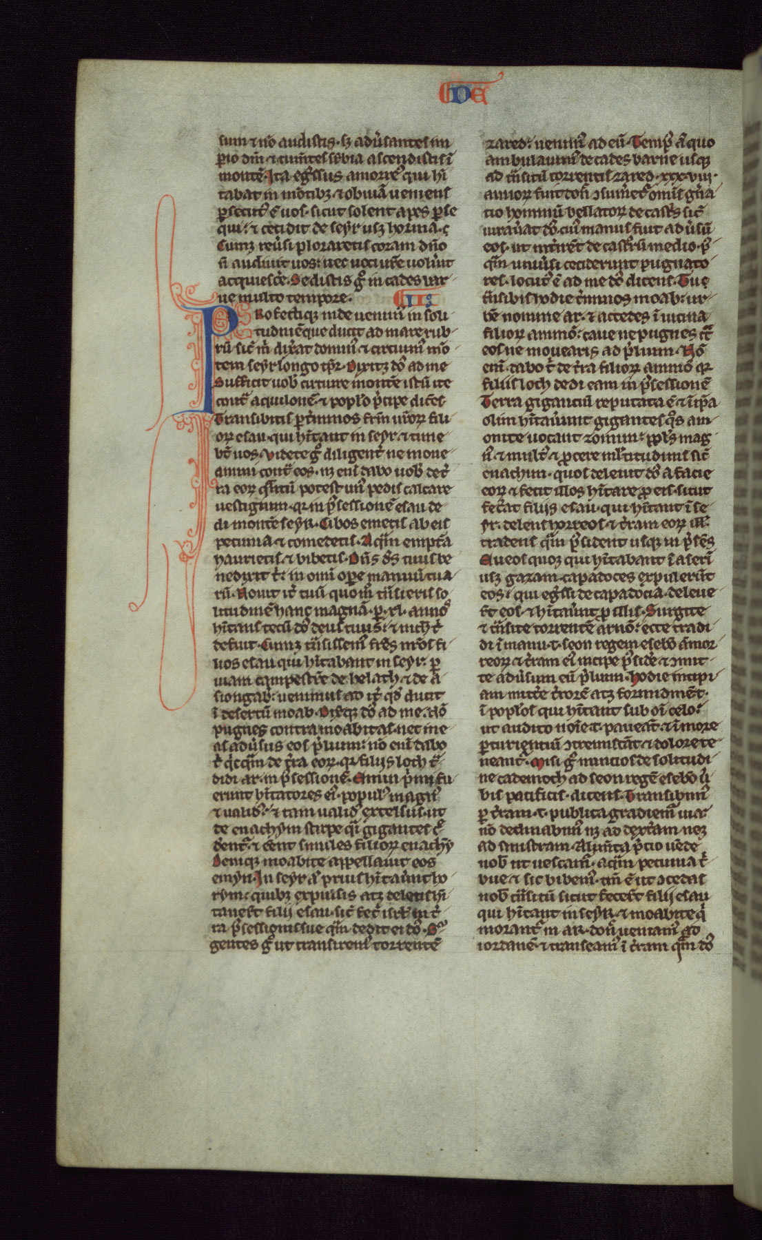 This pocket-size Bible was created around the middle of the thirteenth century in England. It contains the Vulgate text of the Old and New Testaments, arranged in order and divided into chapters. Such Bibles, designed for individual rather than institutional use, began to be created on a large scale during the thirteenth century, especially in Paris. This manuscript is illuminated with a large number of small historiated initials, and also includes a somewhat later image of the Three Living and the Three Dead, a popular scene based on a French poem of the same century.