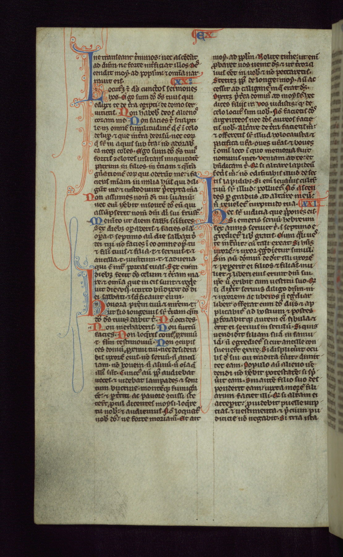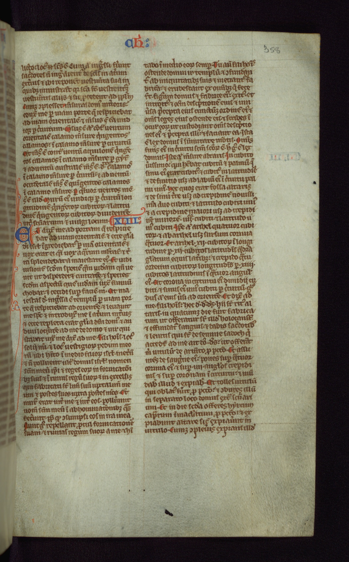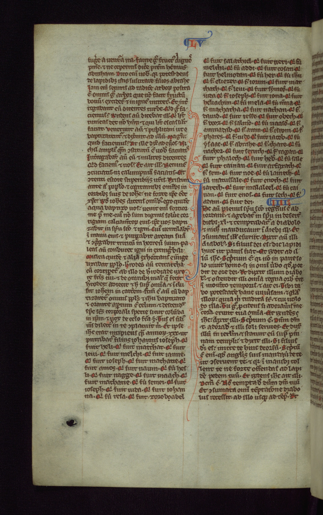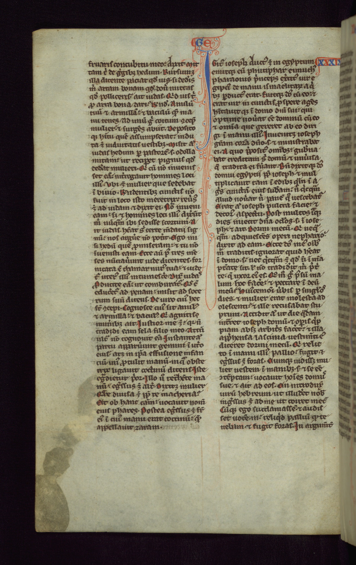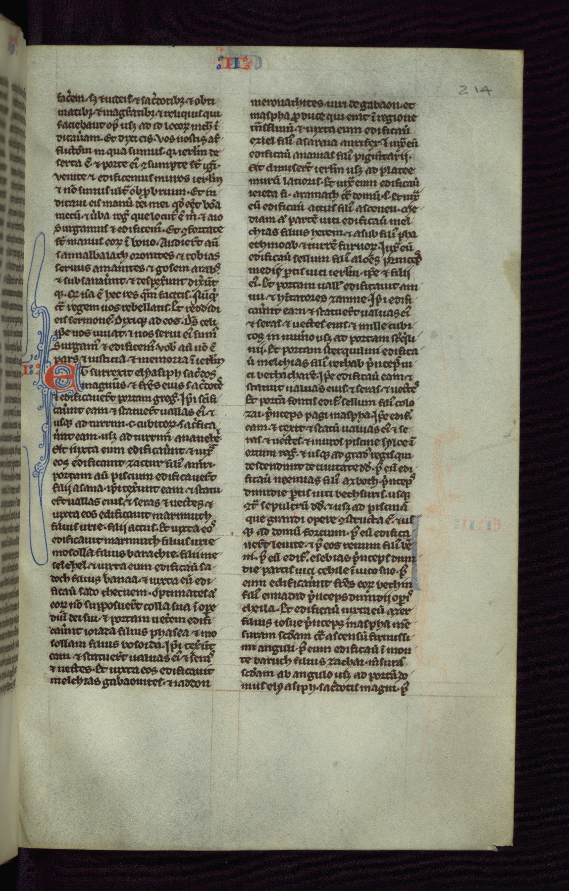 This pocket-size Bible was created around the middle of the thirteenth century in England. It contains the Vulgate text of the Old and New Testaments, arranged in order and divided into chapters. Such Bibles, designed for individual rather than institutional use, began to be created on a large scale during the thirteenth century, especially in Paris. This manuscript is illuminated with a large number of small historiated initials, and also includes a somewhat later image of the Three Living and the Three Dead, a popular scene based on a French poem of the same century.