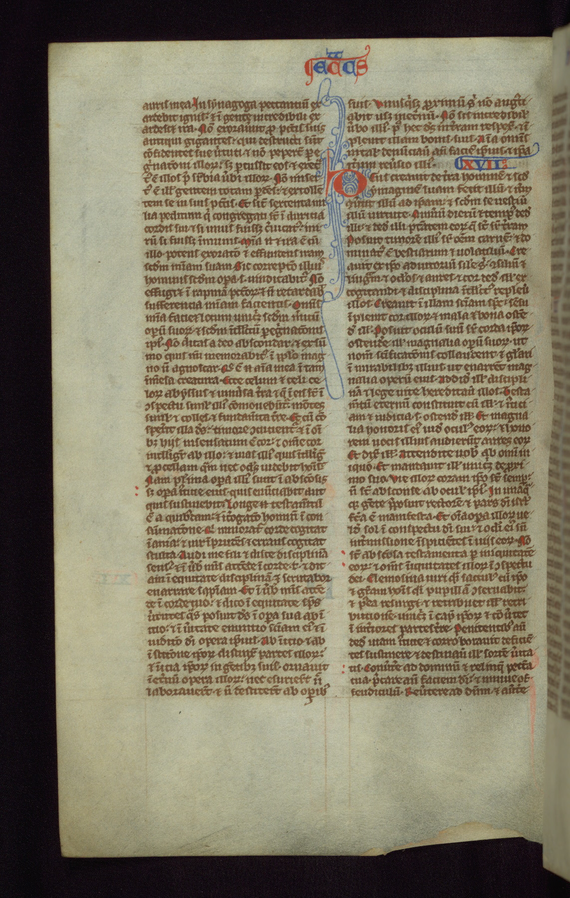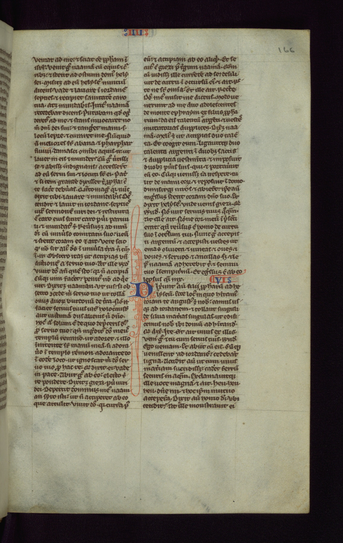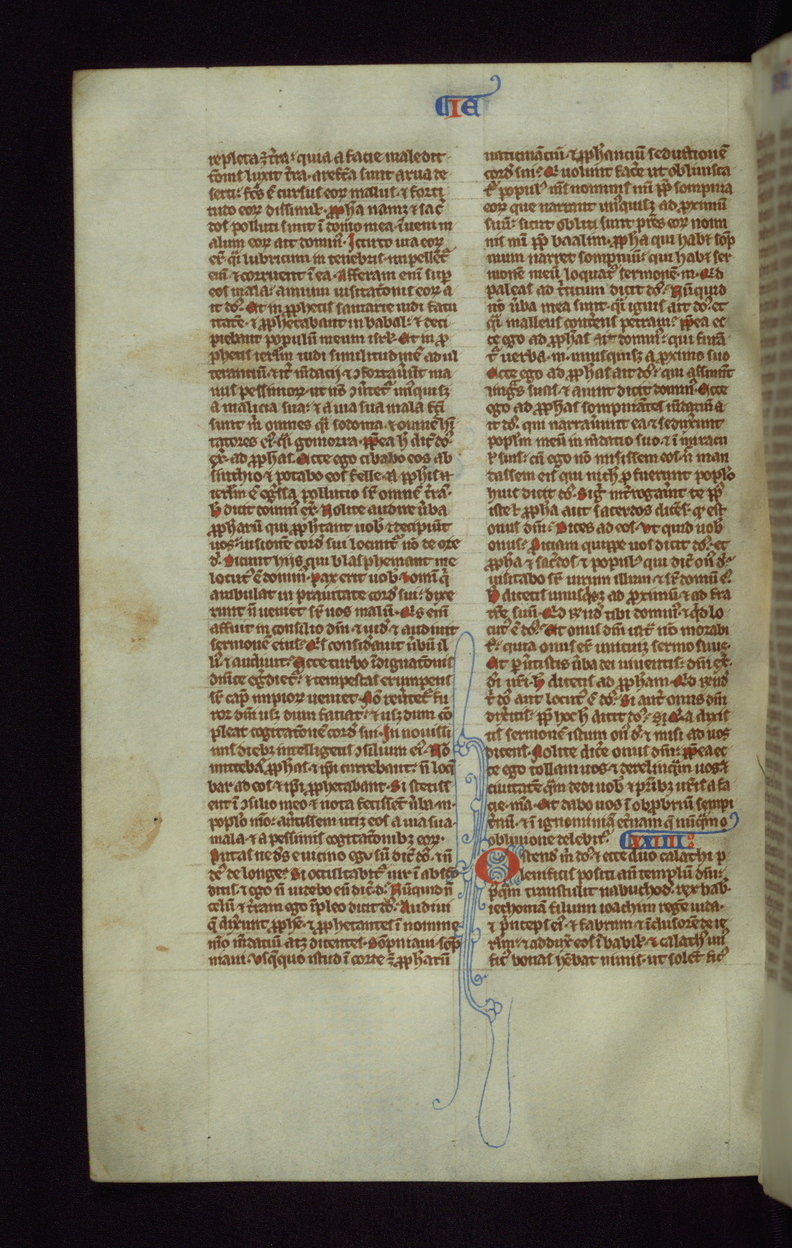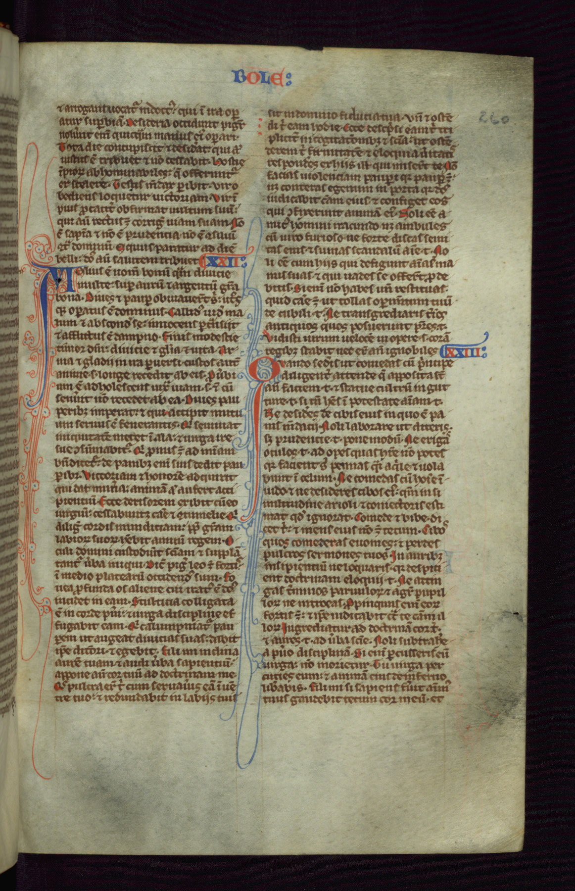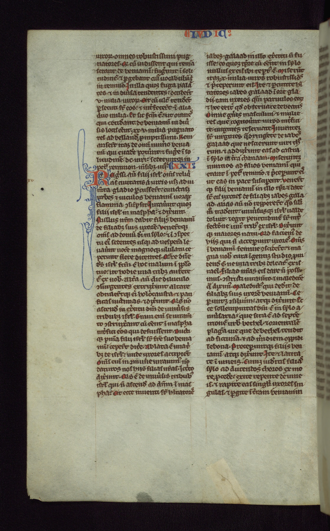 This pocket-size Bible was created around the middle of the thirteenth century in England. It contains the Vulgate text of the Old and New Testaments, arranged in order and divided into chapters. Such Bibles, designed for individual rather than institutional use, began to be created on a large scale during the thirteenth century, especially in Paris. This manuscript is illuminated with a large number of small historiated initials, and also includes a somewhat later image of the Three Living and the Three Dead, a popular scene based on a French poem of the same century.