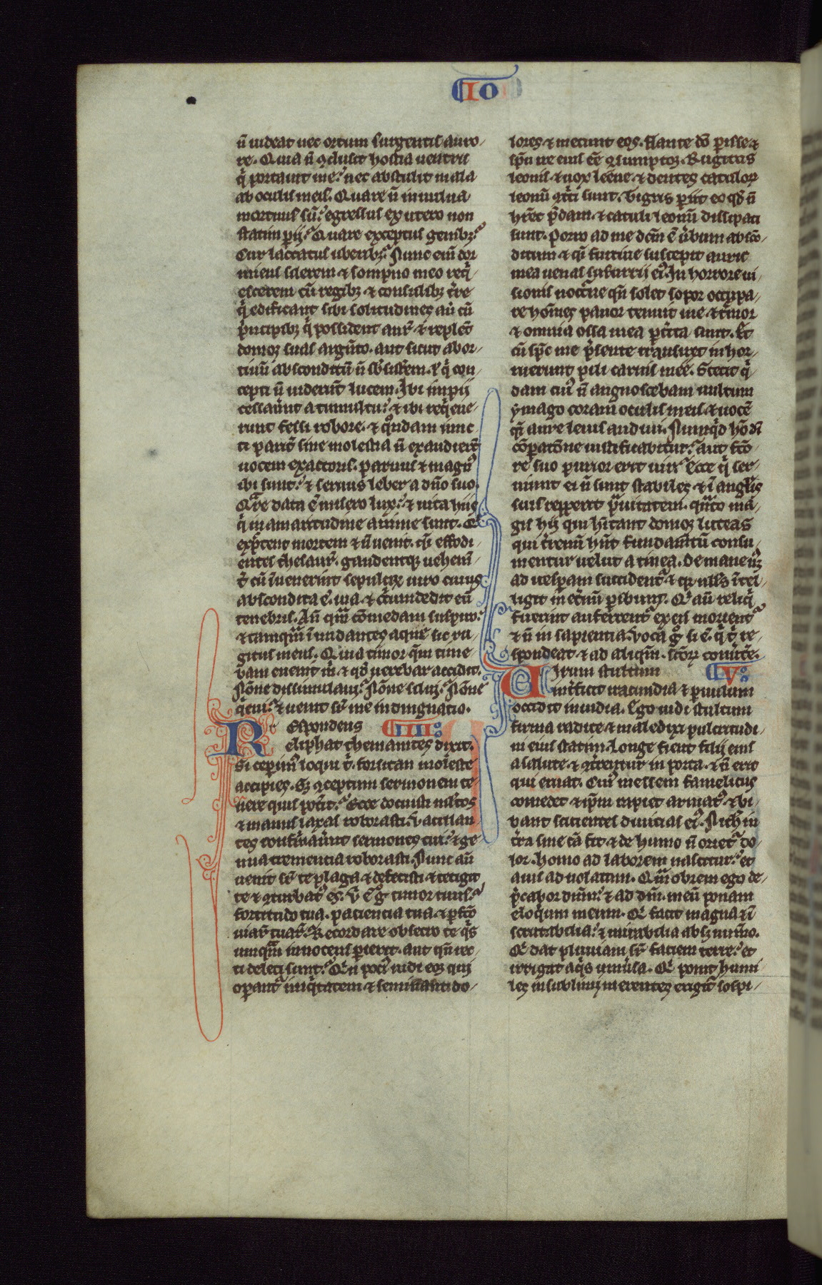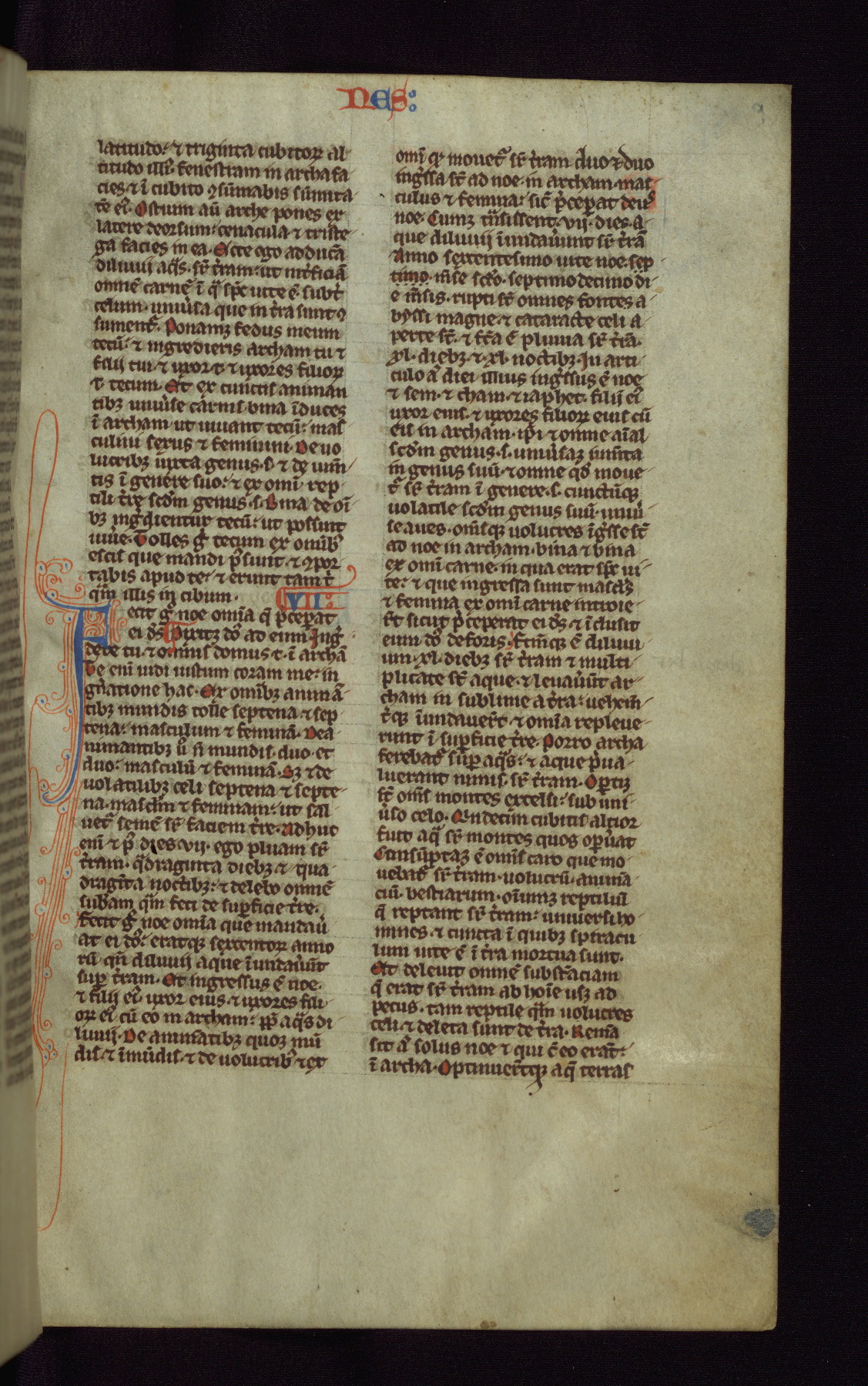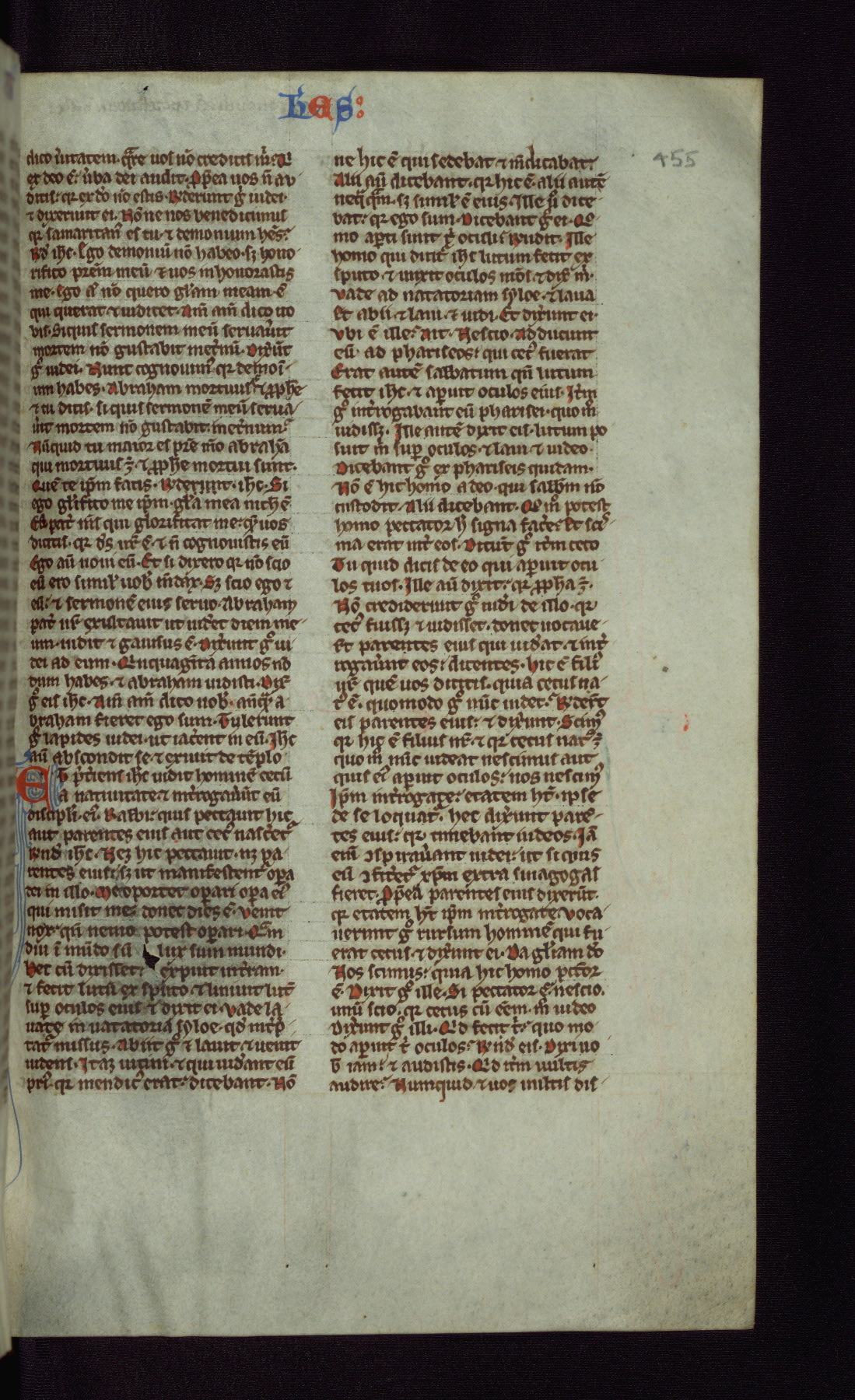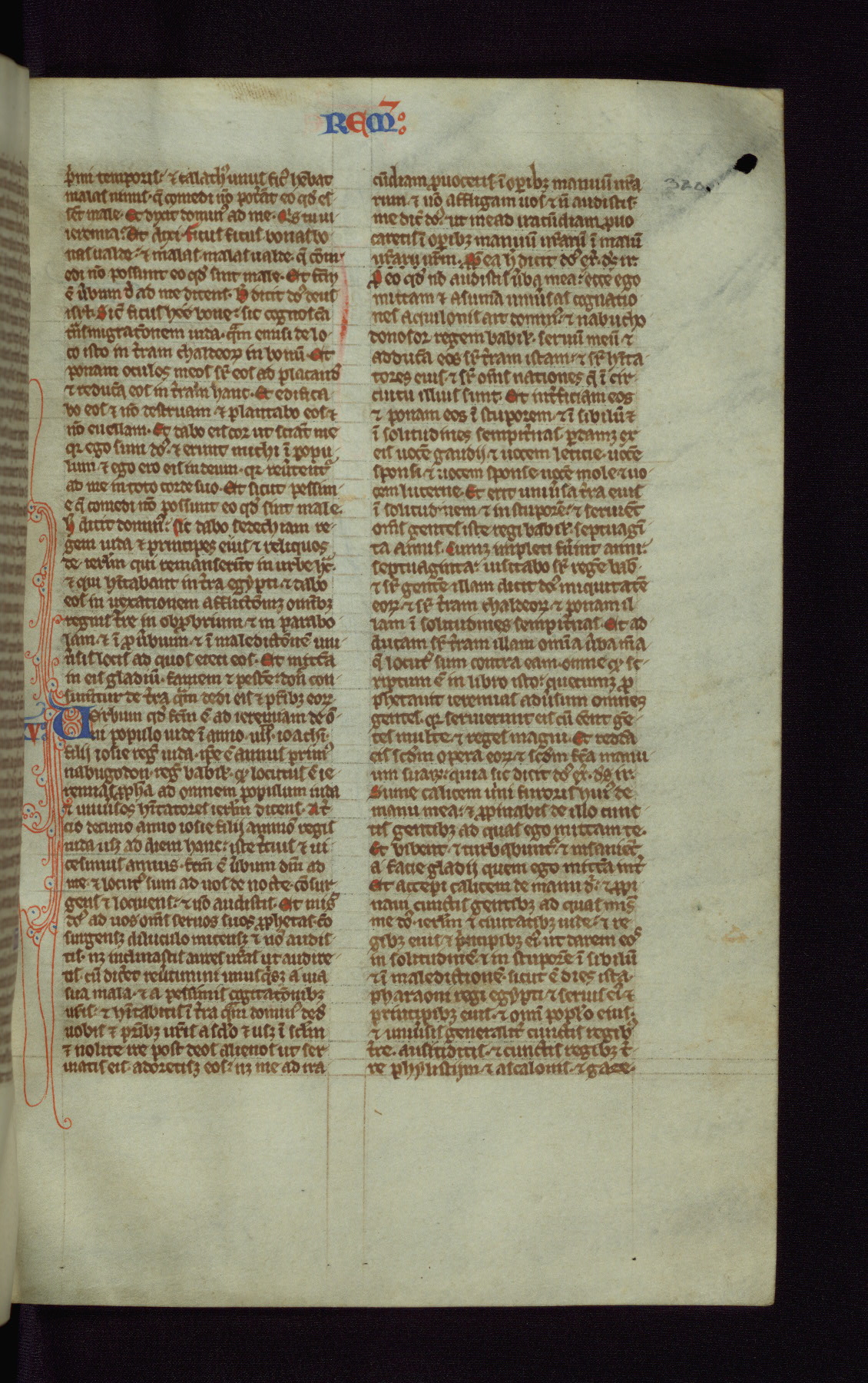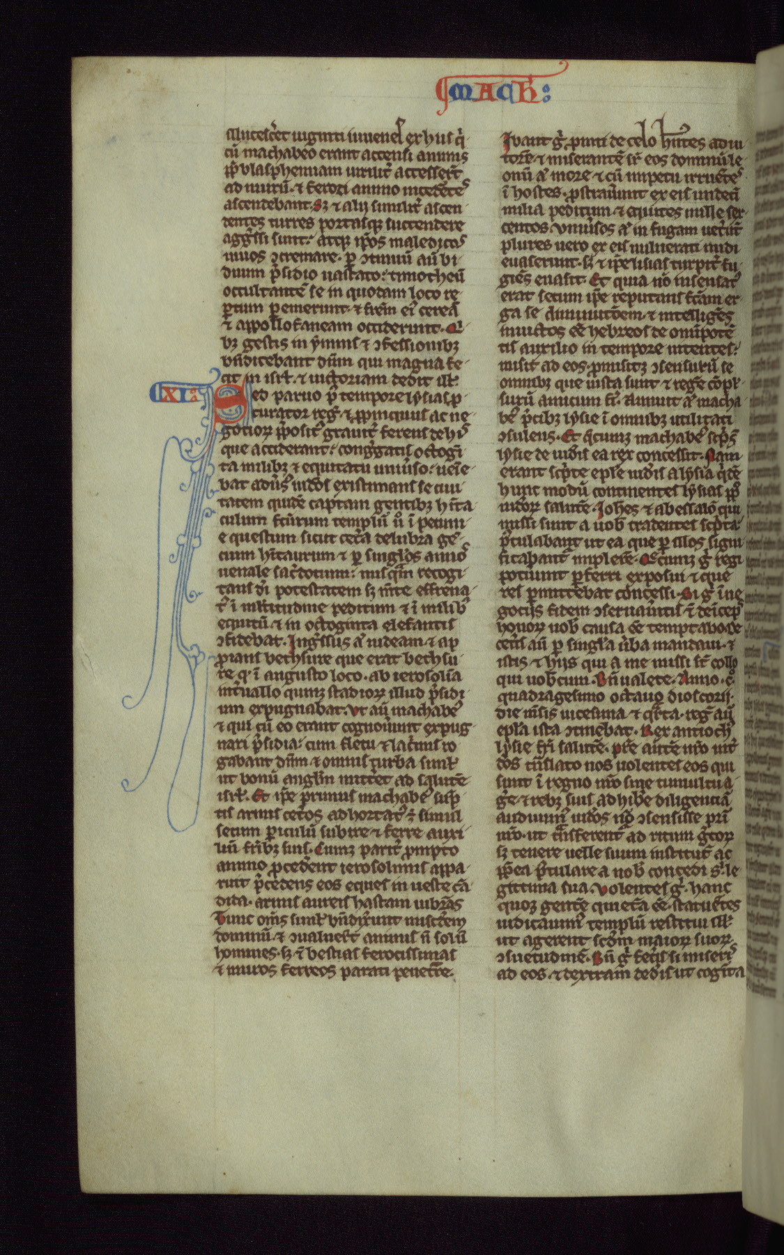 This pocket-size Bible was created around the middle of the thirteenth century in England. It contains the Vulgate text of the Old and New Testaments, arranged in order and divided into chapters. Such Bibles, designed for individual rather than institutional use, began to be created on a large scale during the thirteenth century, especially in Paris. This manuscript is illuminated with a large number of small historiated initials, and also includes a somewhat later image of the Three Living and the Three Dead, a popular scene based on a French poem of the same century.