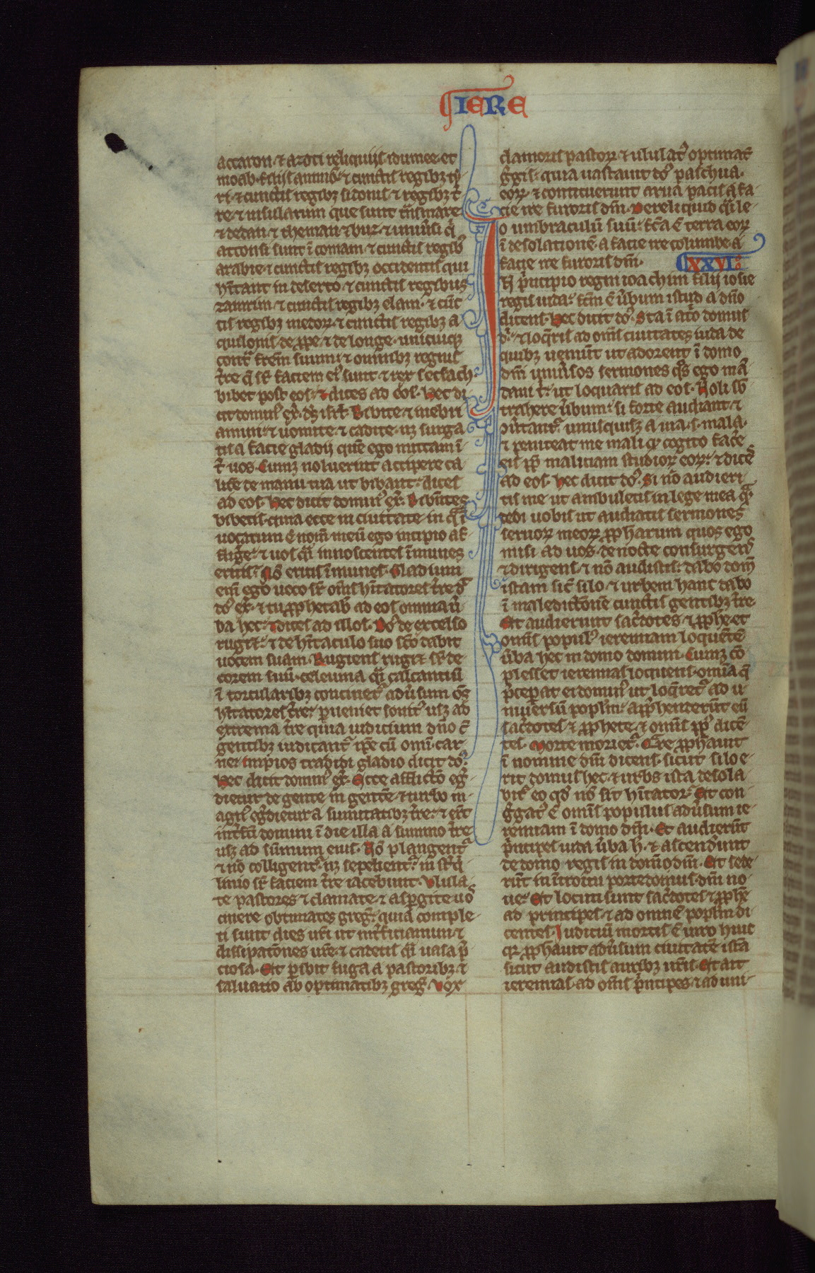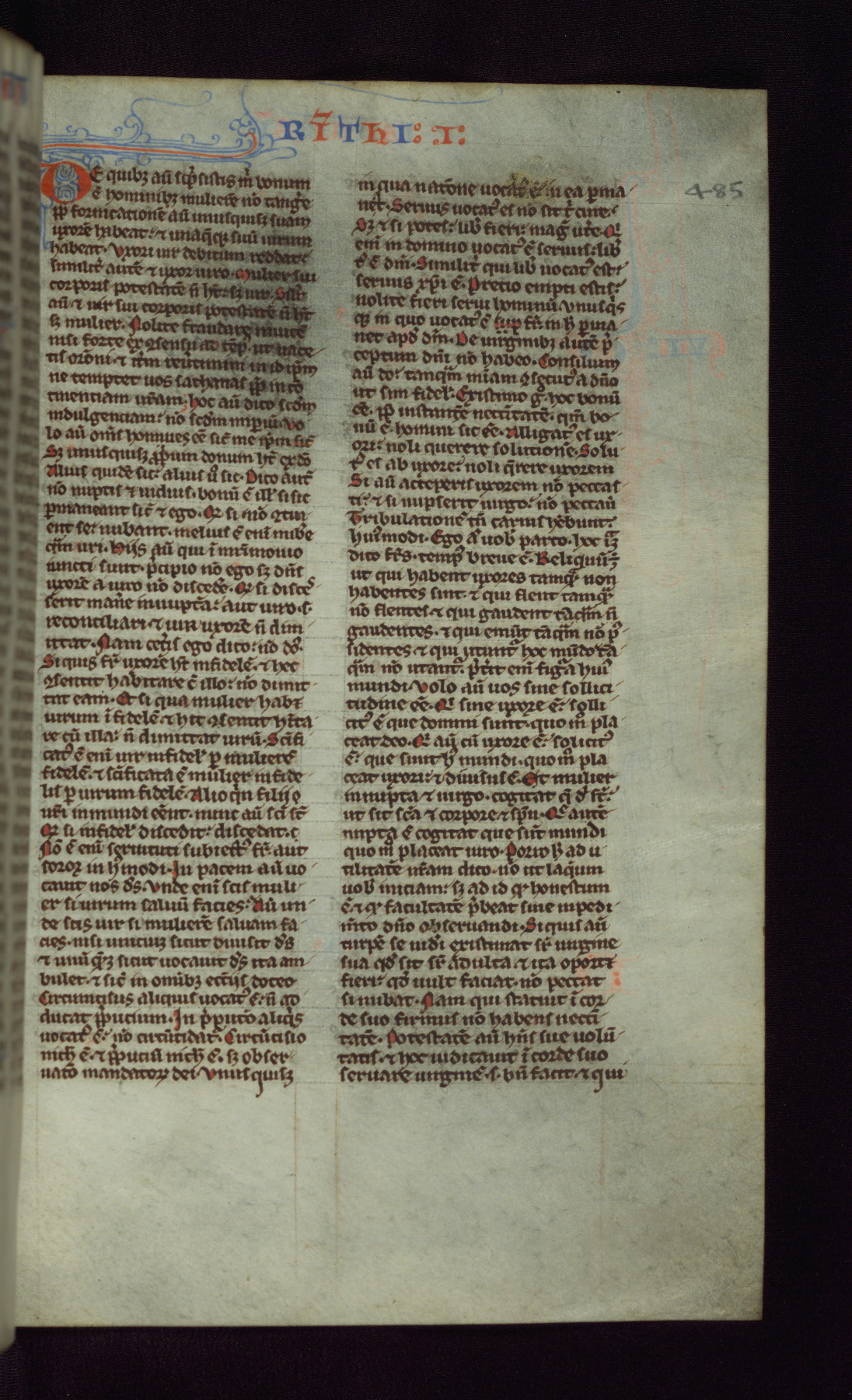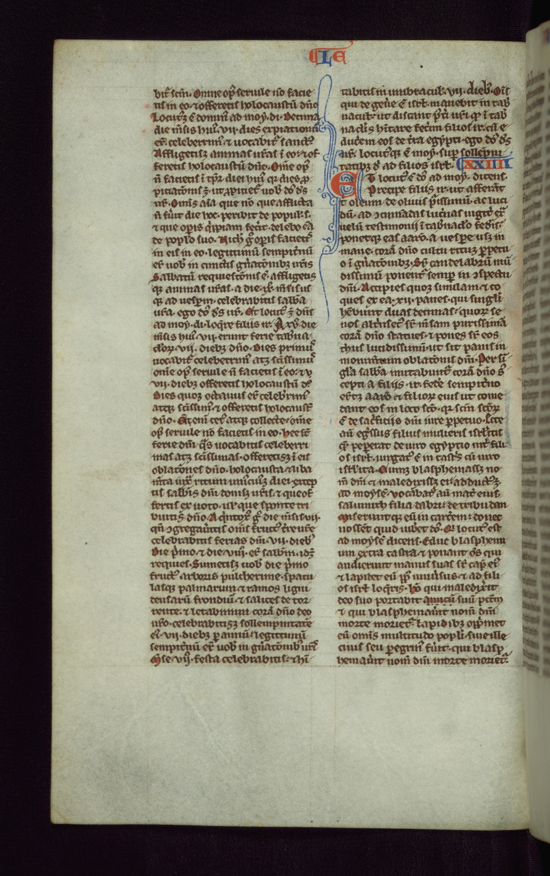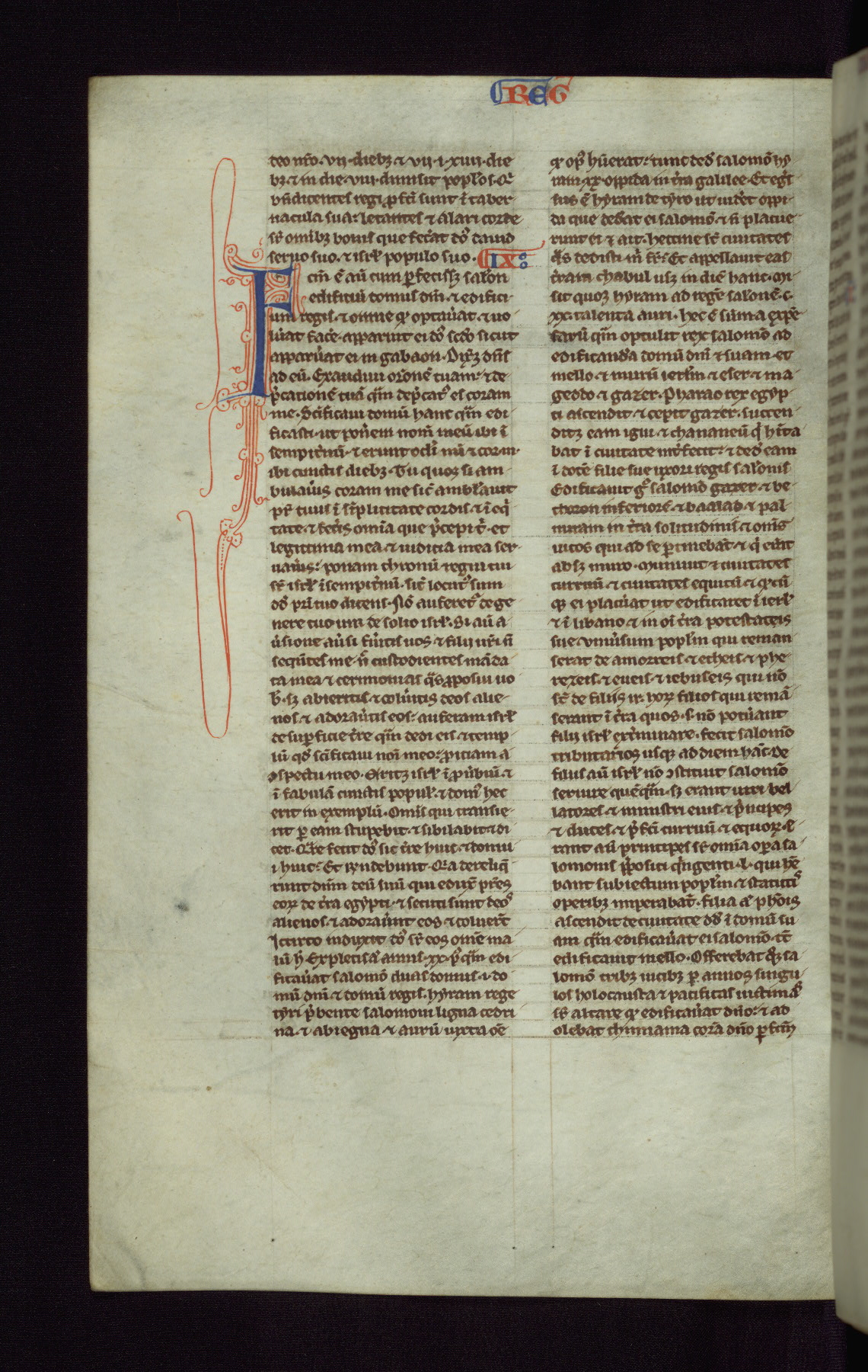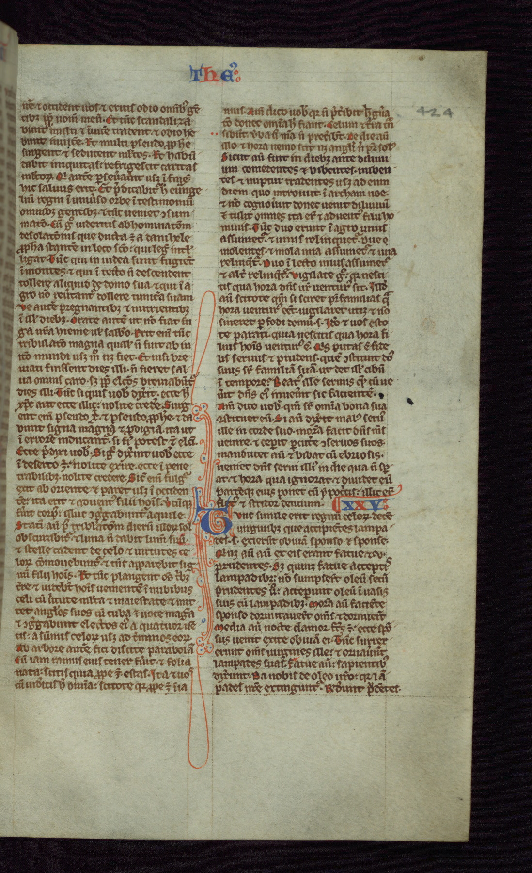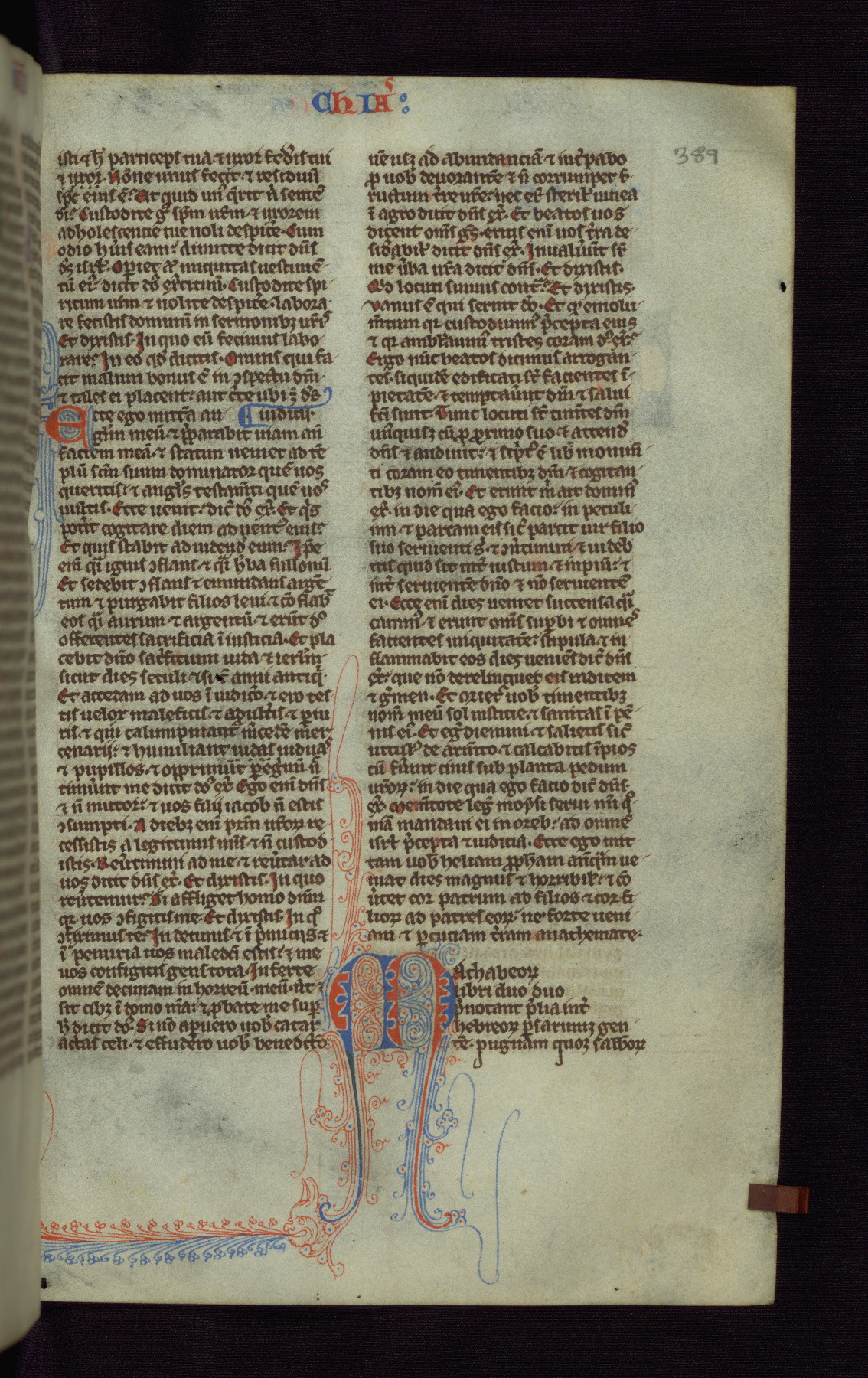 This pocket-size Bible was created around the middle of the thirteenth century in England. It contains the Vulgate text of the Old and New Testaments, arranged in order and divided into chapters. Such Bibles, designed for individual rather than institutional use, began to be created on a large scale during the thirteenth century, especially in Paris. This manuscript is illuminated with a large number of small historiated initials, and also includes a somewhat later image of the Three Living and the Three Dead, a popular scene based on a French poem of the same century.
