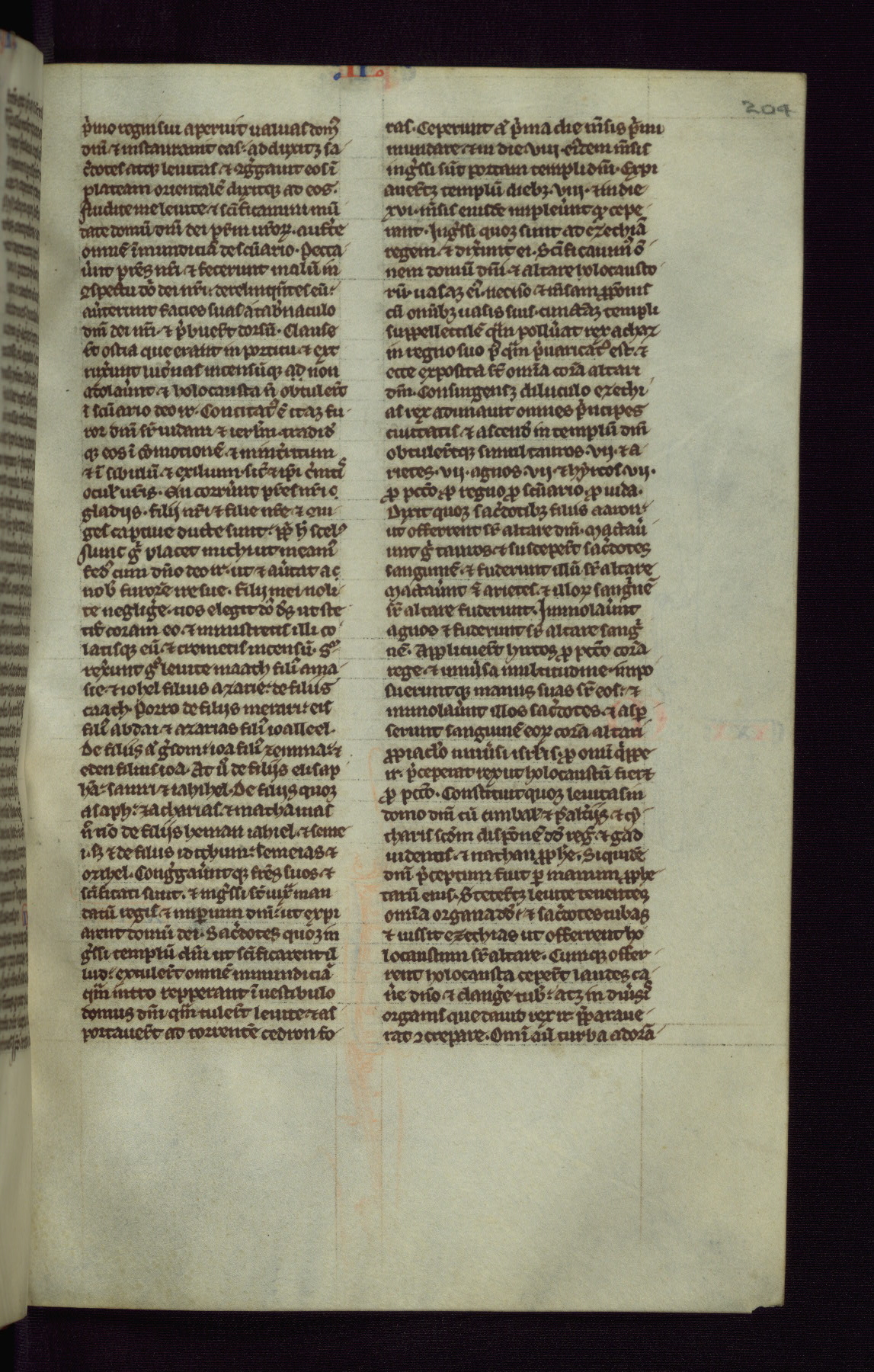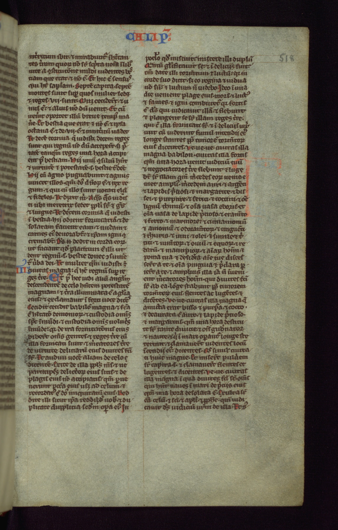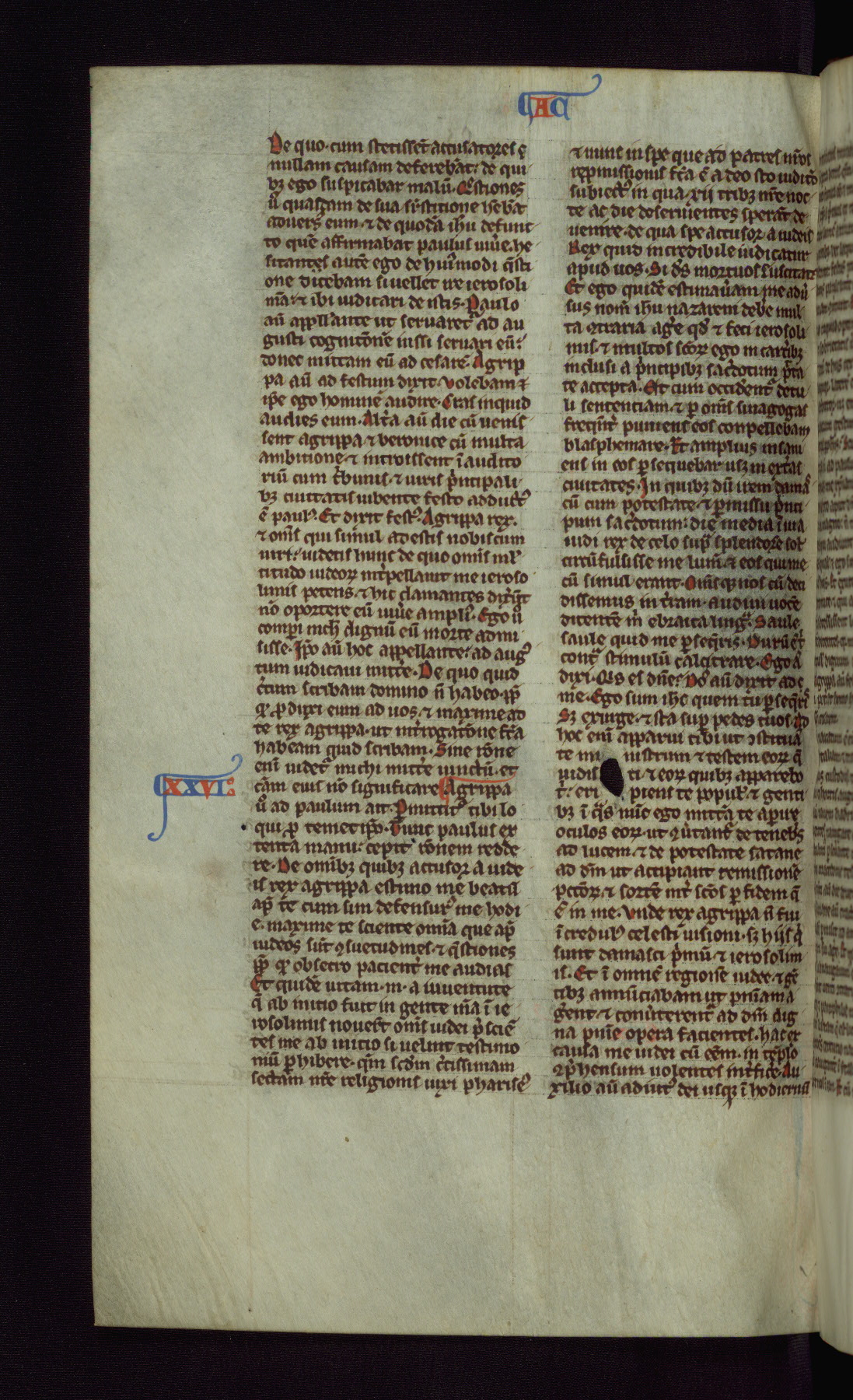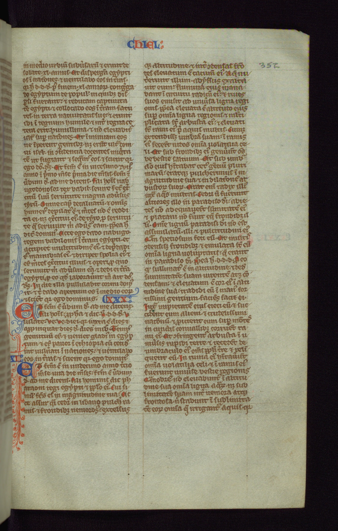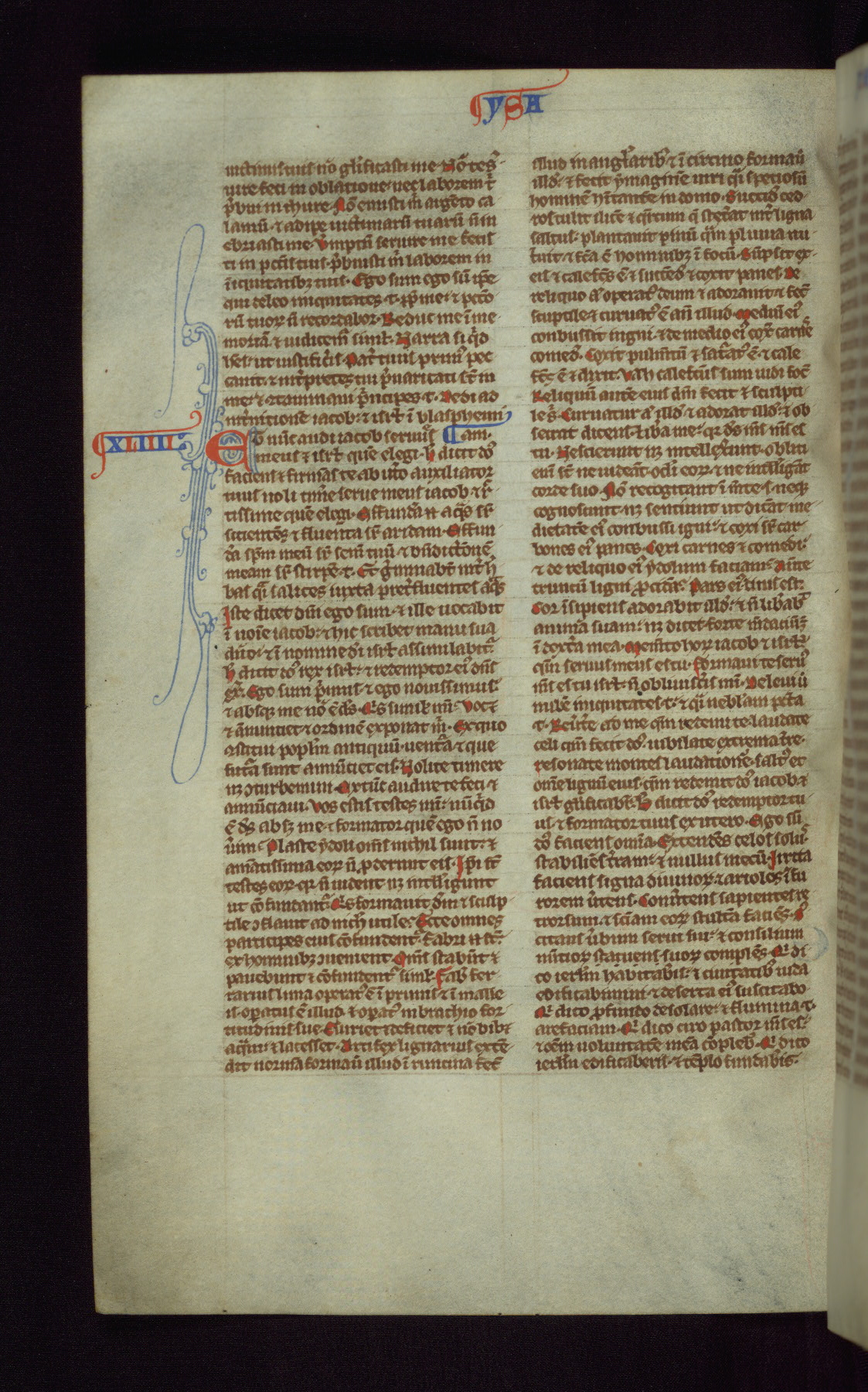 This pocket-size Bible was created around the middle of the thirteenth century in England. It contains the Vulgate text of the Old and New Testaments, arranged in order and divided into chapters. Such Bibles, designed for individual rather than institutional use, began to be created on a large scale during the thirteenth century, especially in Paris. This manuscript is illuminated with a large number of small historiated initials, and also includes a somewhat later image of the Three Living and the Three Dead, a popular scene based on a French poem of the same century.