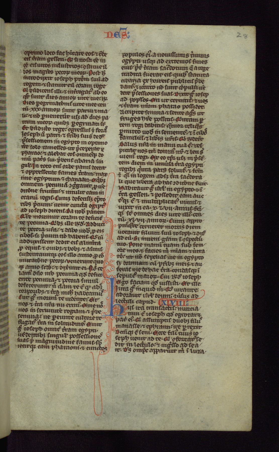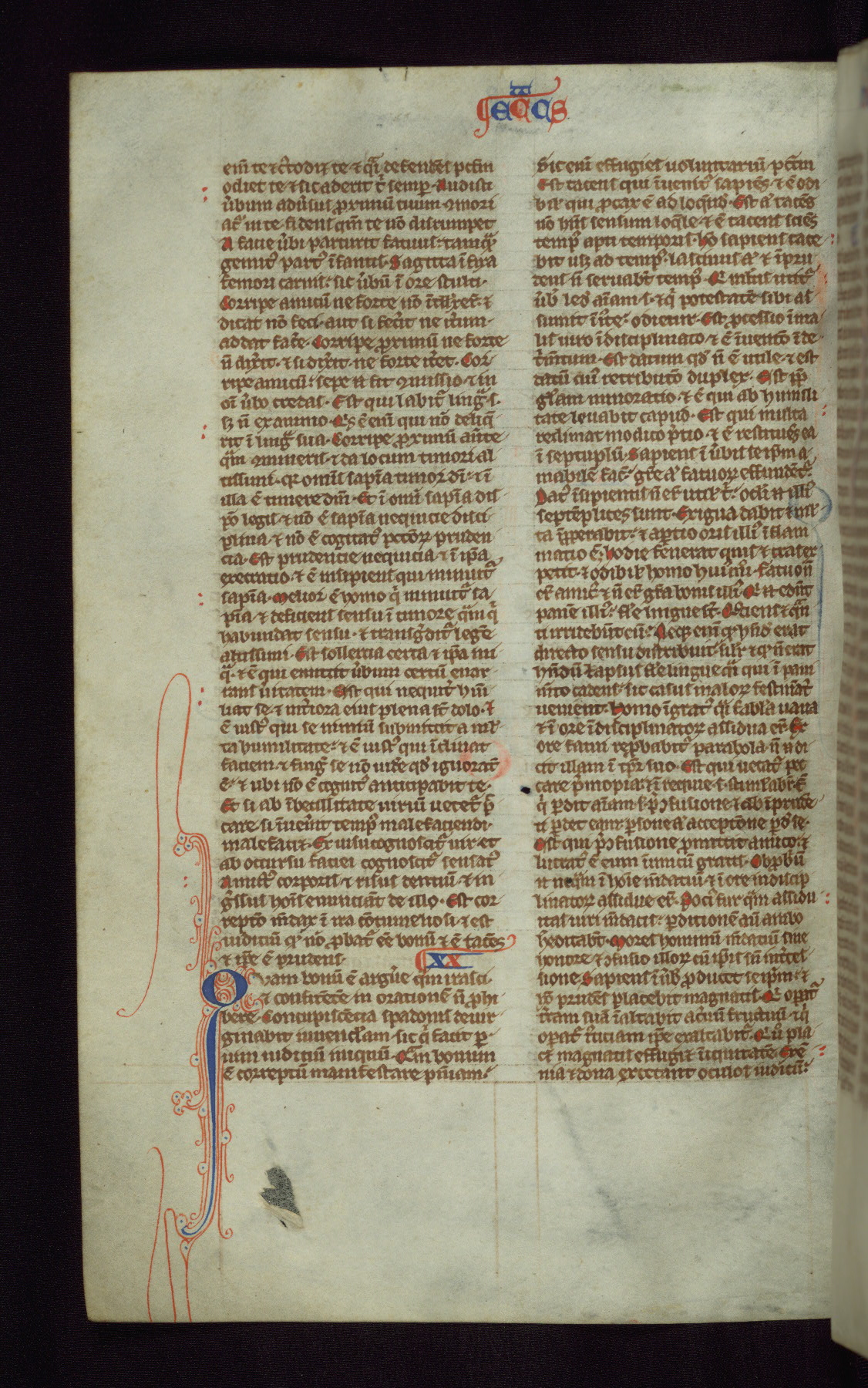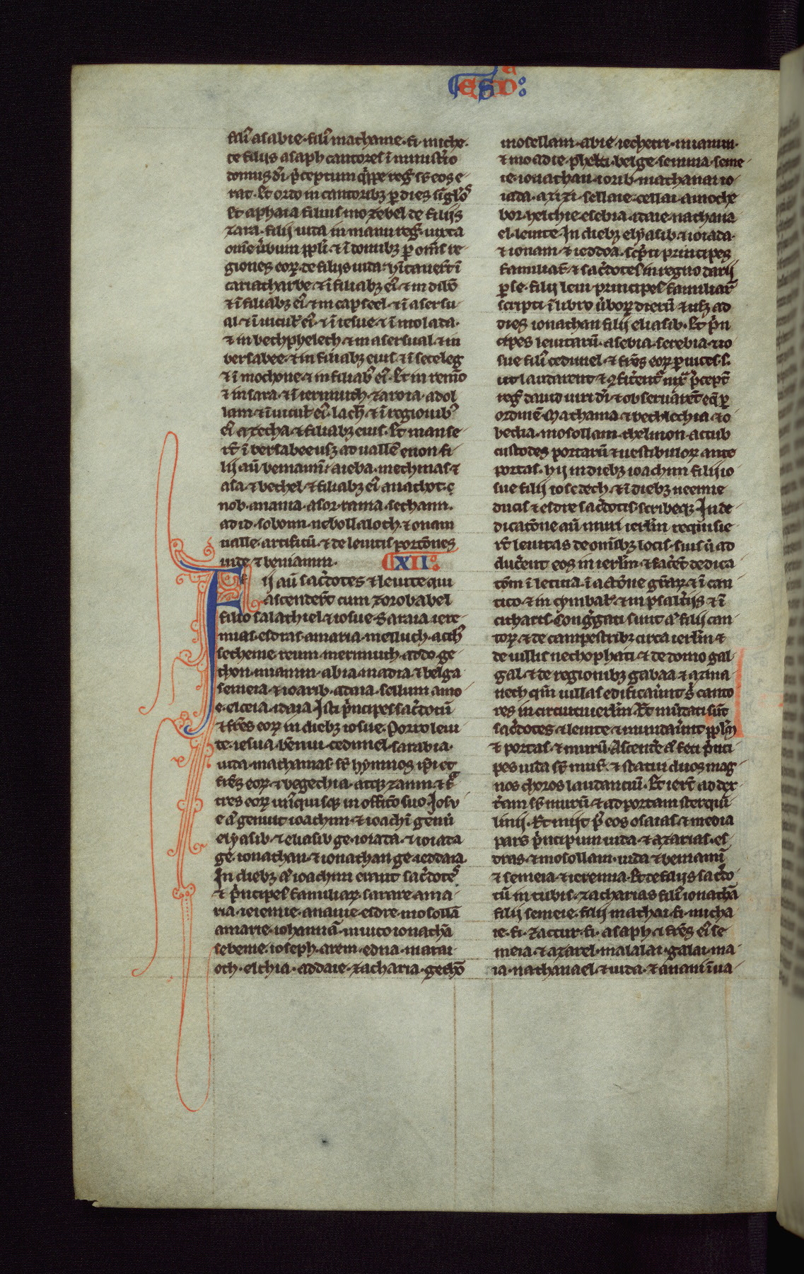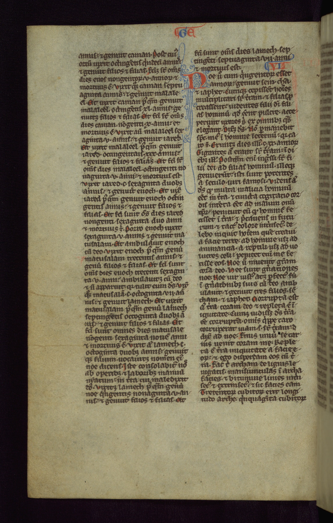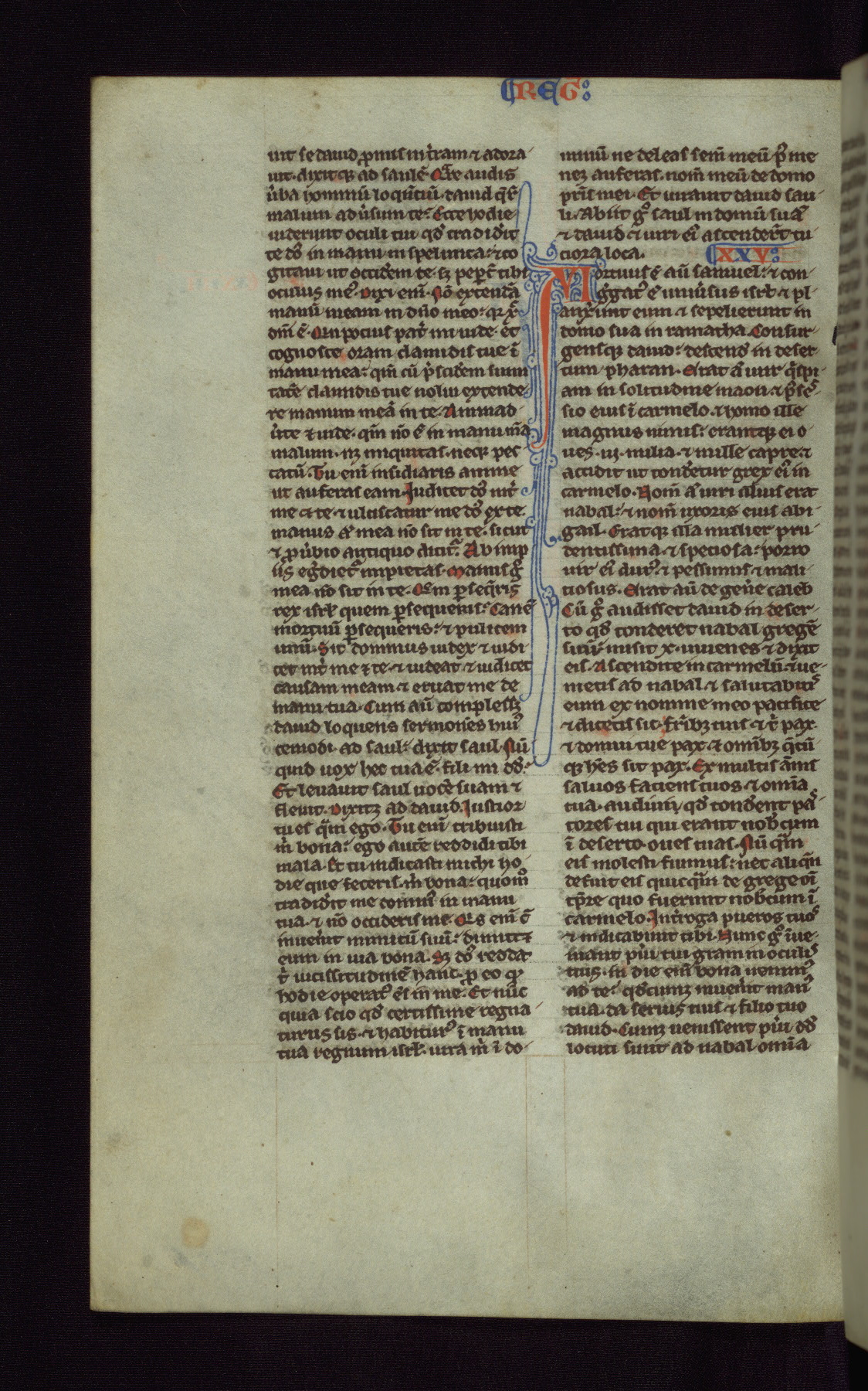This pocket-size Bible was created around the middle of the thirteenth century in England. It contains the Vulgate text of the Old and New Testaments, arranged in order and divided into chapters. Such Bibles, designed for individual rather than institutional use, began to be created on a large scale during the thirteenth century, especially in Paris. This manuscript is illuminated with a large number of small historiated initials, and also includes a somewhat later image of the Three Living and the Three Dead, a popular scene based on a French poem of the same century.