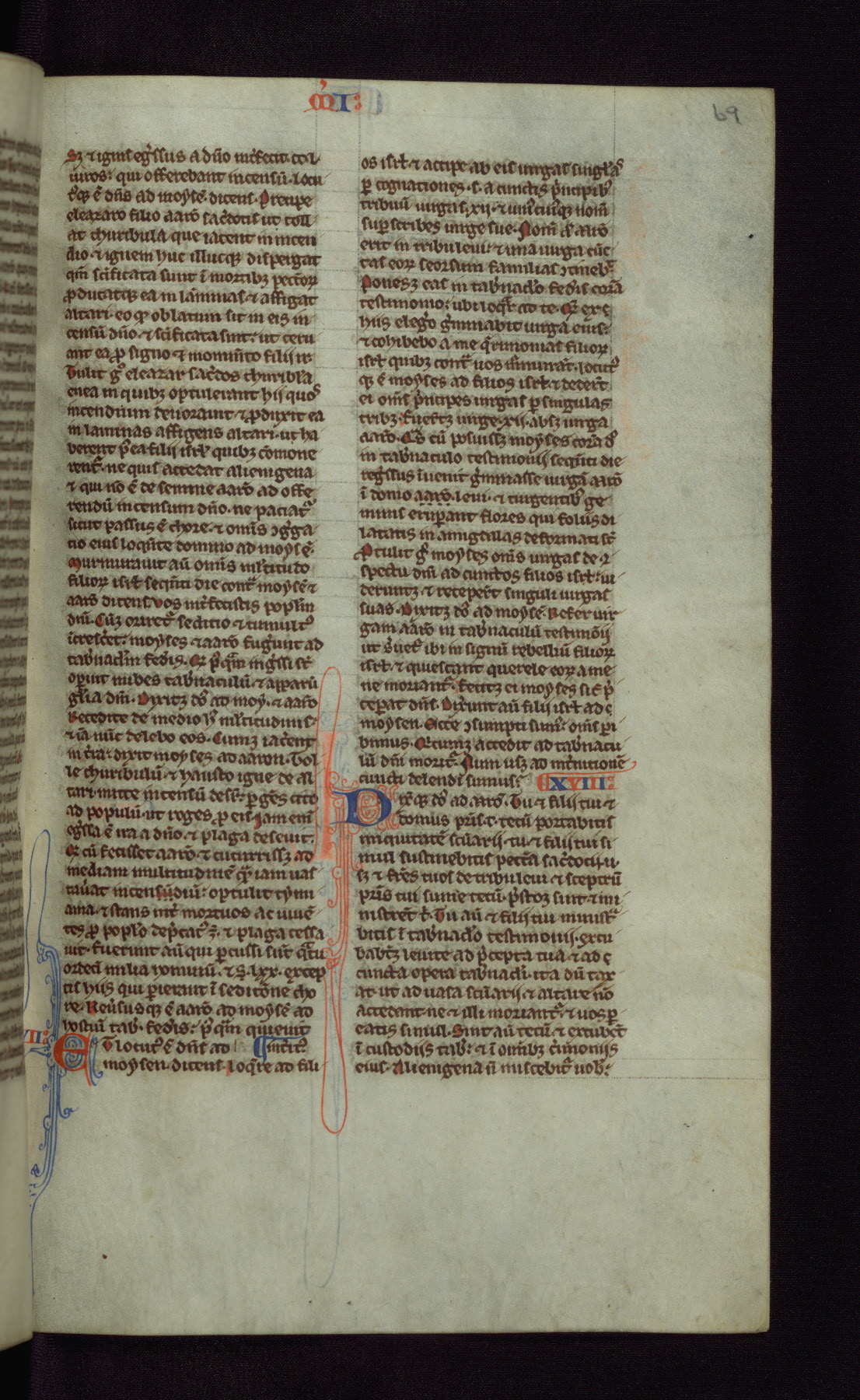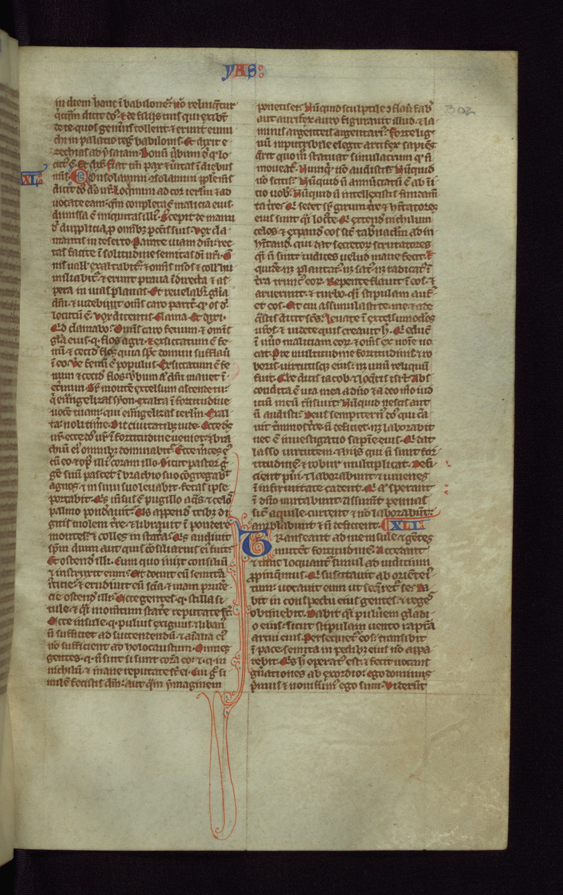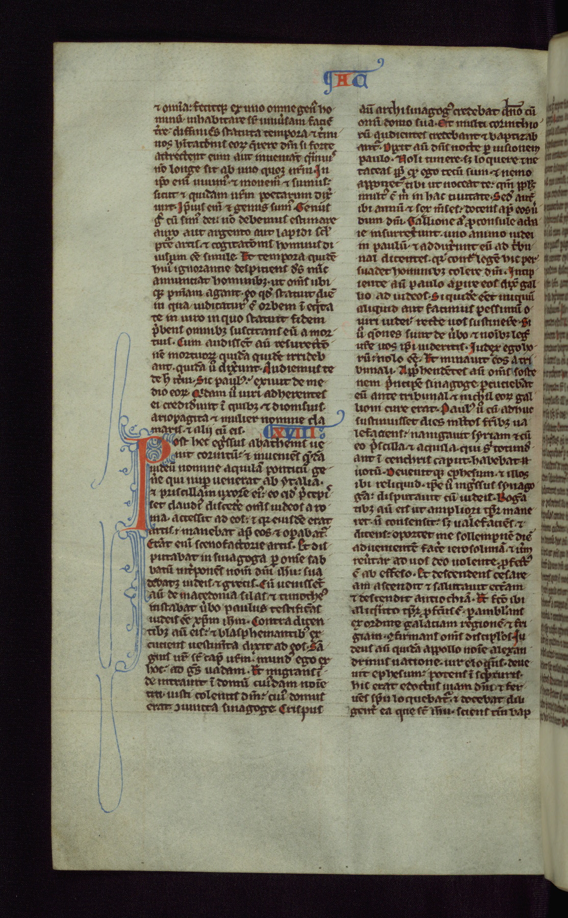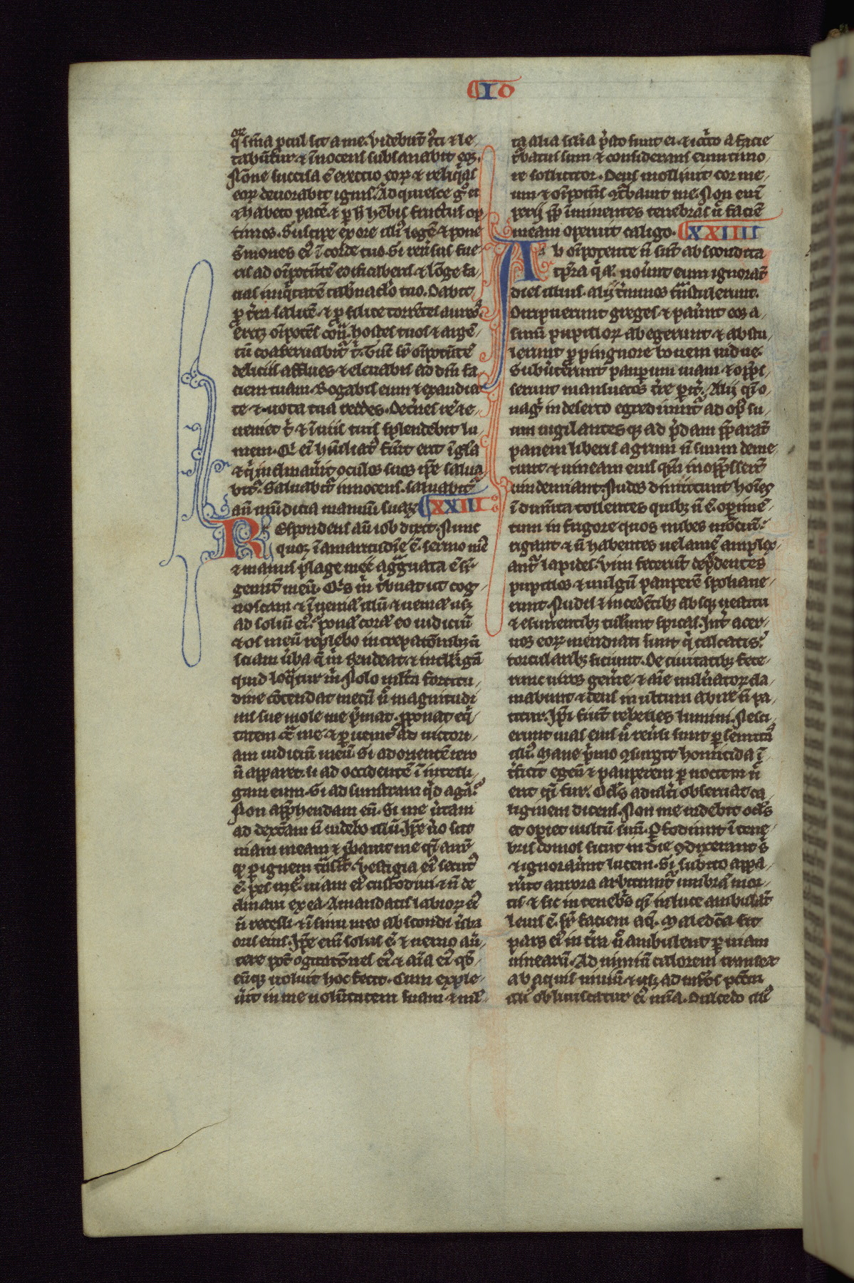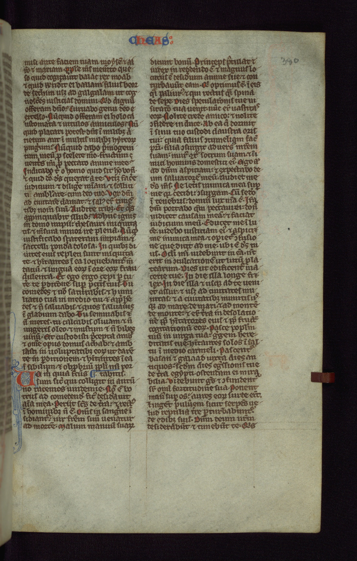 This pocket-size Bible was created around the middle of the thirteenth century in England. It contains the Vulgate text of the Old and New Testaments, arranged in order and divided into chapters. Such Bibles, designed for individual rather than institutional use, began to be created on a large scale during the thirteenth century, especially in Paris. This manuscript is illuminated with a large number of small historiated initials, and also includes a somewhat later image of the Three Living and the Three Dead, a popular scene based on a French poem of the same century.