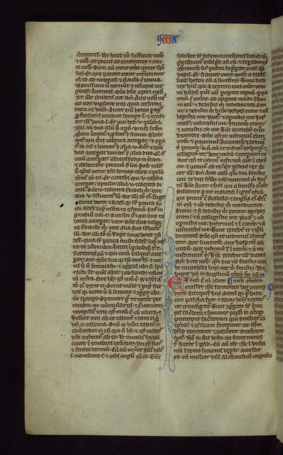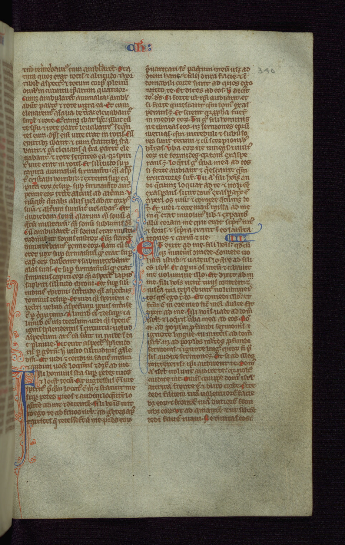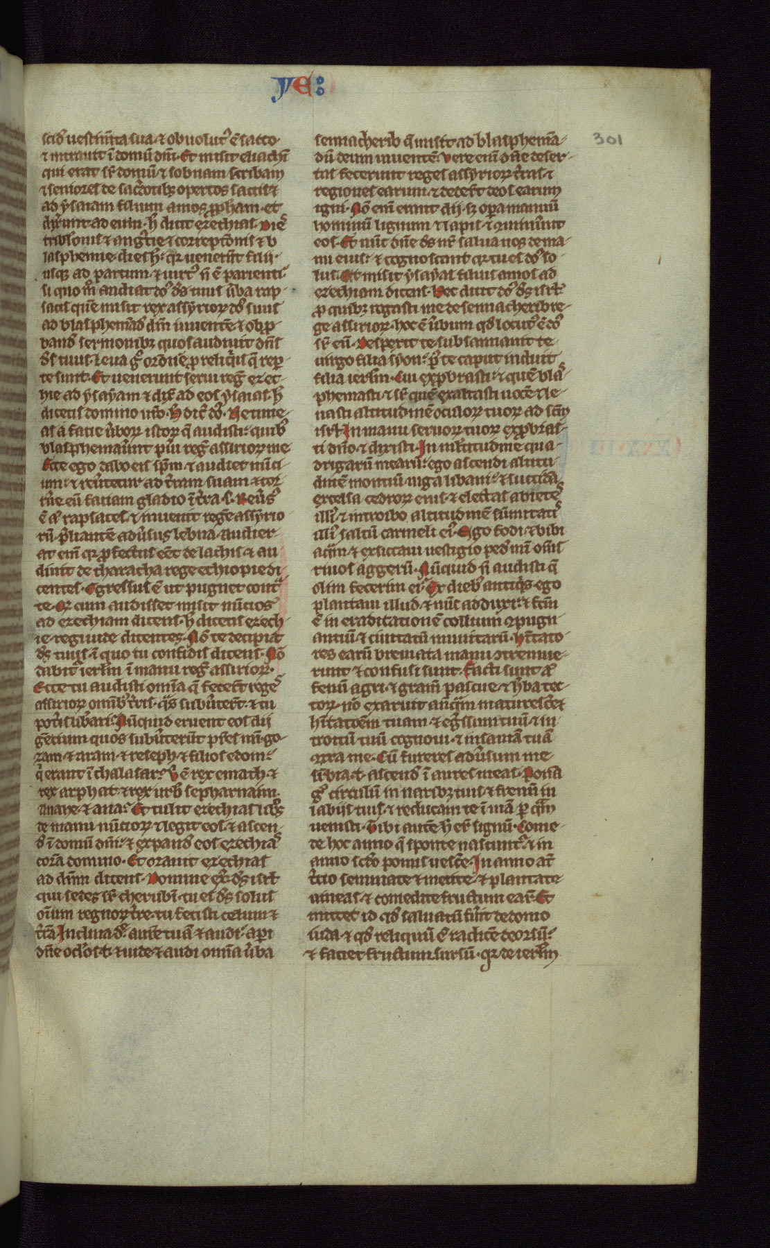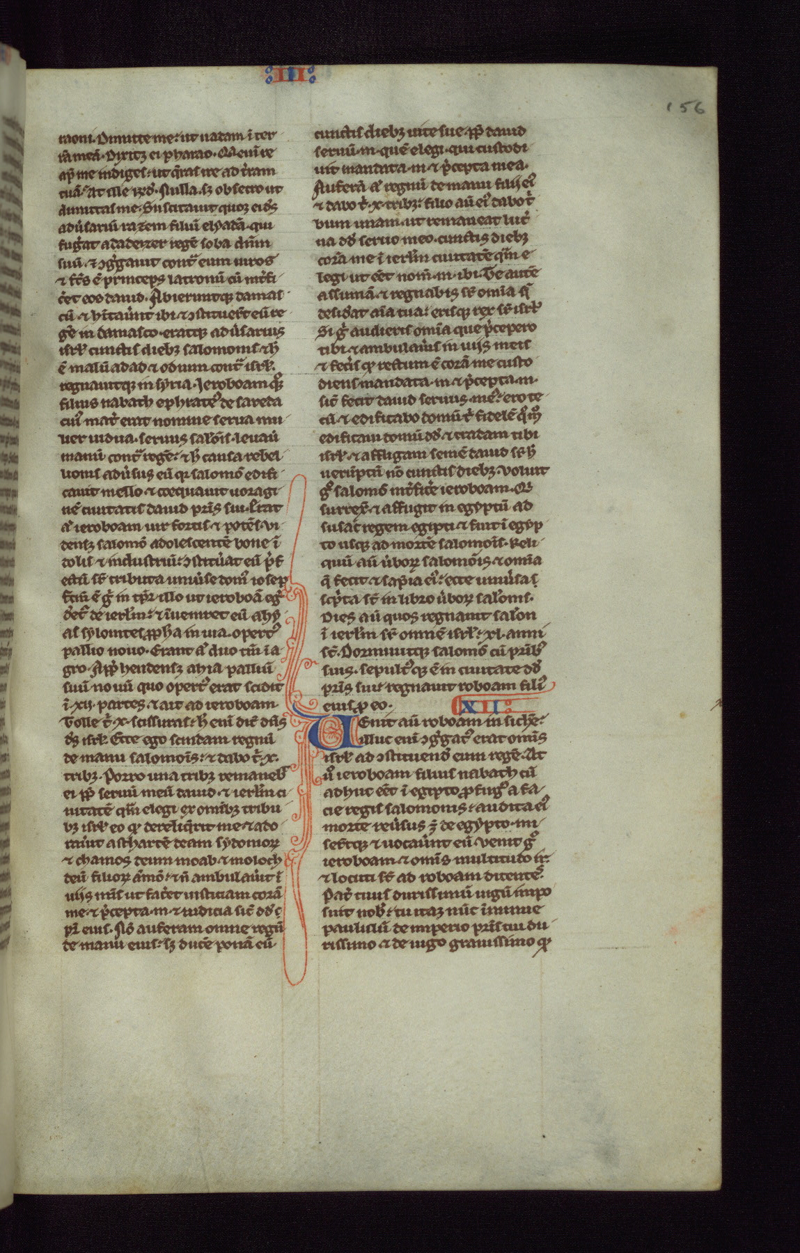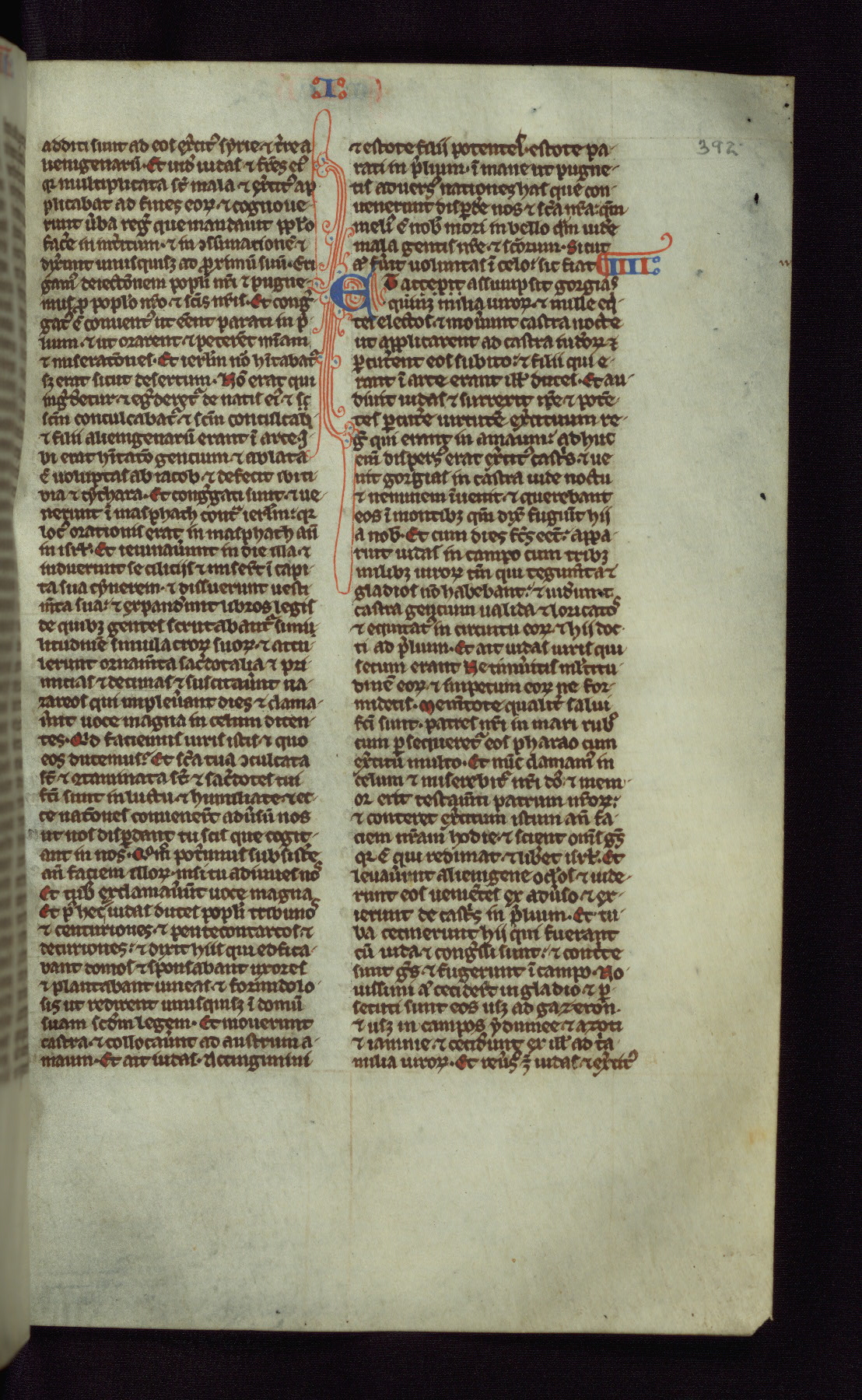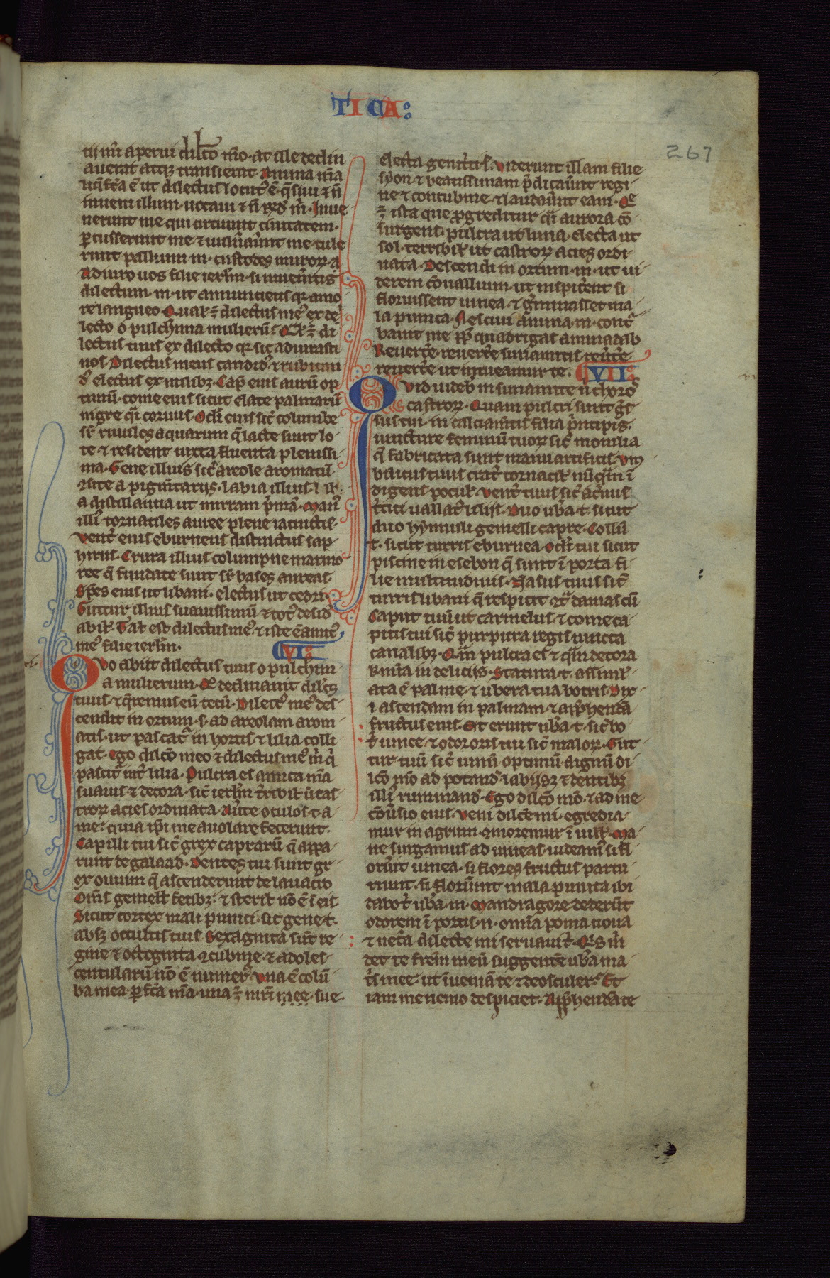 This pocket-size Bible was created around the middle of the thirteenth century in England. It contains the Vulgate text of the Old and New Testaments, arranged in order and divided into chapters. Such Bibles, designed for individual rather than institutional use, began to be created on a large scale during the thirteenth century, especially in Paris. This manuscript is illuminated with a large number of small historiated initials, and also includes a somewhat later image of the Three Living and the Three Dead, a popular scene based on a French poem of the same century.