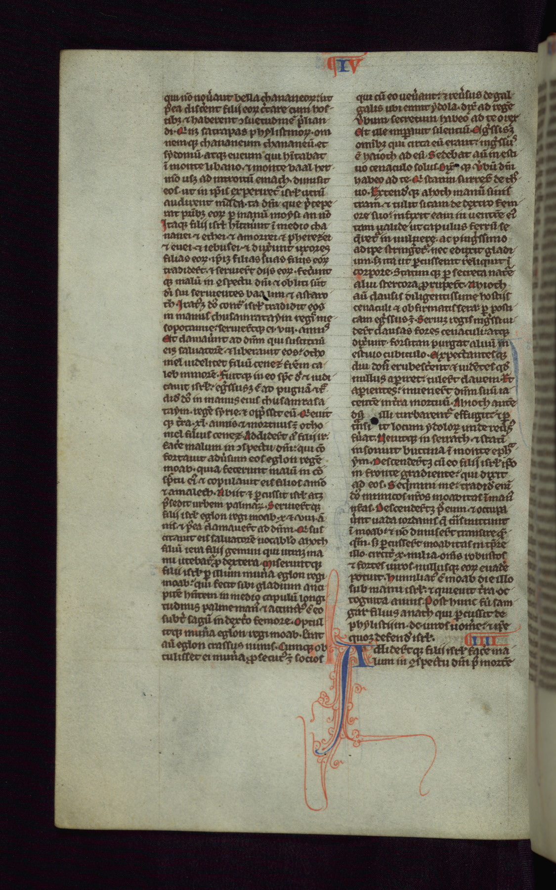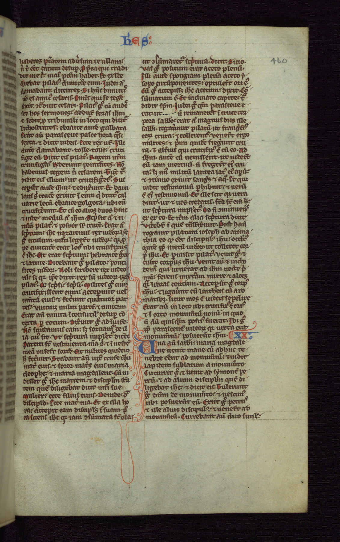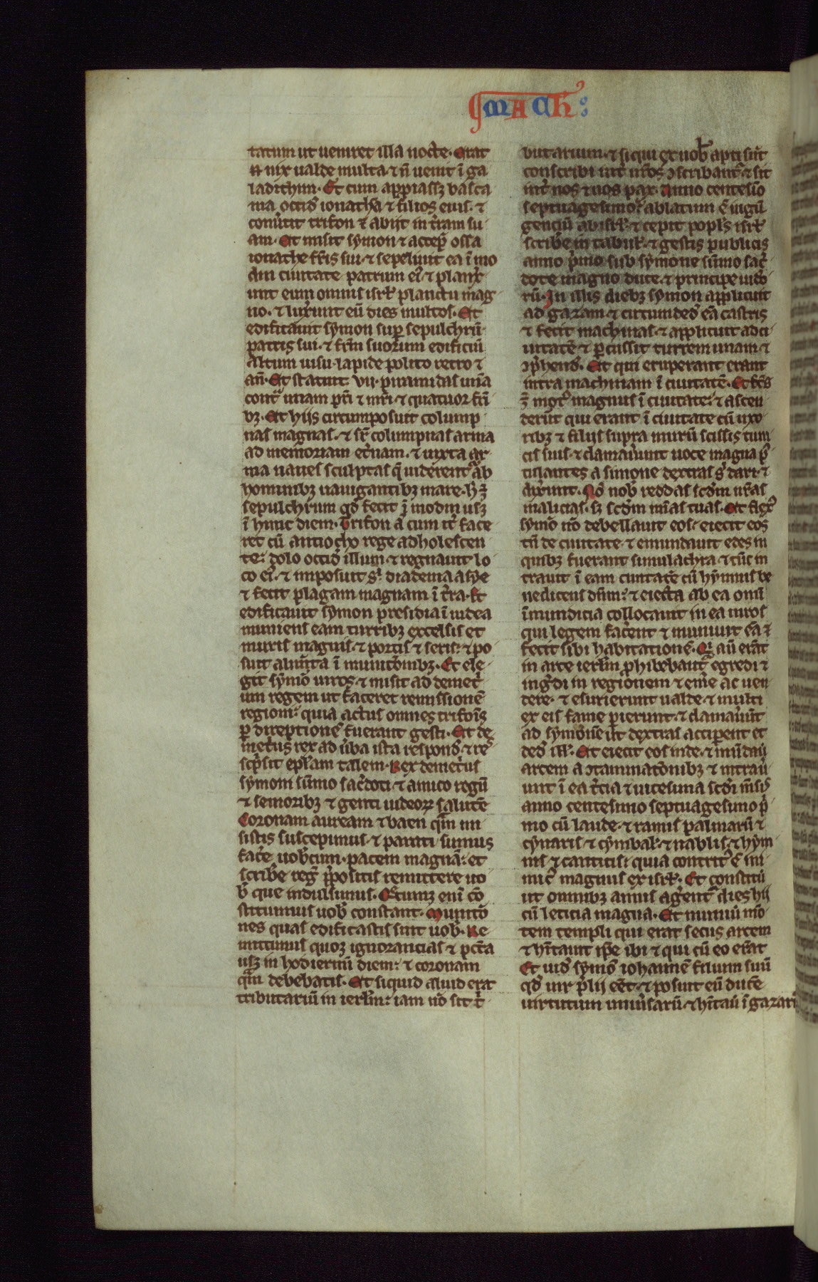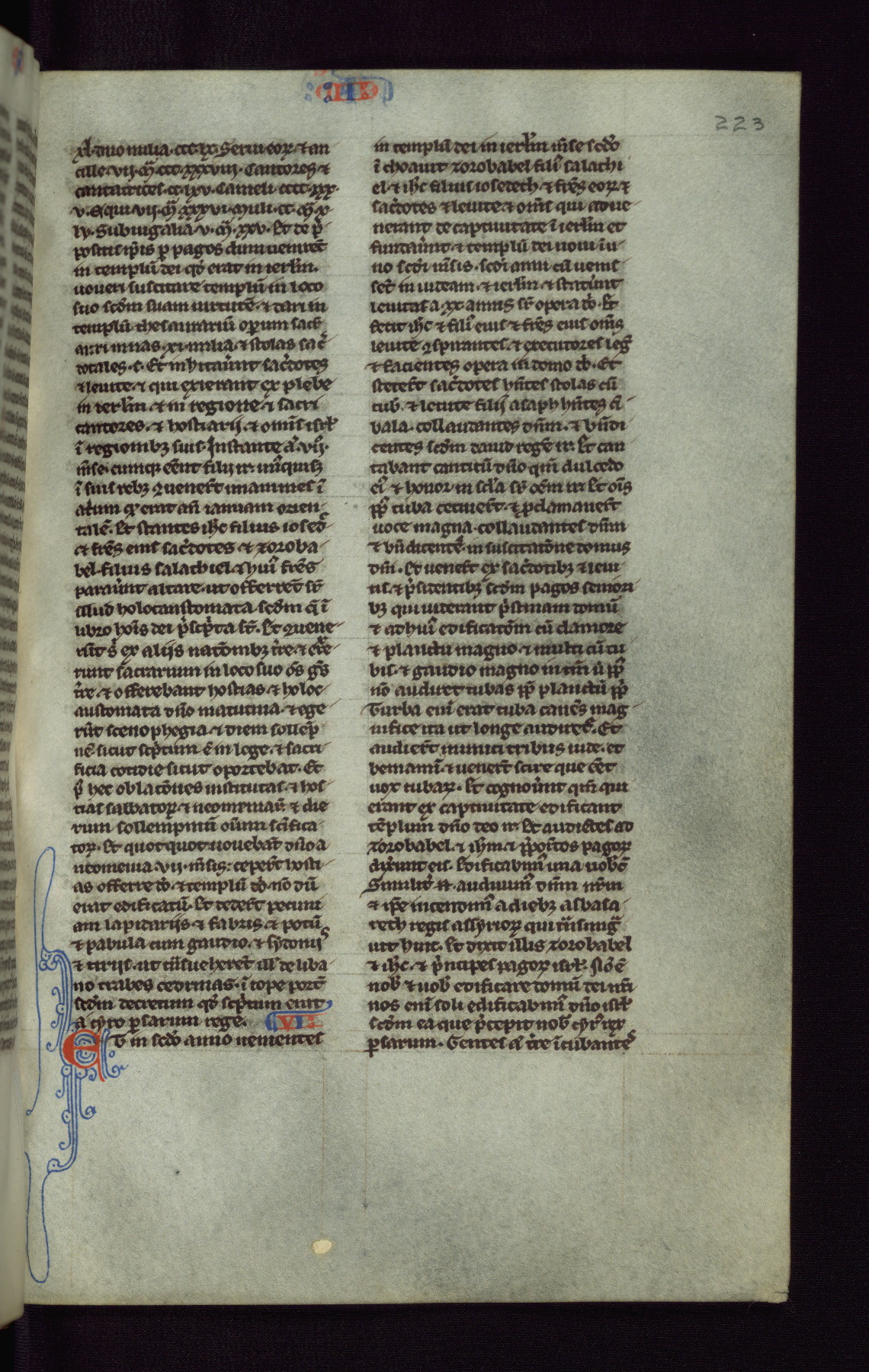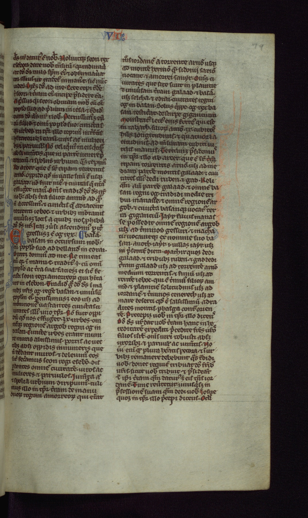 This pocket-size Bible was created around the middle of the thirteenth century in England. It contains the Vulgate text of the Old and New Testaments, arranged in order and divided into chapters. Such Bibles, designed for individual rather than institutional use, began to be created on a large scale during the thirteenth century, especially in Paris. This manuscript is illuminated with a large number of small historiated initials, and also includes a somewhat later image of the Three Living and the Three Dead, a popular scene based on a French poem of the same century.