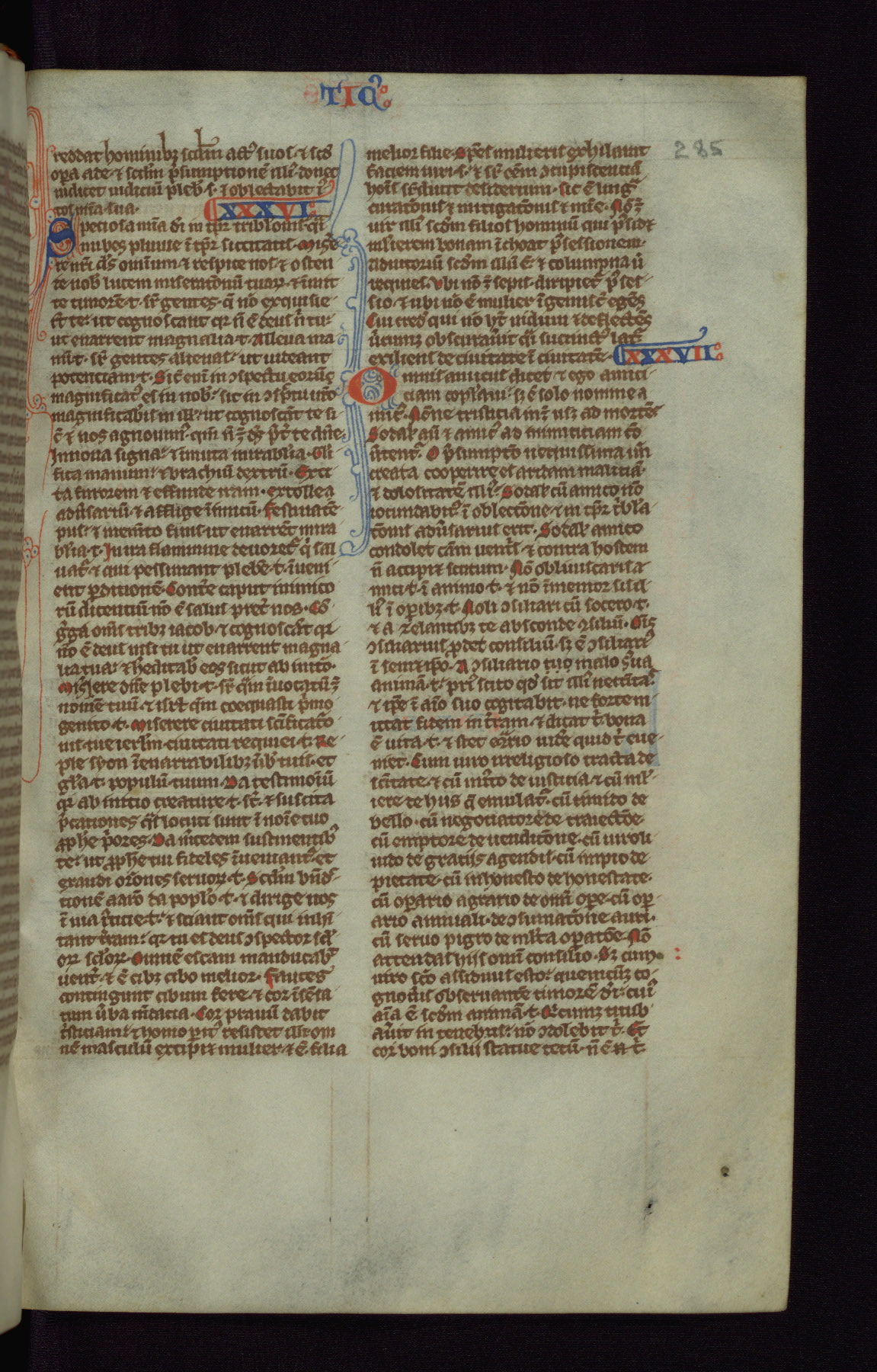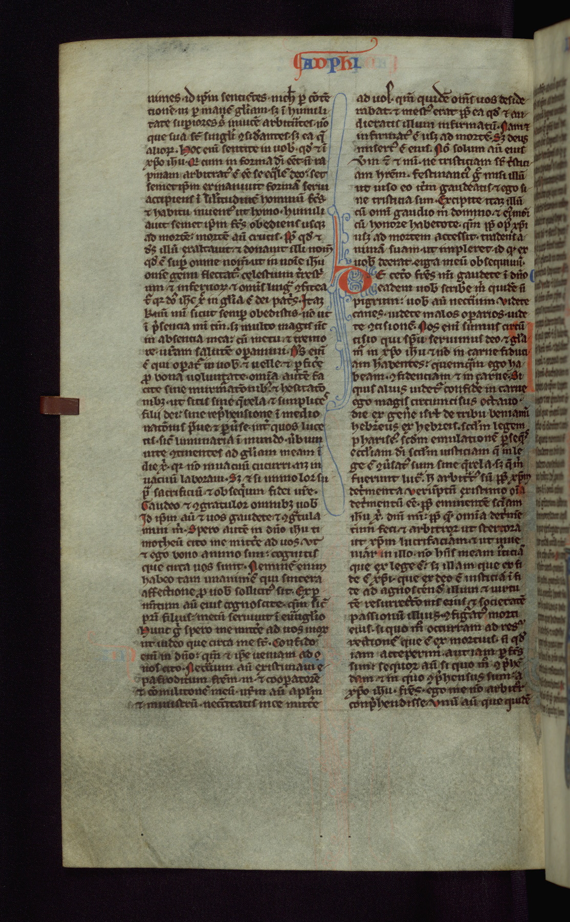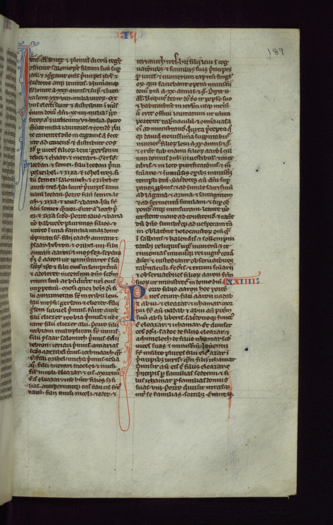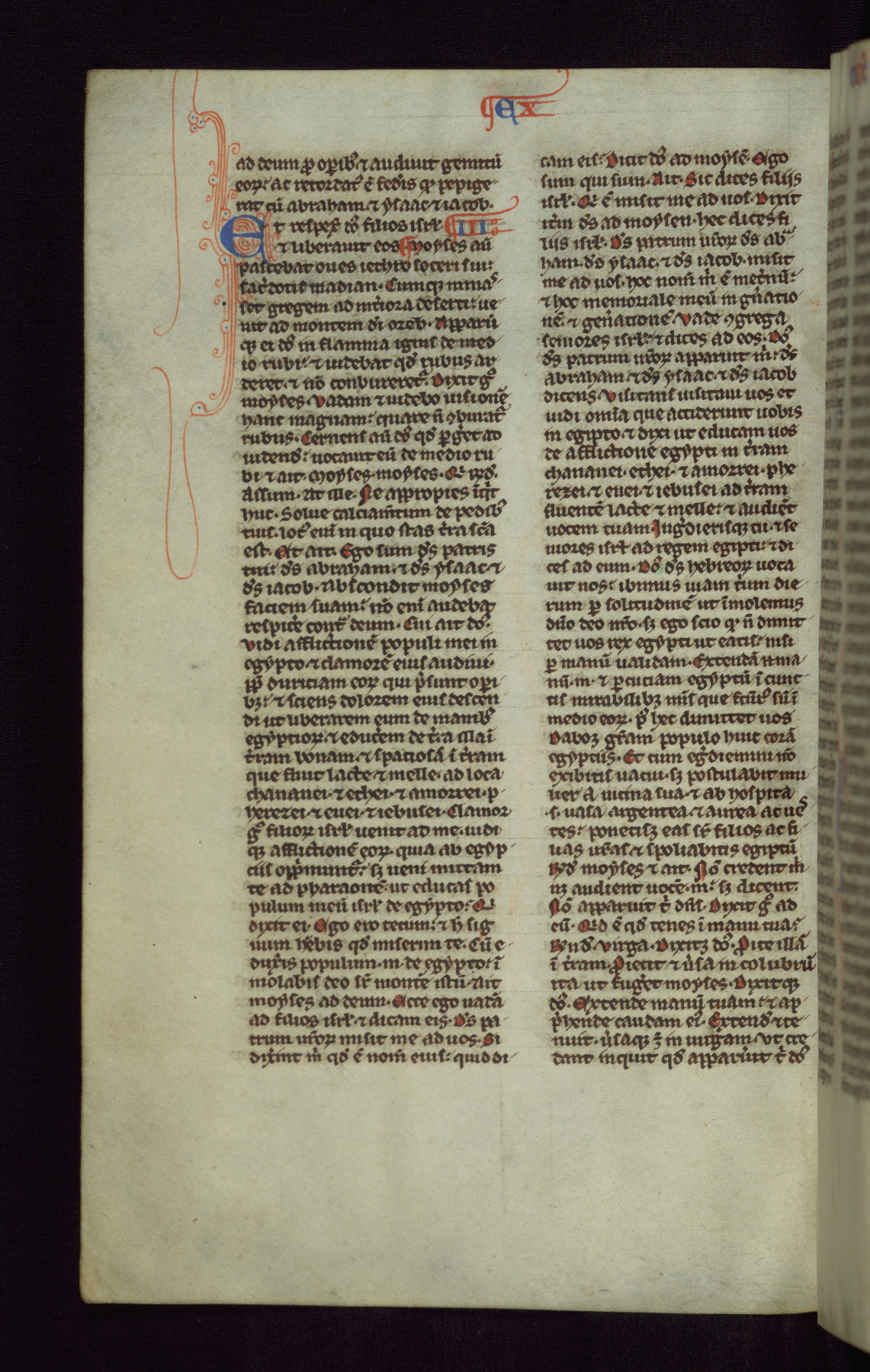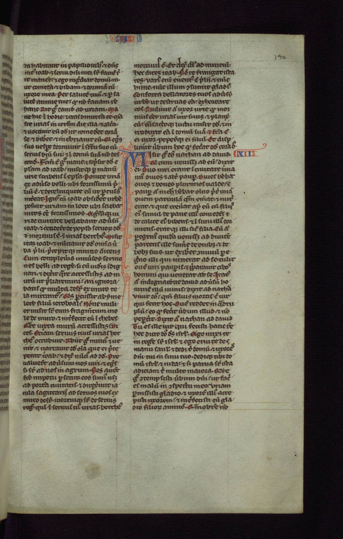 This pocket-size Bible was created around the middle of the thirteenth century in England. It contains the Vulgate text of the Old and New Testaments, arranged in order and divided into chapters. Such Bibles, designed for individual rather than institutional use, began to be created on a large scale during the thirteenth century, especially in Paris. This manuscript is illuminated with a large number of small historiated initials, and also includes a somewhat later image of the Three Living and the Three Dead, a popular scene based on a French poem of the same century.