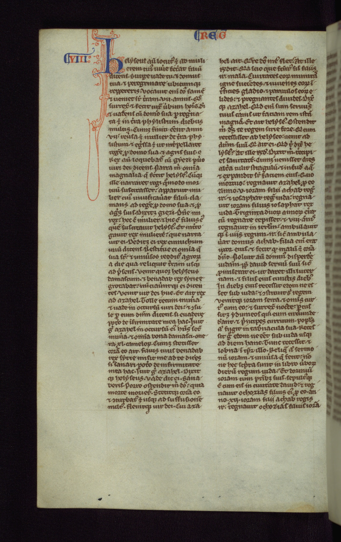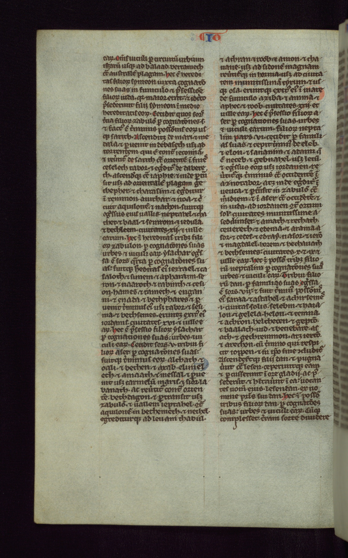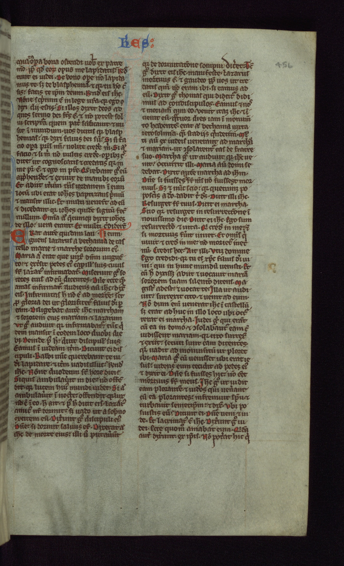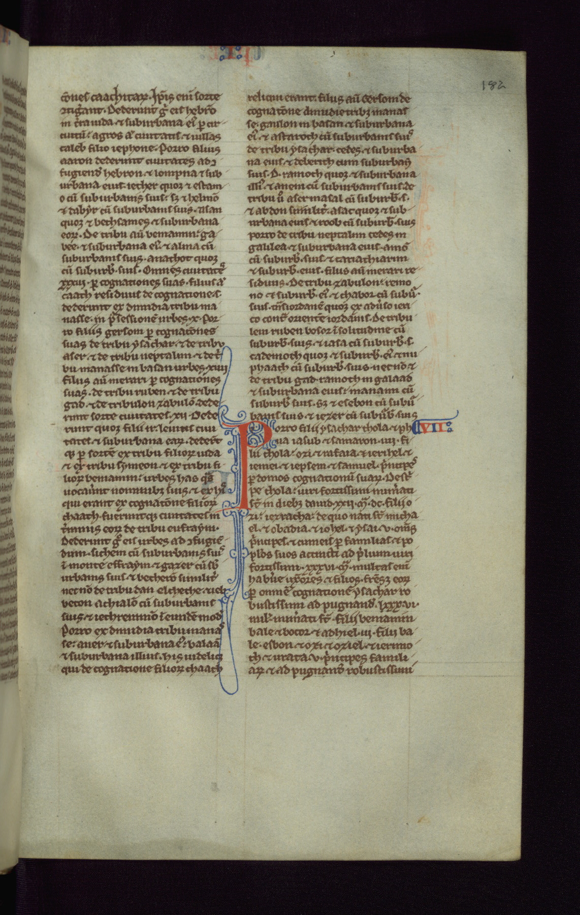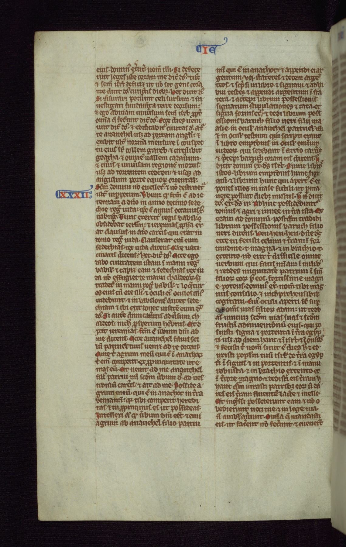 This pocket-size Bible was created around the middle of the thirteenth century in England. It contains the Vulgate text of the Old and New Testaments, arranged in order and divided into chapters. Such Bibles, designed for individual rather than institutional use, began to be created on a large scale during the thirteenth century, especially in Paris. This manuscript is illuminated with a large number of small historiated initials, and also includes a somewhat later image of the Three Living and the Three Dead, a popular scene based on a French poem of the same century.