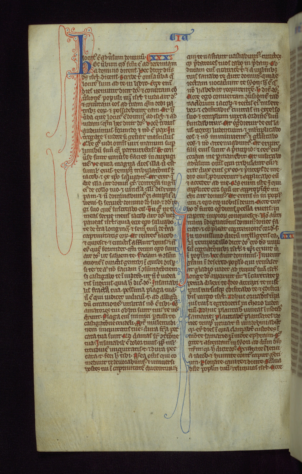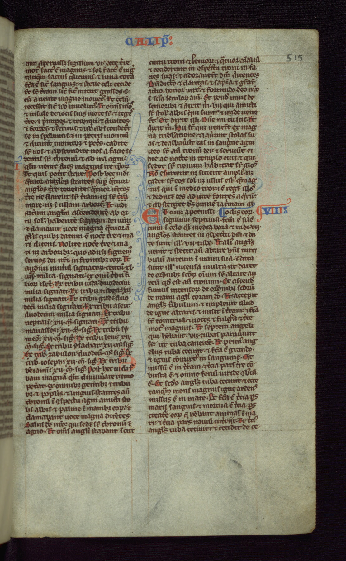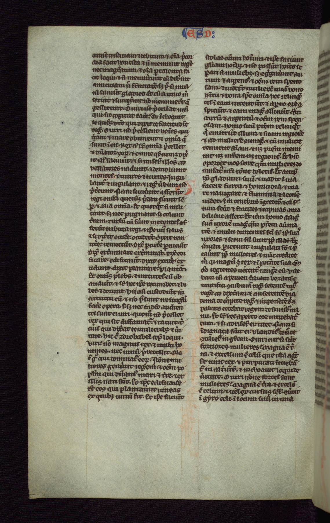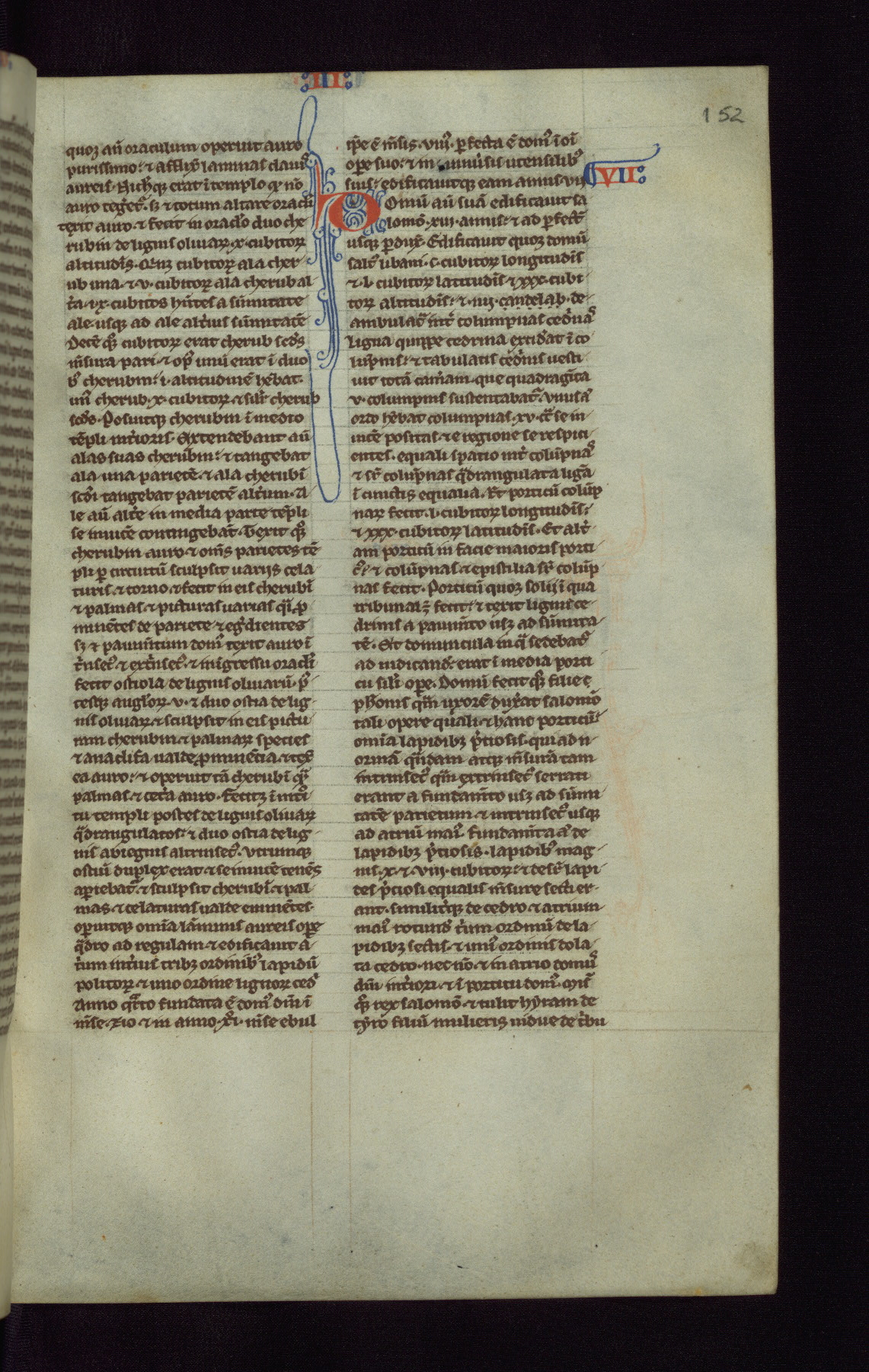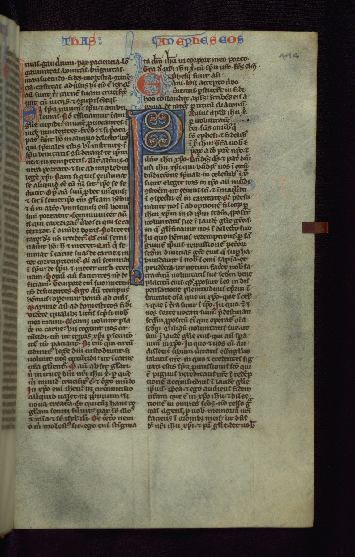 This pocket-size Bible was created around the middle of the thirteenth century in England. It contains the Vulgate text of the Old and New Testaments, arranged in order and divided into chapters. Such Bibles, designed for individual rather than institutional use, began to be created on a large scale during the thirteenth century, especially in Paris. This manuscript is illuminated with a large number of small historiated initials, and also includes a somewhat later image of the Three Living and the Three Dead, a popular scene based on a French poem of the same century.