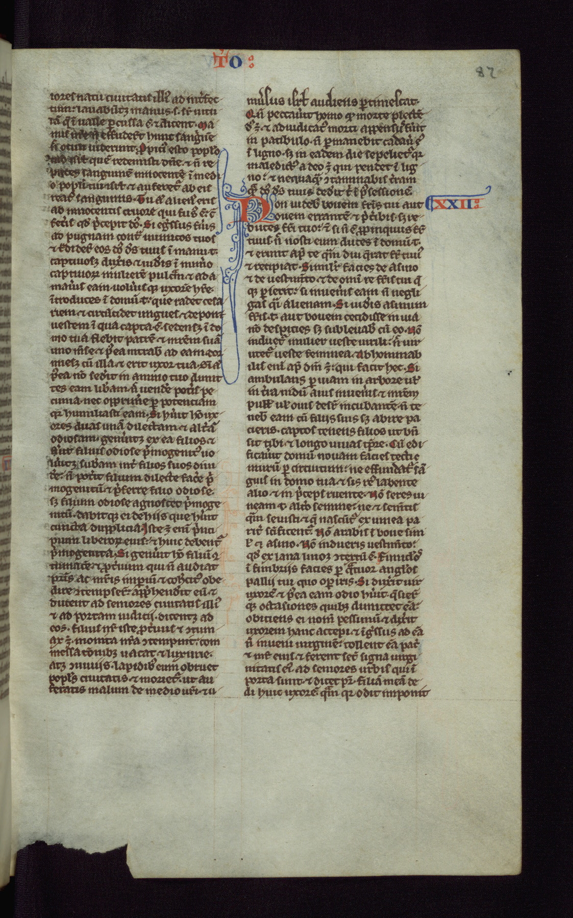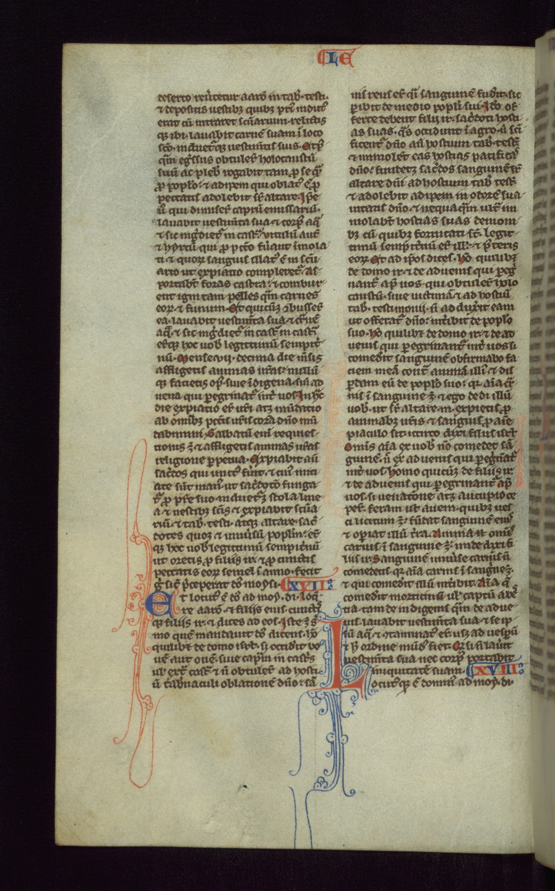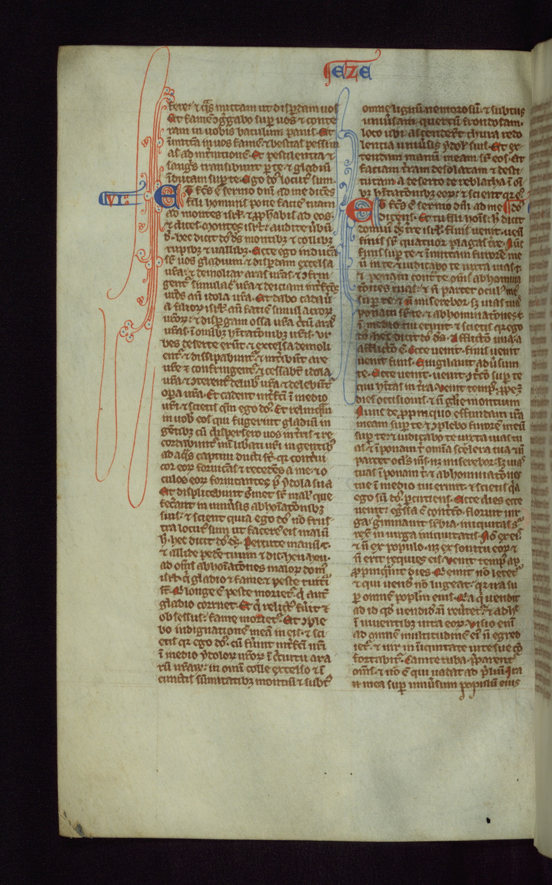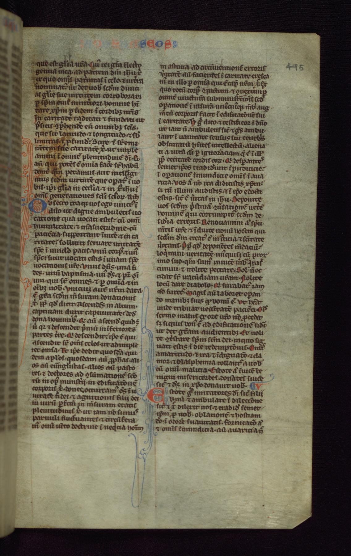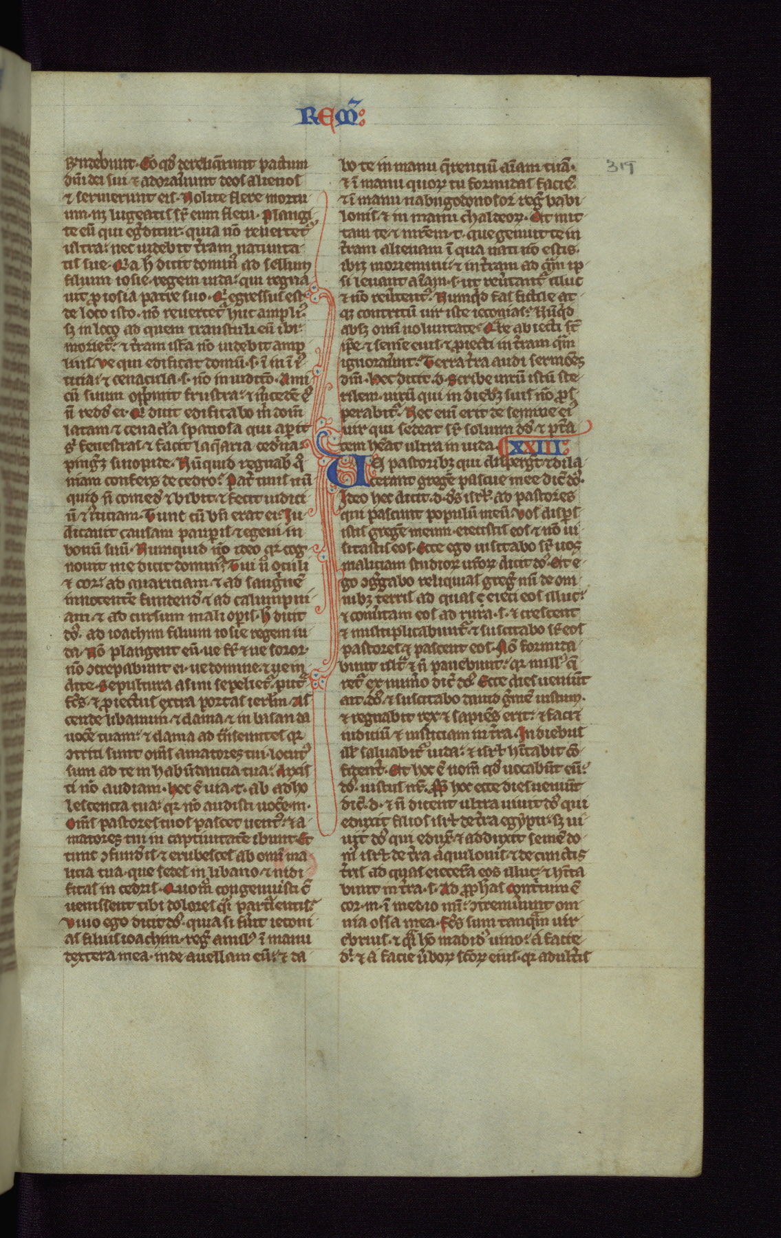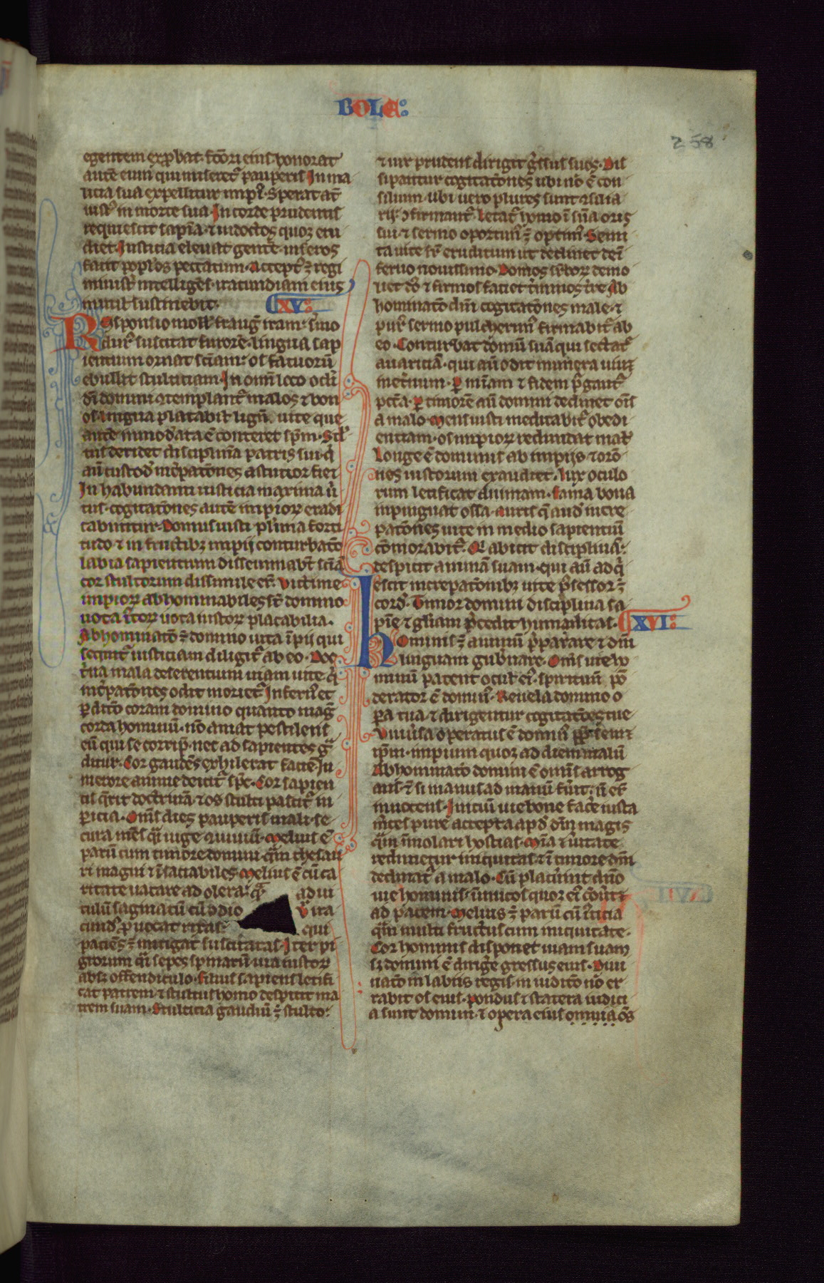 This pocket-size Bible was created around the middle of the thirteenth century in England. It contains the Vulgate text of the Old and New Testaments, arranged in order and divided into chapters. Such Bibles, designed for individual rather than institutional use, began to be created on a large scale during the thirteenth century, especially in Paris. This manuscript is illuminated with a large number of small historiated initials, and also includes a somewhat later image of the Three Living and the Three Dead, a popular scene based on a French poem of the same century.