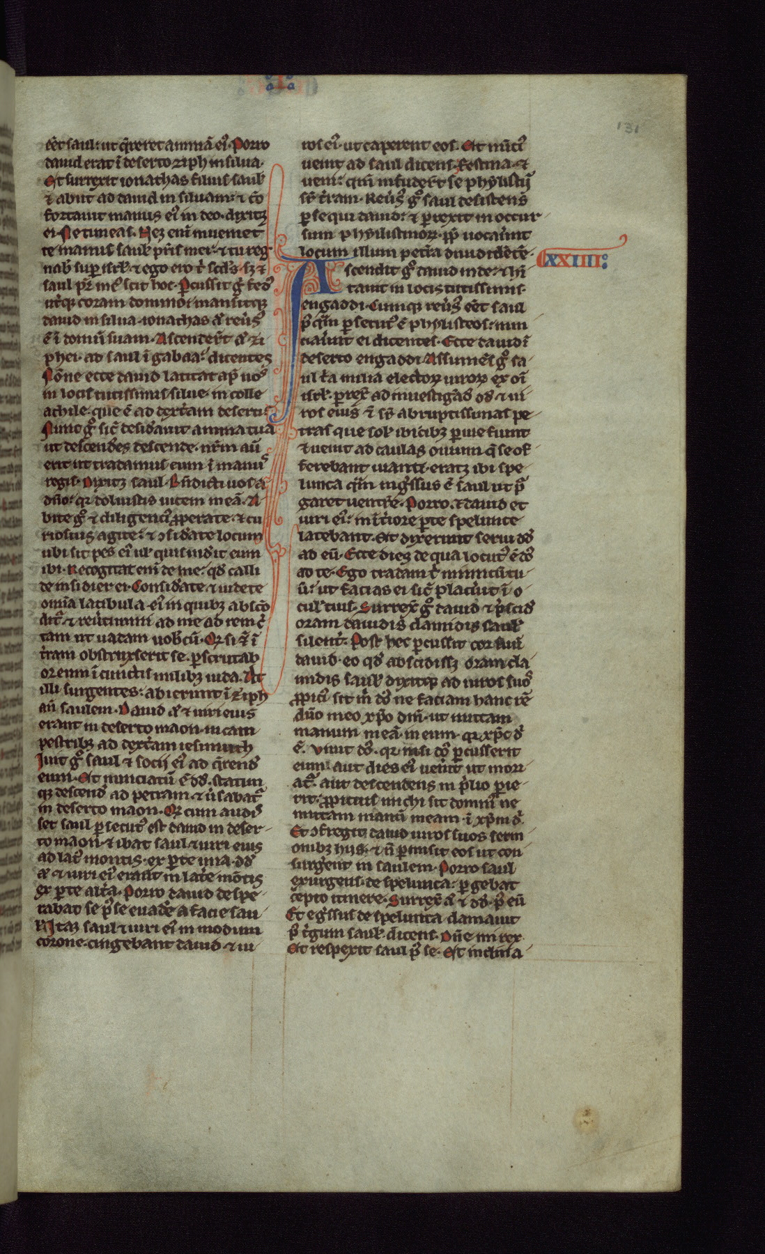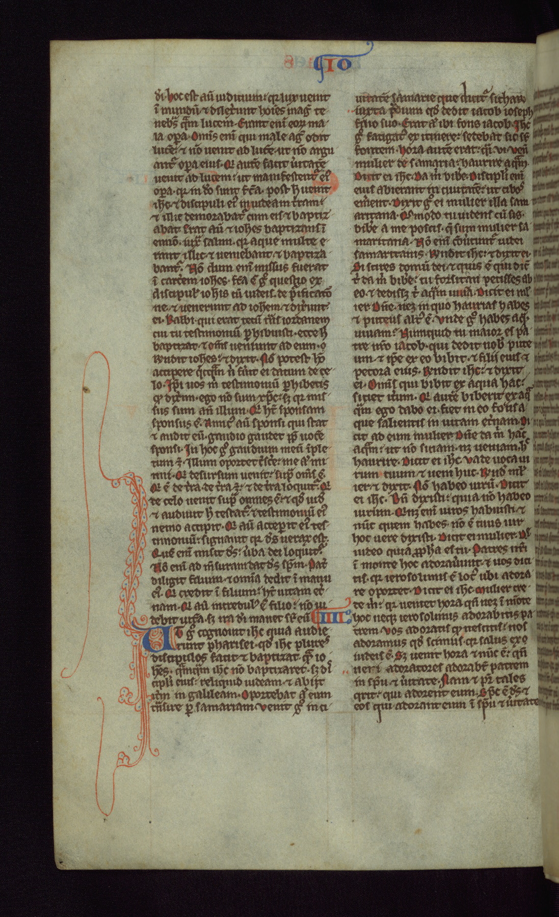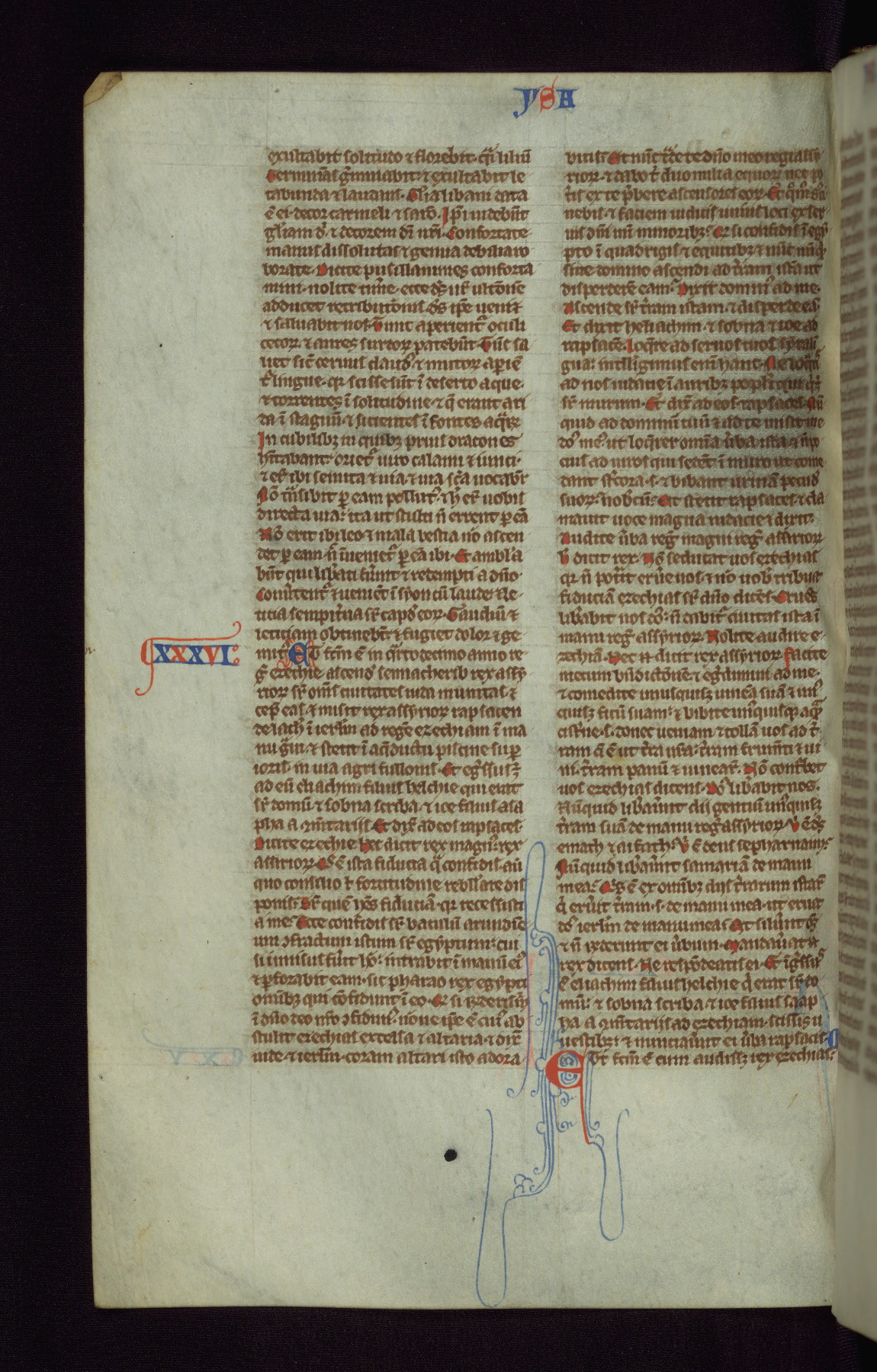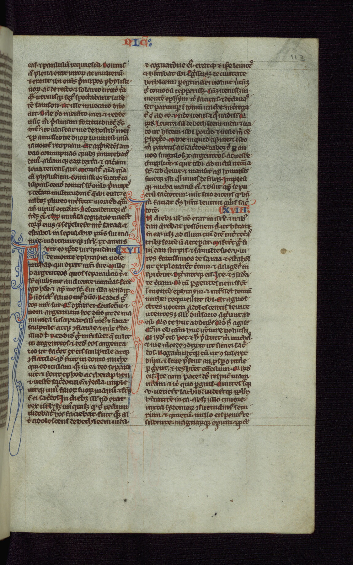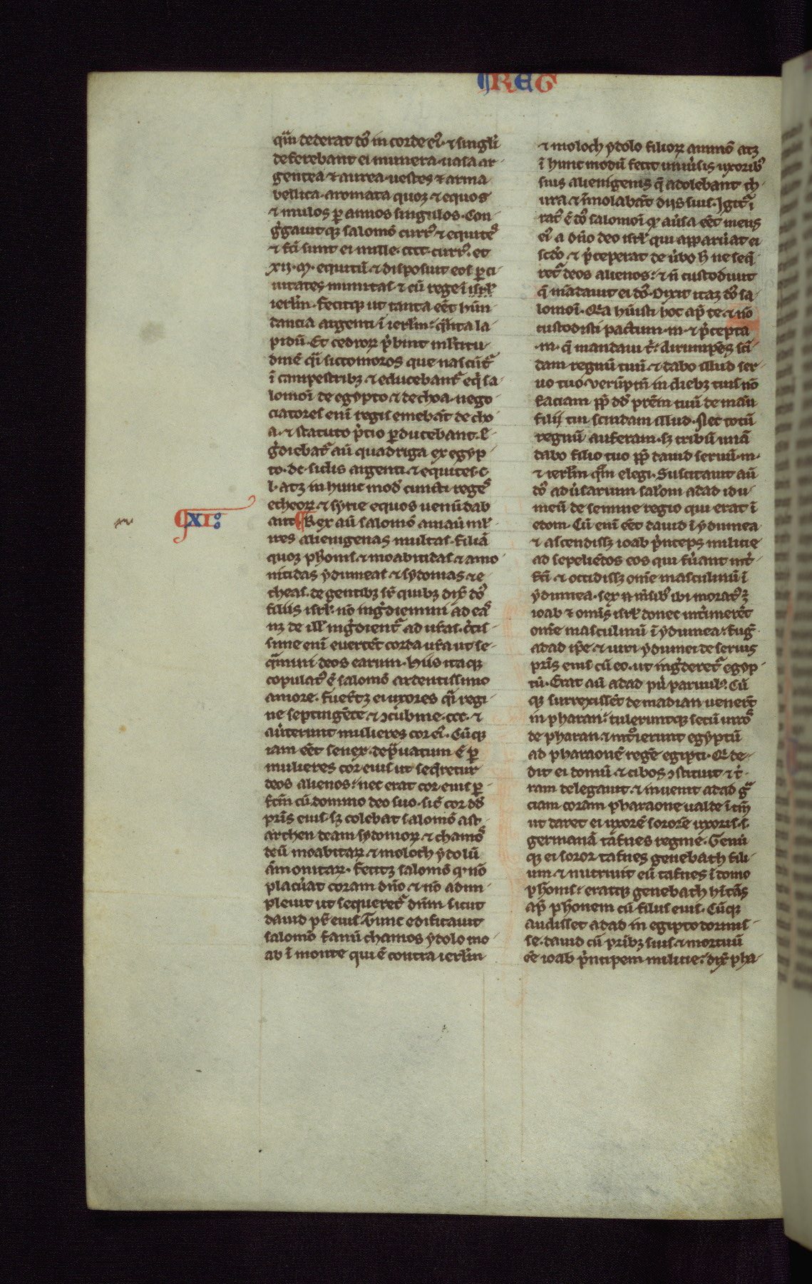 This pocket-size Bible was created around the middle of the thirteenth century in England. It contains the Vulgate text of the Old and New Testaments, arranged in order and divided into chapters. Such Bibles, designed for individual rather than institutional use, began to be created on a large scale during the thirteenth century, especially in Paris. This manuscript is illuminated with a large number of small historiated initials, and also includes a somewhat later image of the Three Living and the Three Dead, a popular scene based on a French poem of the same century.