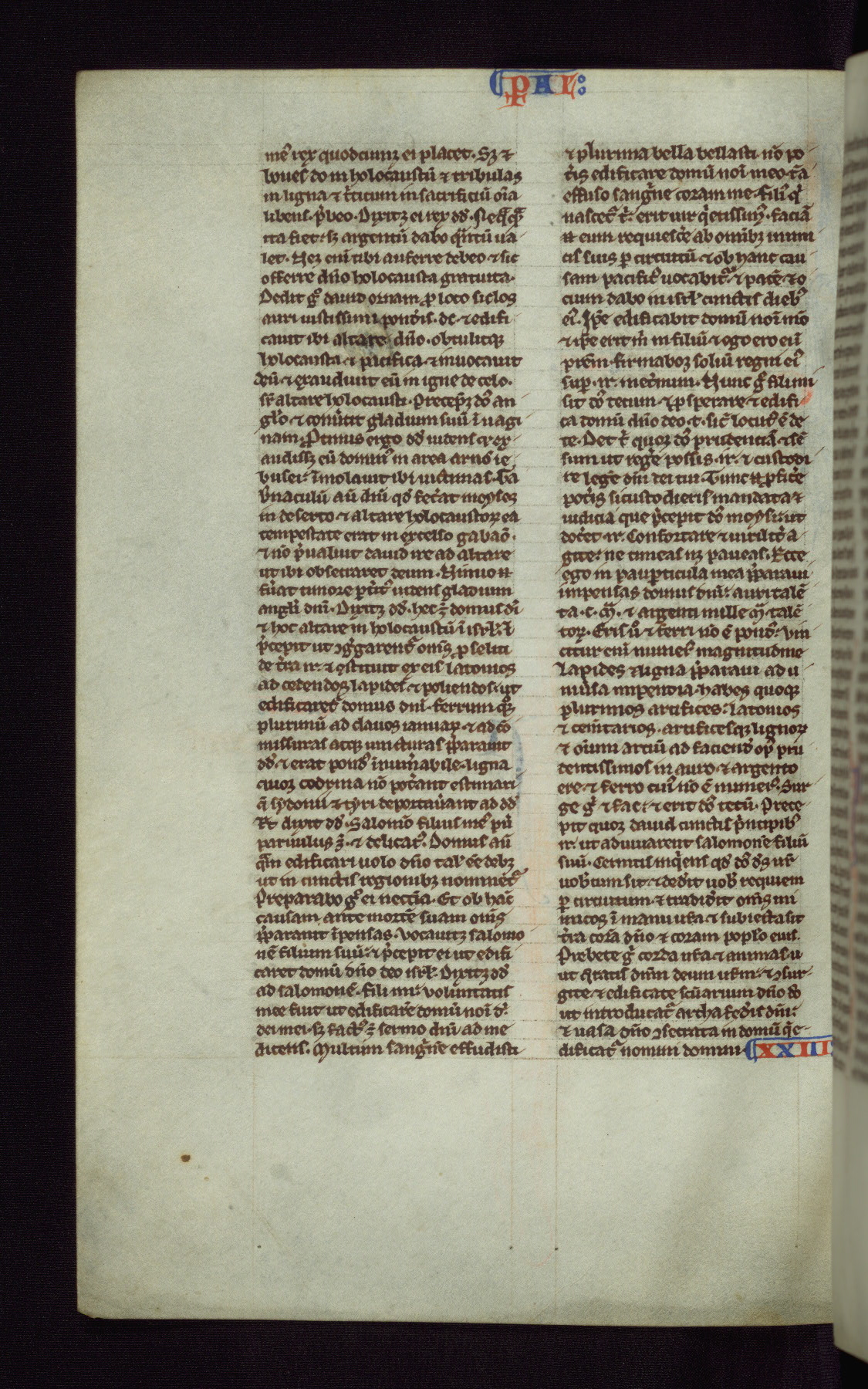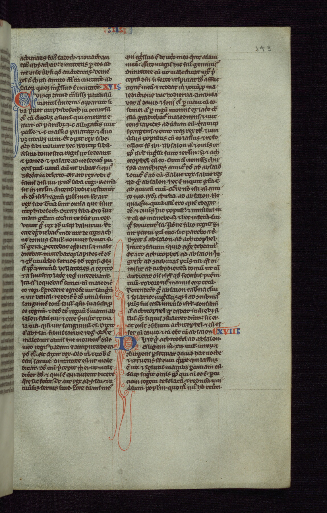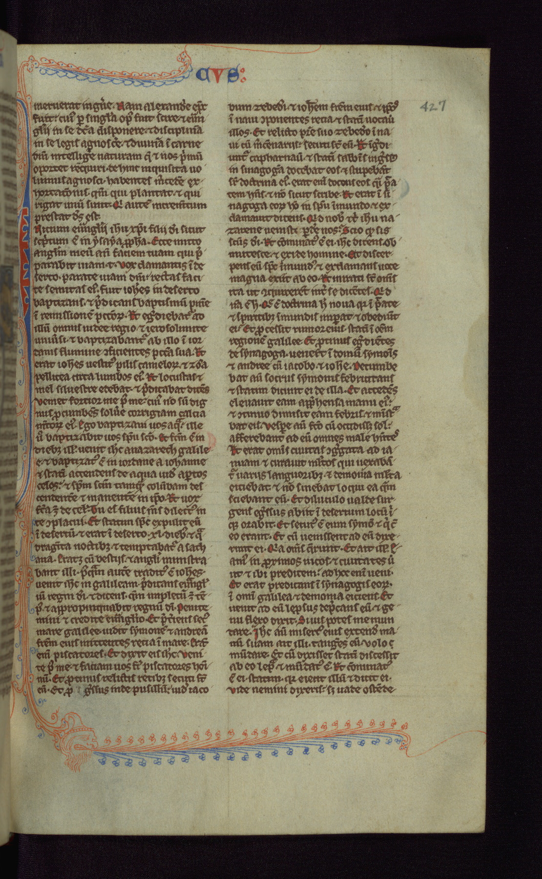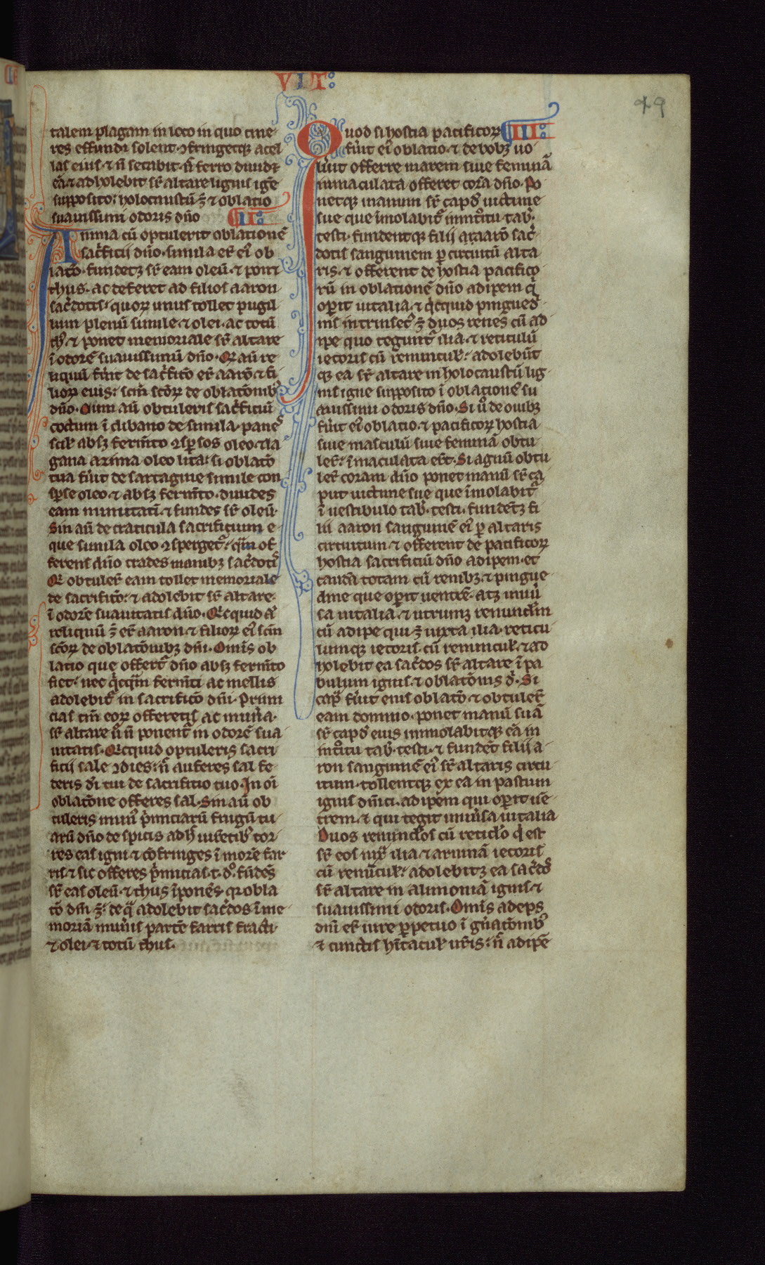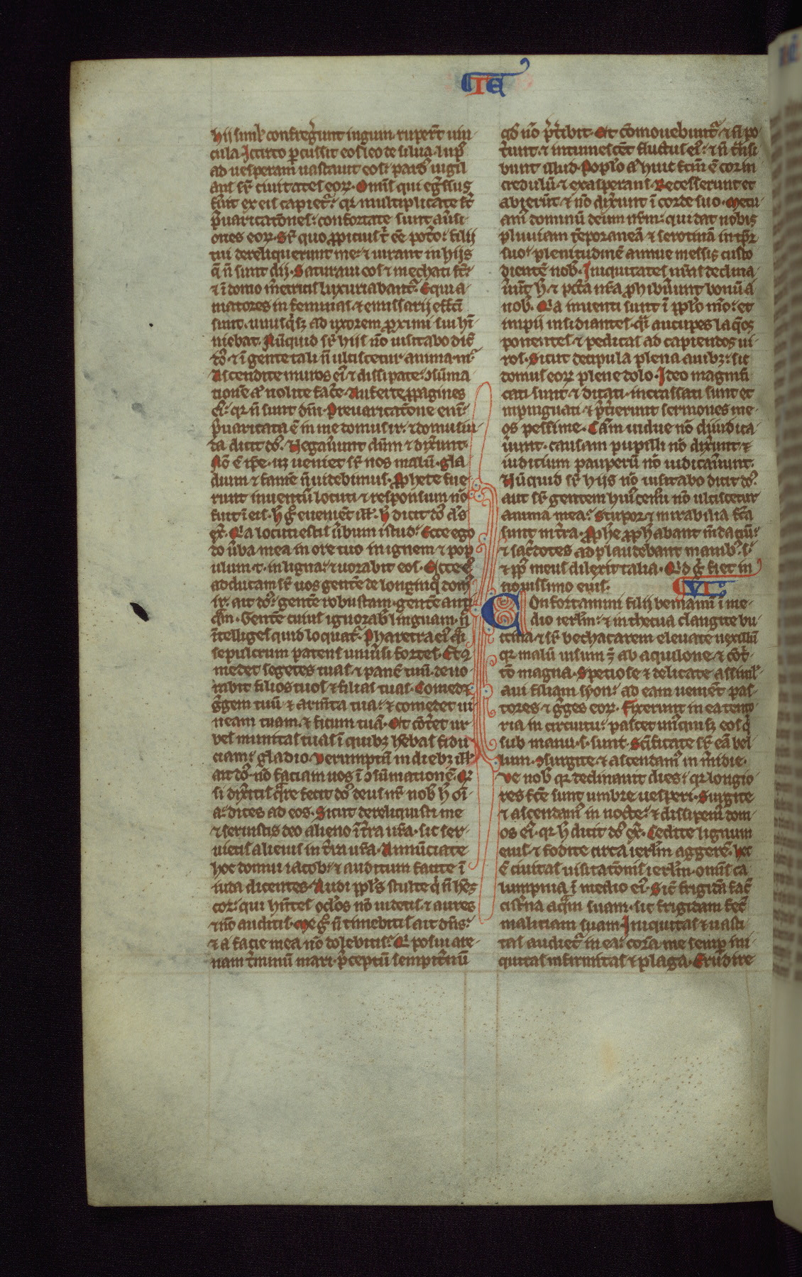 This pocket-size Bible was created around the middle of the thirteenth century in England. It contains the Vulgate text of the Old and New Testaments, arranged in order and divided into chapters. Such Bibles, designed for individual rather than institutional use, began to be created on a large scale during the thirteenth century, especially in Paris. This manuscript is illuminated with a large number of small historiated initials, and also includes a somewhat later image of the Three Living and the Three Dead, a popular scene based on a French poem of the same century.