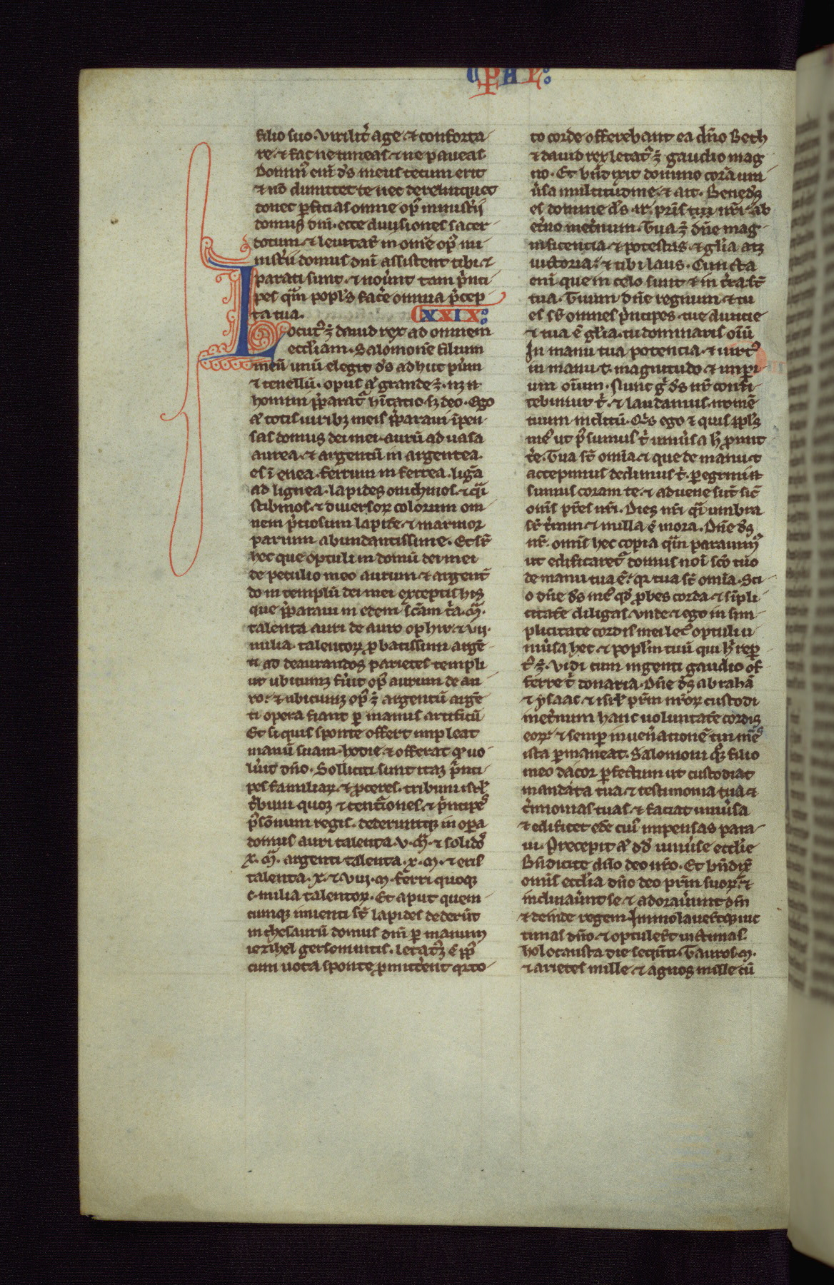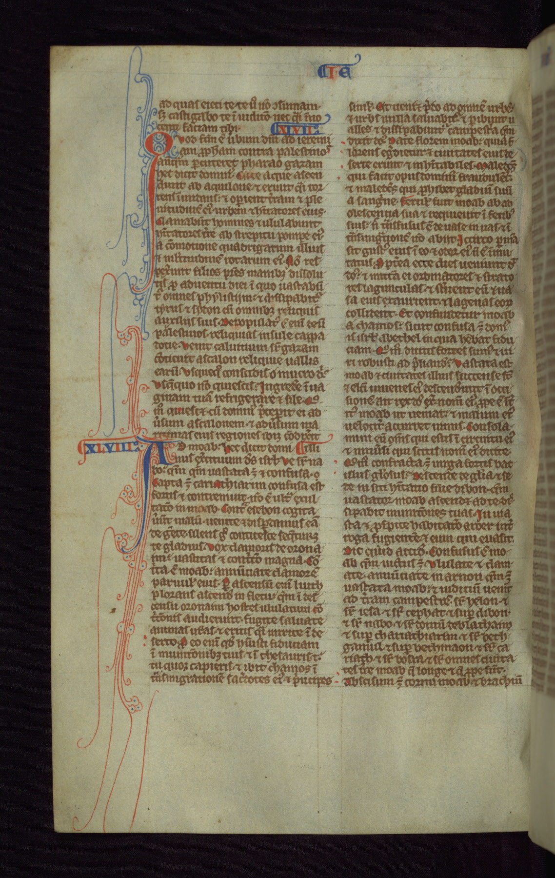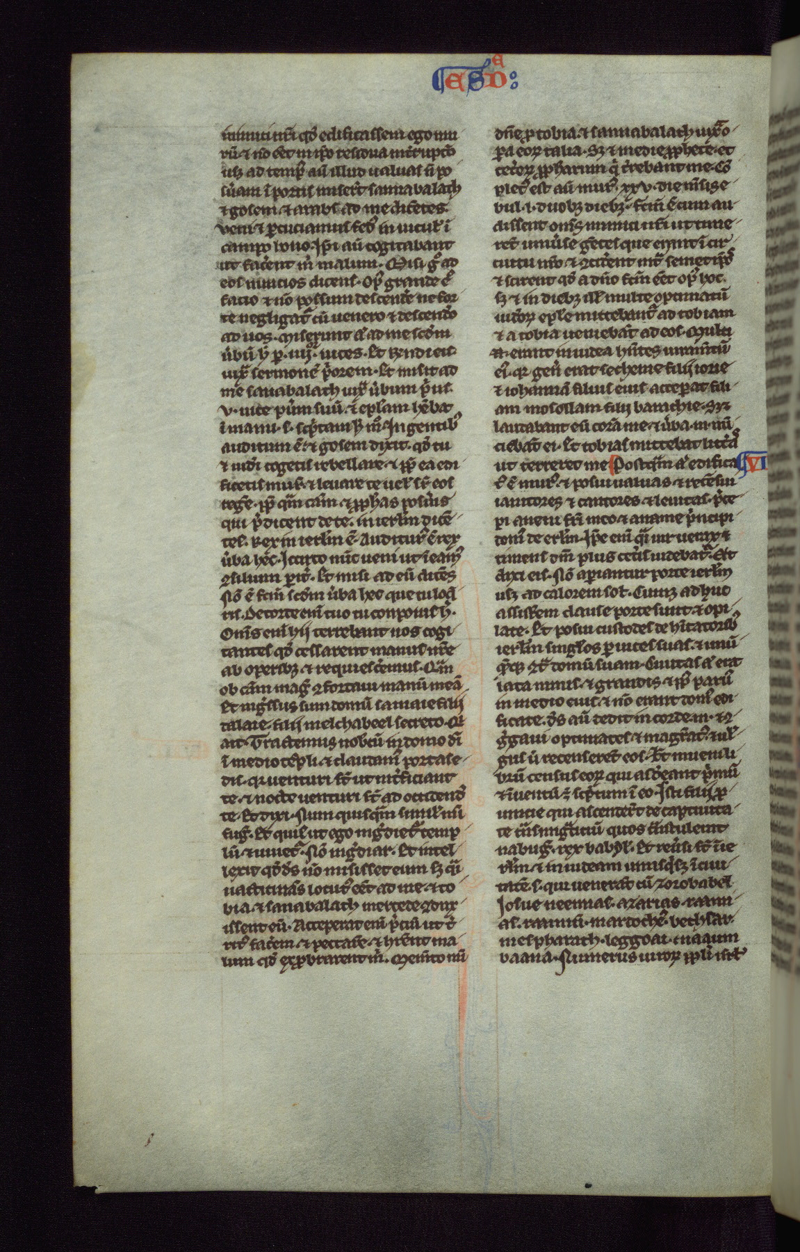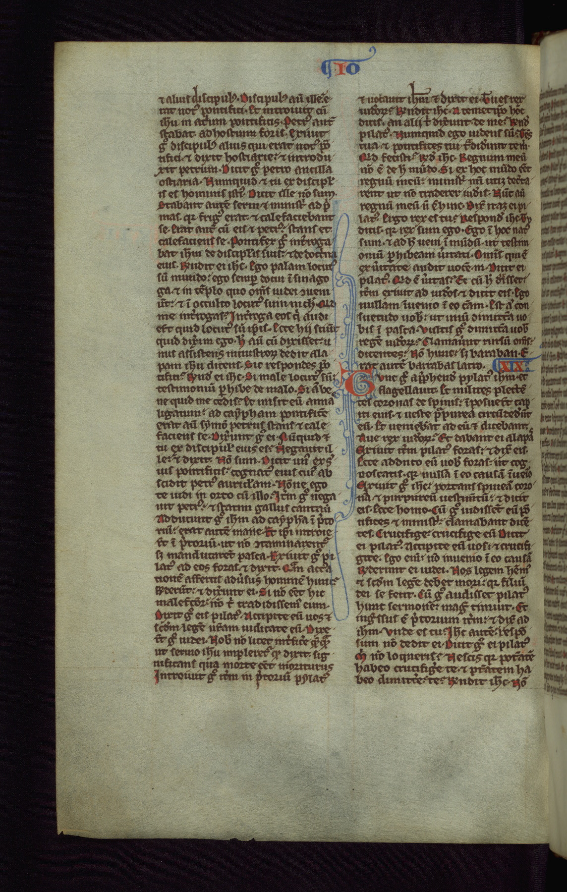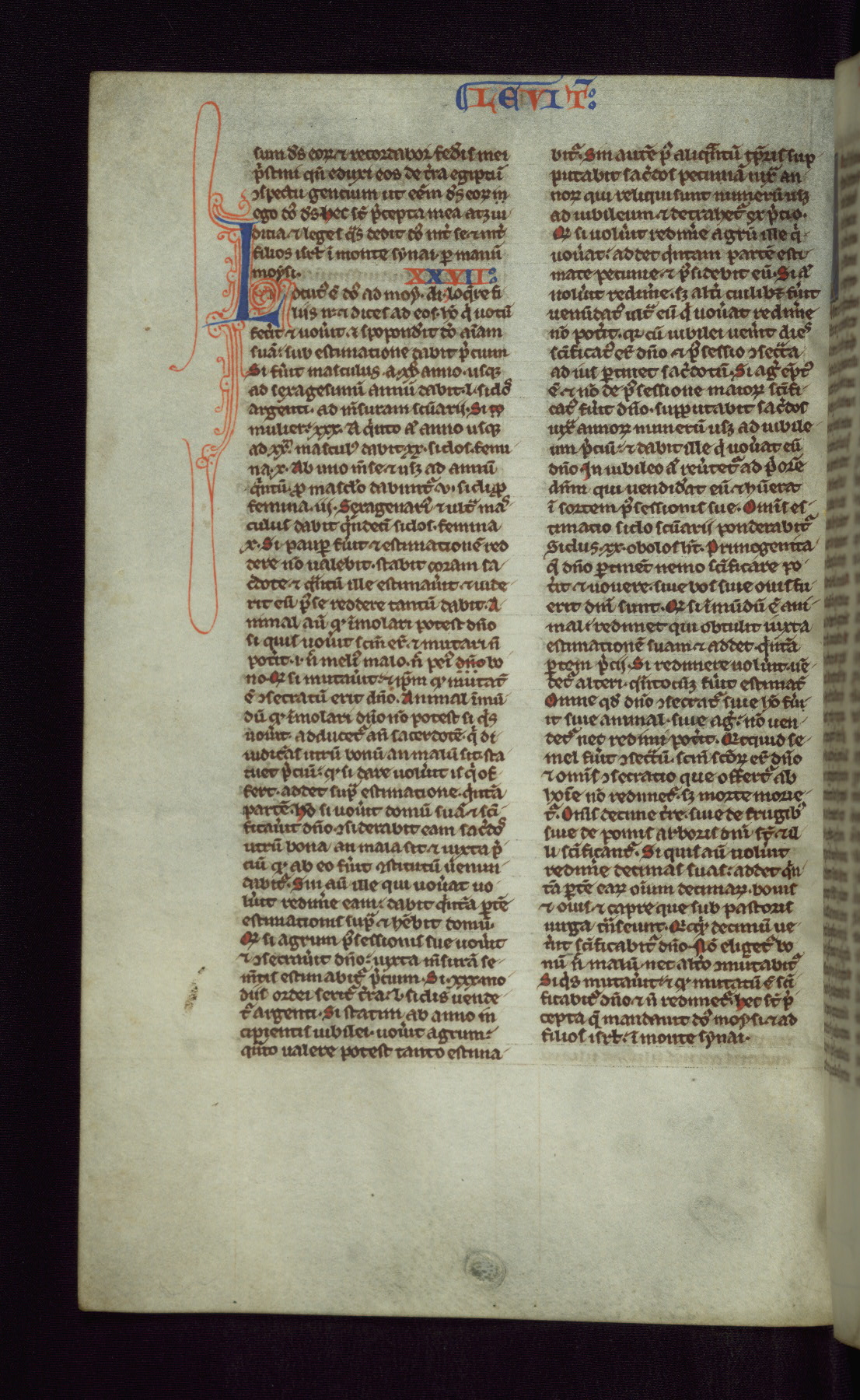 This pocket-size Bible was created around the middle of the thirteenth century in England. It contains the Vulgate text of the Old and New Testaments, arranged in order and divided into chapters. Such Bibles, designed for individual rather than institutional use, began to be created on a large scale during the thirteenth century, especially in Paris. This manuscript is illuminated with a large number of small historiated initials, and also includes a somewhat later image of the Three Living and the Three Dead, a popular scene based on a French poem of the same century.