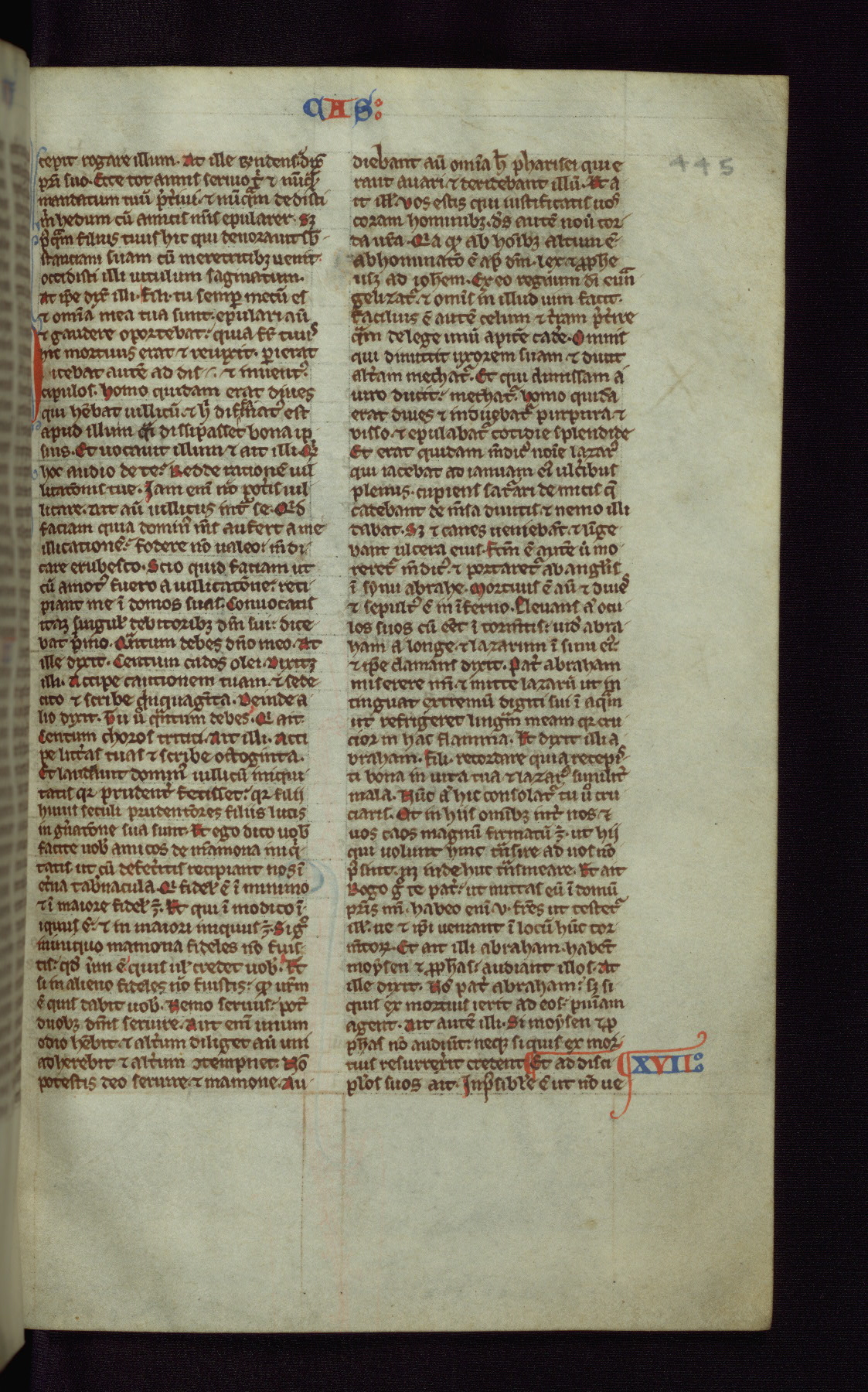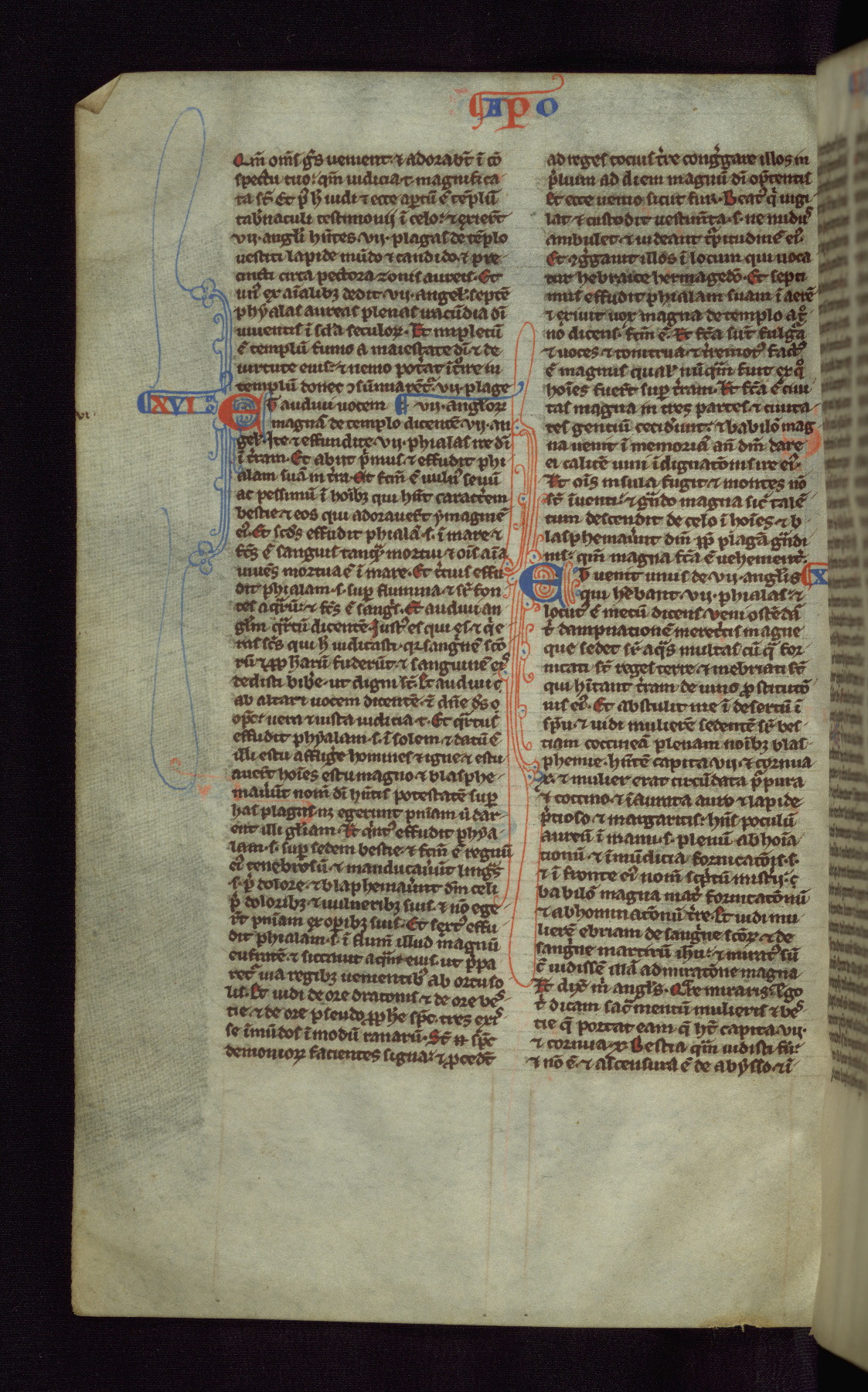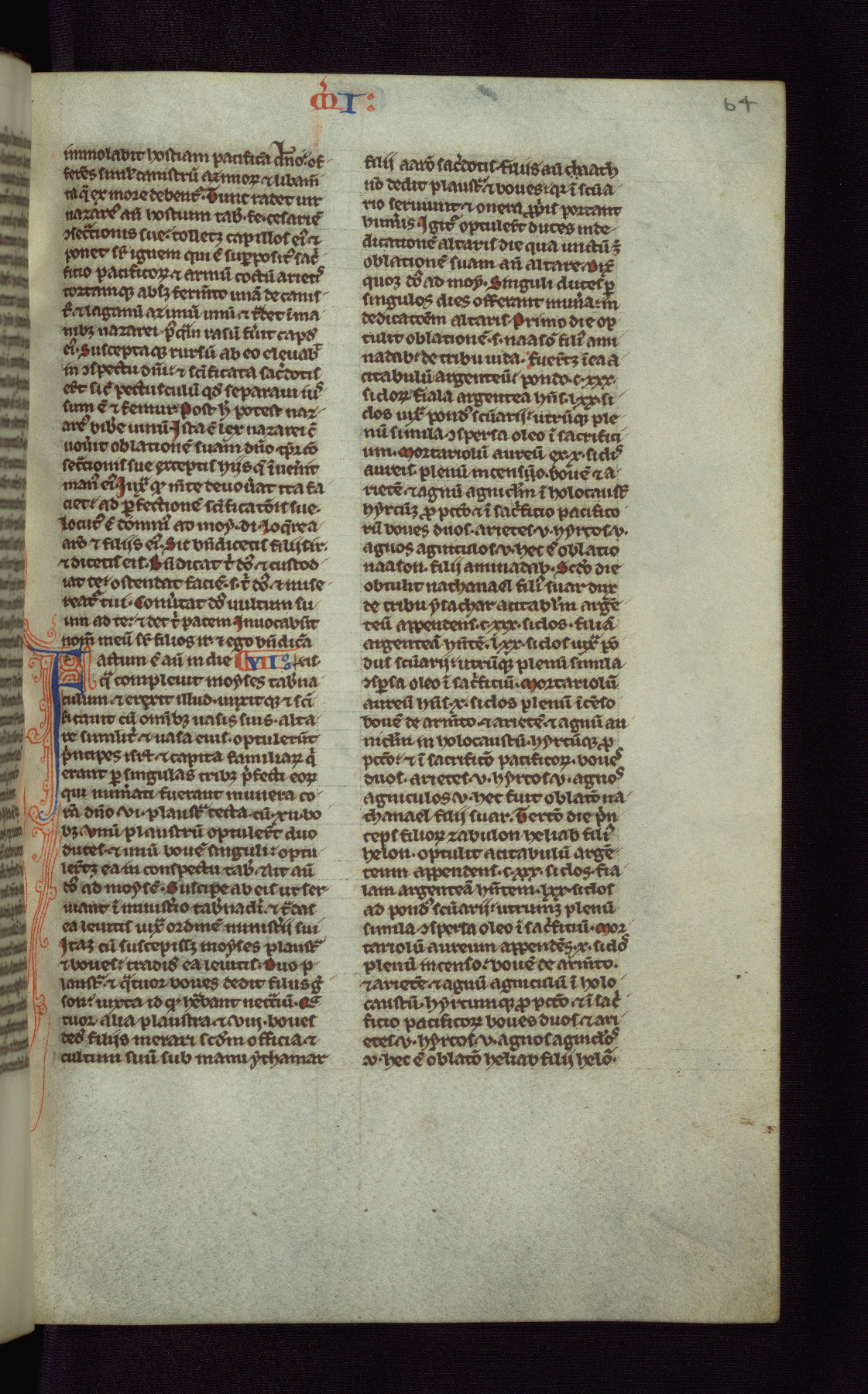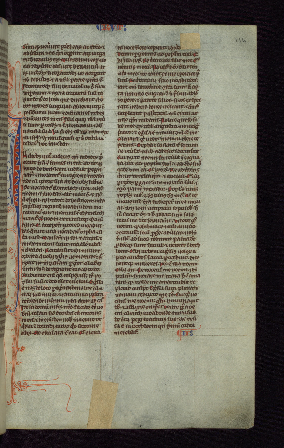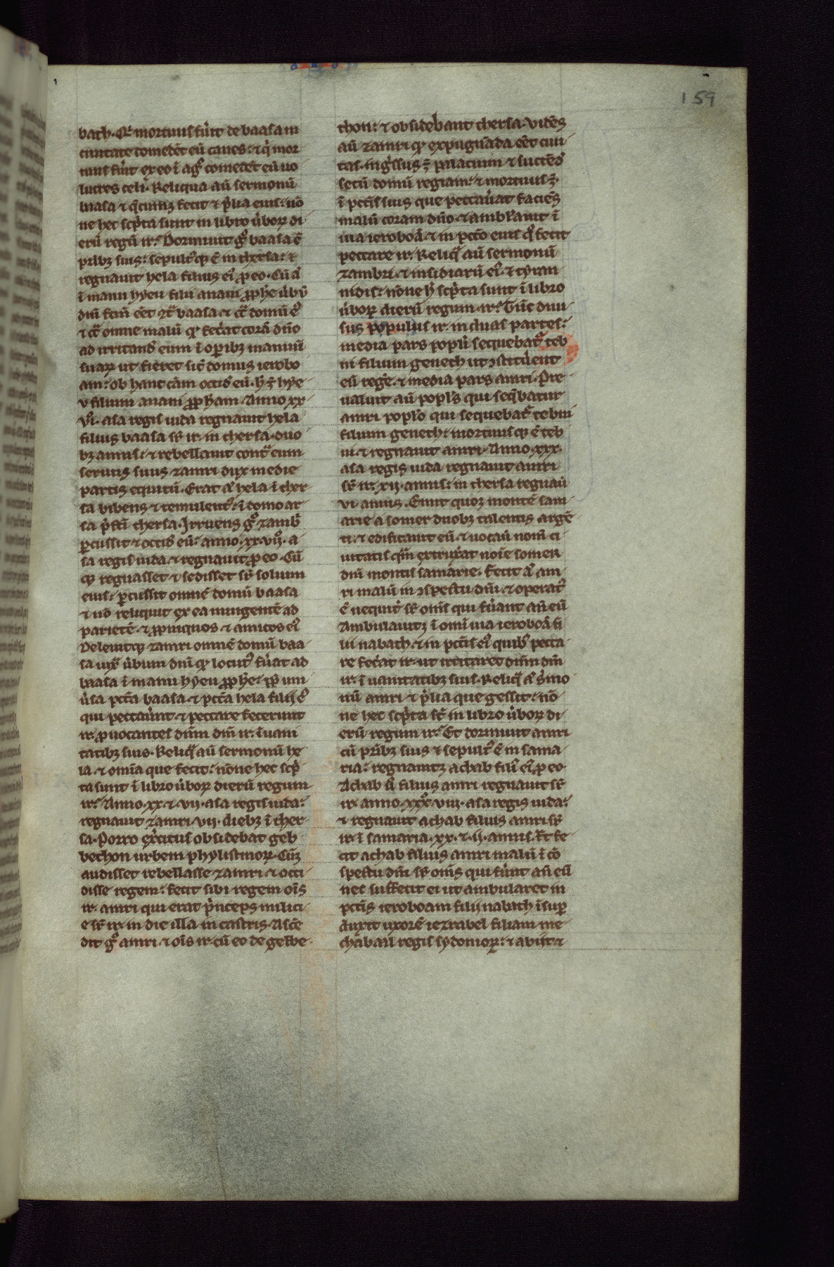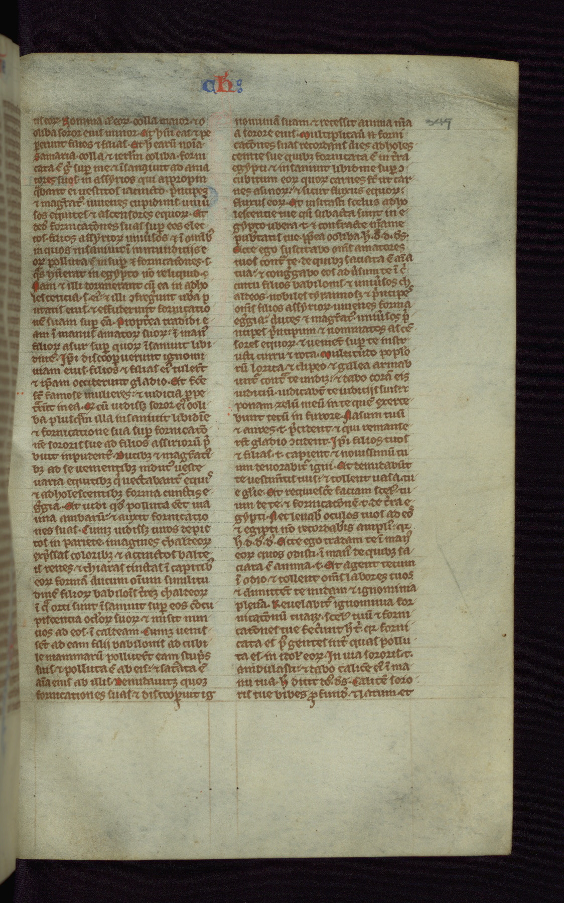 This pocket-size Bible was created around the middle of the thirteenth century in England. It contains the Vulgate text of the Old and New Testaments, arranged in order and divided into chapters. Such Bibles, designed for individual rather than institutional use, began to be created on a large scale during the thirteenth century, especially in Paris. This manuscript is illuminated with a large number of small historiated initials, and also includes a somewhat later image of the Three Living and the Three Dead, a popular scene based on a French poem of the same century.
