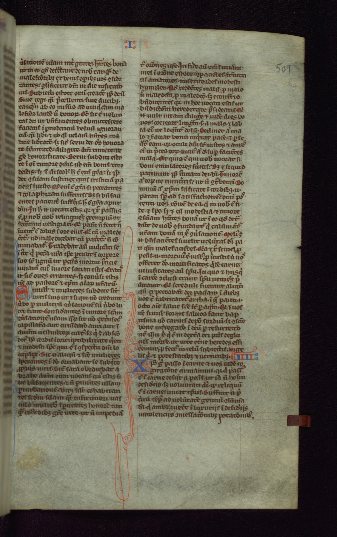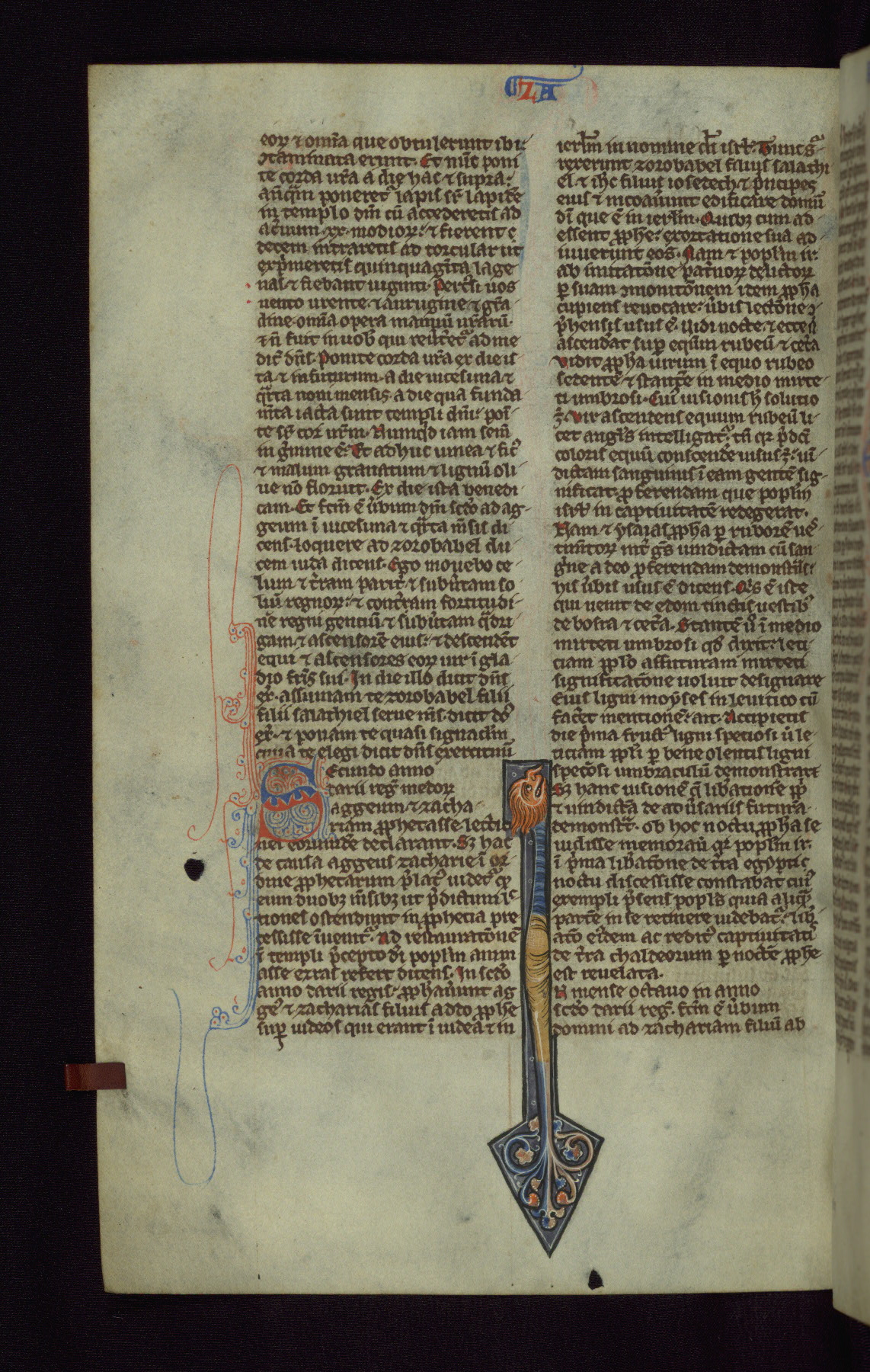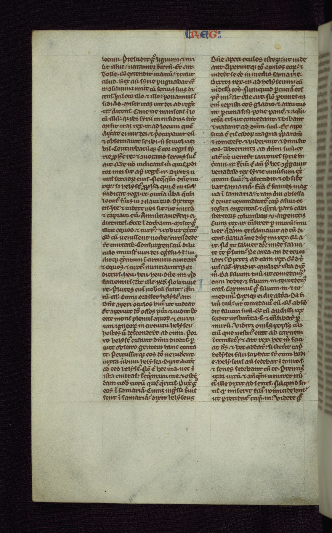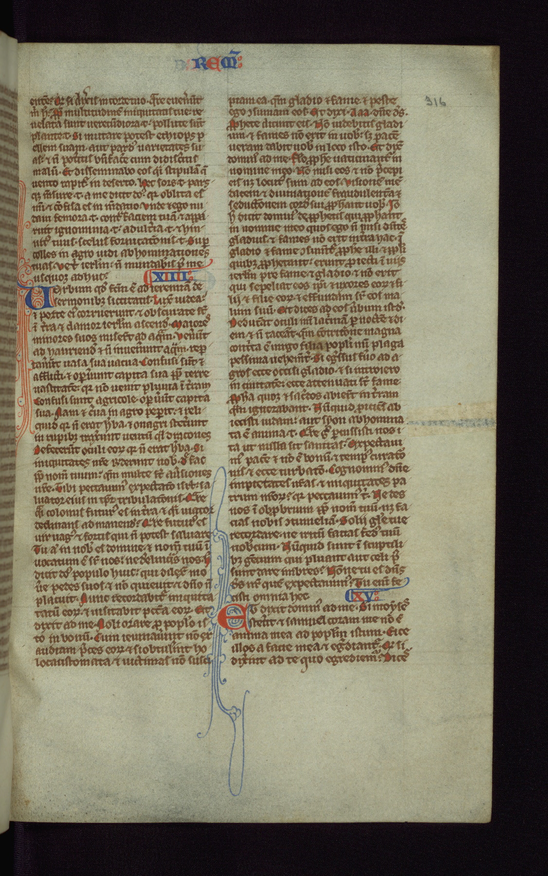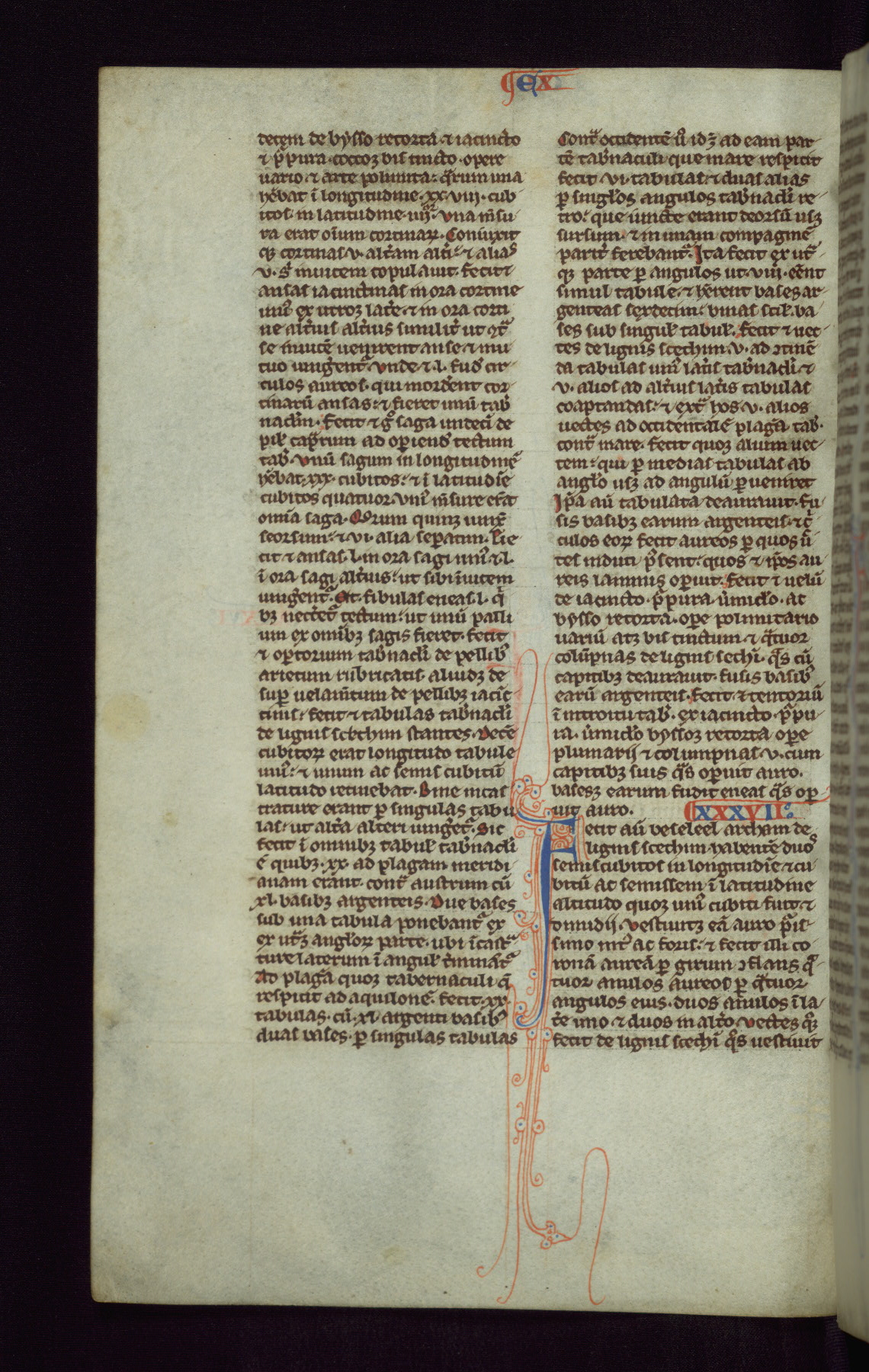 This pocket-size Bible was created around the middle of the thirteenth century in England. It contains the Vulgate text of the Old and New Testaments, arranged in order and divided into chapters. Such Bibles, designed for individual rather than institutional use, began to be created on a large scale during the thirteenth century, especially in Paris. This manuscript is illuminated with a large number of small historiated initials, and also includes a somewhat later image of the Three Living and the Three Dead, a popular scene based on a French poem of the same century.