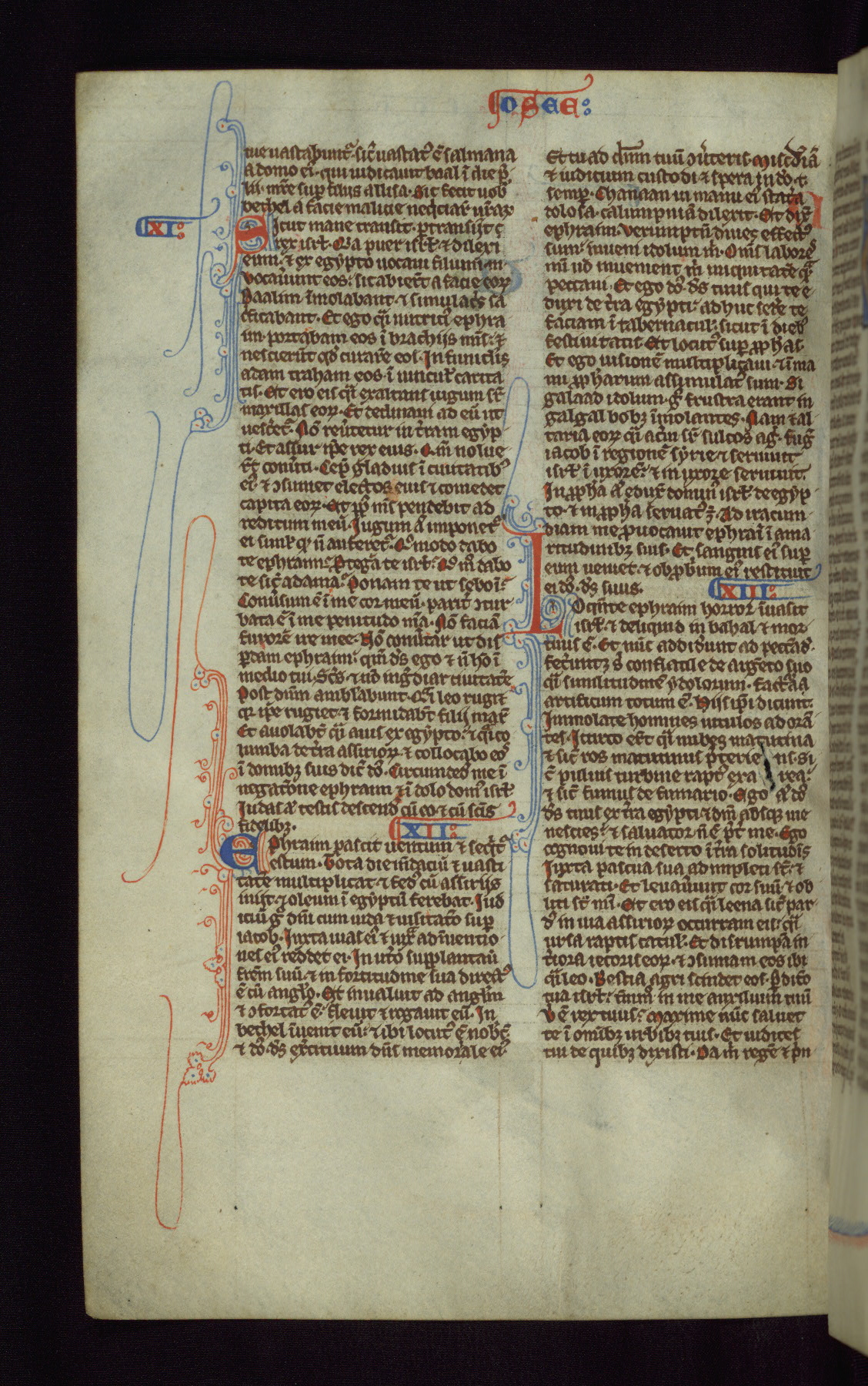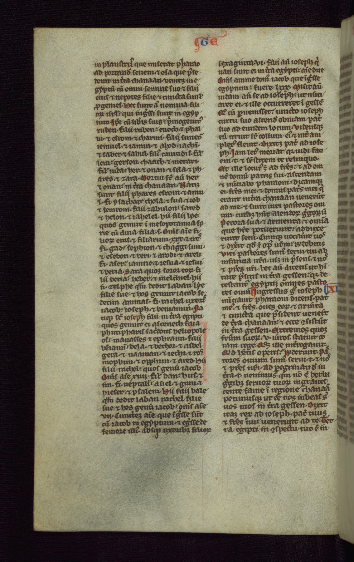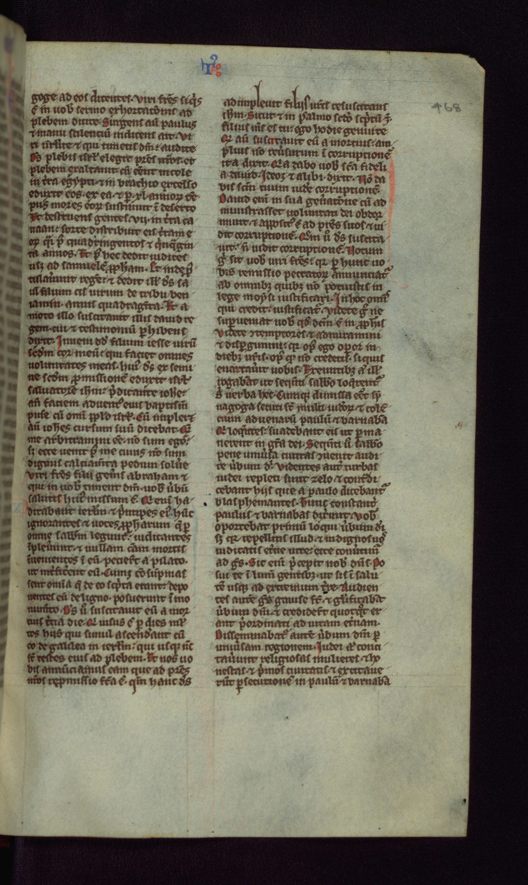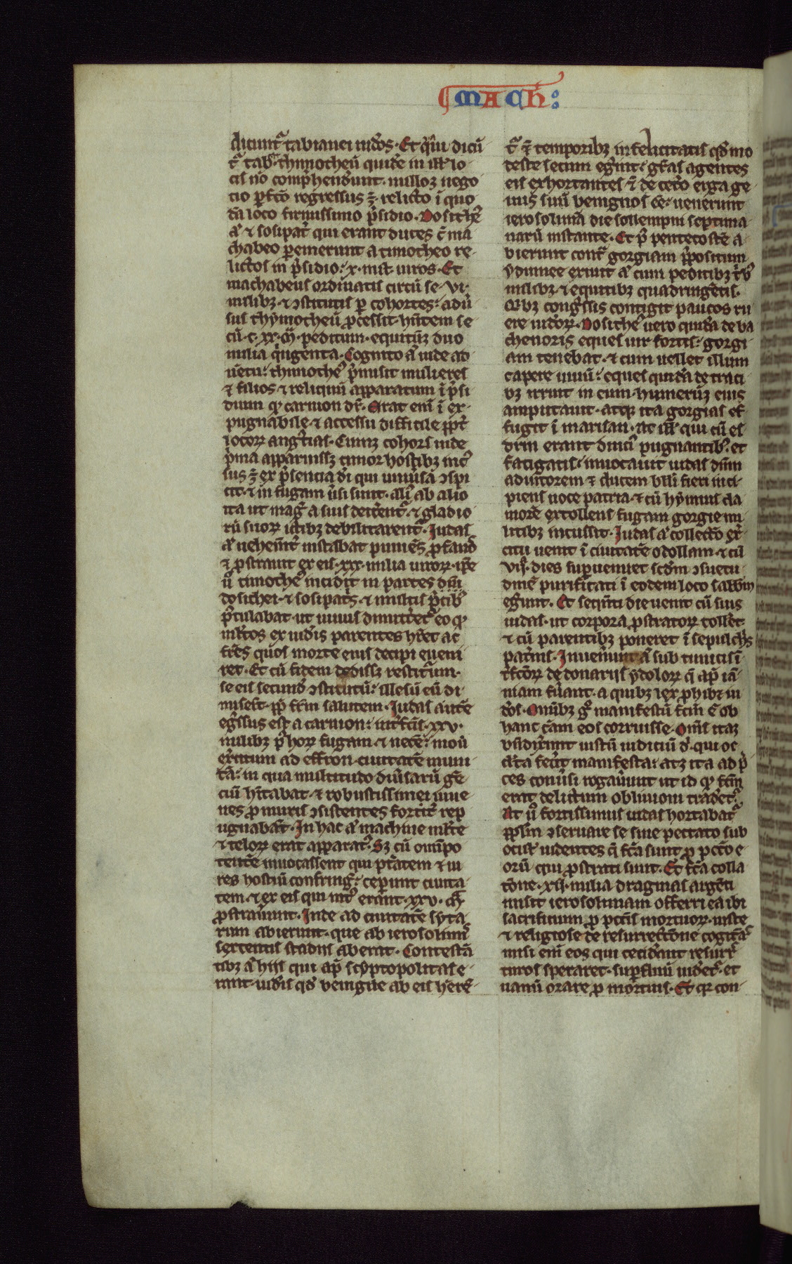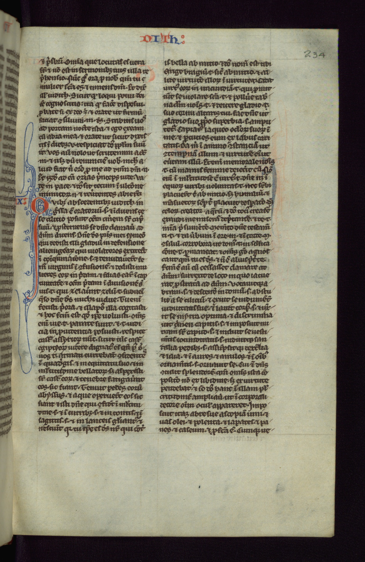 This pocket-size Bible was created around the middle of the thirteenth century in England. It contains the Vulgate text of the Old and New Testaments, arranged in order and divided into chapters. Such Bibles, designed for individual rather than institutional use, began to be created on a large scale during the thirteenth century, especially in Paris. This manuscript is illuminated with a large number of small historiated initials, and also includes a somewhat later image of the Three Living and the Three Dead, a popular scene based on a French poem of the same century.