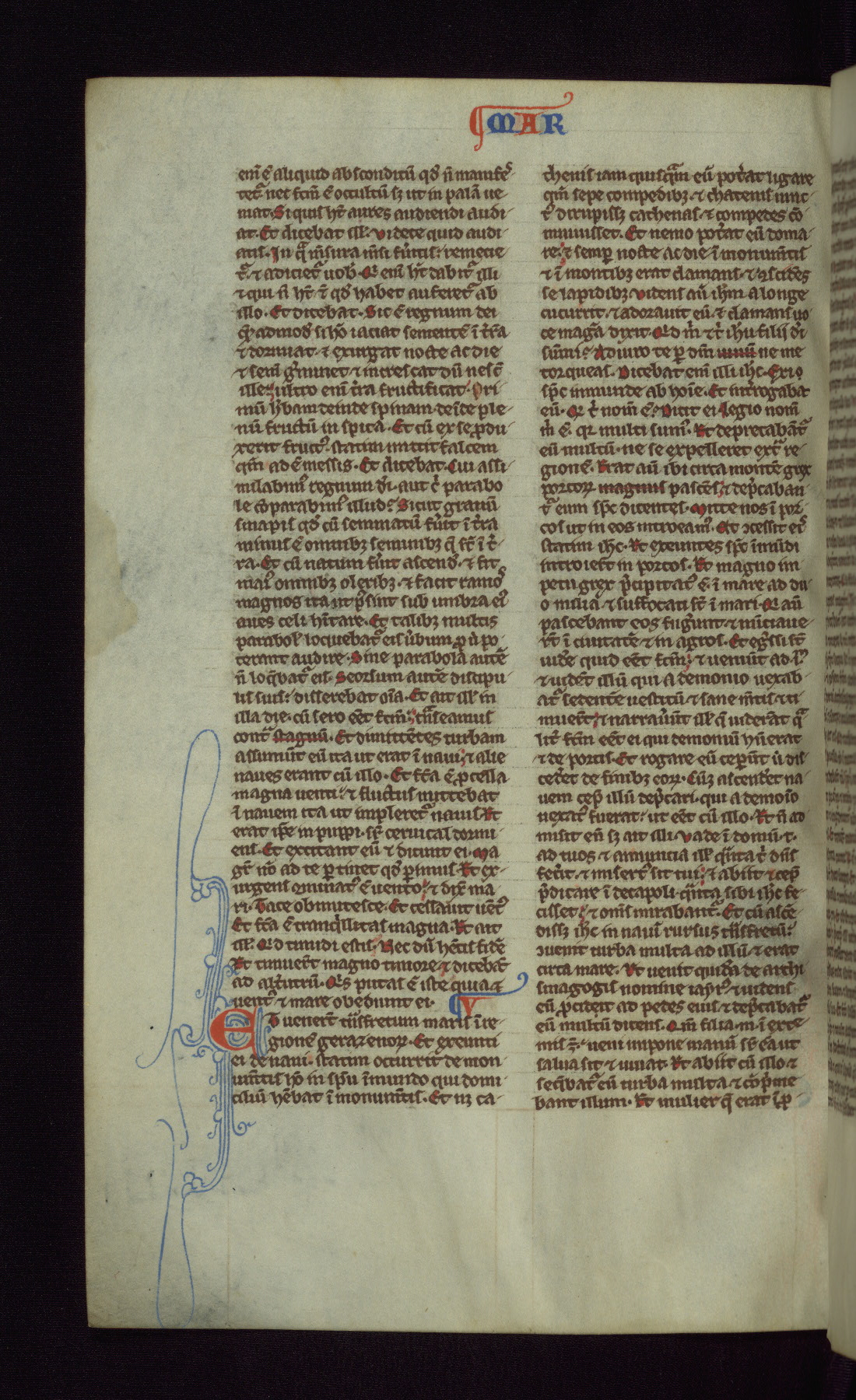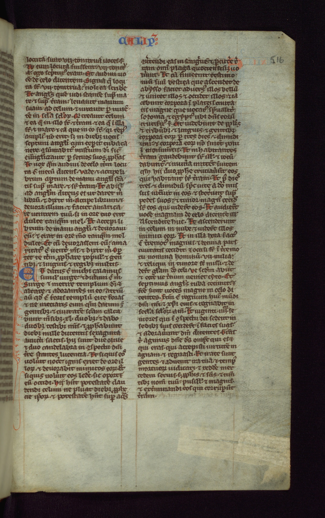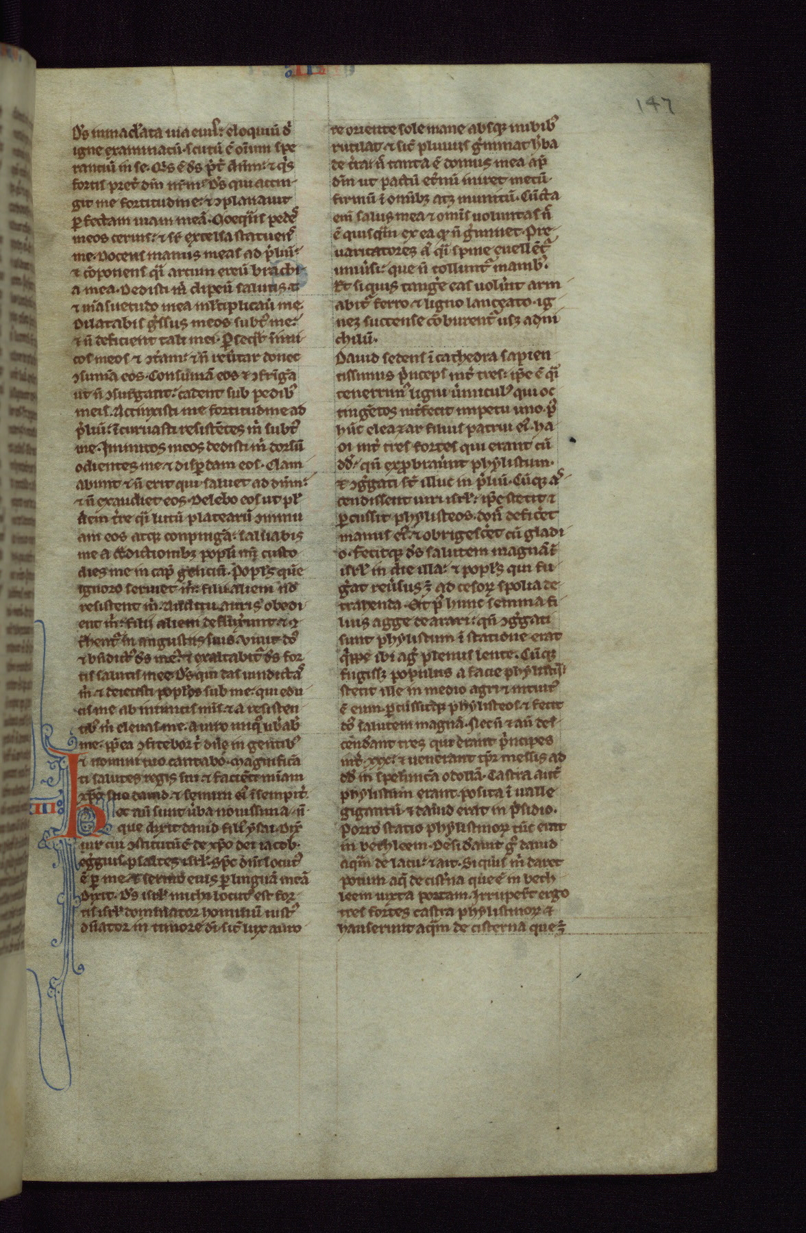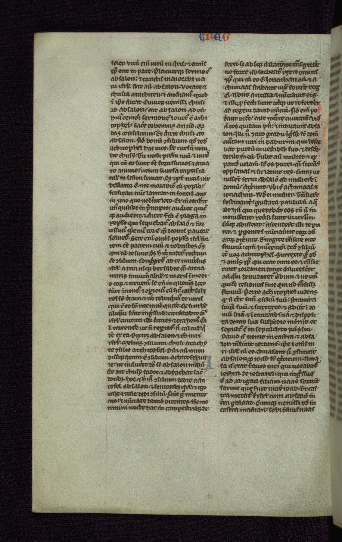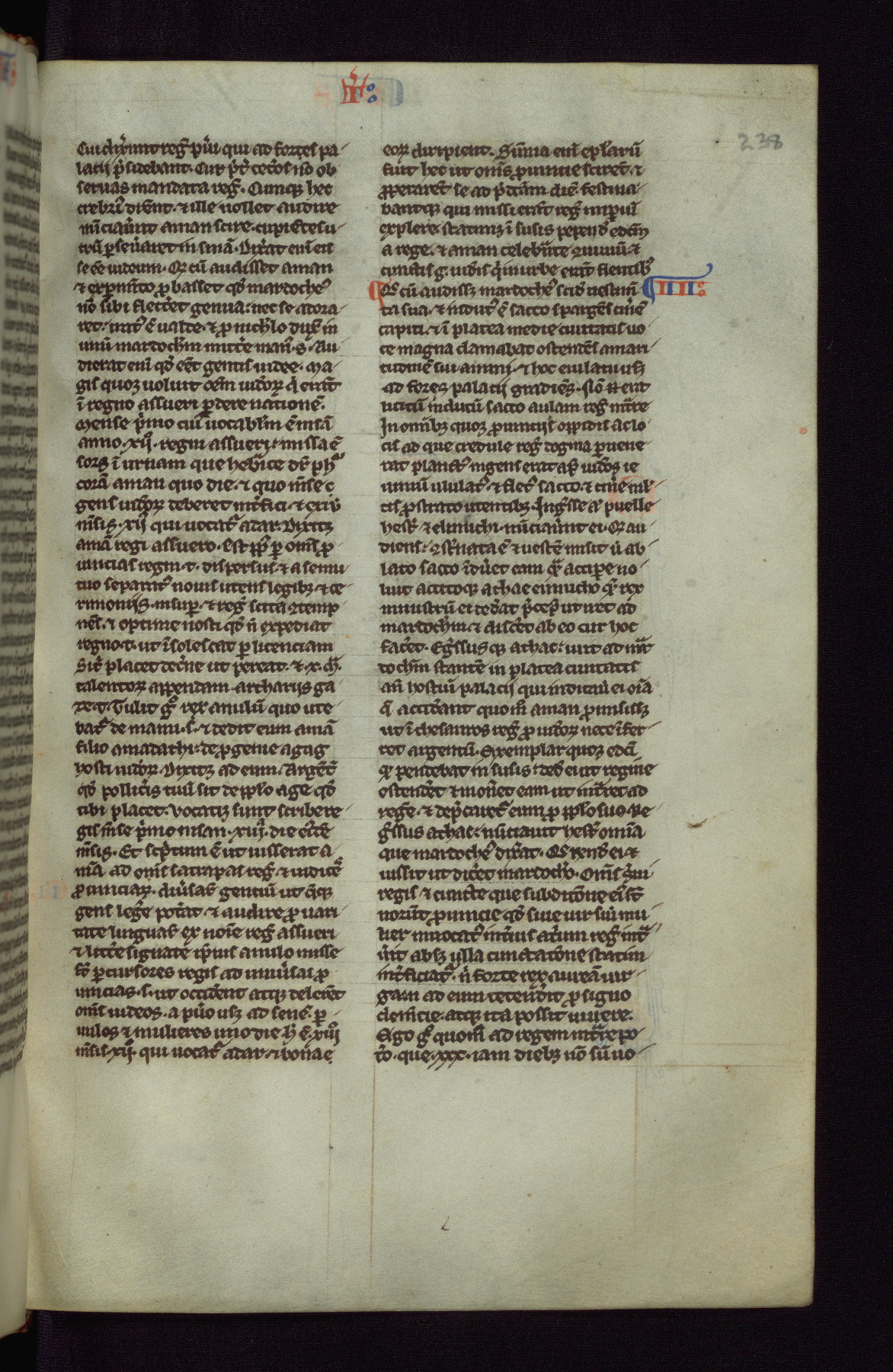 This pocket-size Bible was created around the middle of the thirteenth century in England. It contains the Vulgate text of the Old and New Testaments, arranged in order and divided into chapters. Such Bibles, designed for individual rather than institutional use, began to be created on a large scale during the thirteenth century, especially in Paris. This manuscript is illuminated with a large number of small historiated initials, and also includes a somewhat later image of the Three Living and the Three Dead, a popular scene based on a French poem of the same century.