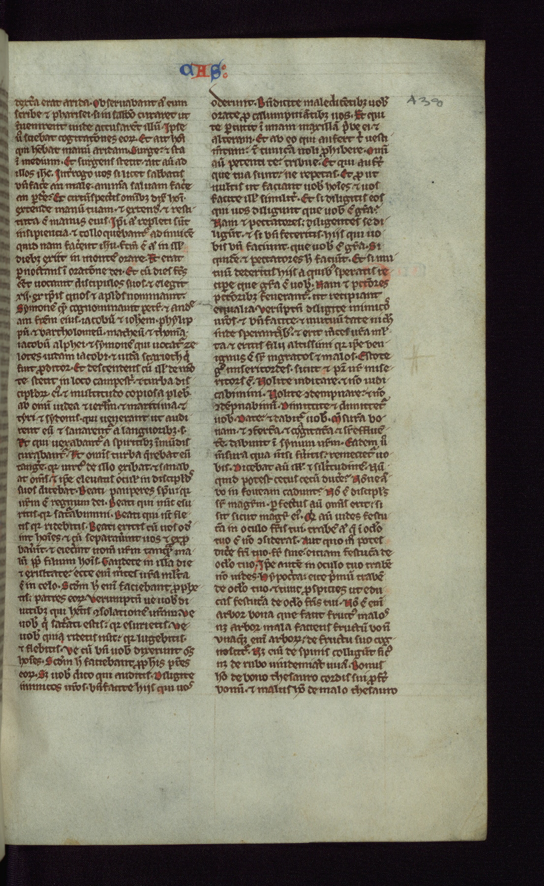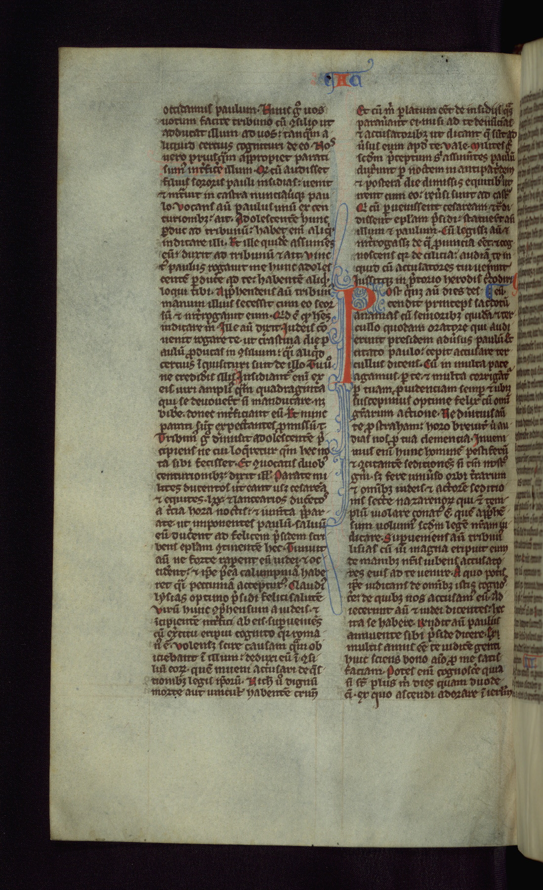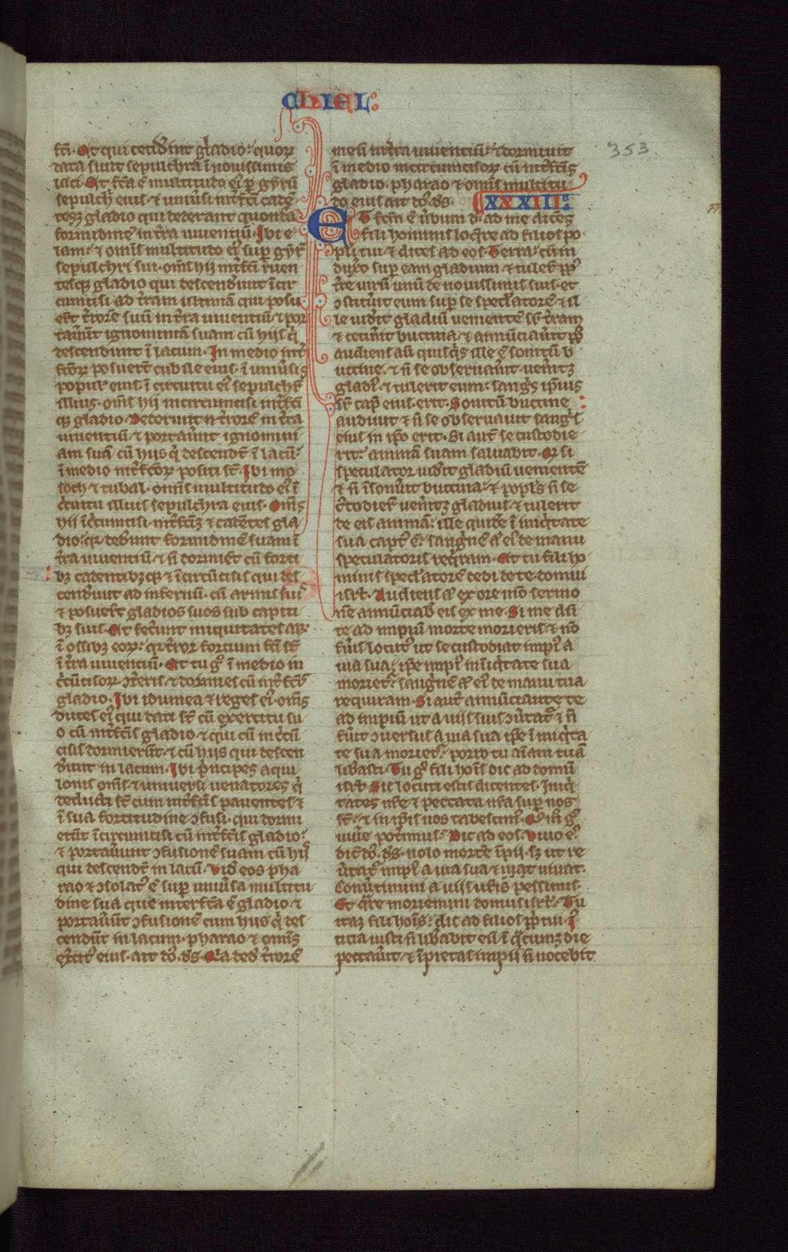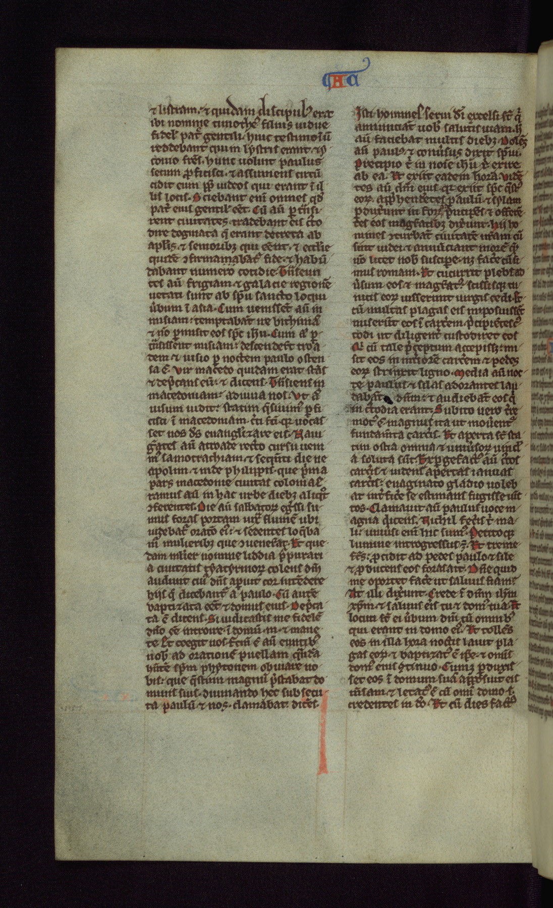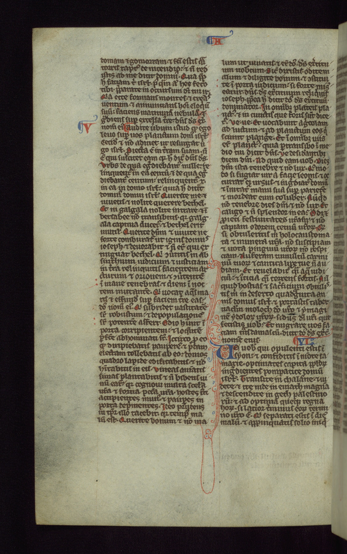 This pocket-size Bible was created around the middle of the thirteenth century in England. It contains the Vulgate text of the Old and New Testaments, arranged in order and divided into chapters. Such Bibles, designed for individual rather than institutional use, began to be created on a large scale during the thirteenth century, especially in Paris. This manuscript is illuminated with a large number of small historiated initials, and also includes a somewhat later image of the Three Living and the Three Dead, a popular scene based on a French poem of the same century.