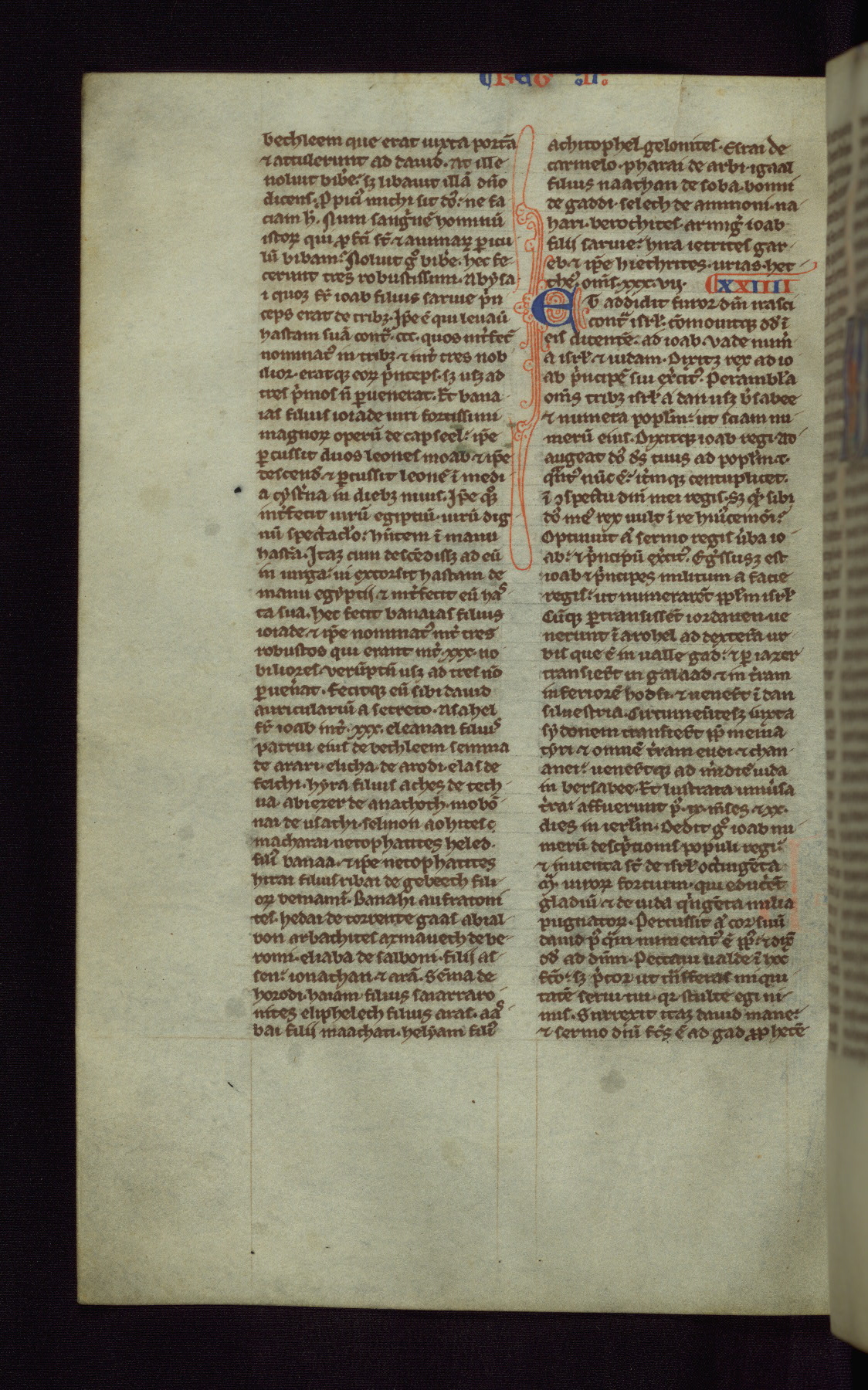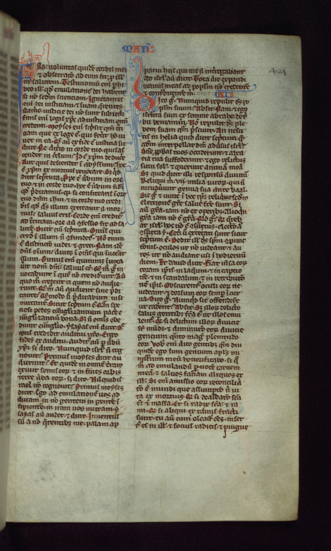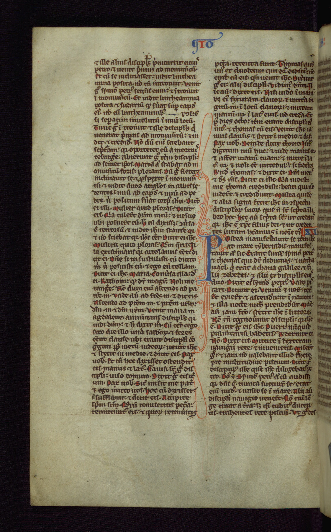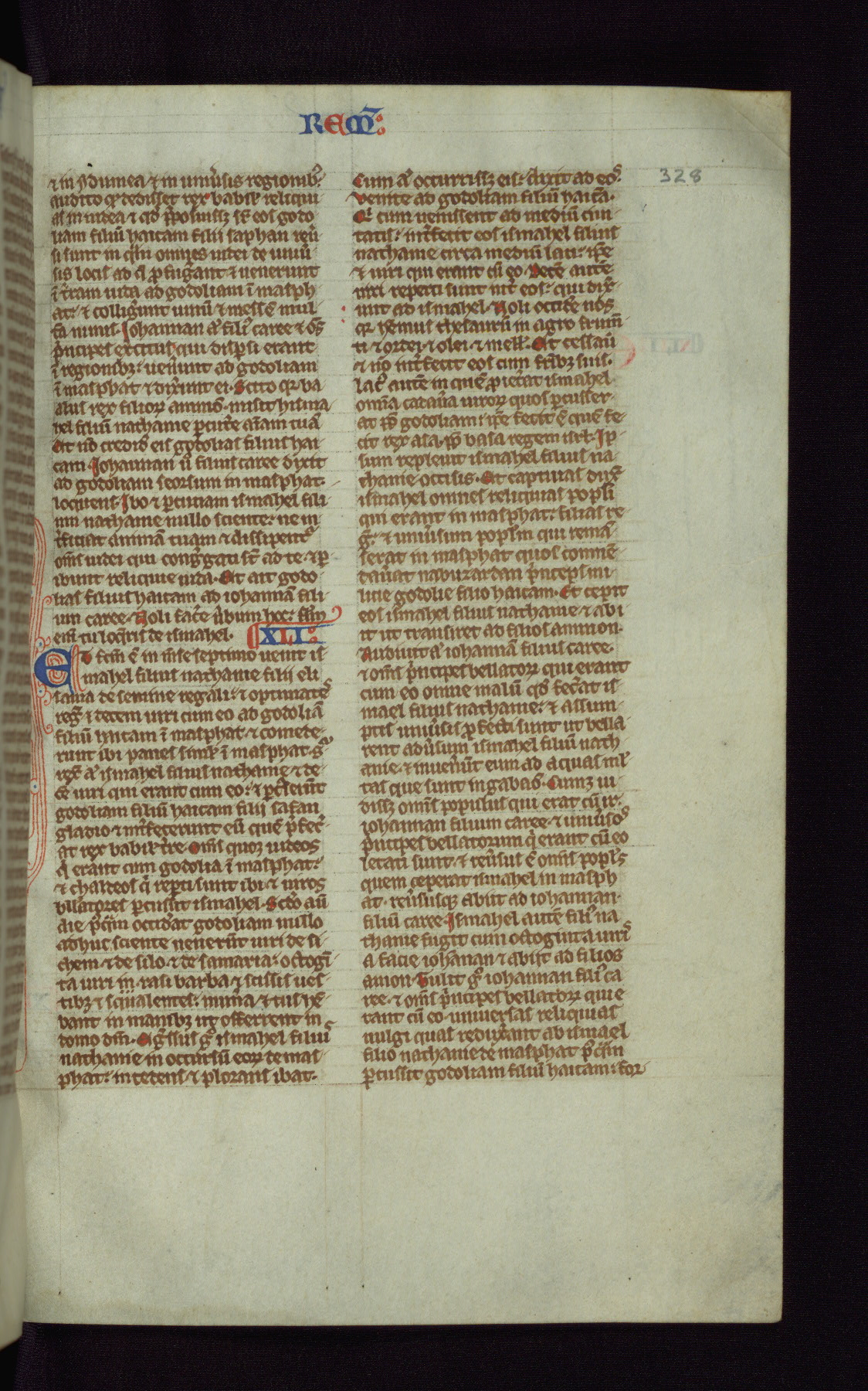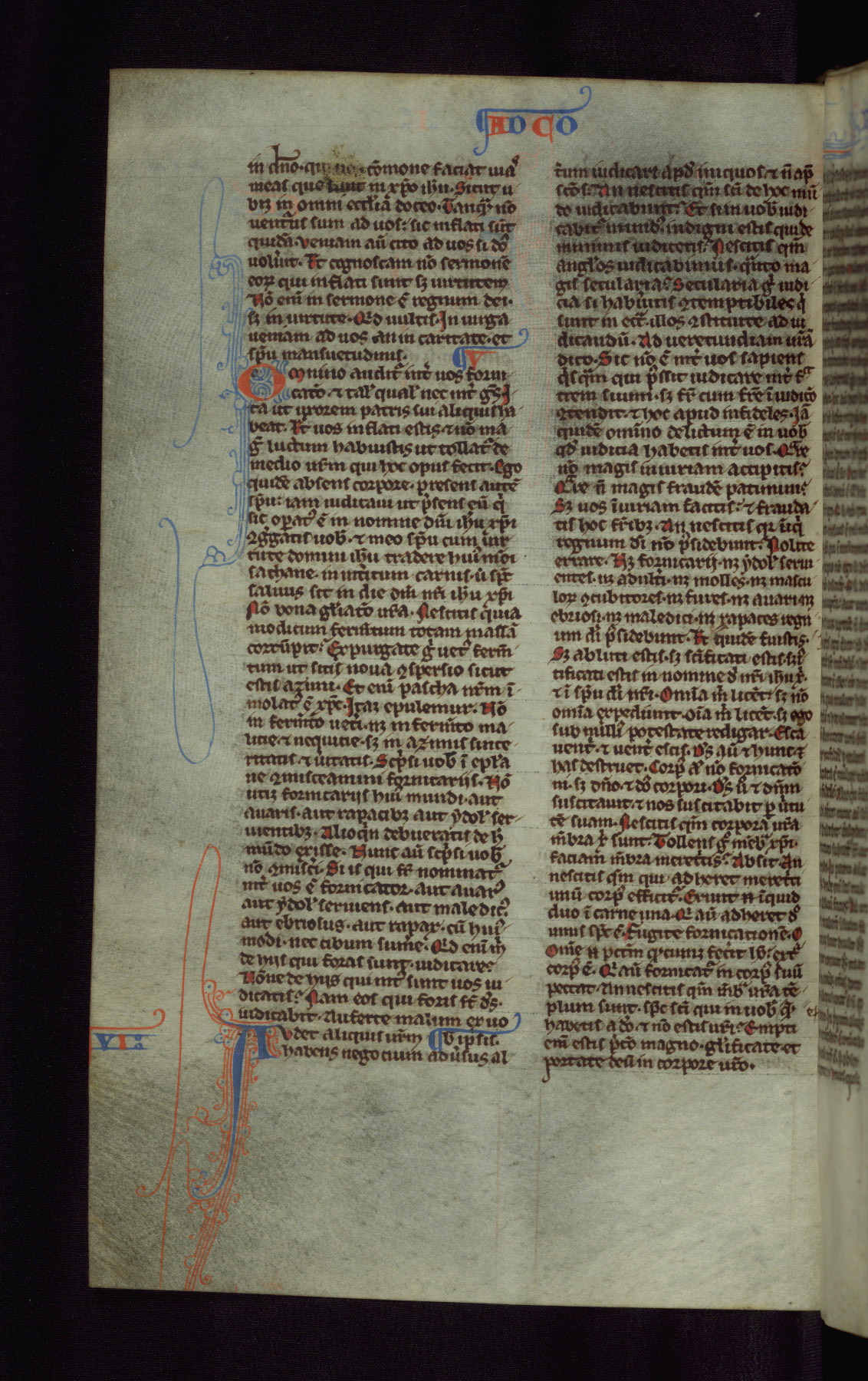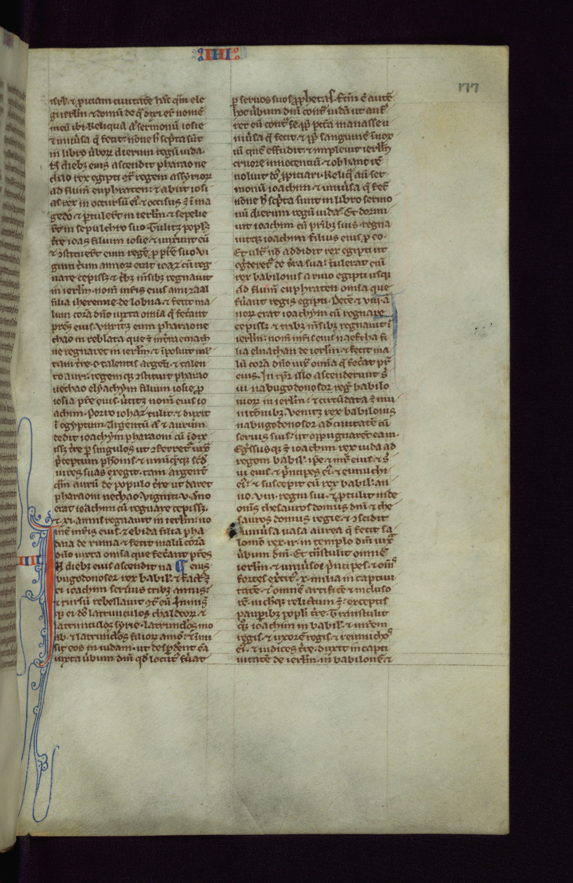 This pocket-size Bible was created around the middle of the thirteenth century in England. It contains the Vulgate text of the Old and New Testaments, arranged in order and divided into chapters. Such Bibles, designed for individual rather than institutional use, began to be created on a large scale during the thirteenth century, especially in Paris. This manuscript is illuminated with a large number of small historiated initials, and also includes a somewhat later image of the Three Living and the Three Dead, a popular scene based on a French poem of the same century.