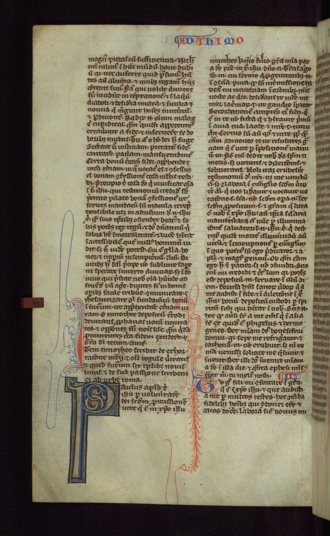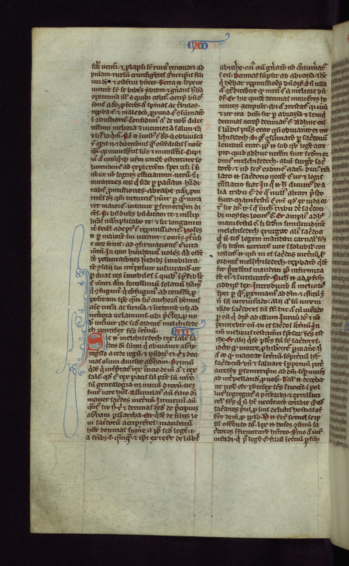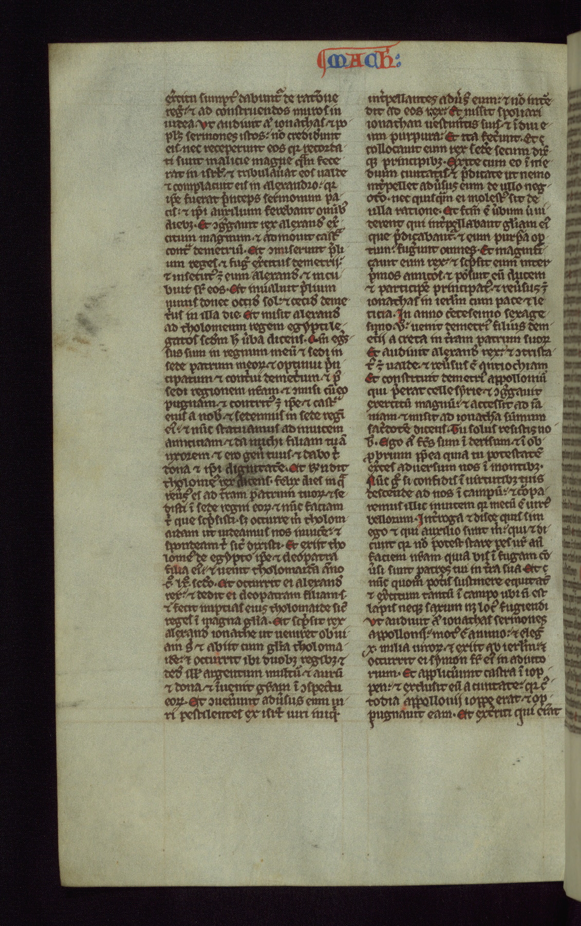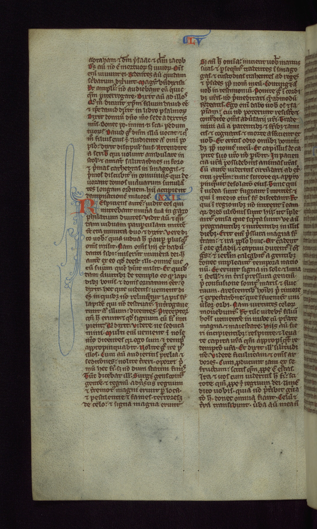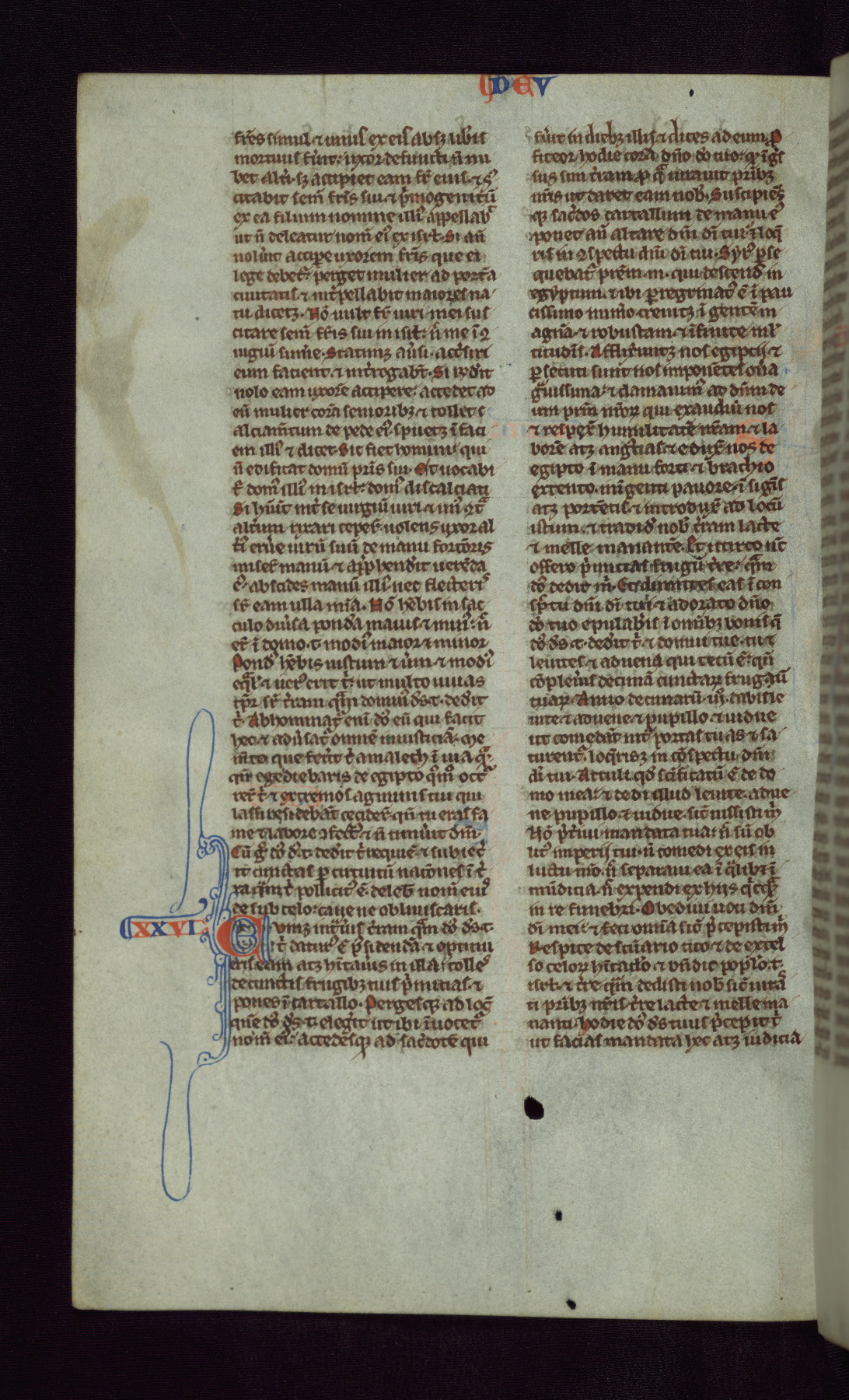This pocket-size Bible was created around the middle of the thirteenth century in England. It contains the Vulgate text of the Old and New Testaments, arranged in order and divided into chapters. Such Bibles, designed for individual rather than institutional use, began to be created on a large scale during the thirteenth century, especially in Paris. This manuscript is illuminated with a large number of small historiated initials, and also includes a somewhat later image of the Three Living and the Three Dead, a popular scene based on a French poem of the same century.