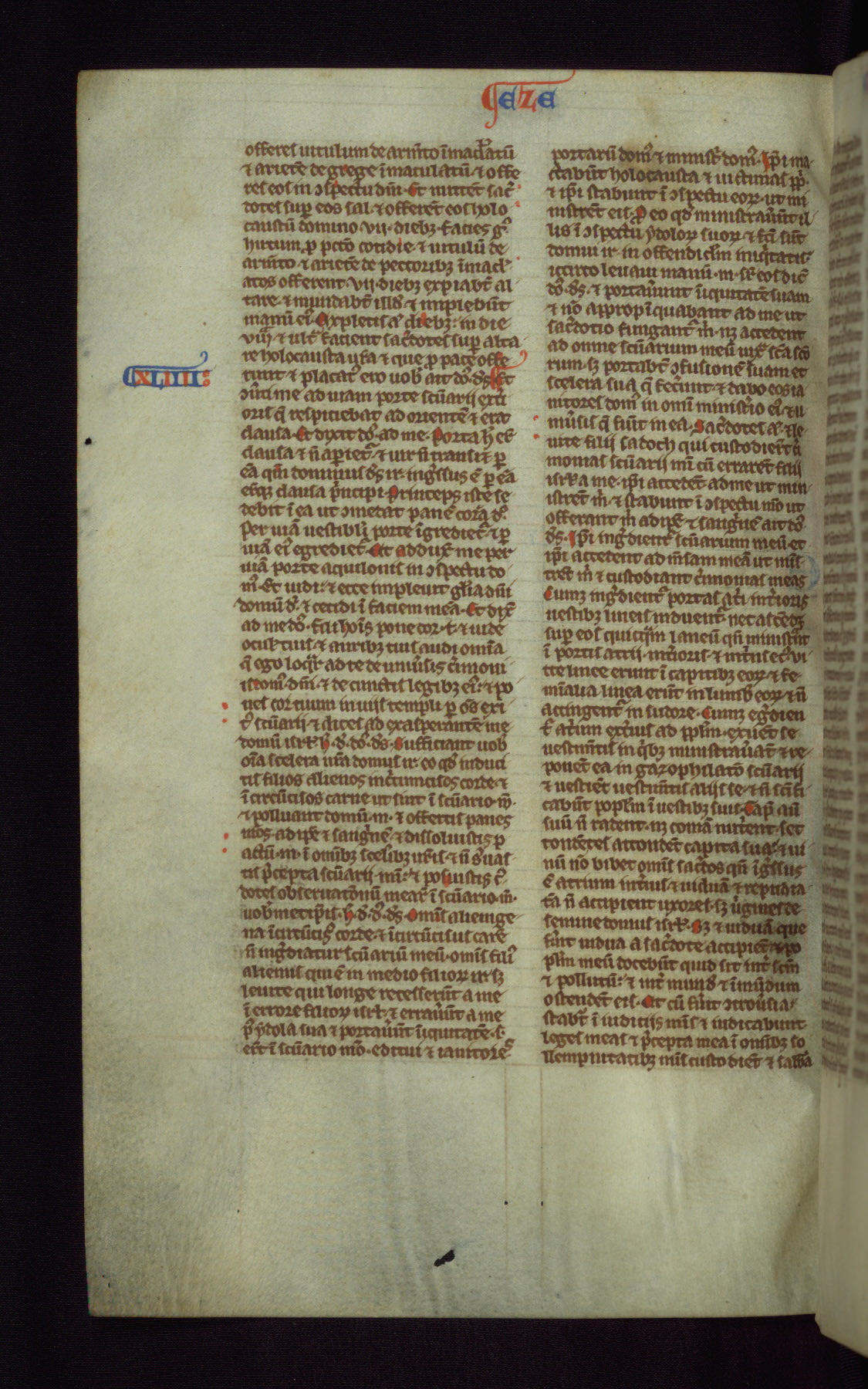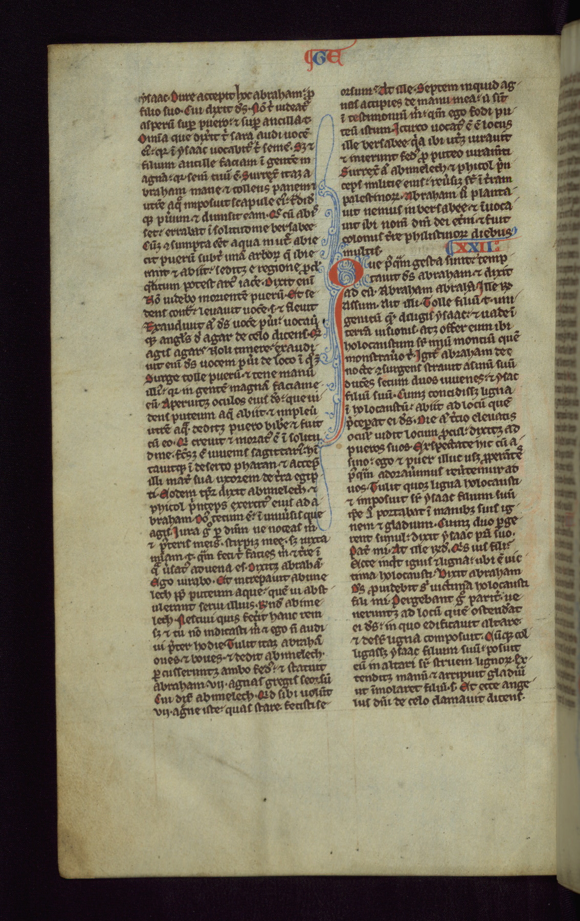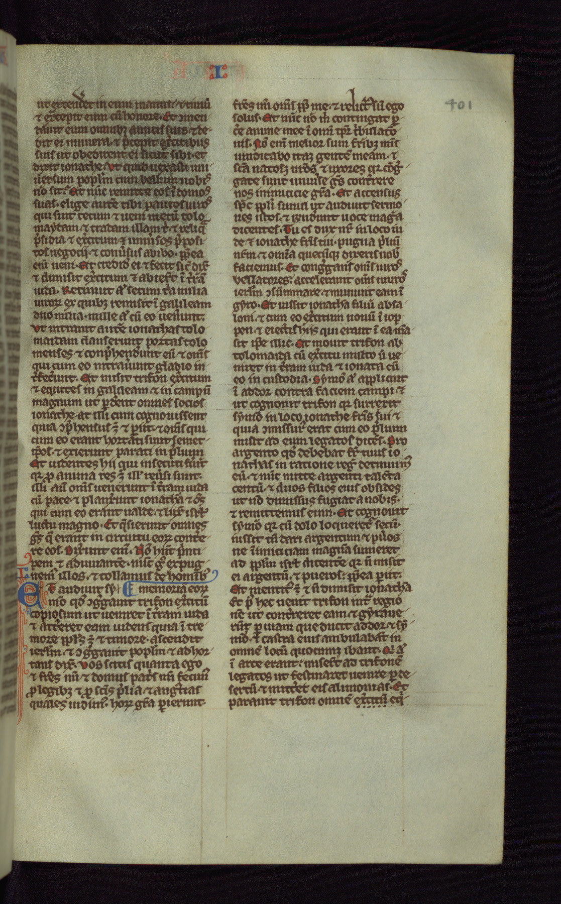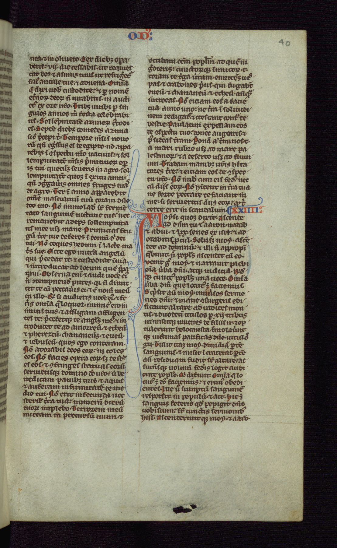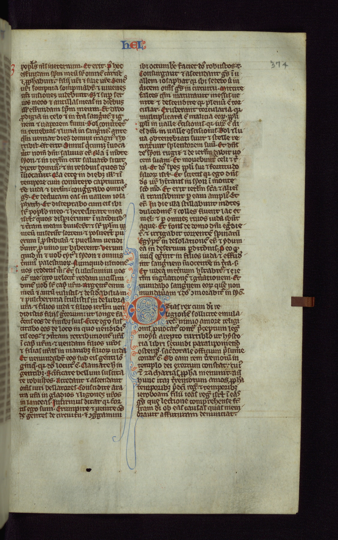 This pocket-size Bible was created around the middle of the thirteenth century in England. It contains the Vulgate text of the Old and New Testaments, arranged in order and divided into chapters. Such Bibles, designed for individual rather than institutional use, began to be created on a large scale during the thirteenth century, especially in Paris. This manuscript is illuminated with a large number of small historiated initials, and also includes a somewhat later image of the Three Living and the Three Dead, a popular scene based on a French poem of the same century.