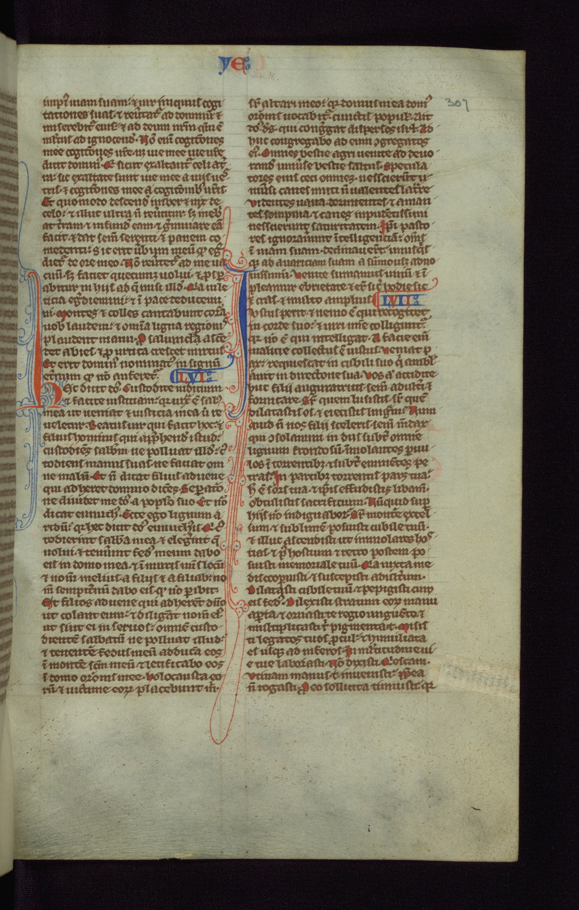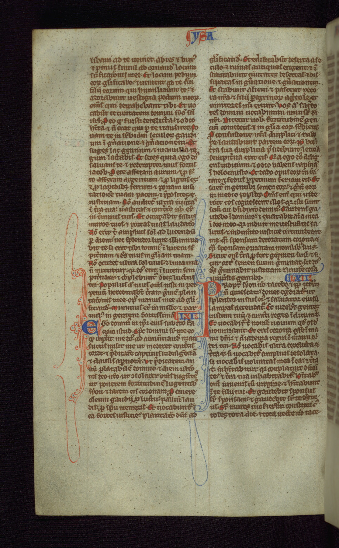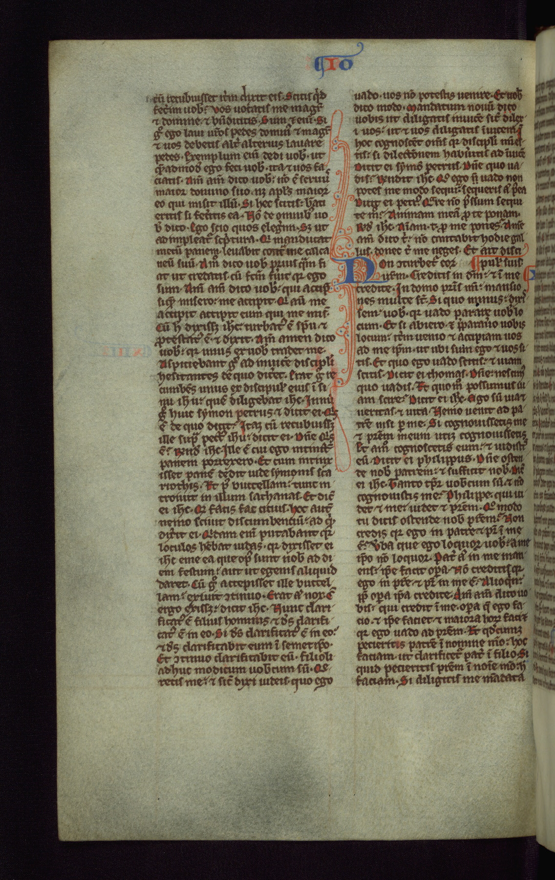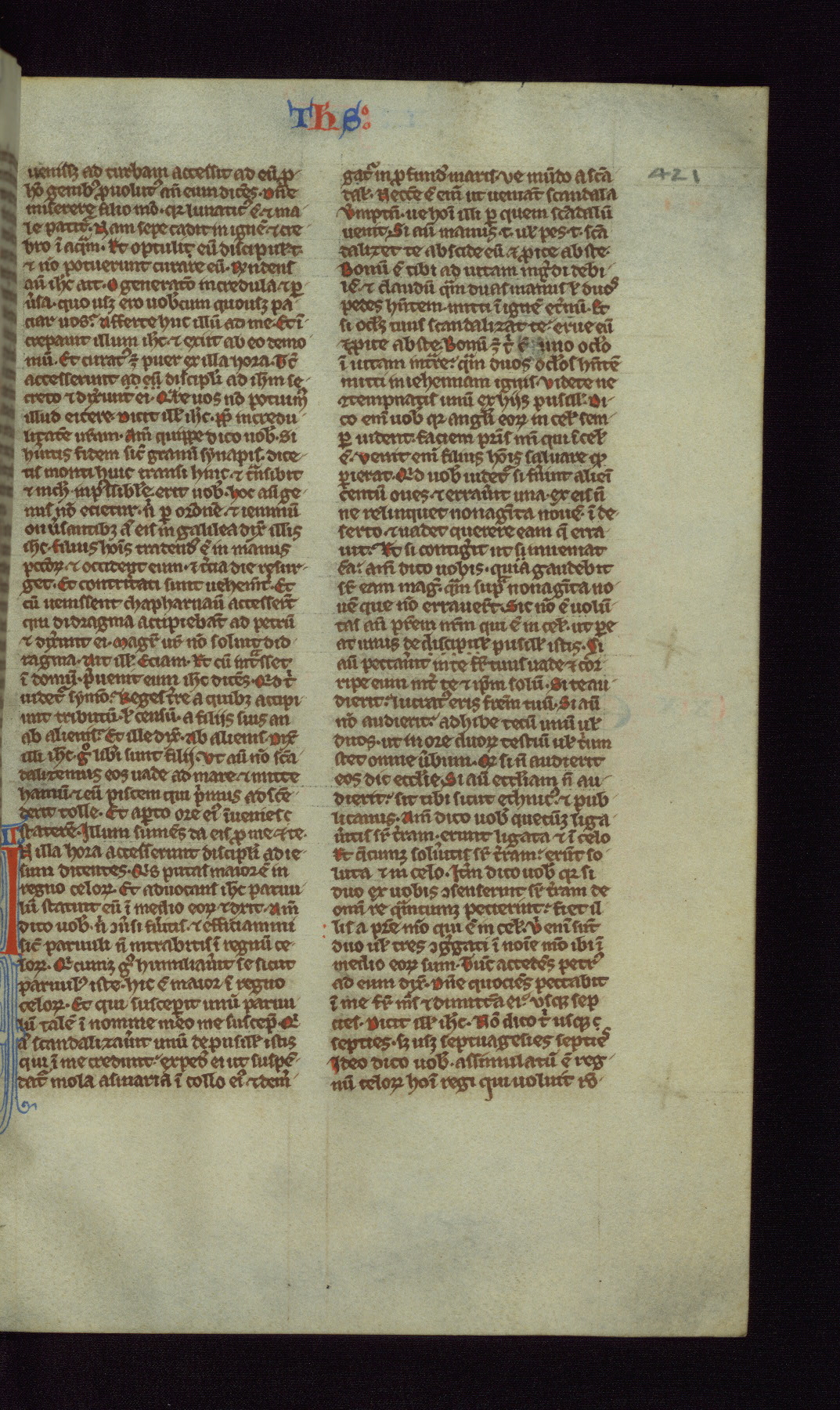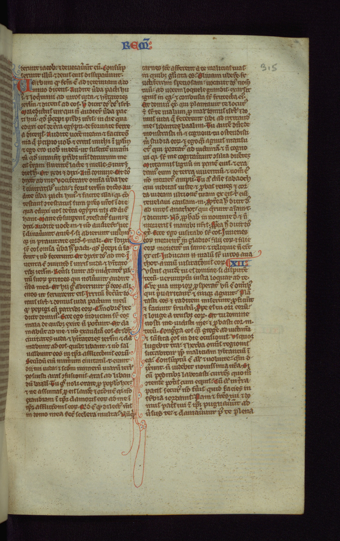 This pocket-size Bible was created around the middle of the thirteenth century in England. It contains the Vulgate text of the Old and New Testaments, arranged in order and divided into chapters. Such Bibles, designed for individual rather than institutional use, began to be created on a large scale during the thirteenth century, especially in Paris. This manuscript is illuminated with a large number of small historiated initials, and also includes a somewhat later image of the Three Living and the Three Dead, a popular scene based on a French poem of the same century.