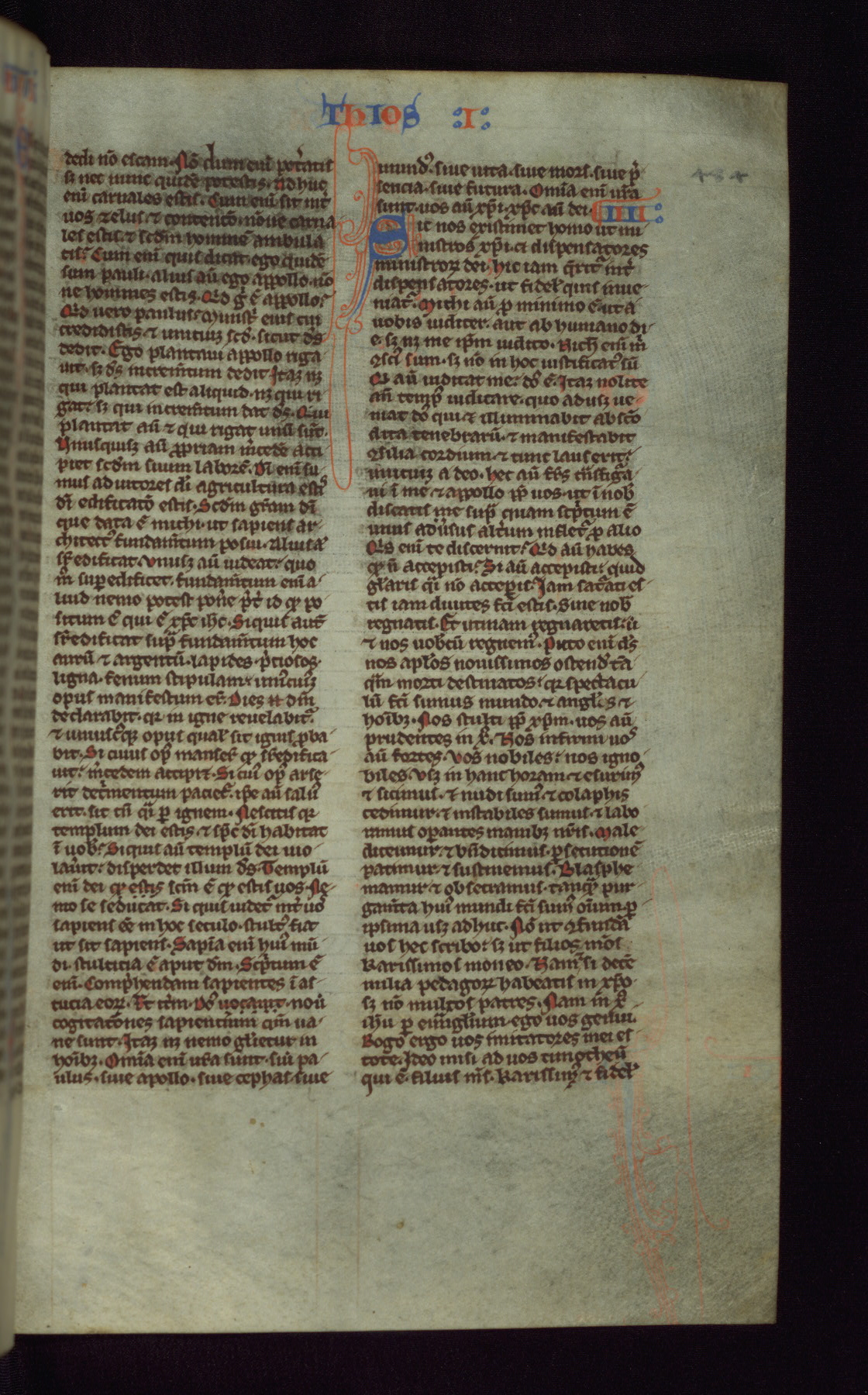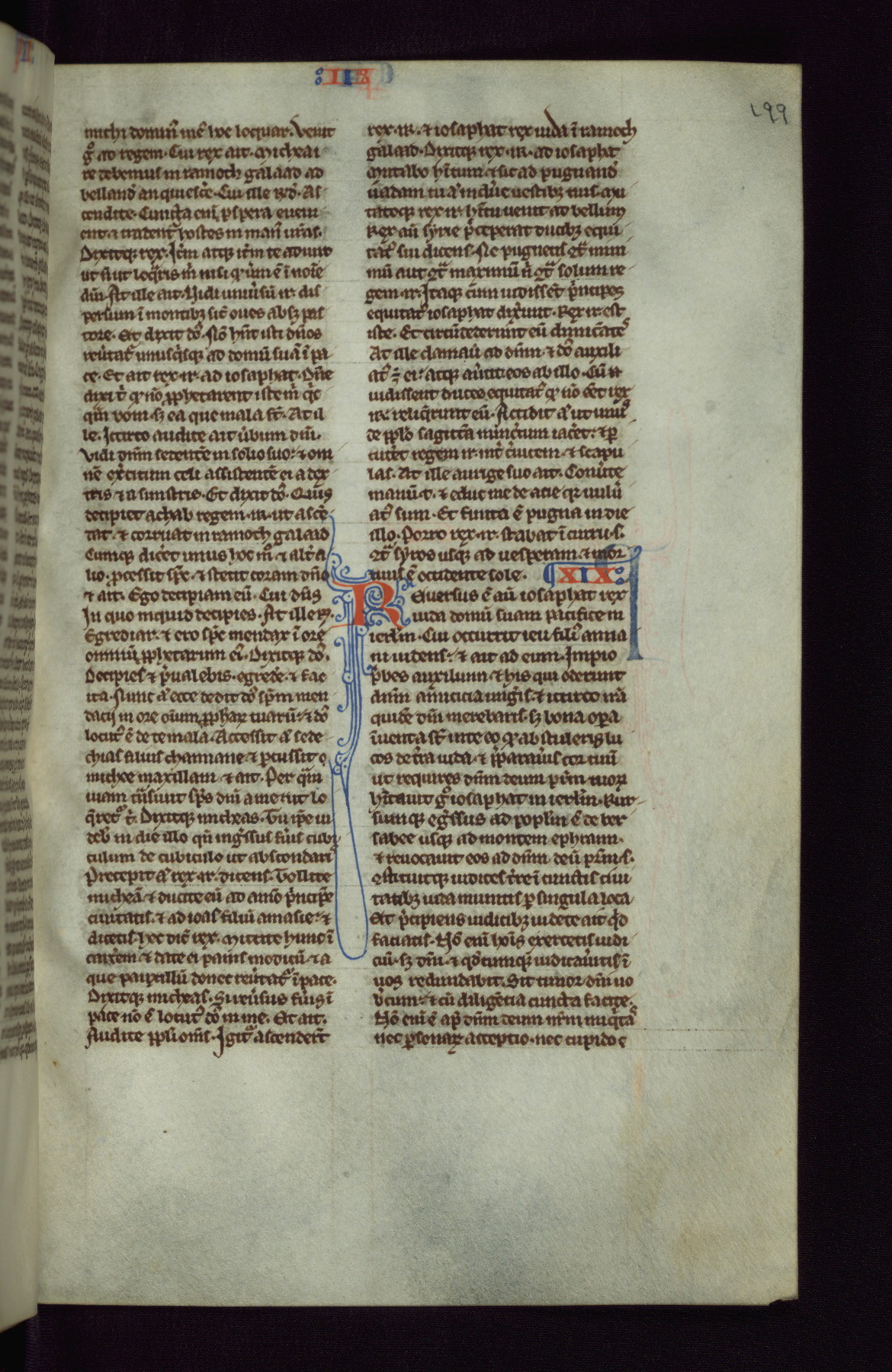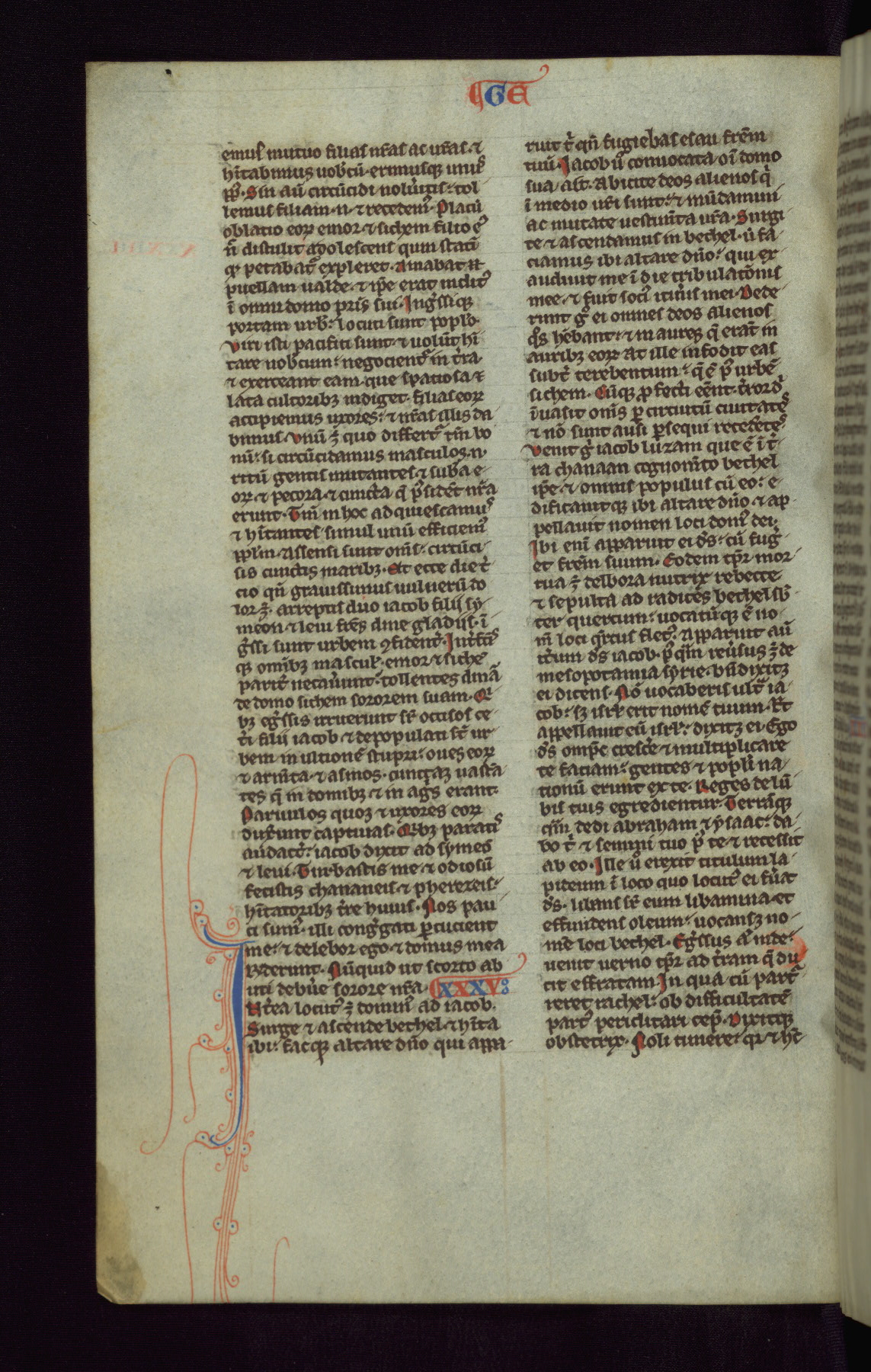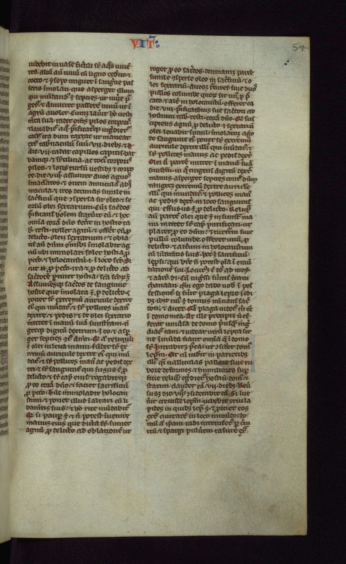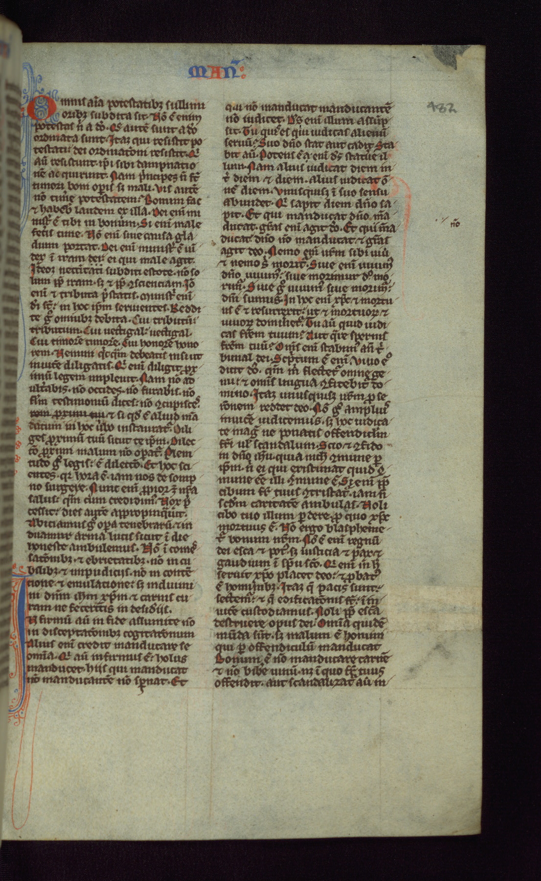 This pocket-size Bible was created around the middle of the thirteenth century in England. It contains the Vulgate text of the Old and New Testaments, arranged in order and divided into chapters. Such Bibles, designed for individual rather than institutional use, began to be created on a large scale during the thirteenth century, especially in Paris. This manuscript is illuminated with a large number of small historiated initials, and also includes a somewhat later image of the Three Living and the Three Dead, a popular scene based on a French poem of the same century.