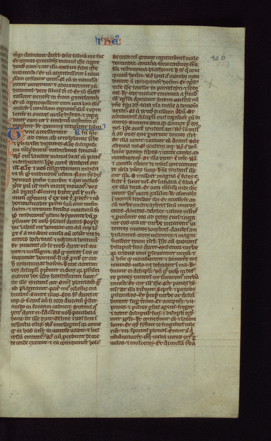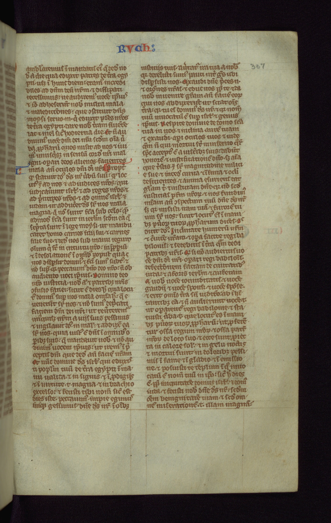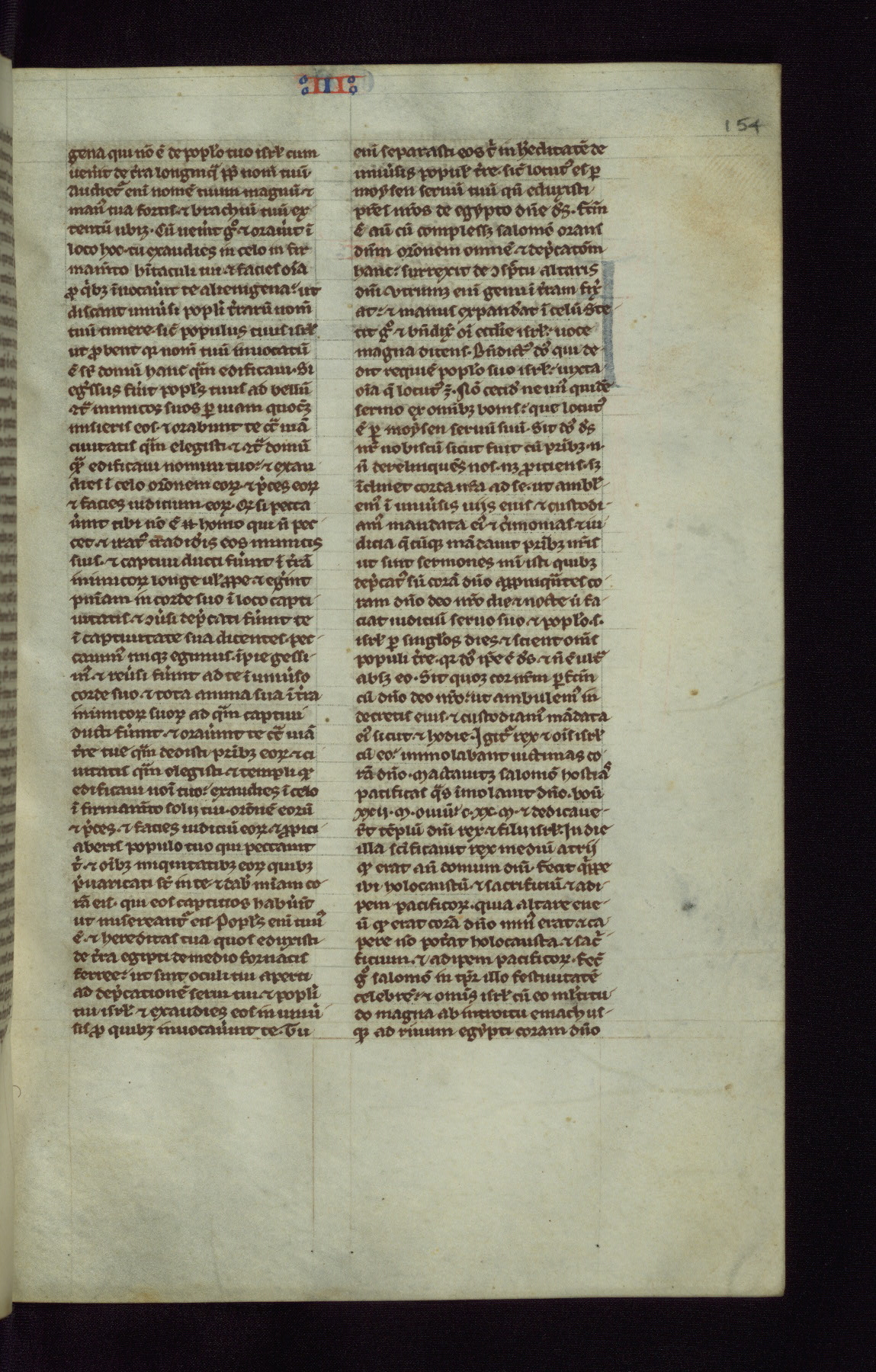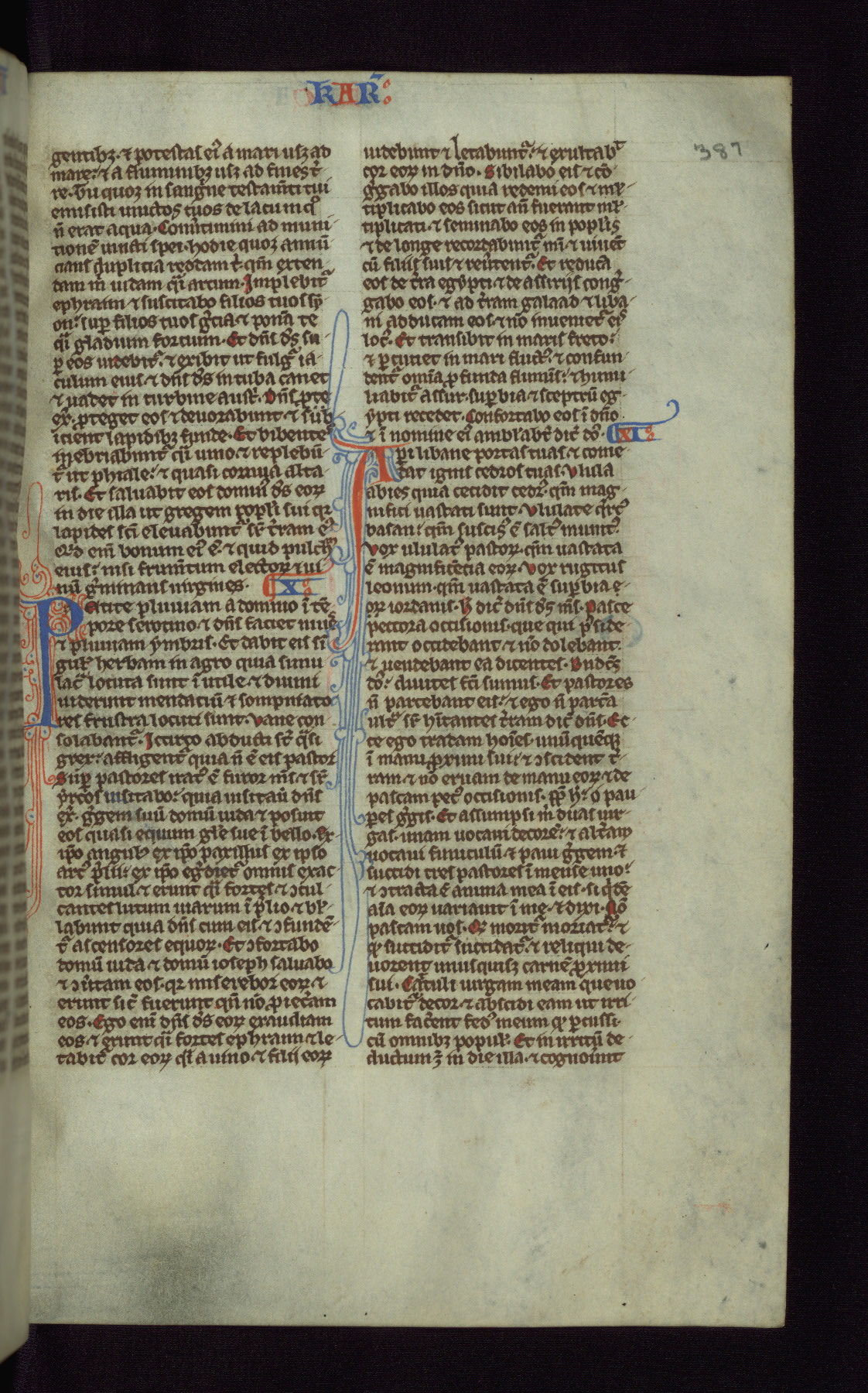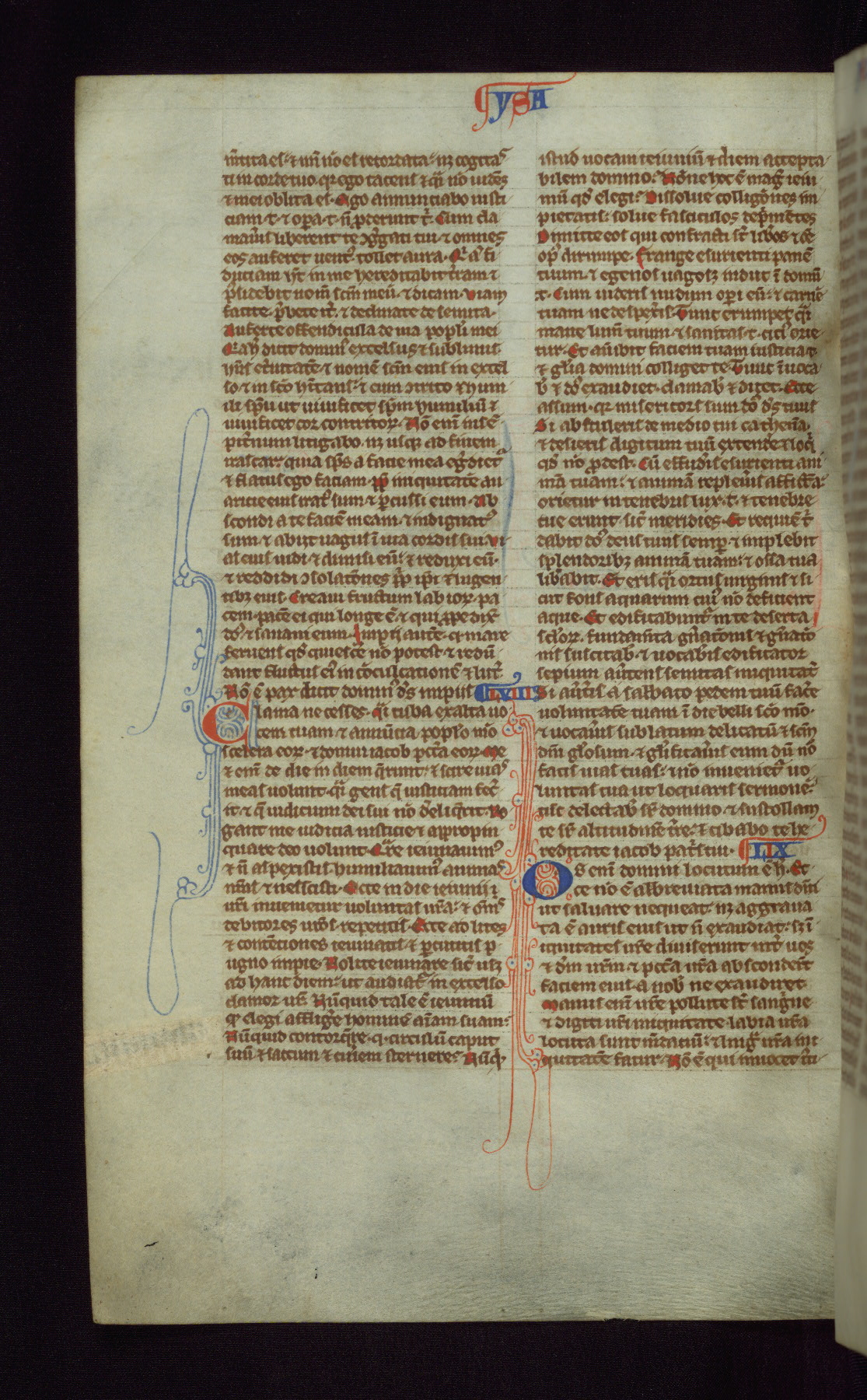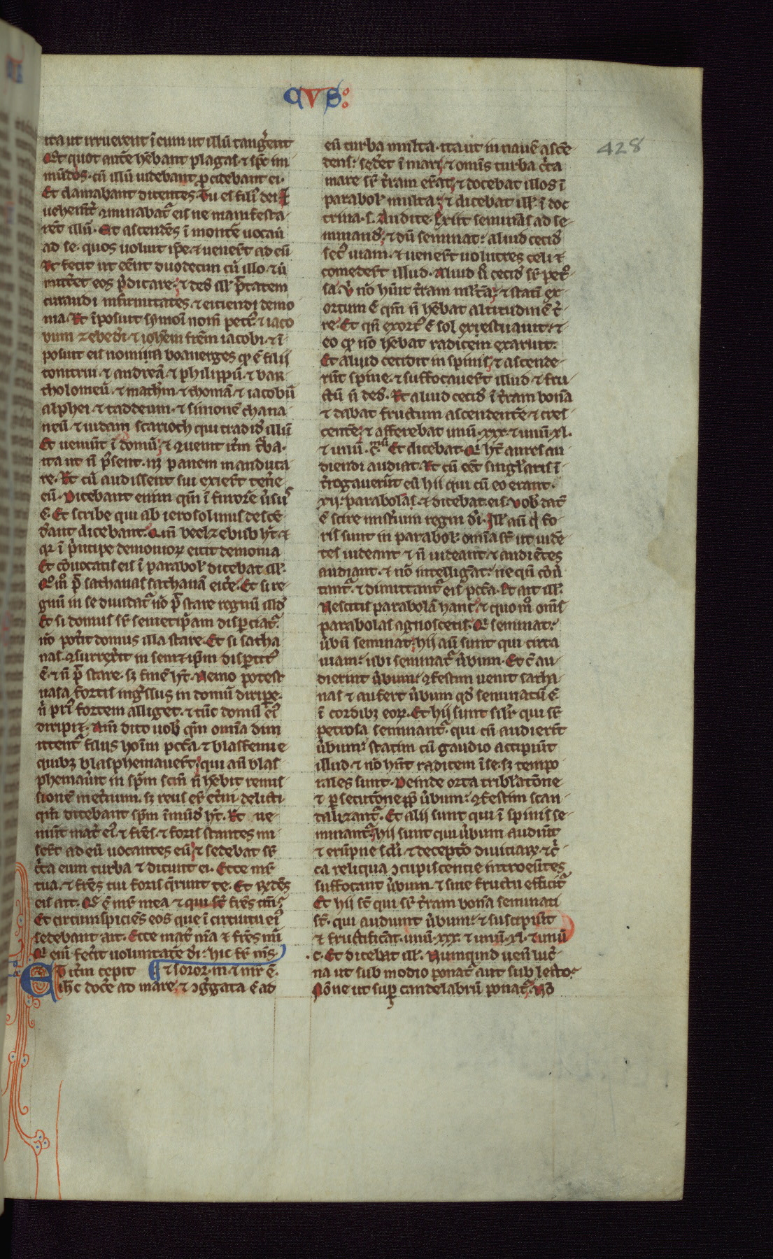 This pocket-size Bible was created around the middle of the thirteenth century in England. It contains the Vulgate text of the Old and New Testaments, arranged in order and divided into chapters. Such Bibles, designed for individual rather than institutional use, began to be created on a large scale during the thirteenth century, especially in Paris. This manuscript is illuminated with a large number of small historiated initials, and also includes a somewhat later image of the Three Living and the Three Dead, a popular scene based on a French poem of the same century.