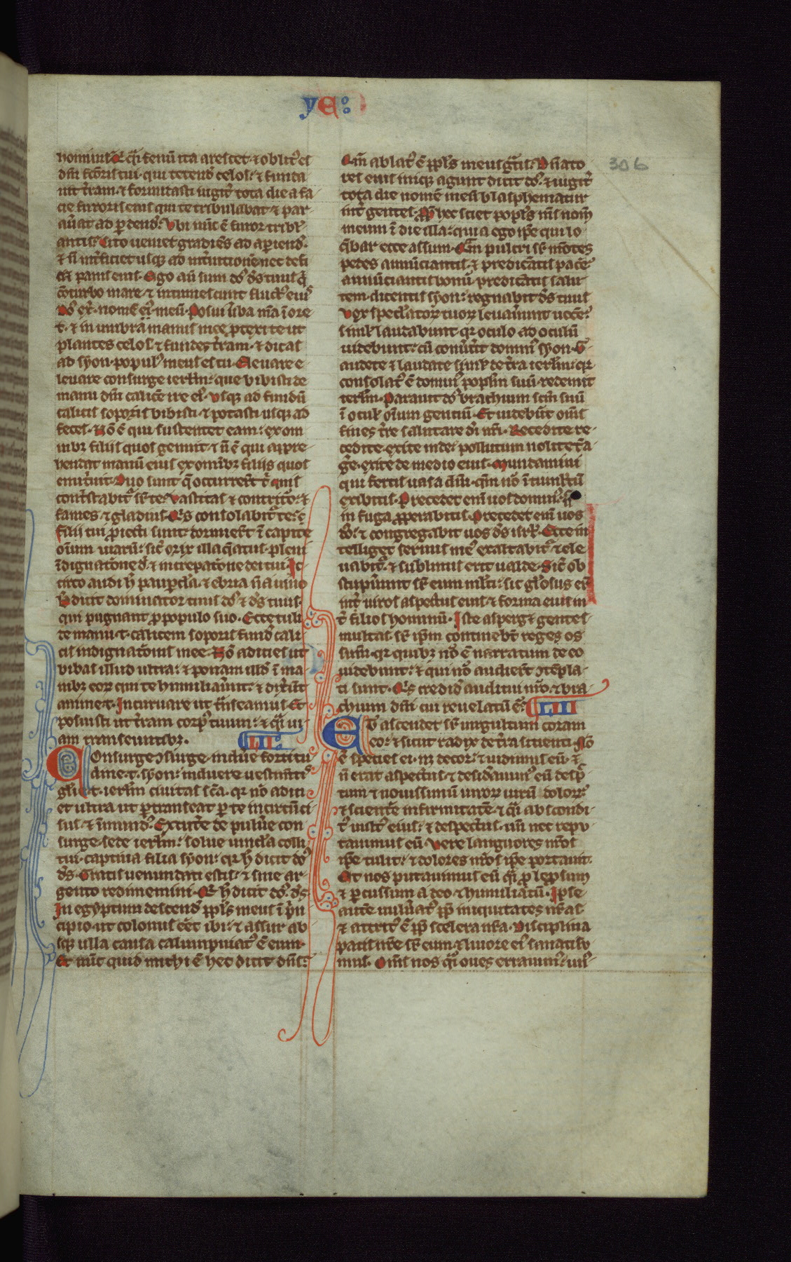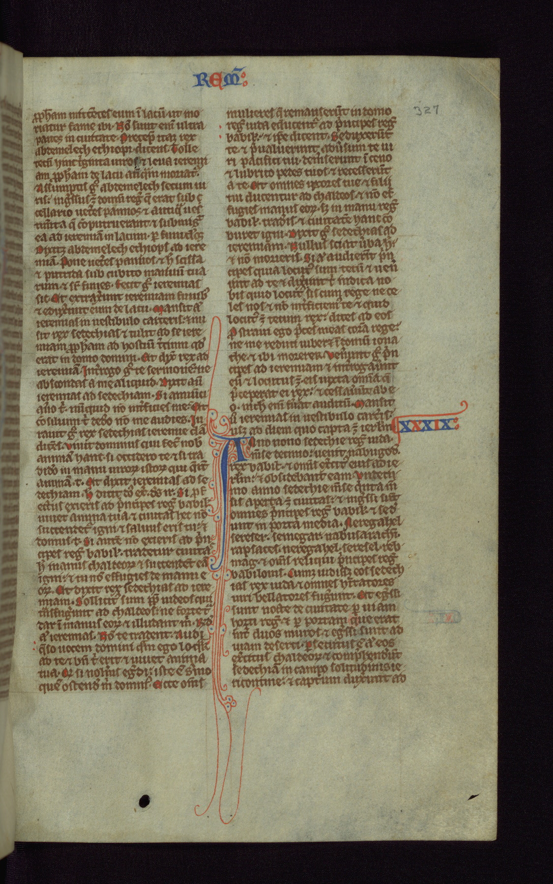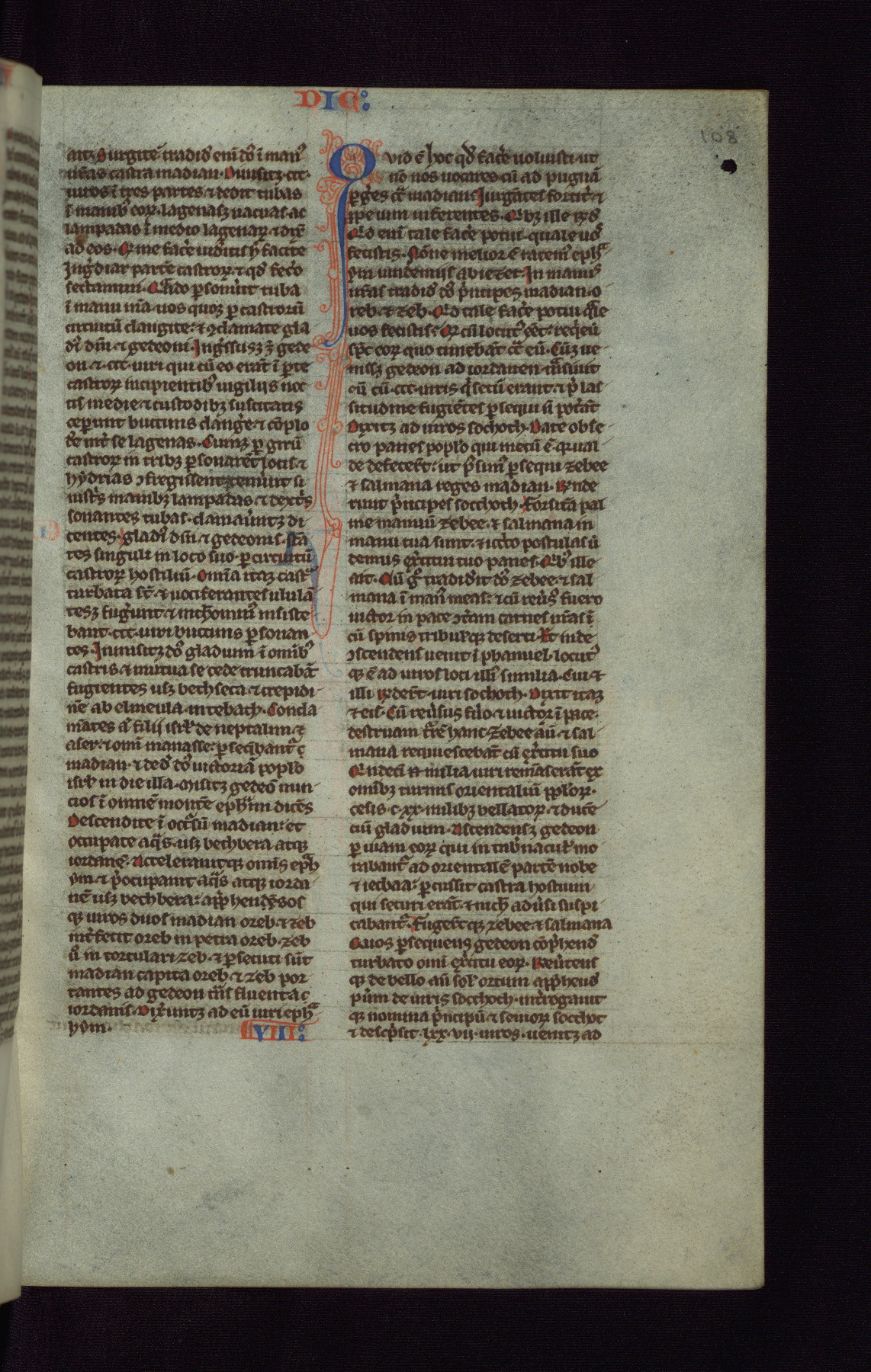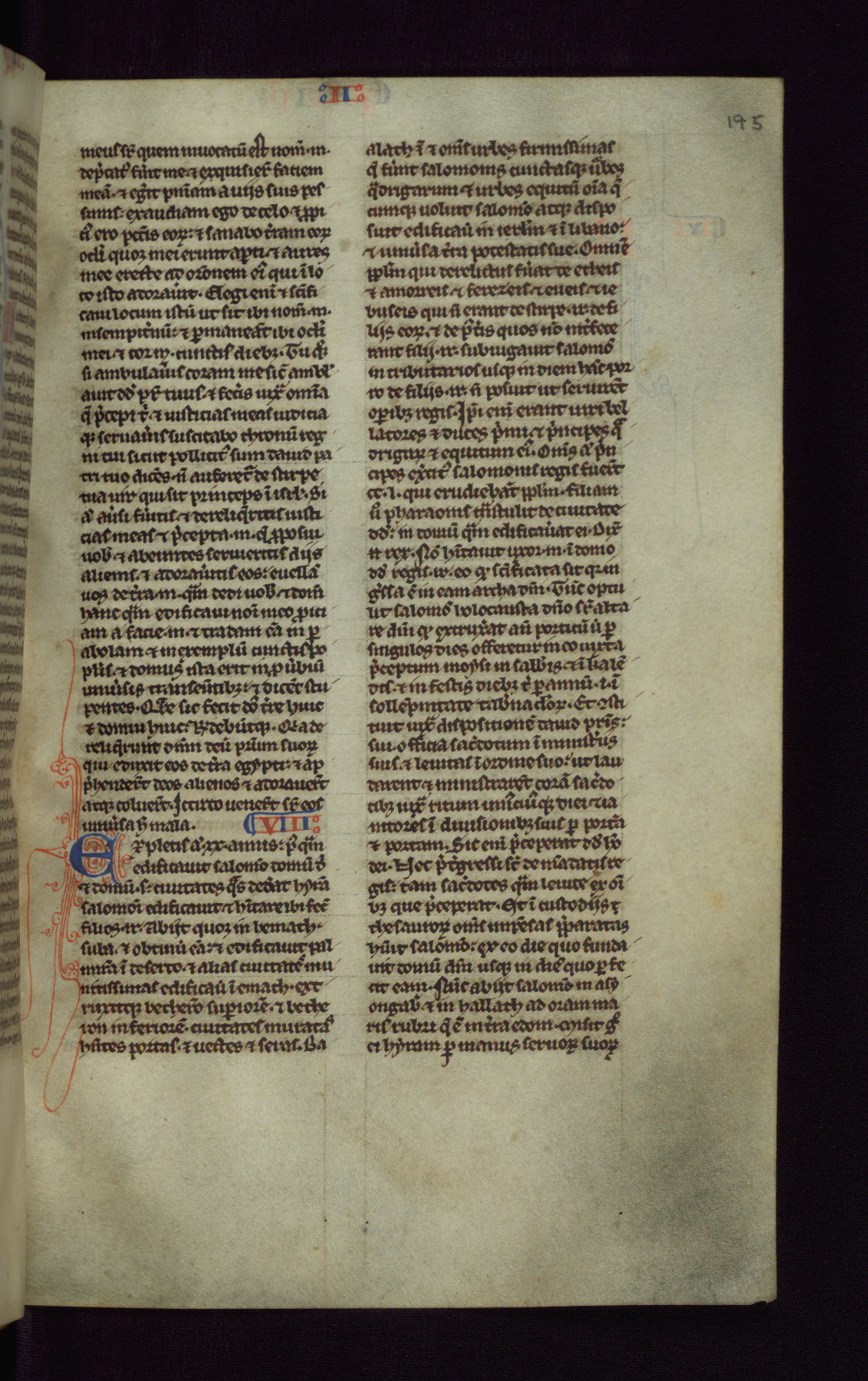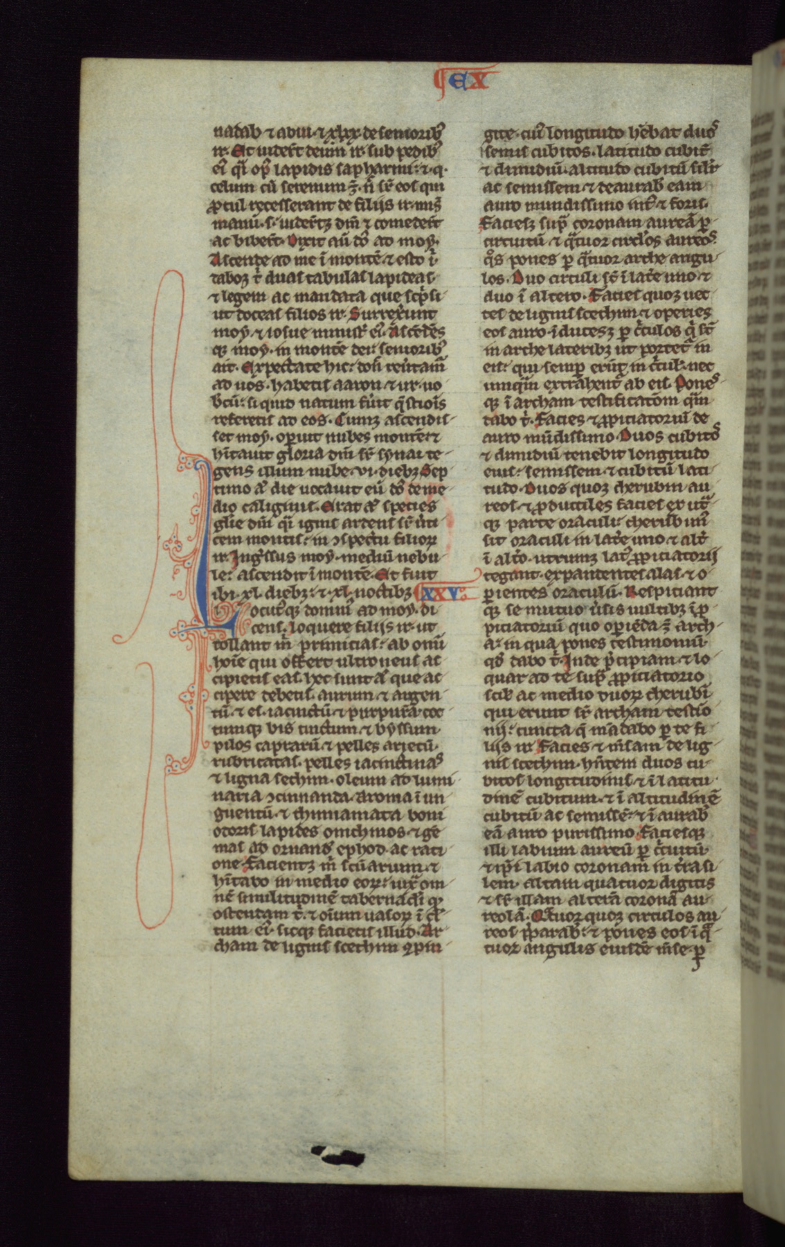 This pocket-size Bible was created around the middle of the thirteenth century in England. It contains the Vulgate text of the Old and New Testaments, arranged in order and divided into chapters. Such Bibles, designed for individual rather than institutional use, began to be created on a large scale during the thirteenth century, especially in Paris. This manuscript is illuminated with a large number of small historiated initials, and also includes a somewhat later image of the Three Living and the Three Dead, a popular scene based on a French poem of the same century.