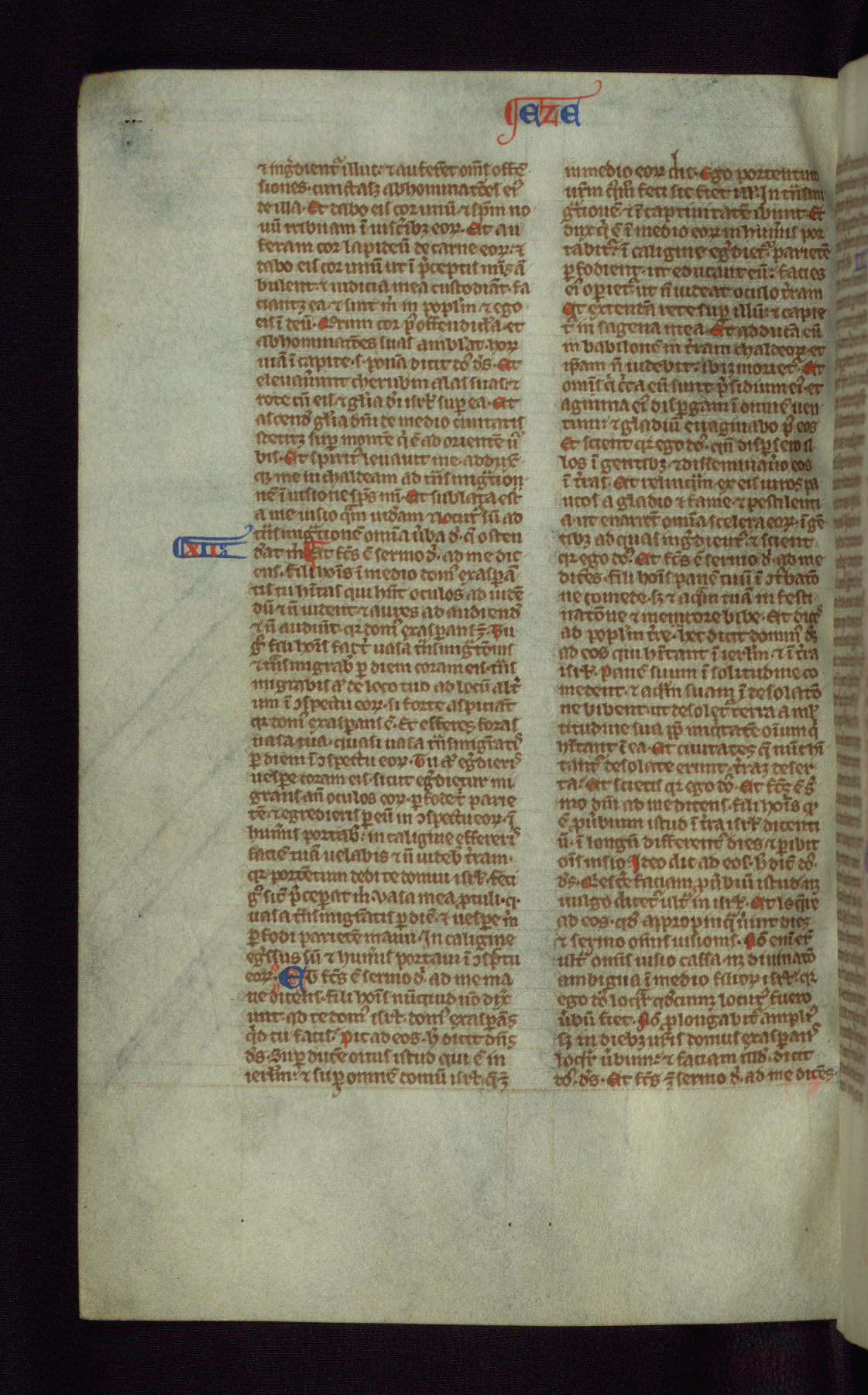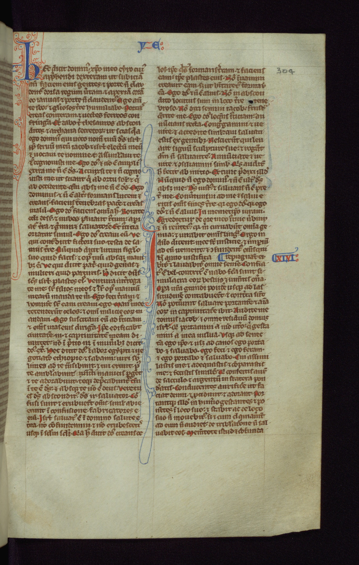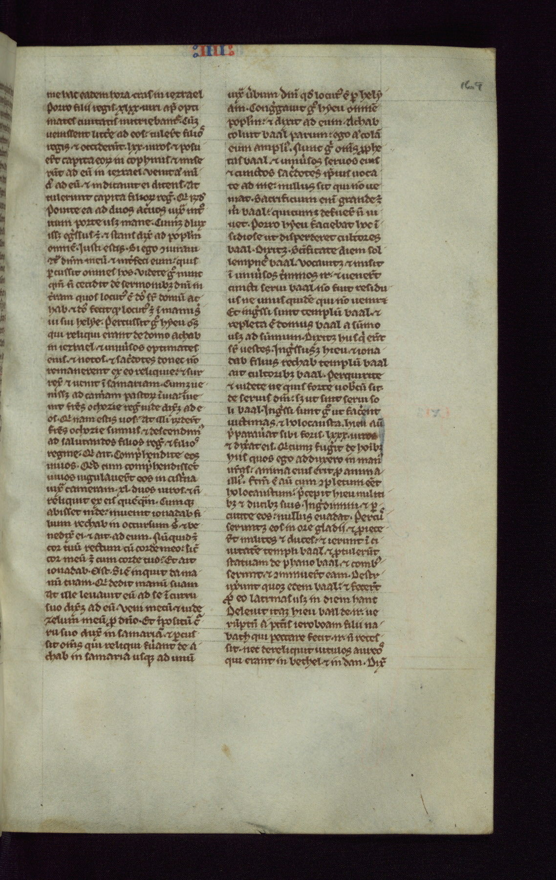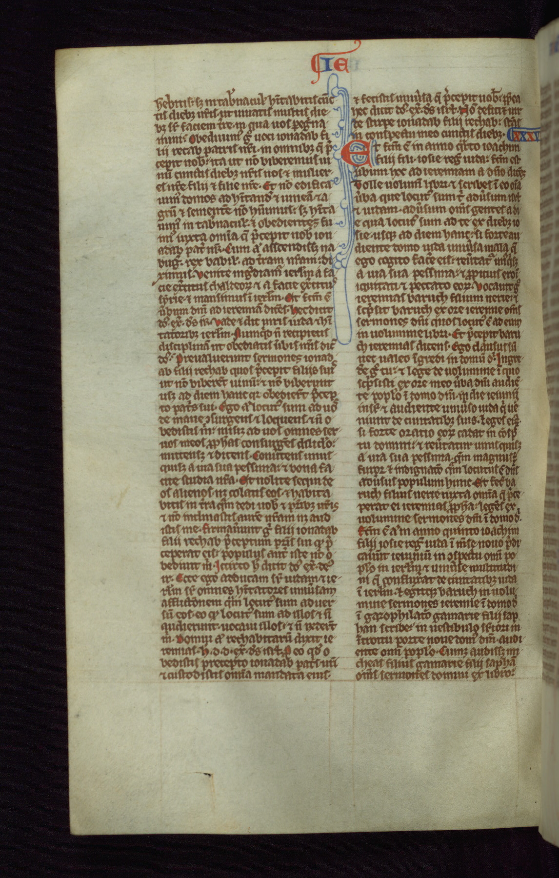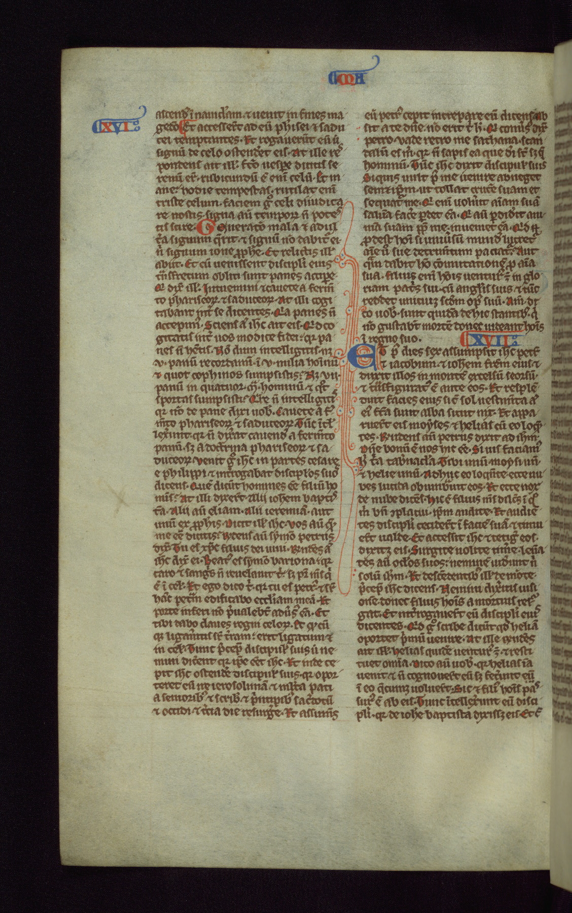 This pocket-size Bible was created around the middle of the thirteenth century in England. It contains the Vulgate text of the Old and New Testaments, arranged in order and divided into chapters. Such Bibles, designed for individual rather than institutional use, began to be created on a large scale during the thirteenth century, especially in Paris. This manuscript is illuminated with a large number of small historiated initials, and also includes a somewhat later image of the Three Living and the Three Dead, a popular scene based on a French poem of the same century.