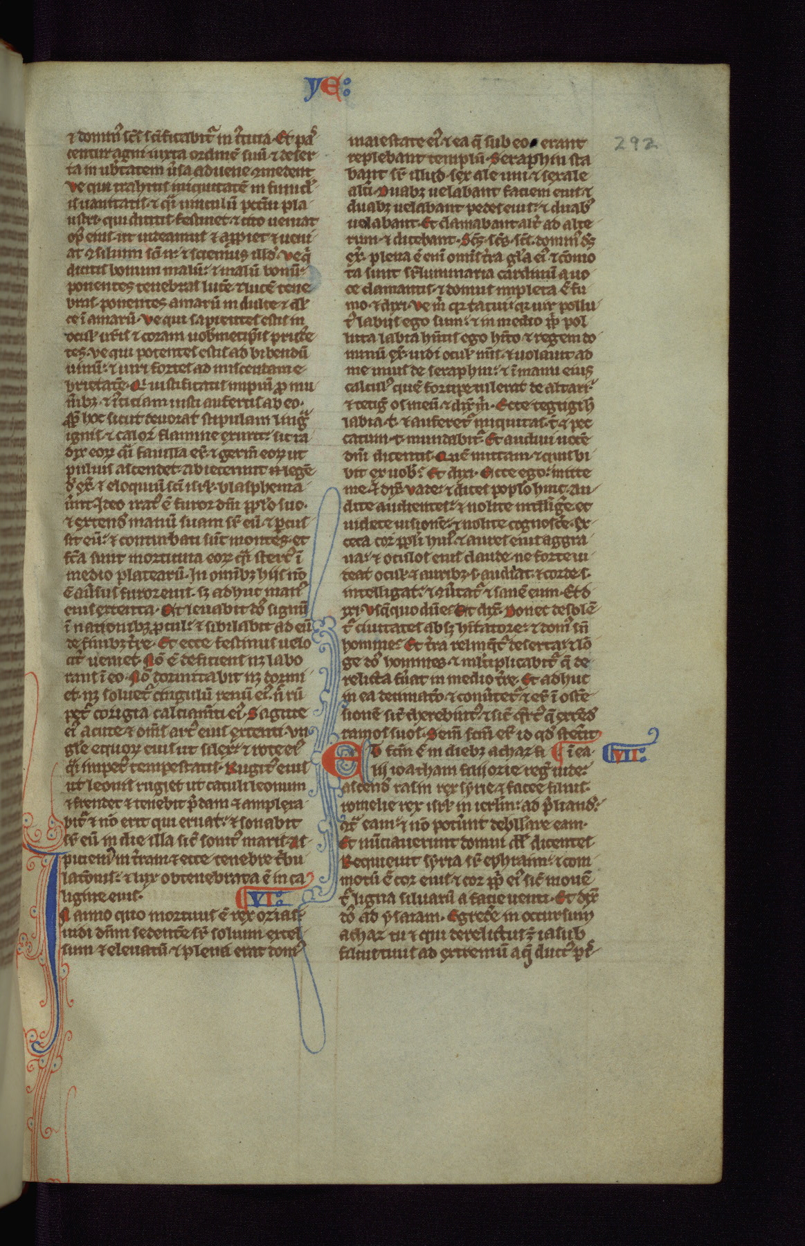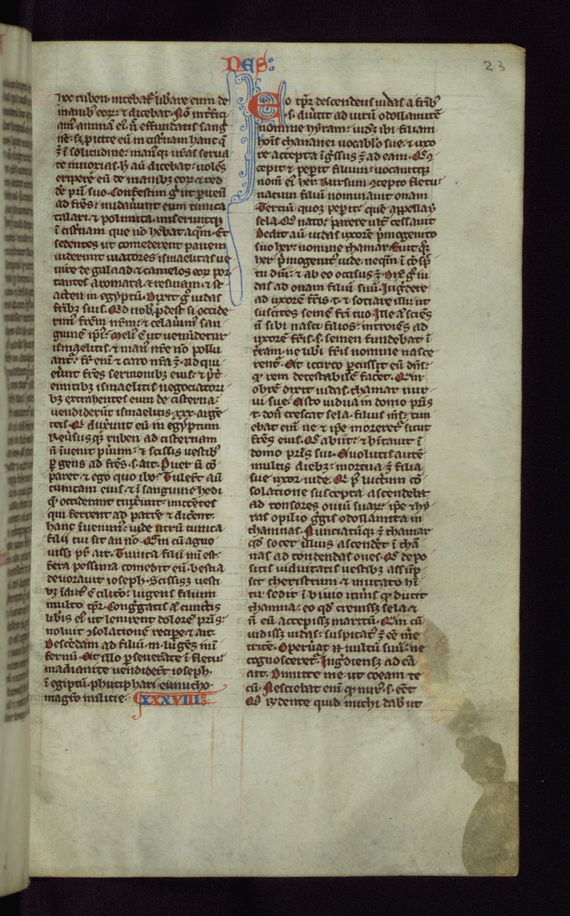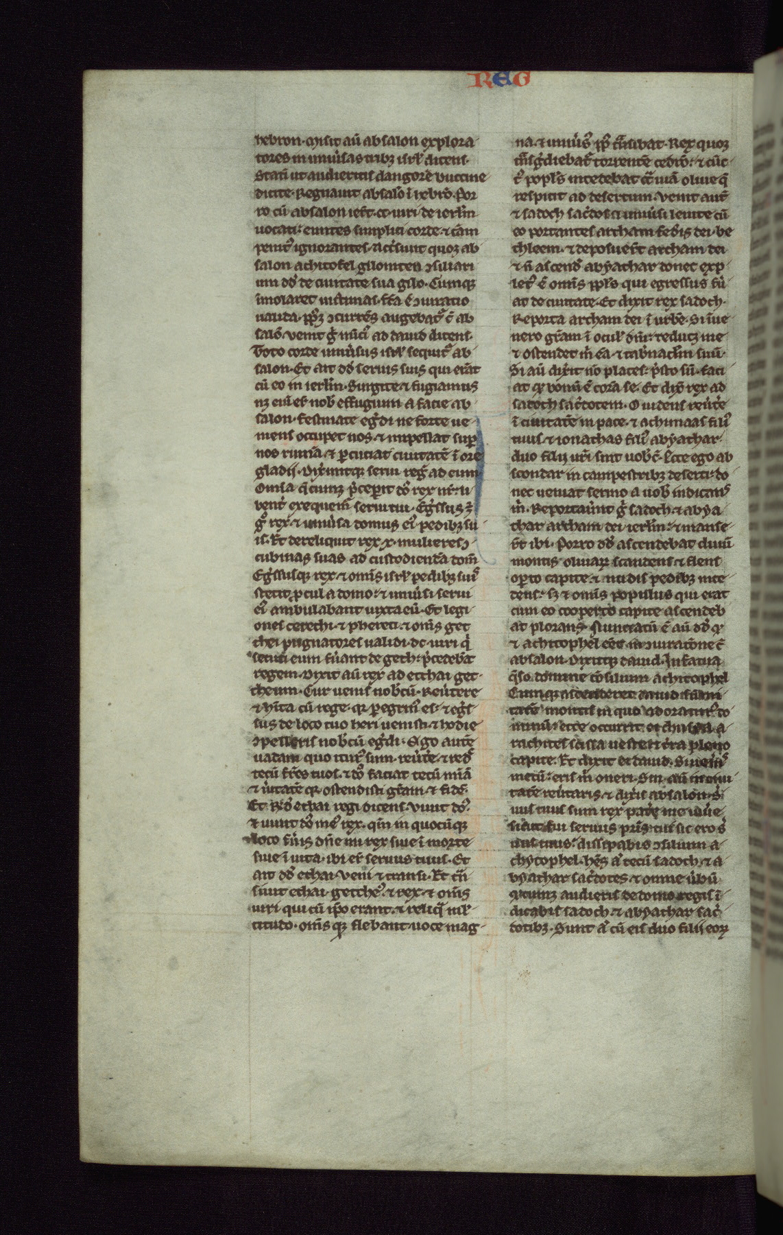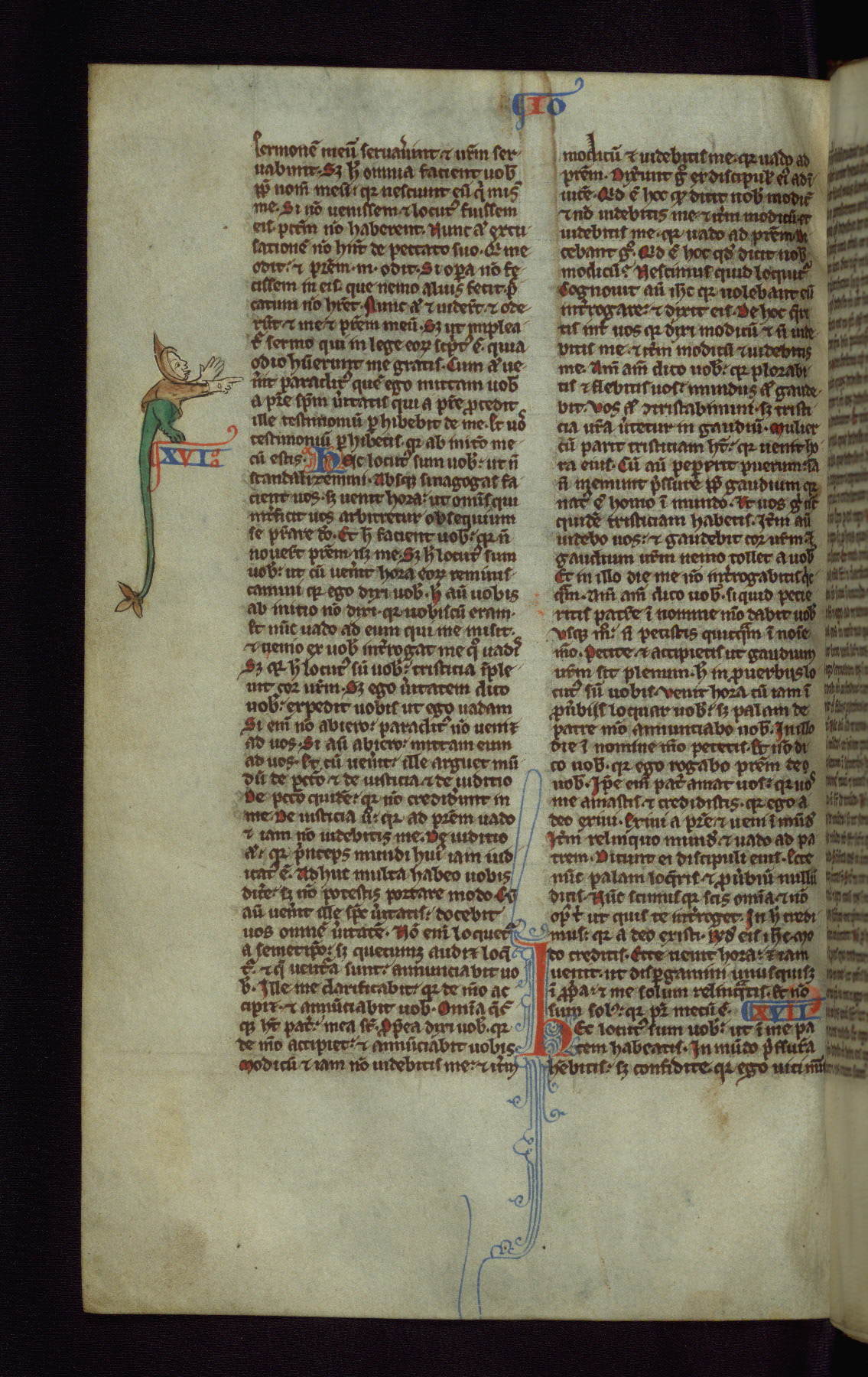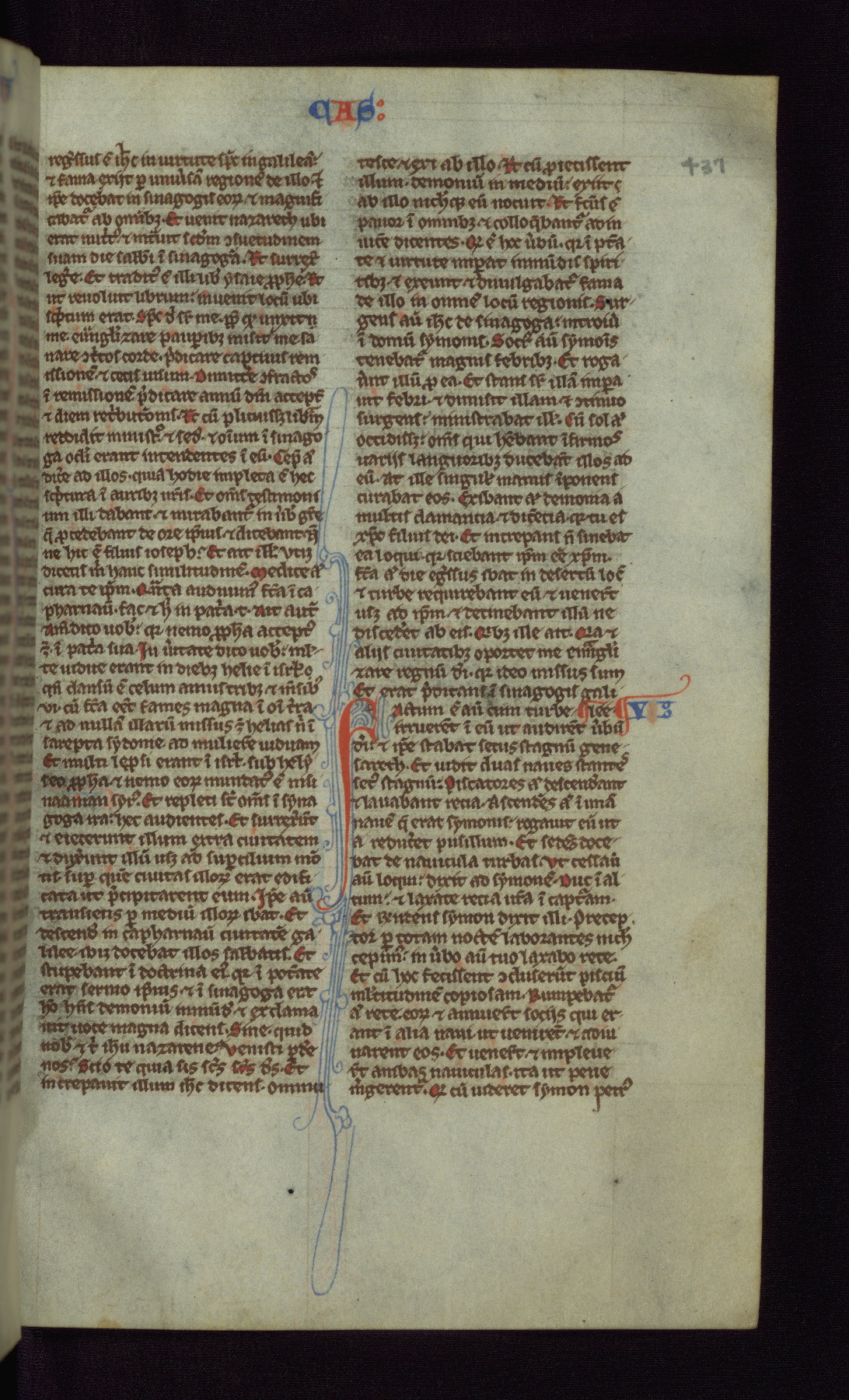 This pocket-size Bible was created around the middle of the thirteenth century in England. It contains the Vulgate text of the Old and New Testaments, arranged in order and divided into chapters. Such Bibles, designed for individual rather than institutional use, began to be created on a large scale during the thirteenth century, especially in Paris. This manuscript is illuminated with a large number of small historiated initials, and also includes a somewhat later image of the Three Living and the Three Dead, a popular scene based on a French poem of the same century.