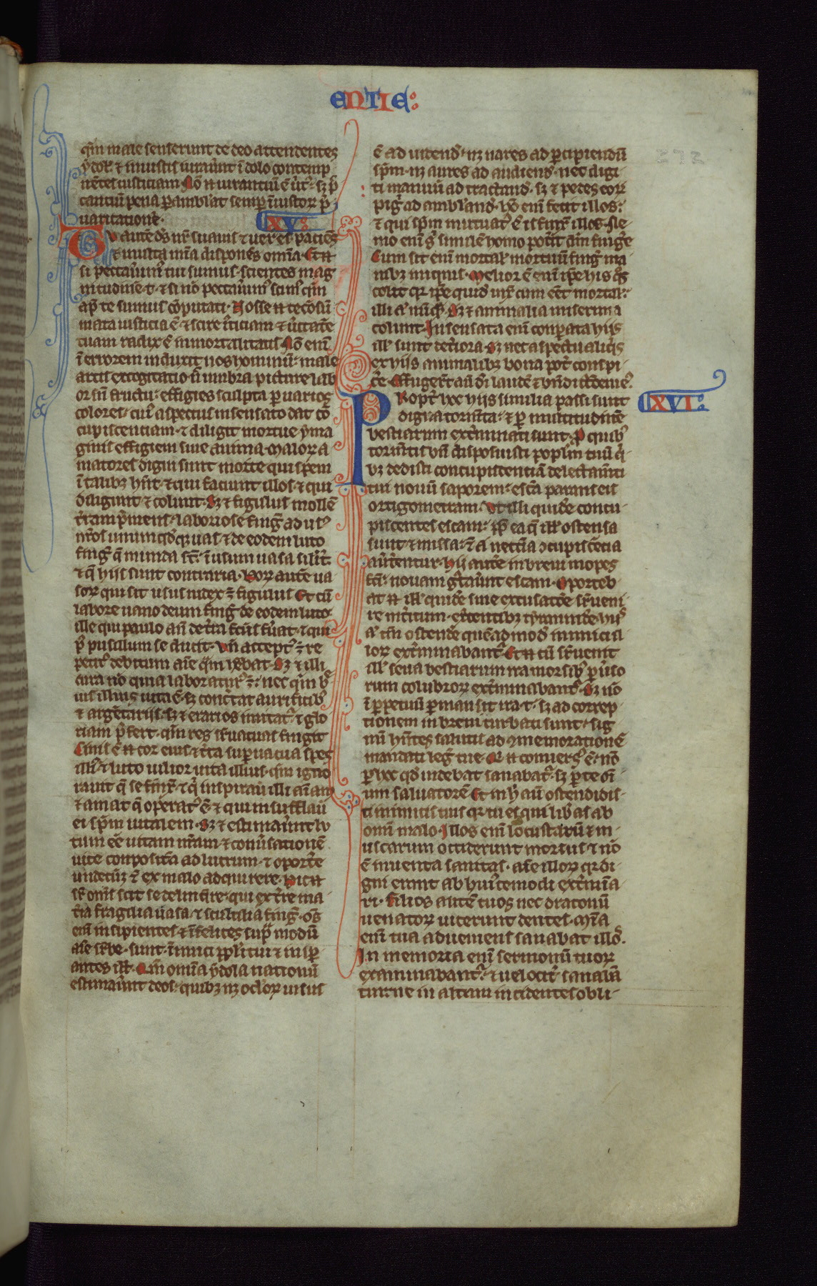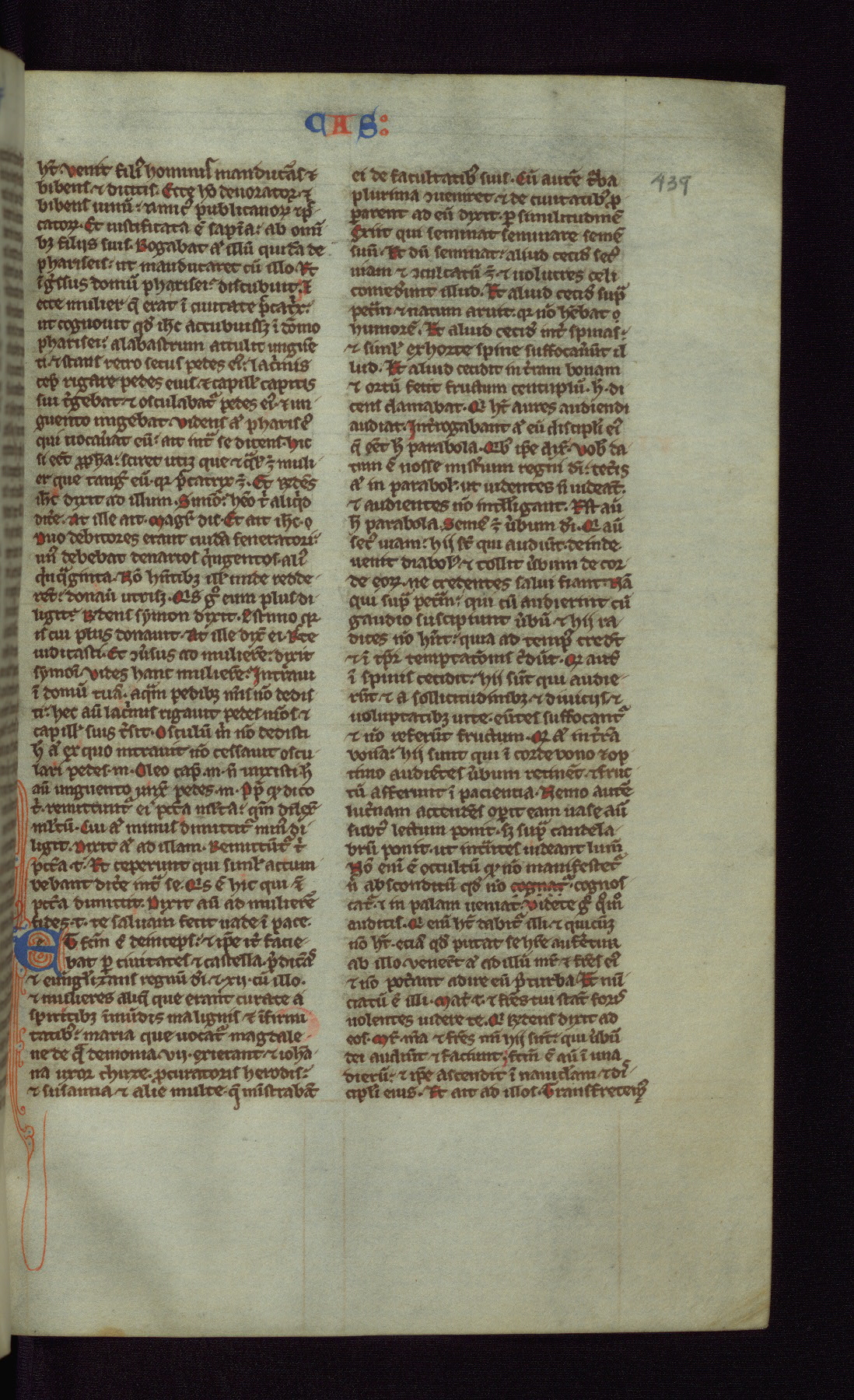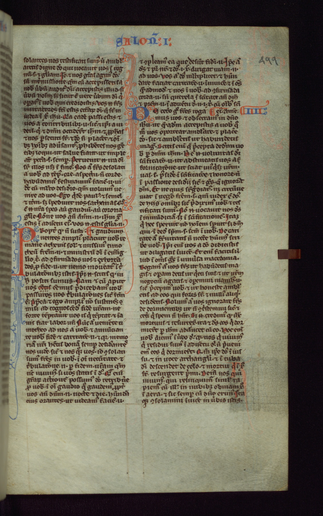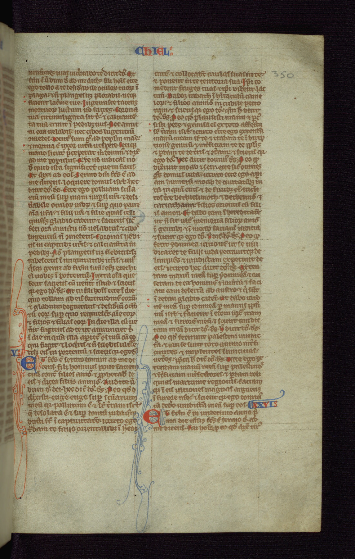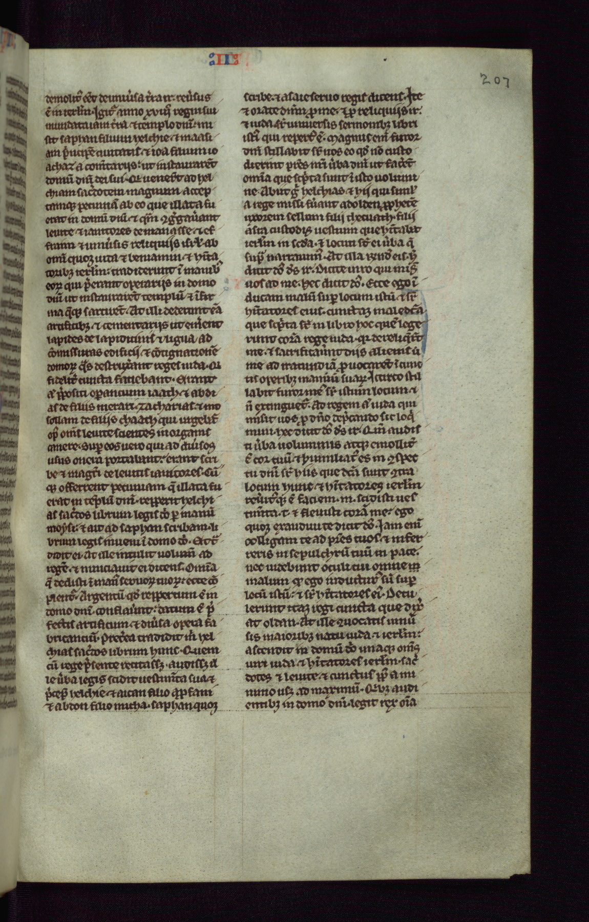 This pocket-size Bible was created around the middle of the thirteenth century in England. It contains the Vulgate text of the Old and New Testaments, arranged in order and divided into chapters. Such Bibles, designed for individual rather than institutional use, began to be created on a large scale during the thirteenth century, especially in Paris. This manuscript is illuminated with a large number of small historiated initials, and also includes a somewhat later image of the Three Living and the Three Dead, a popular scene based on a French poem of the same century.