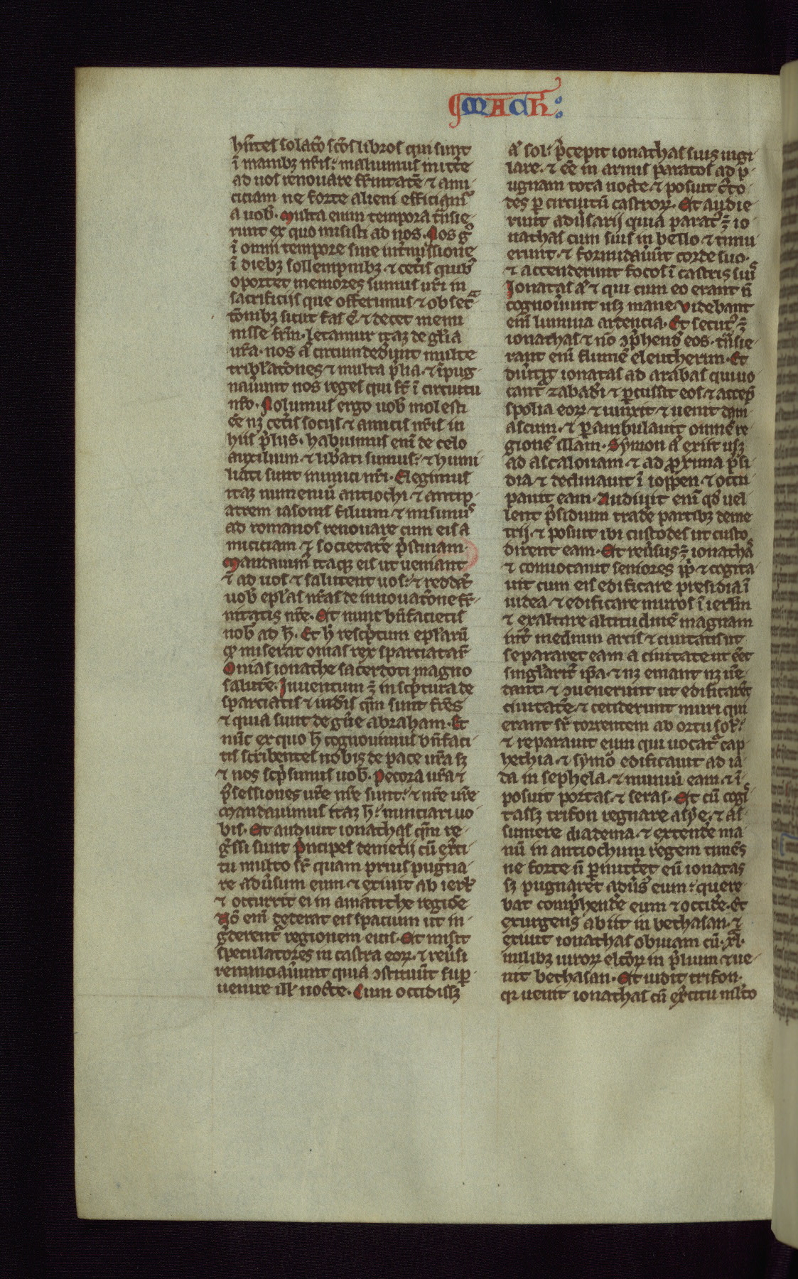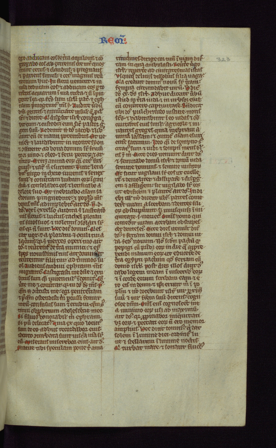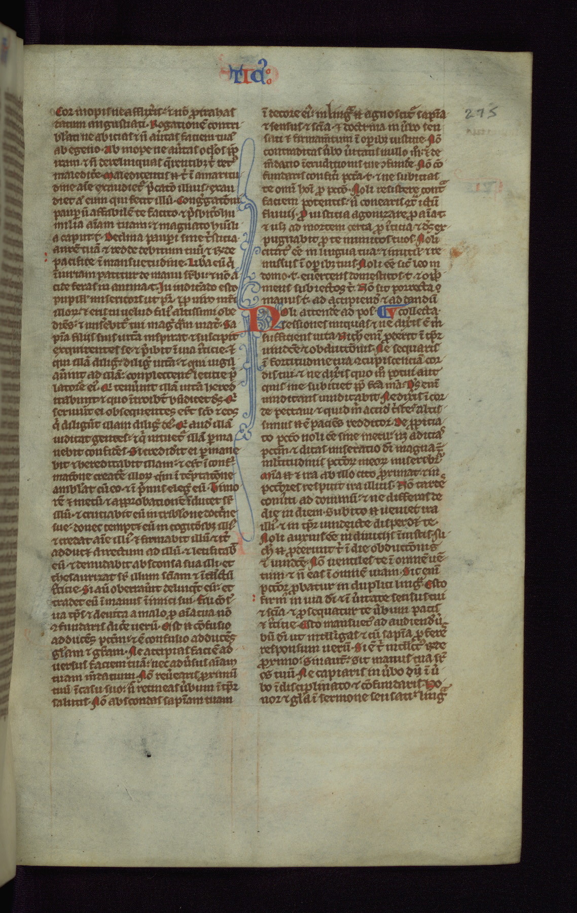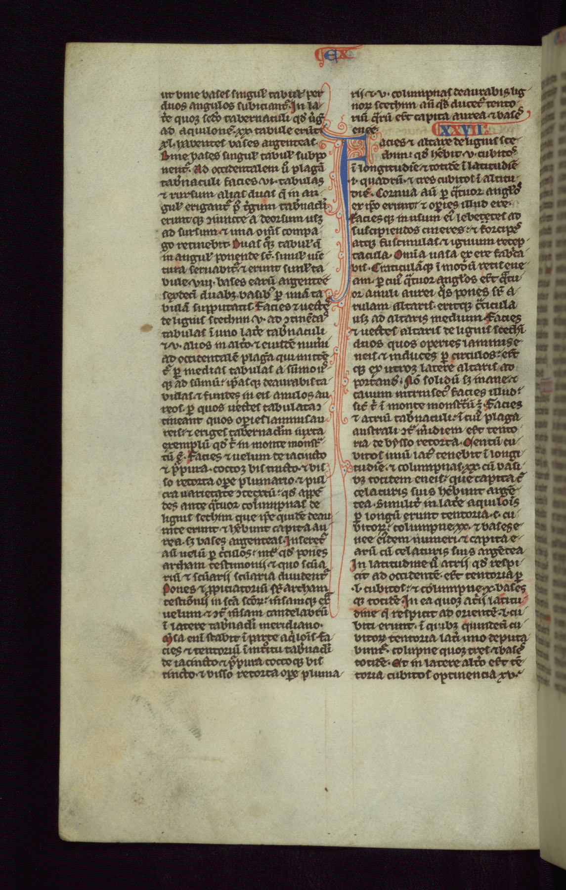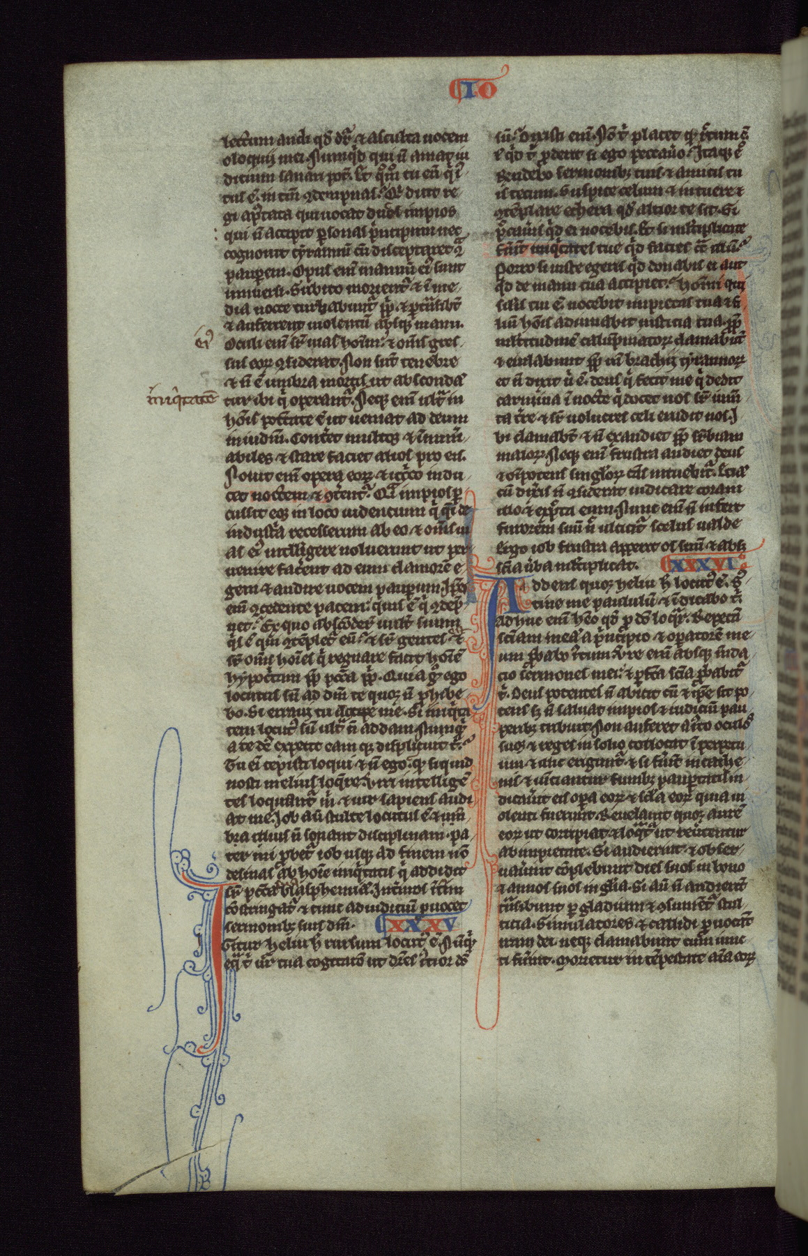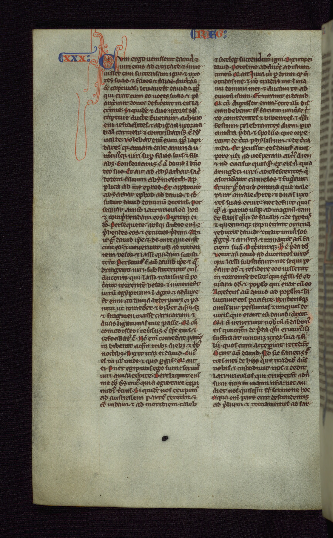 This pocket-size Bible was created around the middle of the thirteenth century in England. It contains the Vulgate text of the Old and New Testaments, arranged in order and divided into chapters. Such Bibles, designed for individual rather than institutional use, began to be created on a large scale during the thirteenth century, especially in Paris. This manuscript is illuminated with a large number of small historiated initials, and also includes a somewhat later image of the Three Living and the Three Dead, a popular scene based on a French poem of the same century.