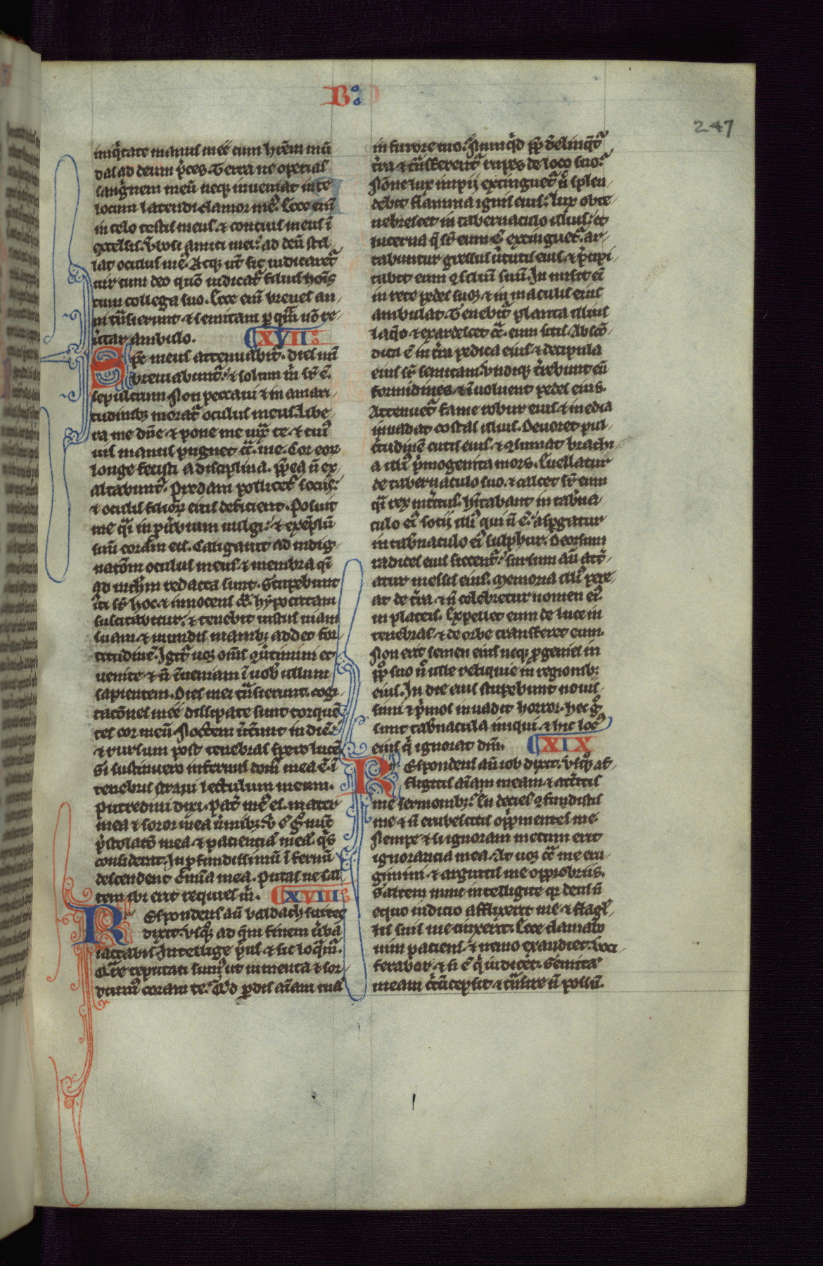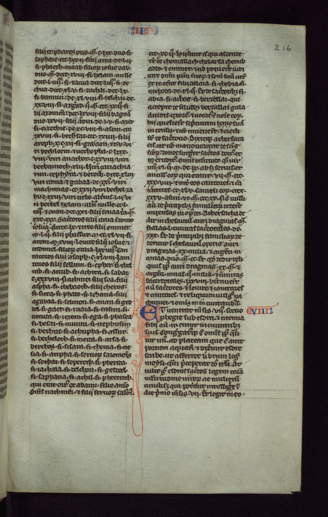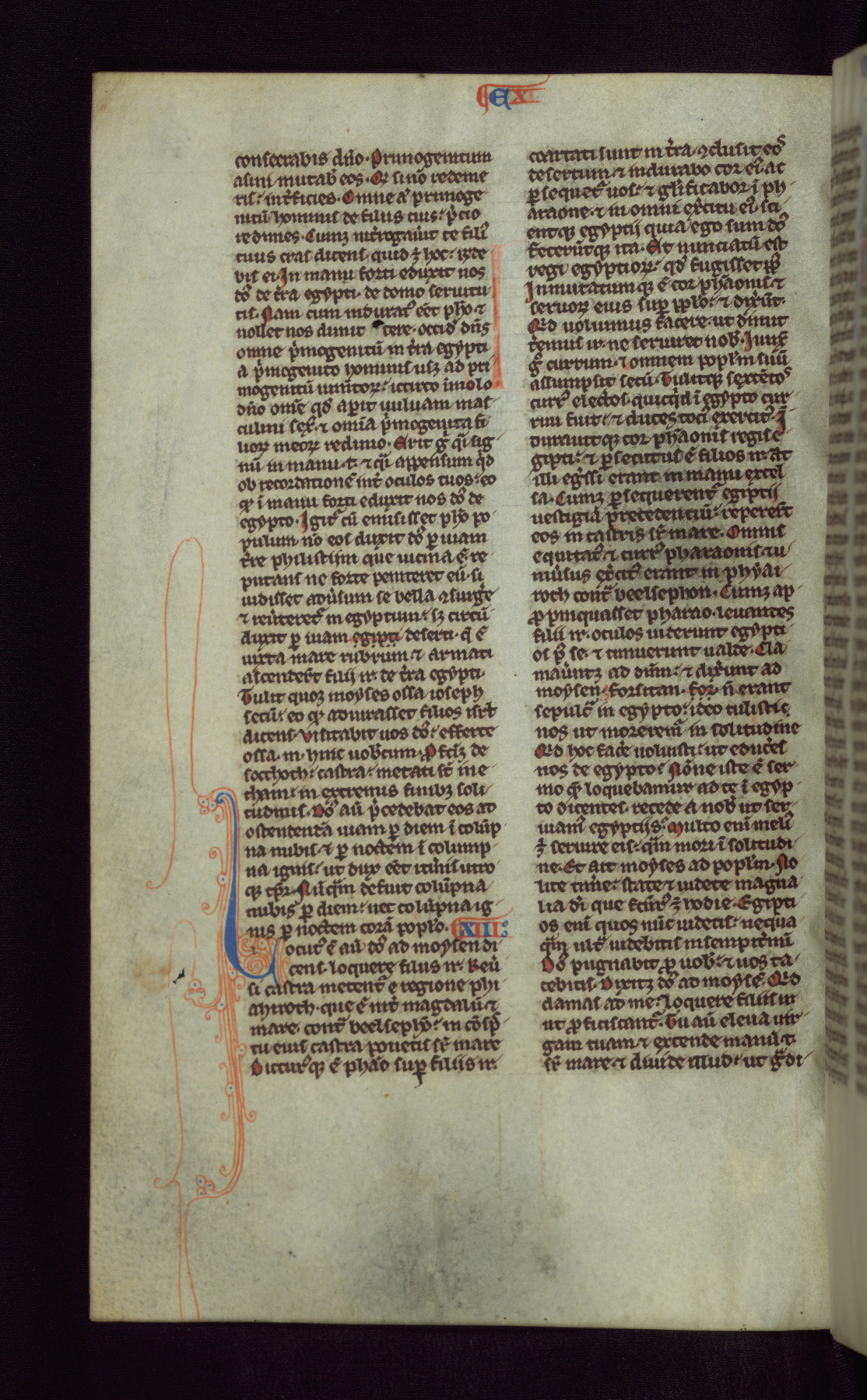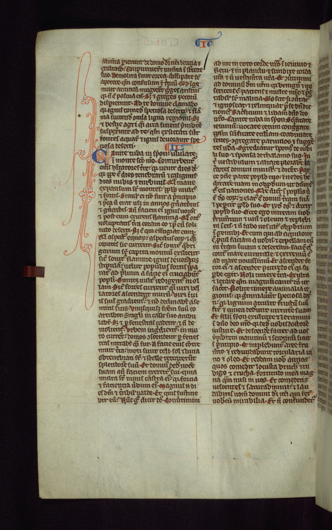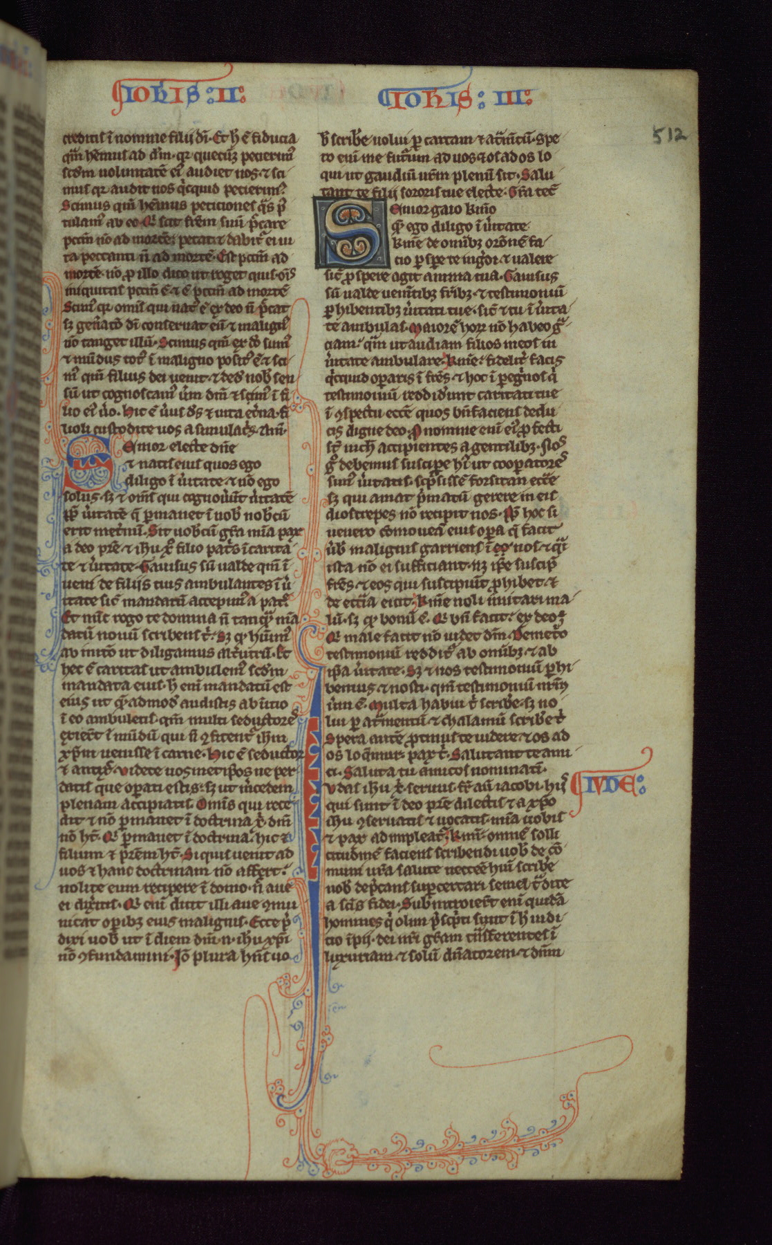 This pocket-size Bible was created around the middle of the thirteenth century in England. It contains the Vulgate text of the Old and New Testaments, arranged in order and divided into chapters. Such Bibles, designed for individual rather than institutional use, began to be created on a large scale during the thirteenth century, especially in Paris. This manuscript is illuminated with a large number of small historiated initials, and also includes a somewhat later image of the Three Living and the Three Dead, a popular scene based on a French poem of the same century.