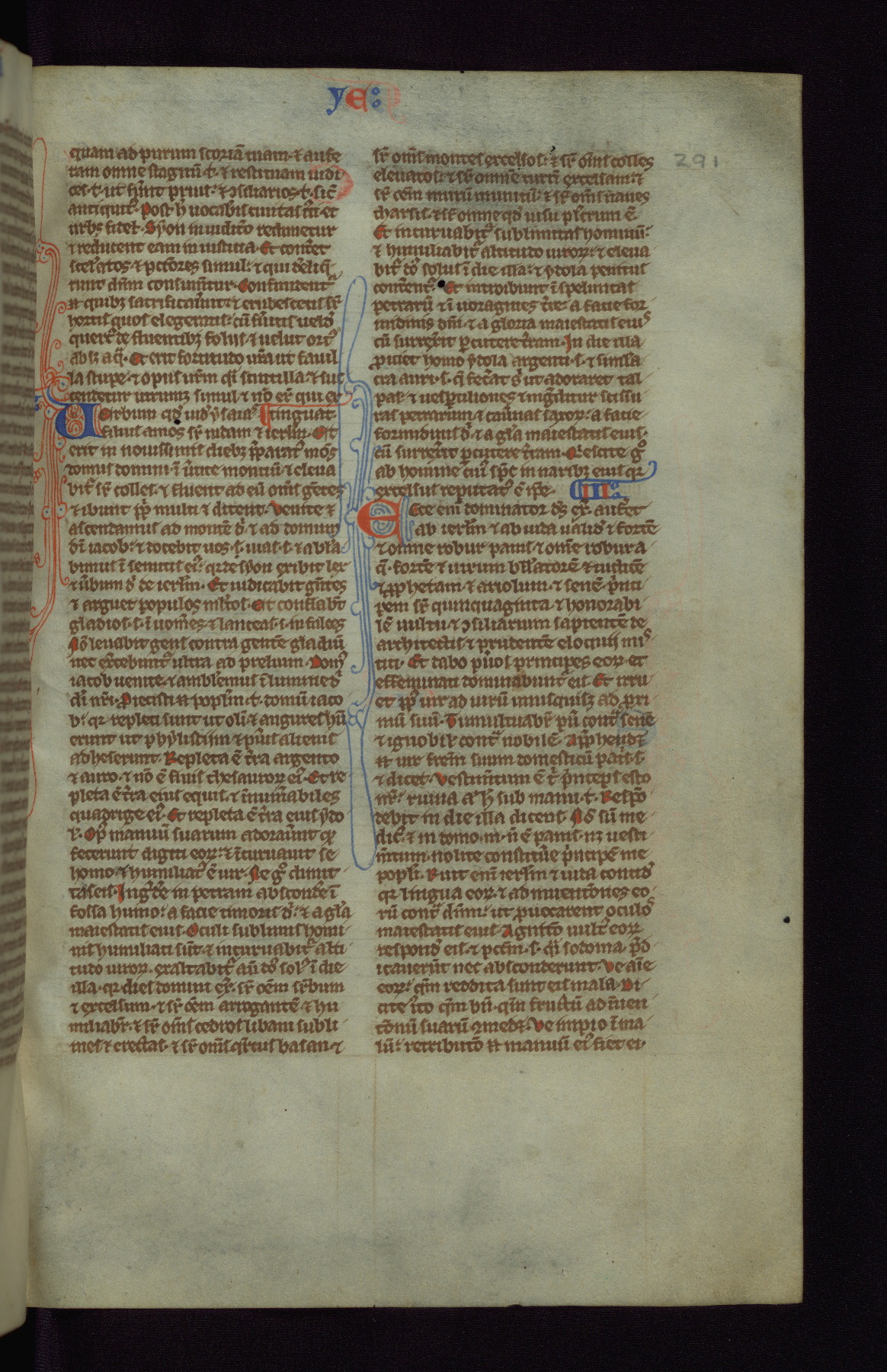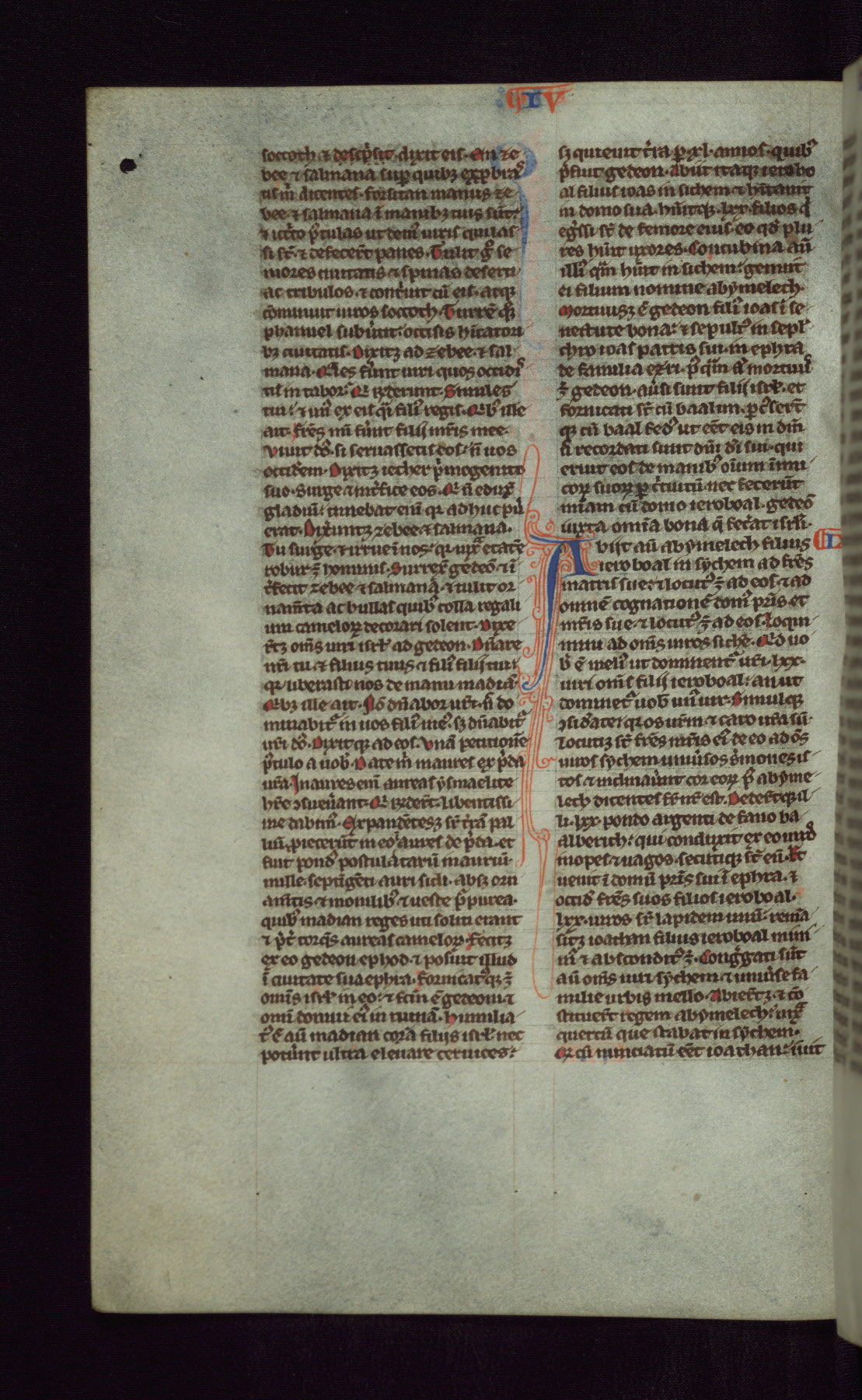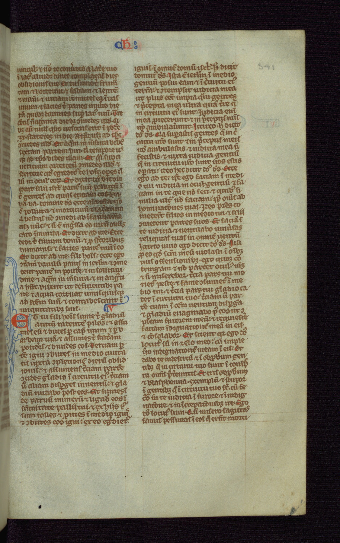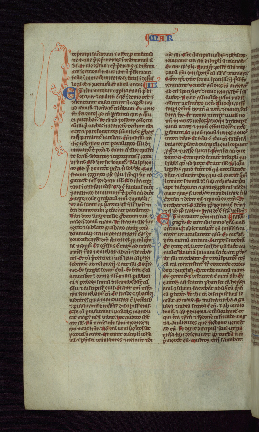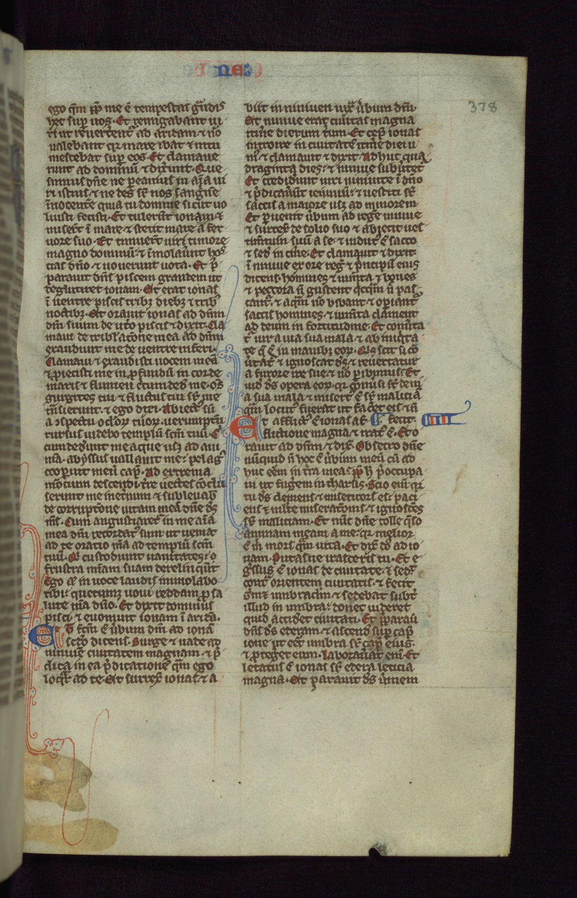 This pocket-size Bible was created around the middle of the thirteenth century in England. It contains the Vulgate text of the Old and New Testaments, arranged in order and divided into chapters. Such Bibles, designed for individual rather than institutional use, began to be created on a large scale during the thirteenth century, especially in Paris. This manuscript is illuminated with a large number of small historiated initials, and also includes a somewhat later image of the Three Living and the Three Dead, a popular scene based on a French poem of the same century.
