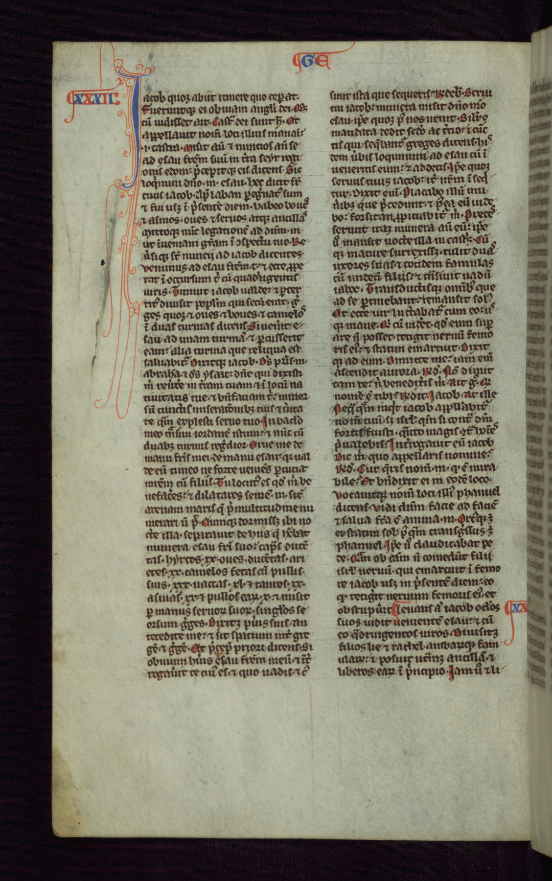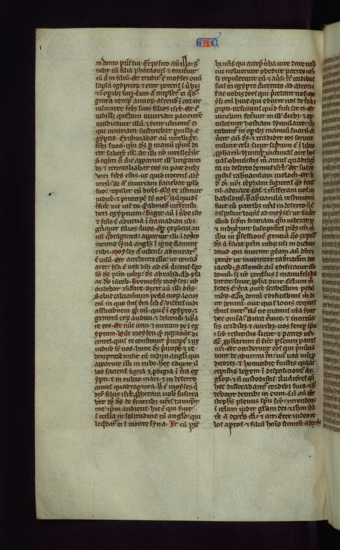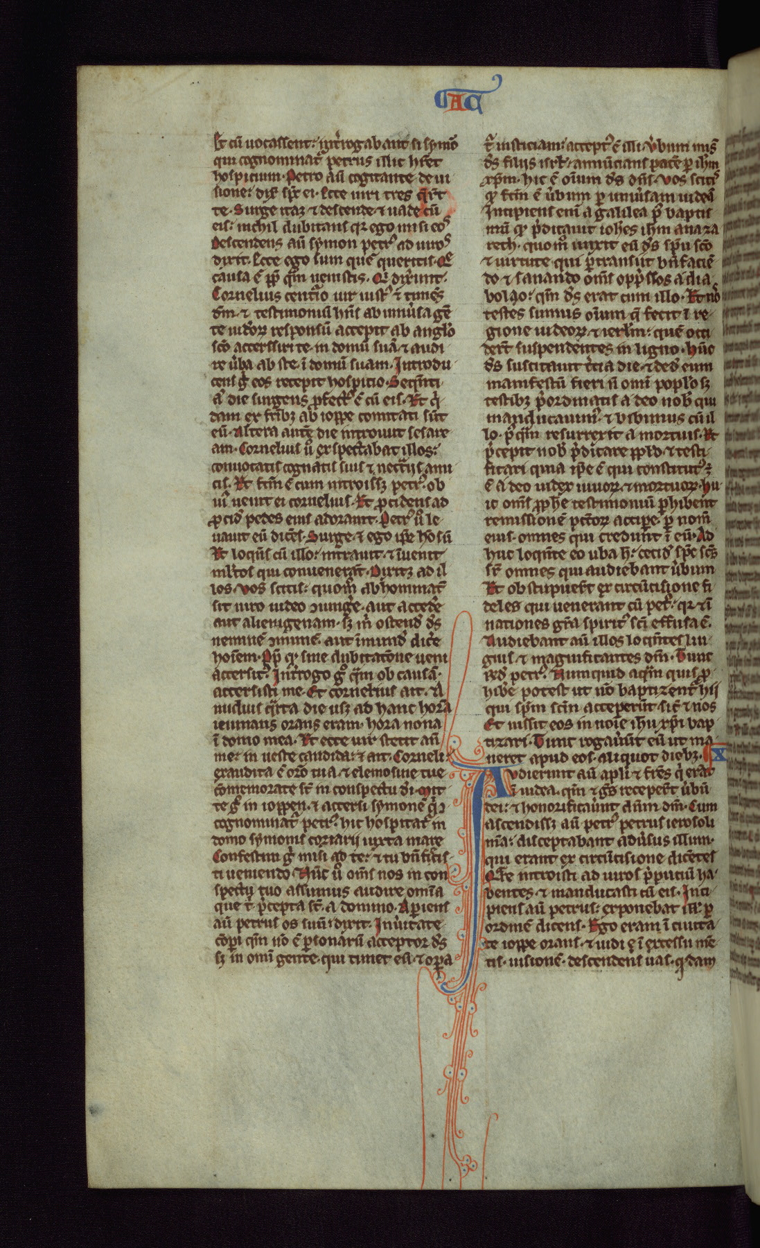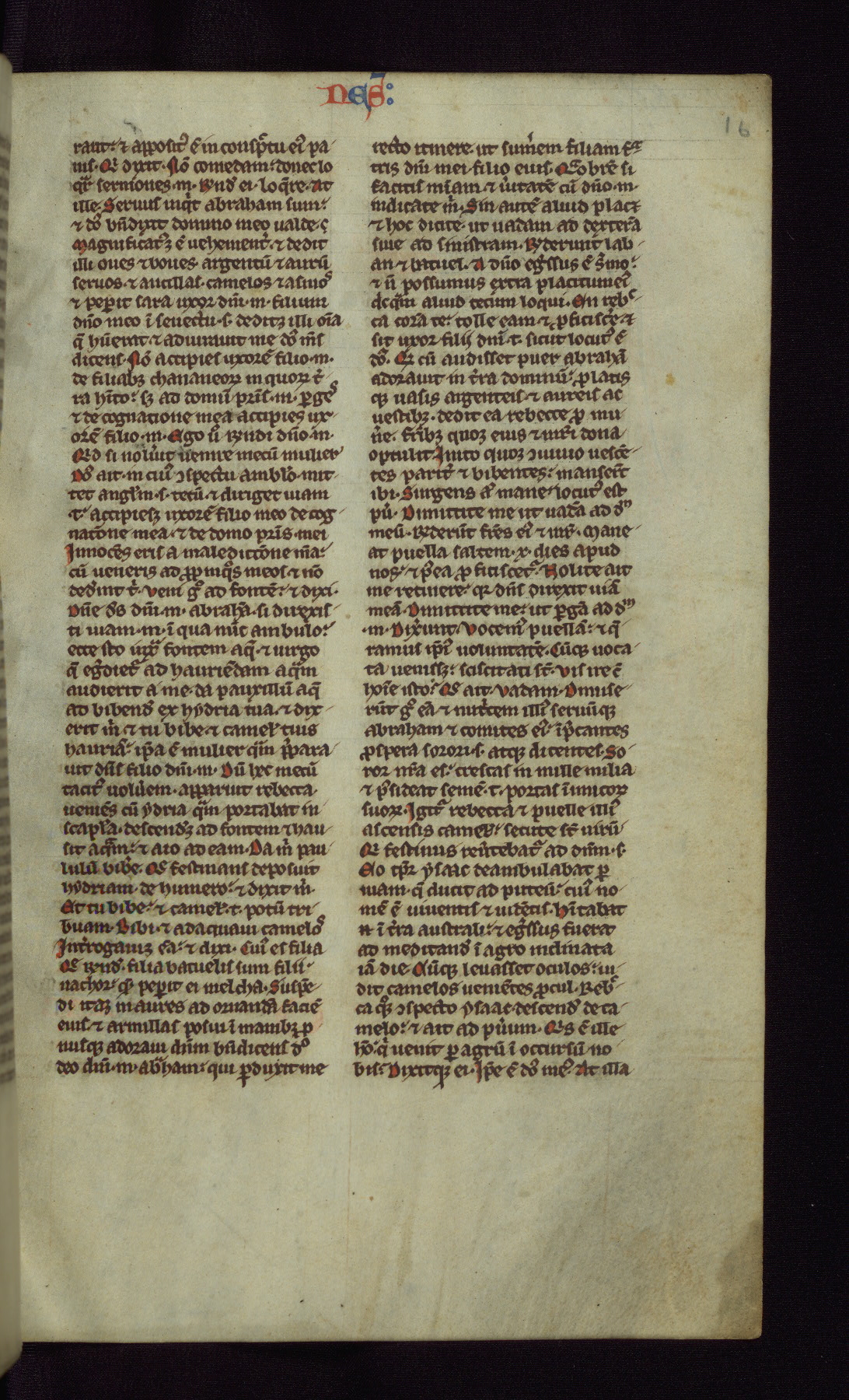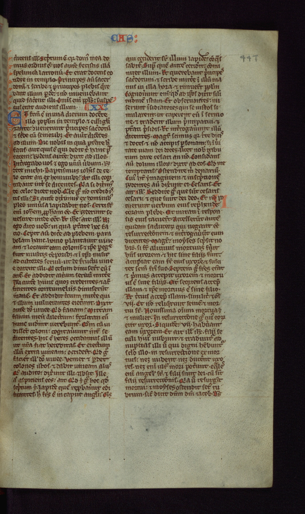 This pocket-size Bible was created around the middle of the thirteenth century in England. It contains the Vulgate text of the Old and New Testaments, arranged in order and divided into chapters. Such Bibles, designed for individual rather than institutional use, began to be created on a large scale during the thirteenth century, especially in Paris. This manuscript is illuminated with a large number of small historiated initials, and also includes a somewhat later image of the Three Living and the Three Dead, a popular scene based on a French poem of the same century.
