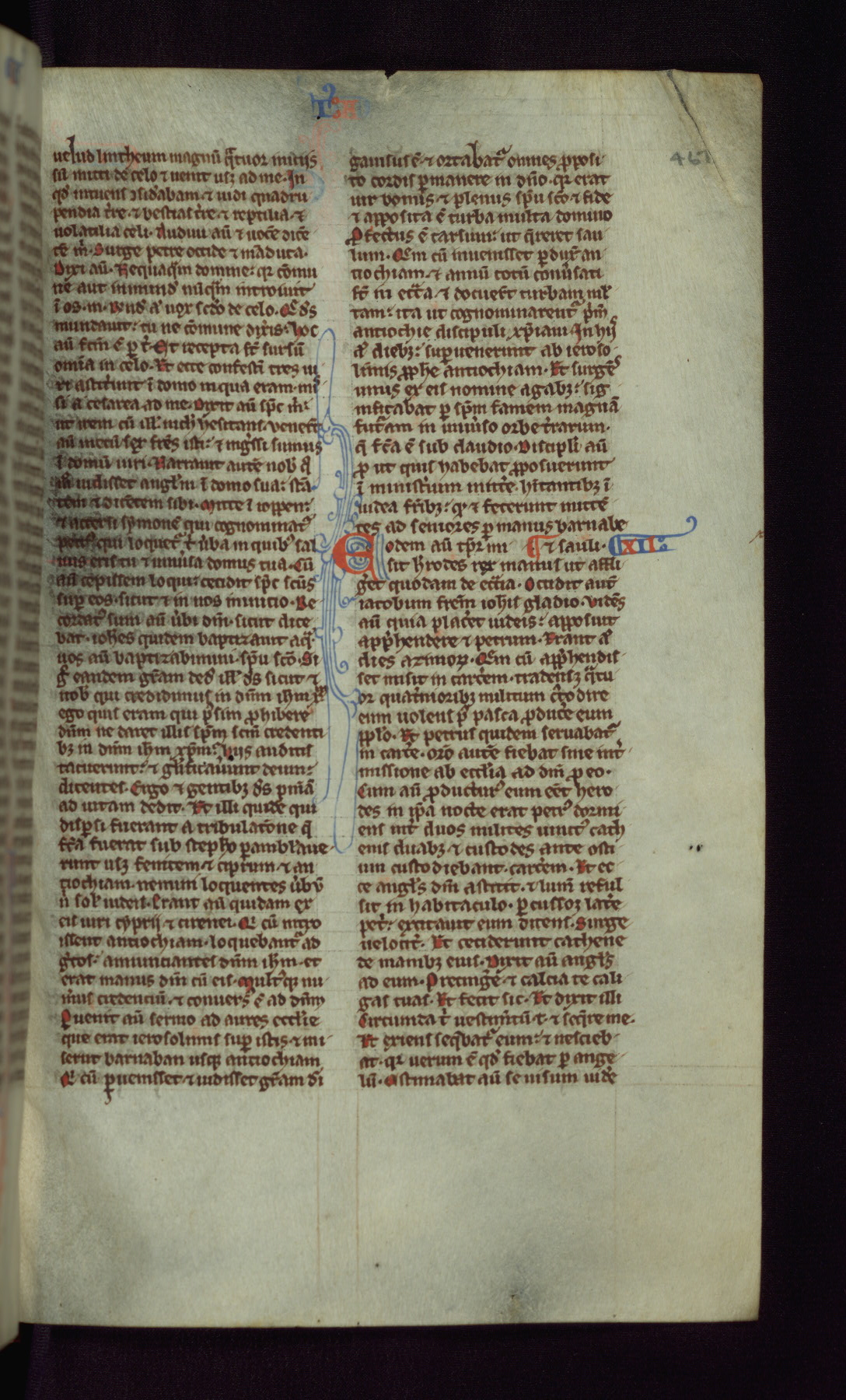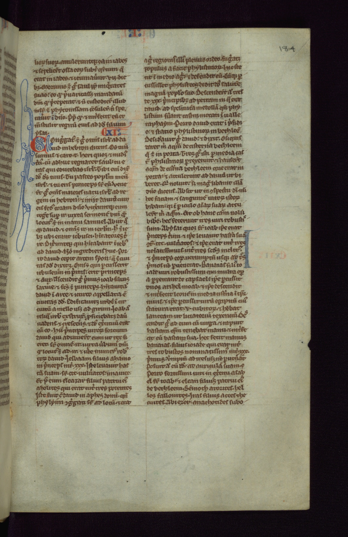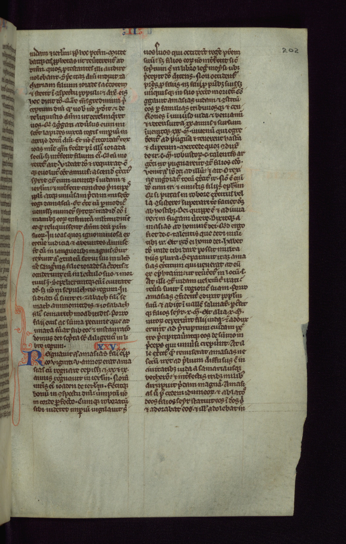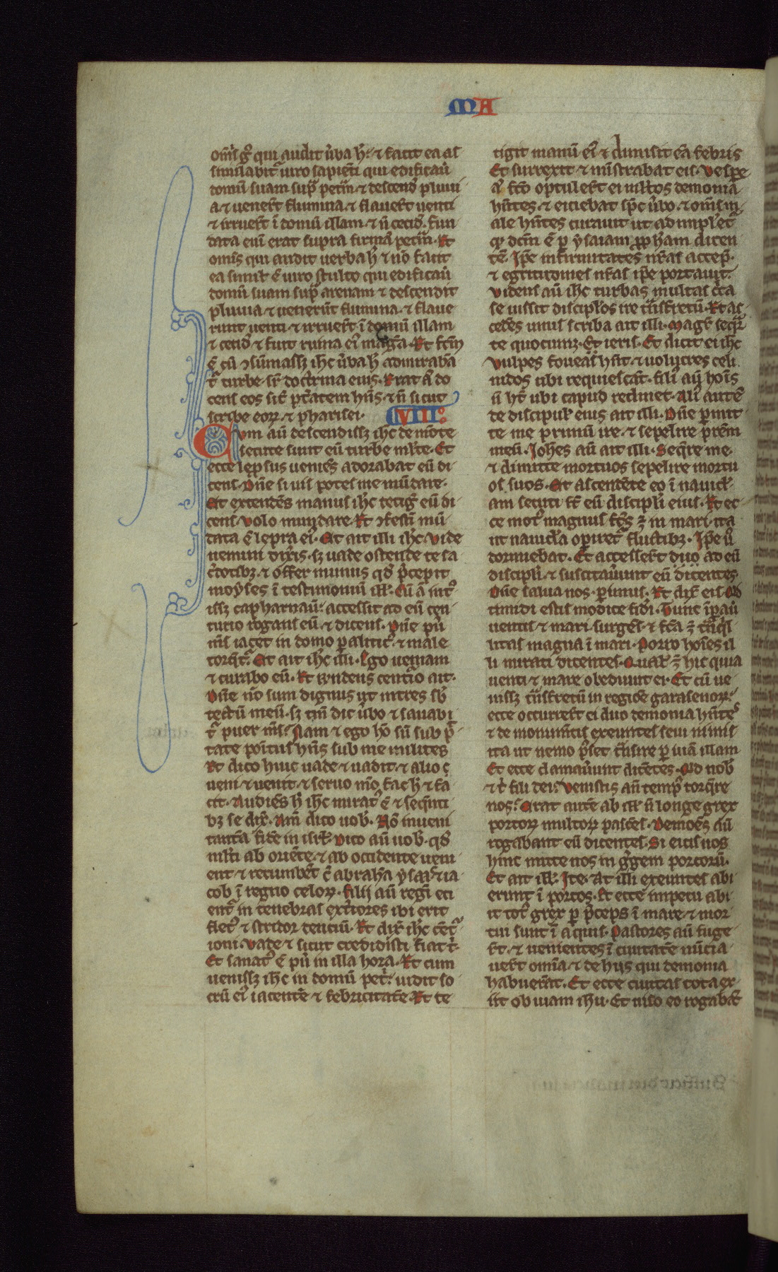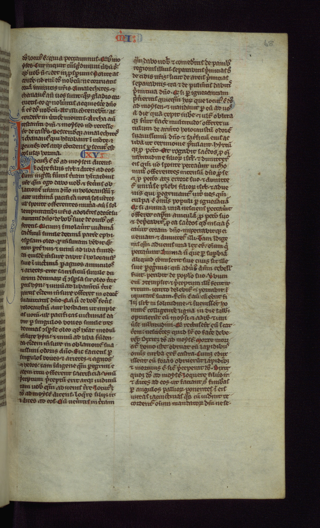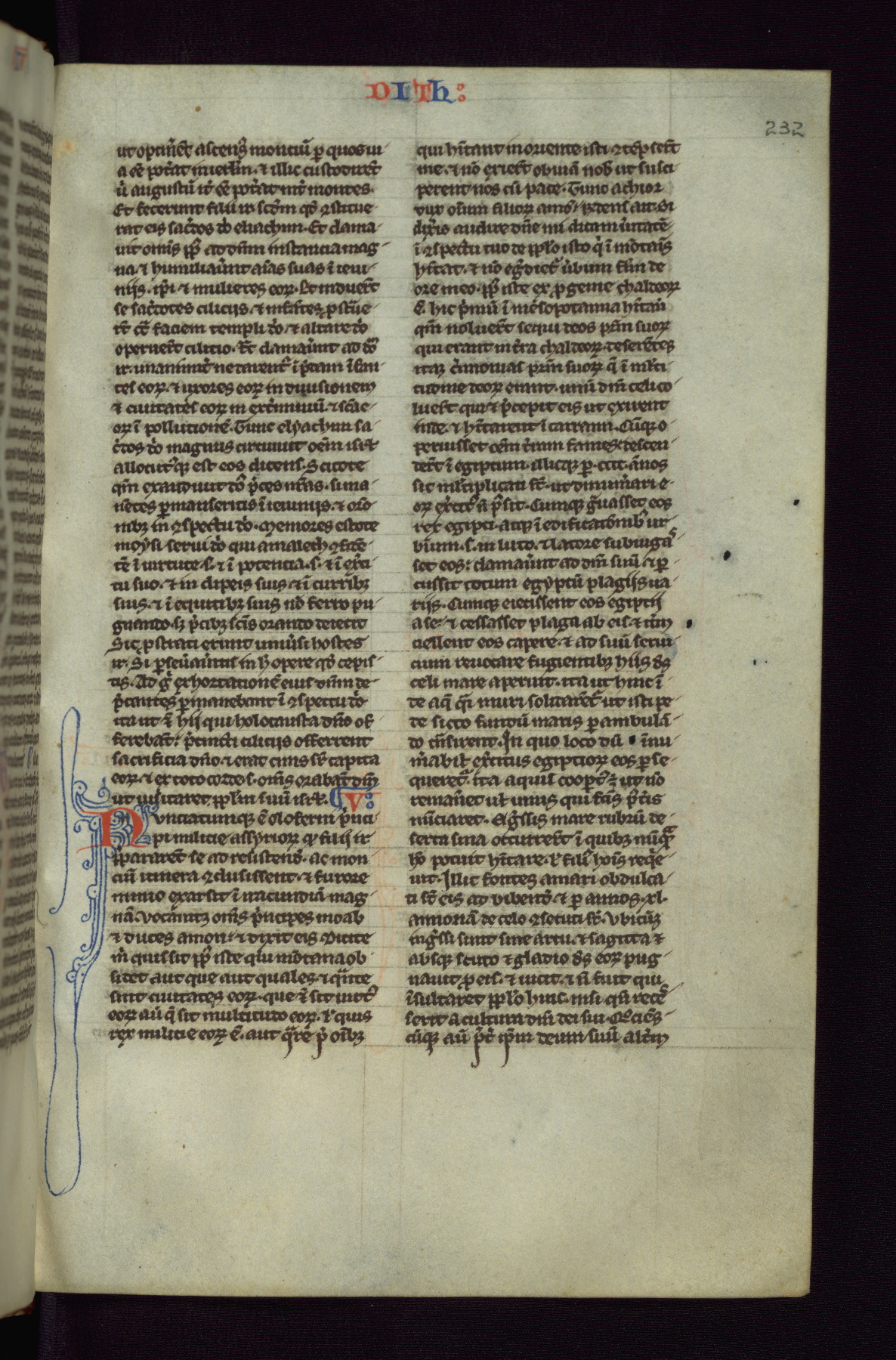 This pocket-size Bible was created around the middle of the thirteenth century in England. It contains the Vulgate text of the Old and New Testaments, arranged in order and divided into chapters. Such Bibles, designed for individual rather than institutional use, began to be created on a large scale during the thirteenth century, especially in Paris. This manuscript is illuminated with a large number of small historiated initials, and also includes a somewhat later image of the Three Living and the Three Dead, a popular scene based on a French poem of the same century.