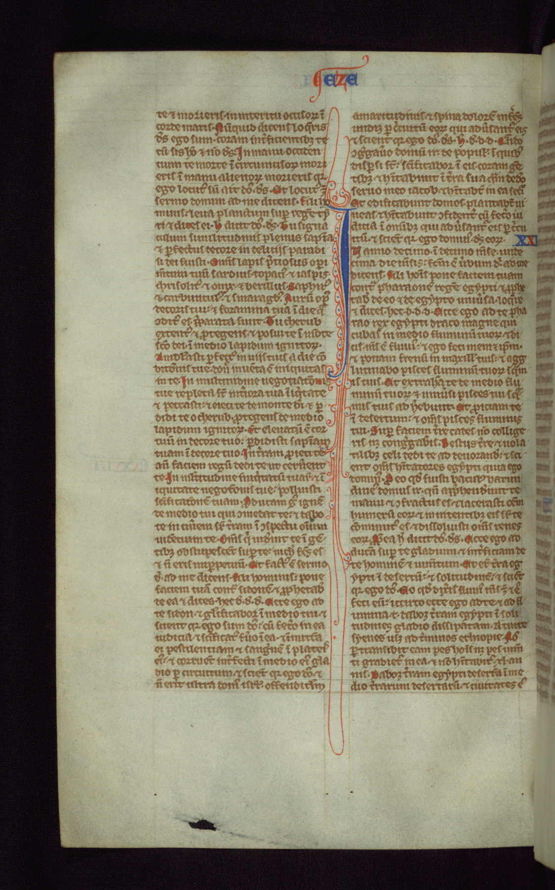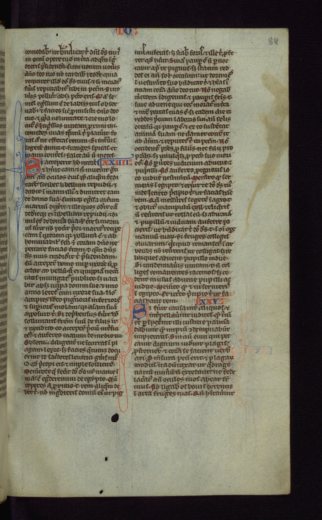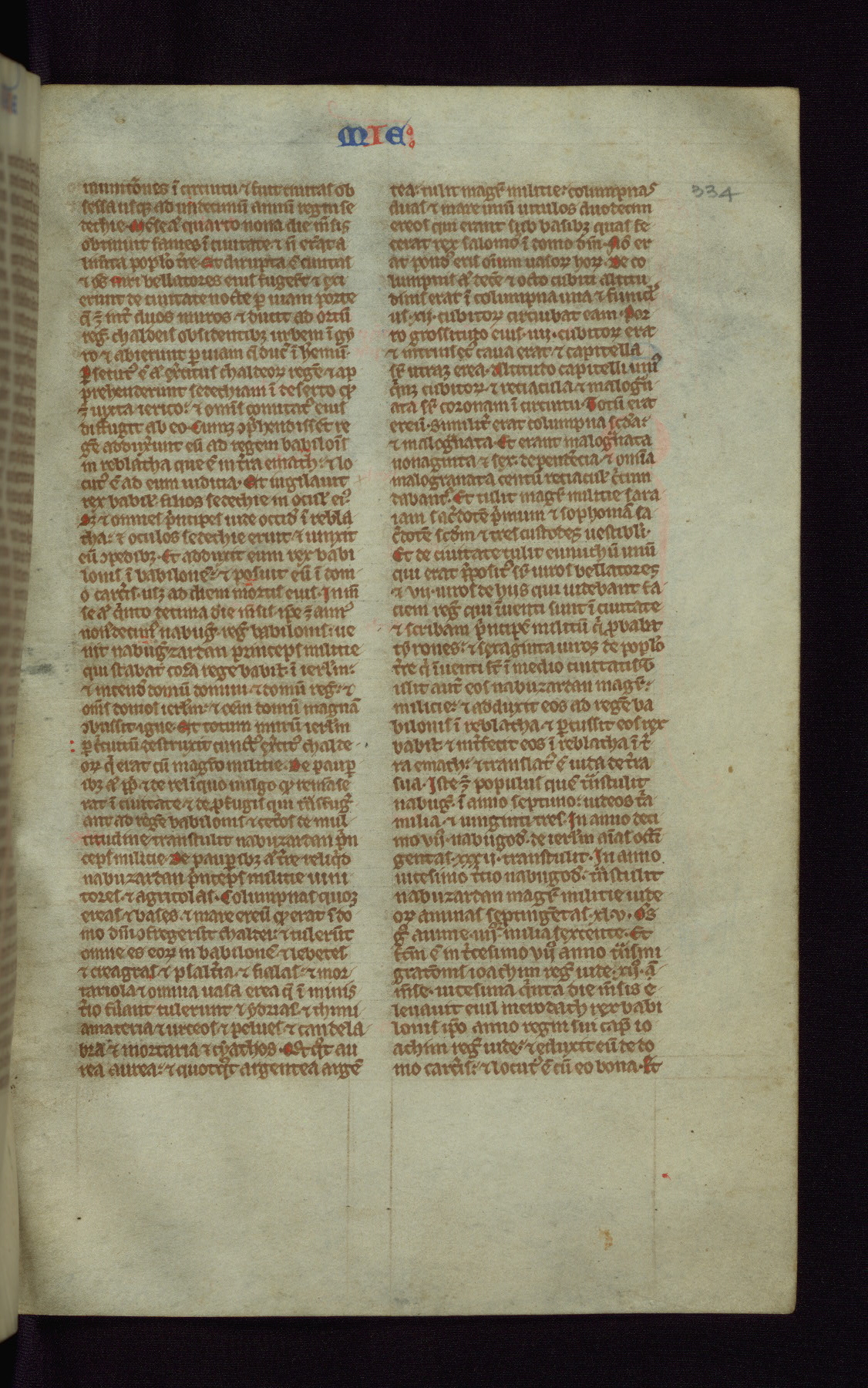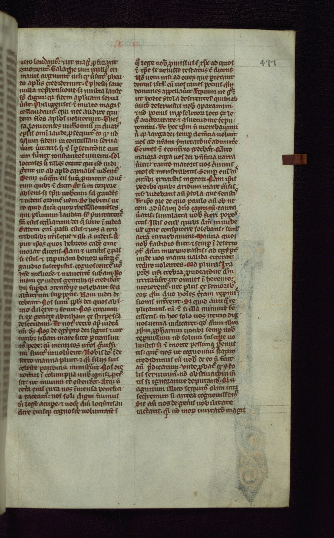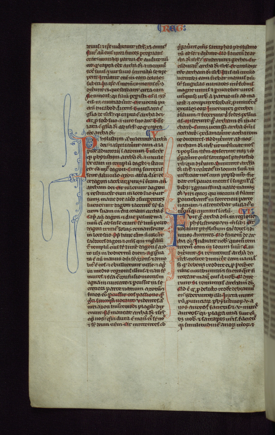 This pocket-size Bible was created around the middle of the thirteenth century in England. It contains the Vulgate text of the Old and New Testaments, arranged in order and divided into chapters. Such Bibles, designed for individual rather than institutional use, began to be created on a large scale during the thirteenth century, especially in Paris. This manuscript is illuminated with a large number of small historiated initials, and also includes a somewhat later image of the Three Living and the Three Dead, a popular scene based on a French poem of the same century.