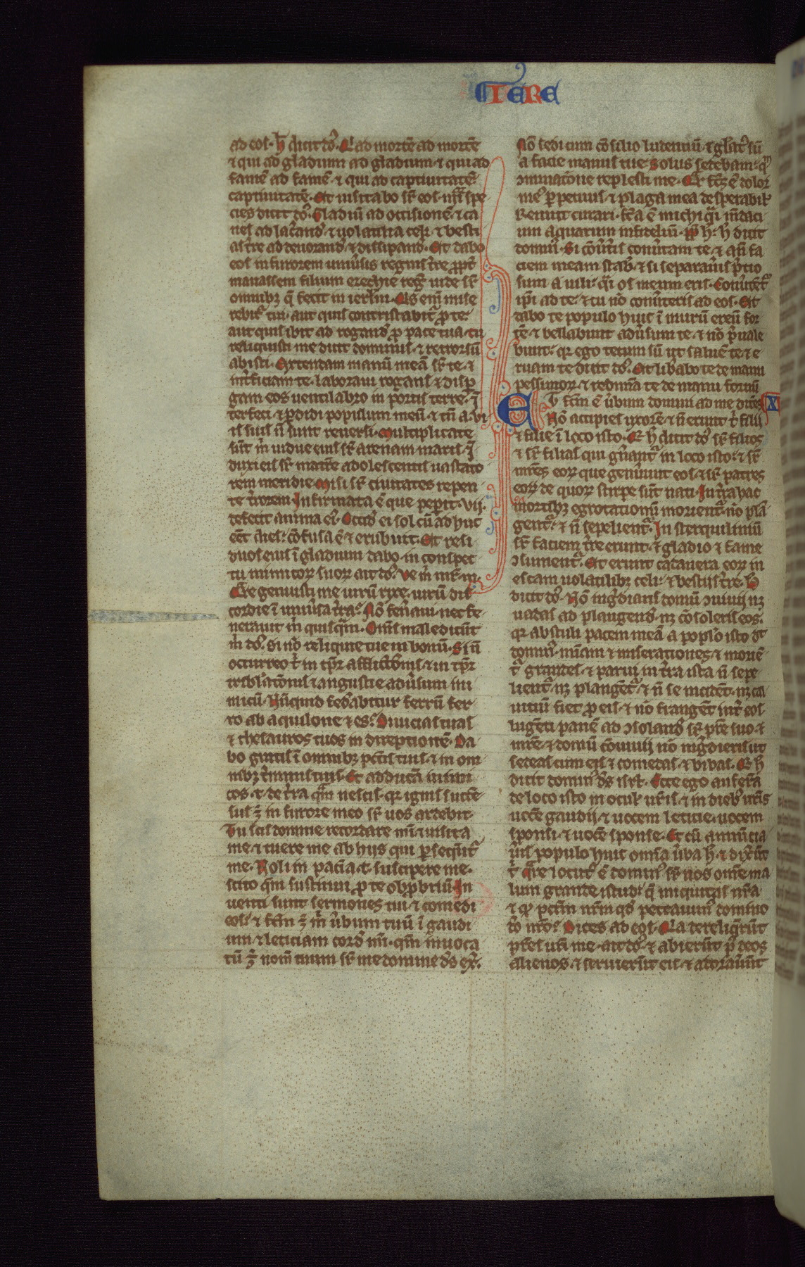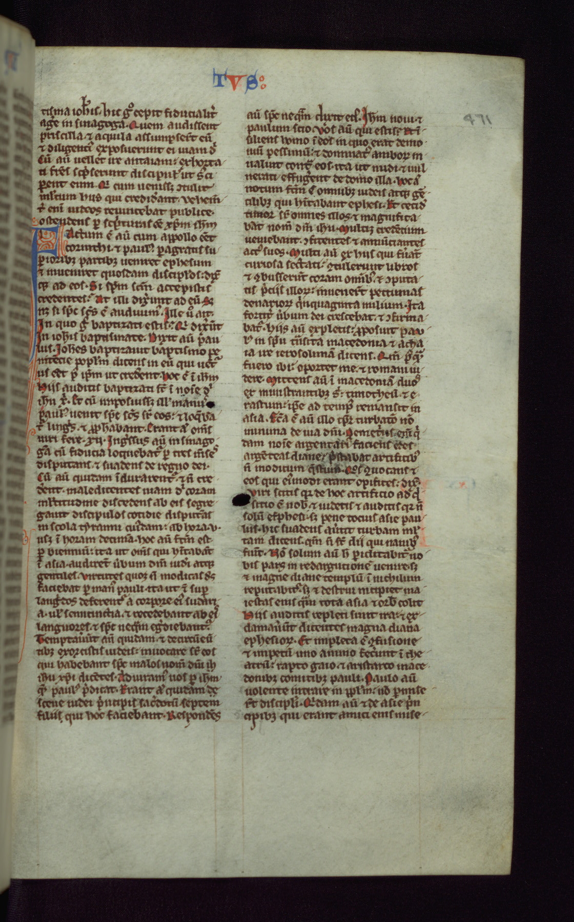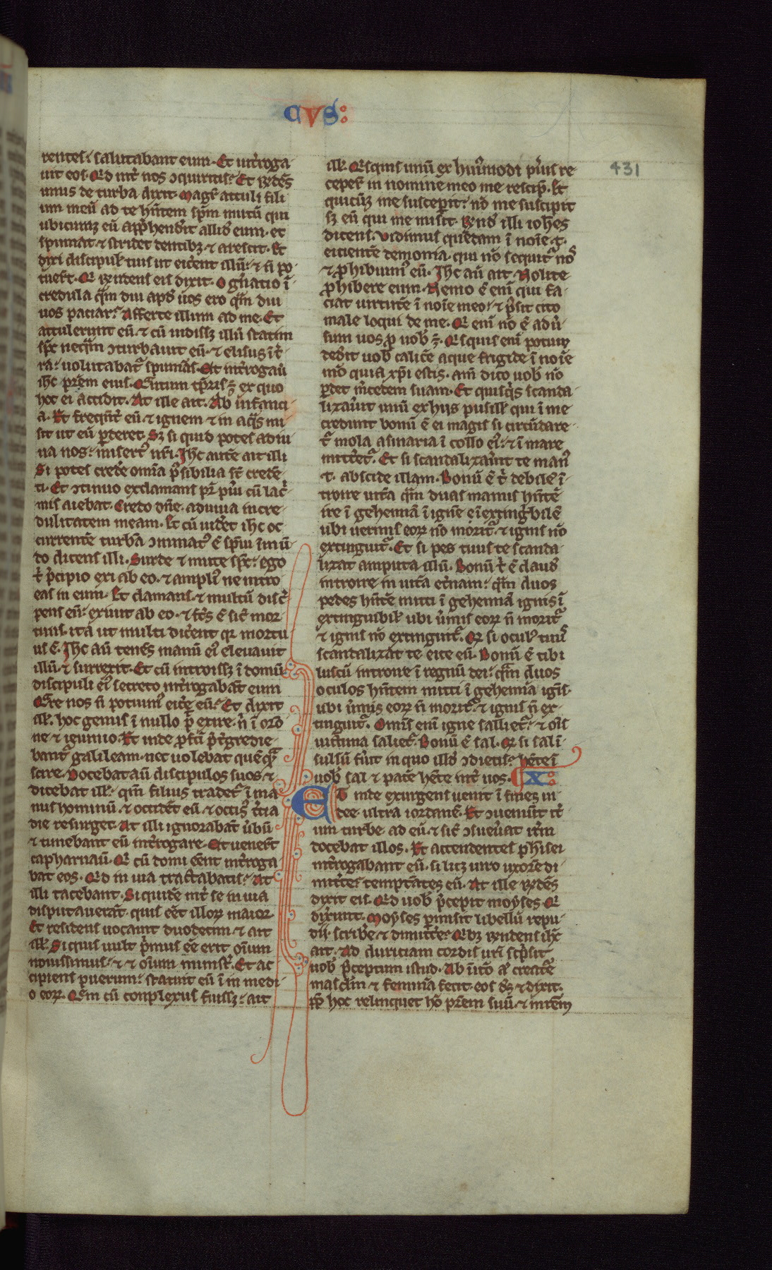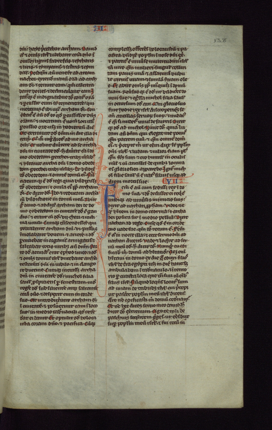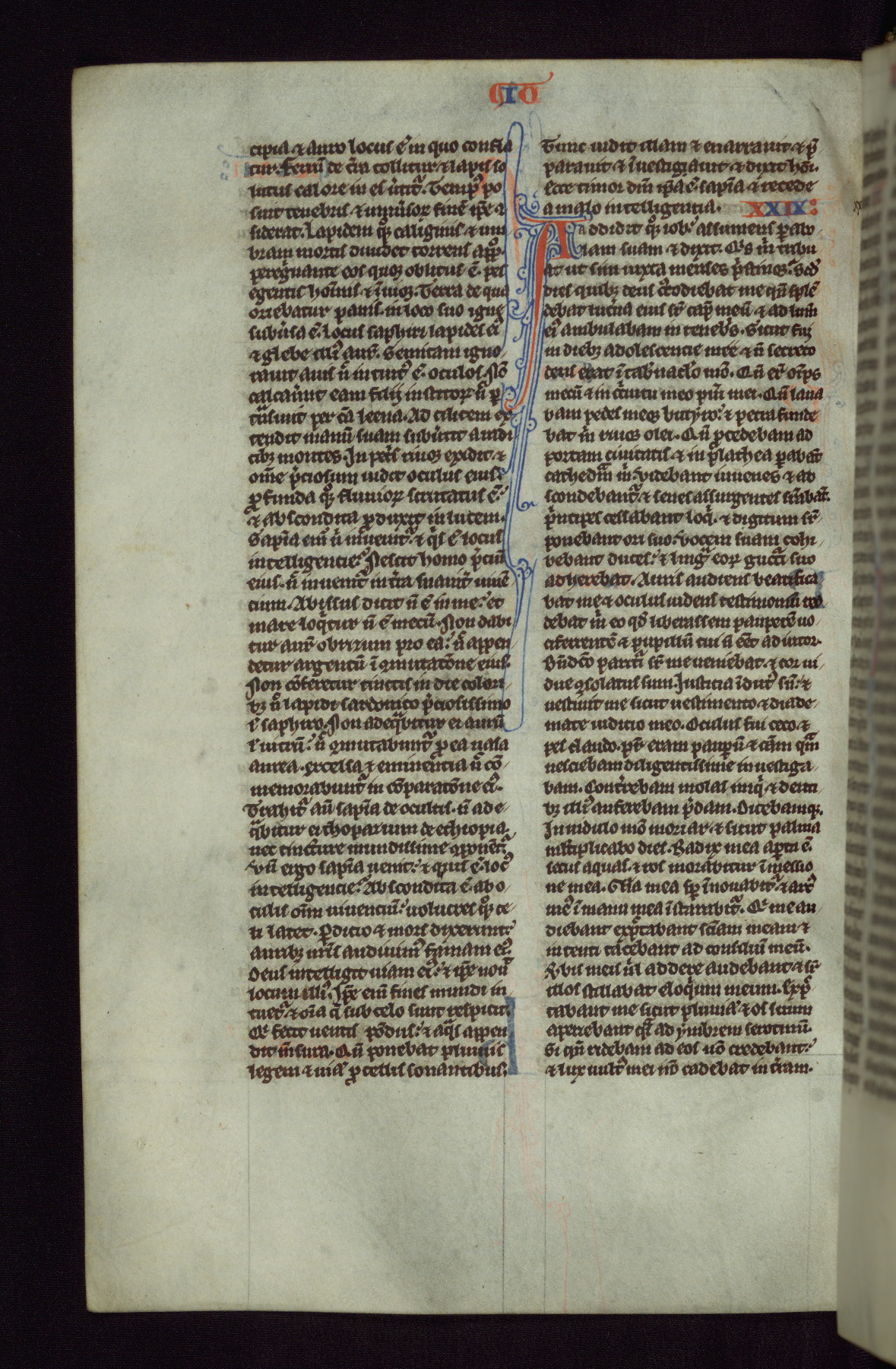 This pocket-size Bible was created around the middle of the thirteenth century in England. It contains the Vulgate text of the Old and New Testaments, arranged in order and divided into chapters. Such Bibles, designed for individual rather than institutional use, began to be created on a large scale during the thirteenth century, especially in Paris. This manuscript is illuminated with a large number of small historiated initials, and also includes a somewhat later image of the Three Living and the Three Dead, a popular scene based on a French poem of the same century.