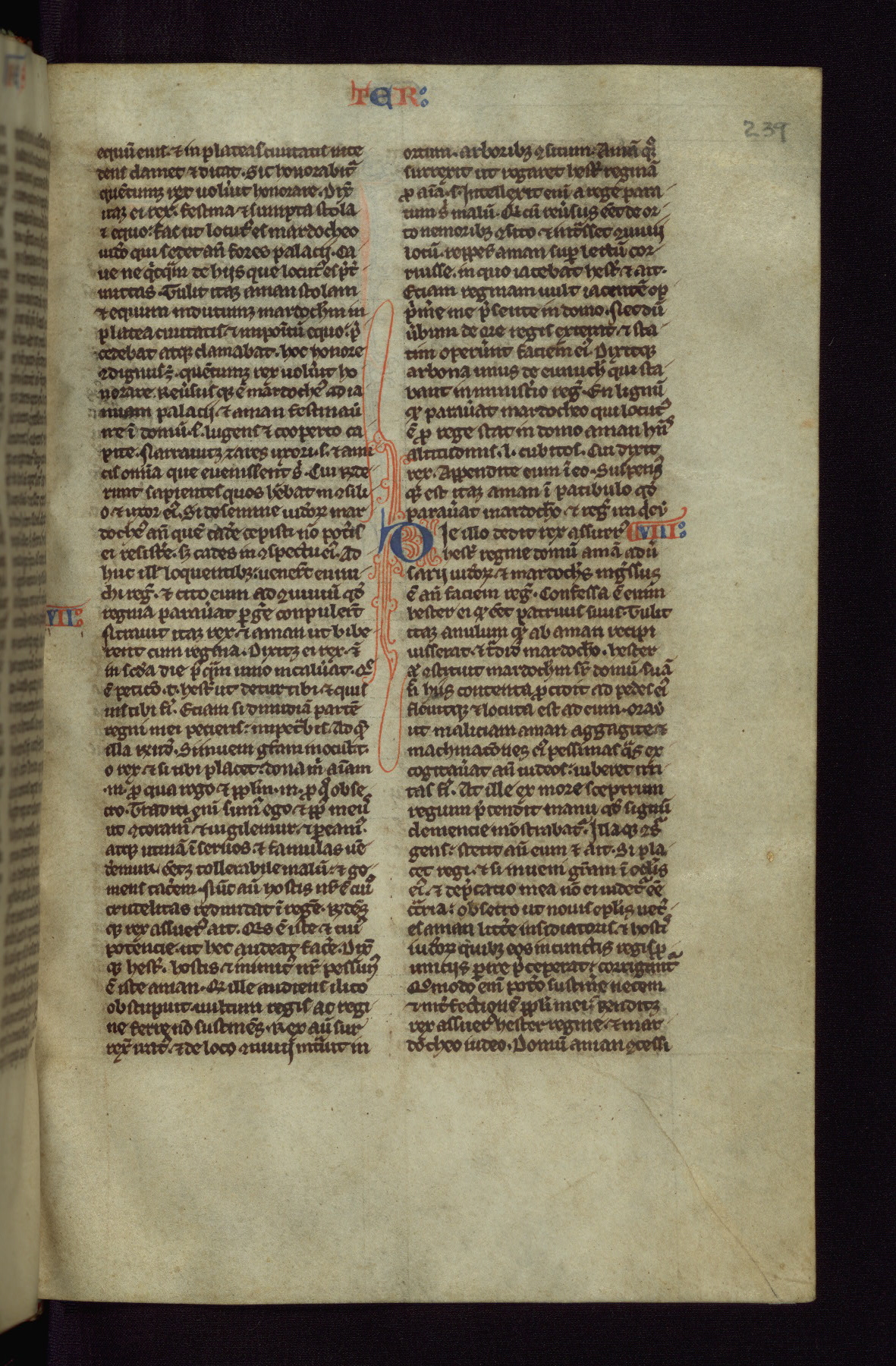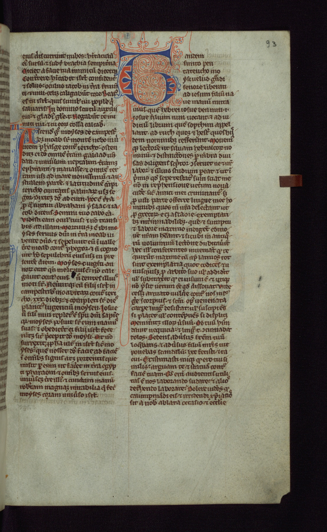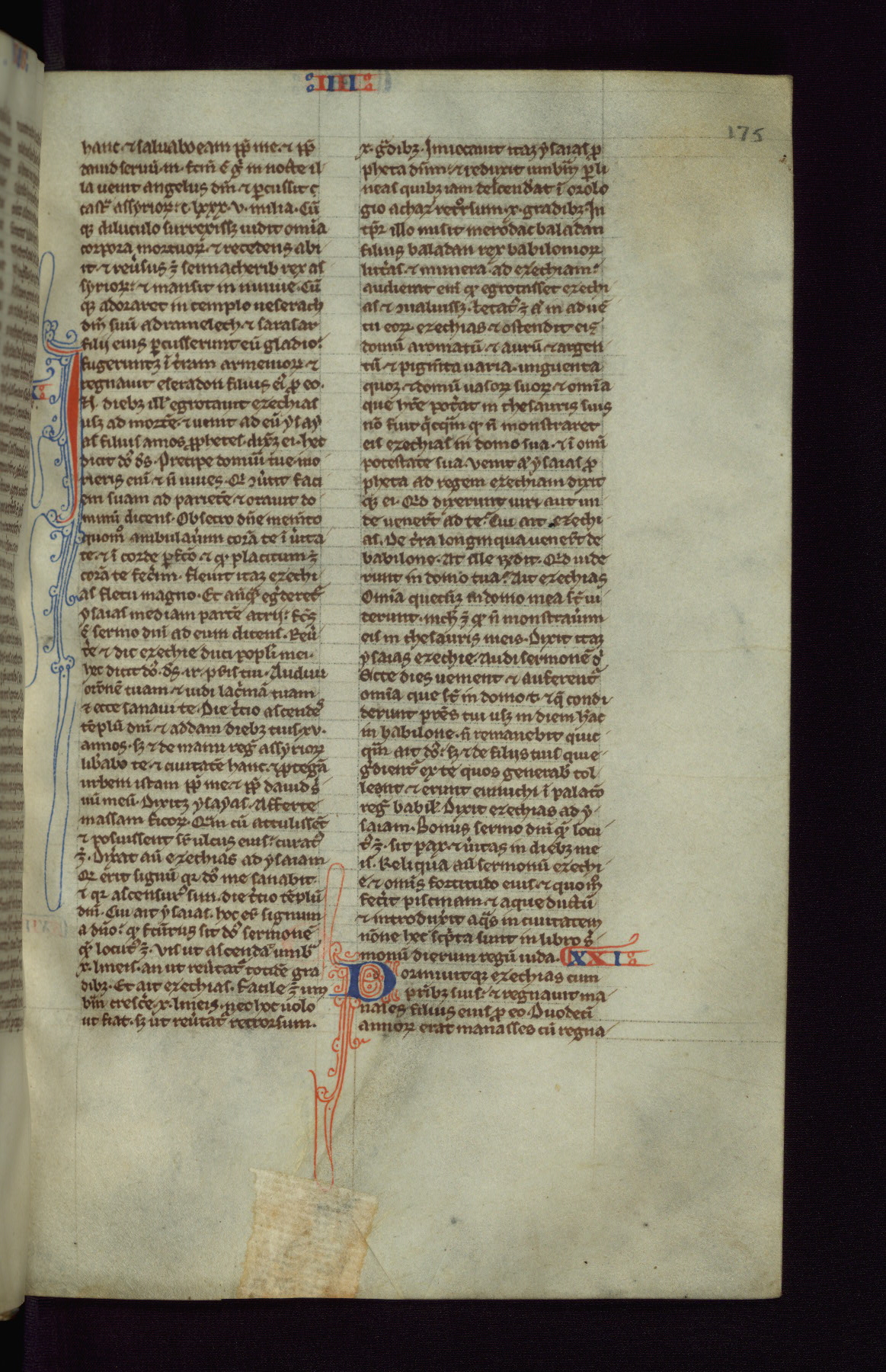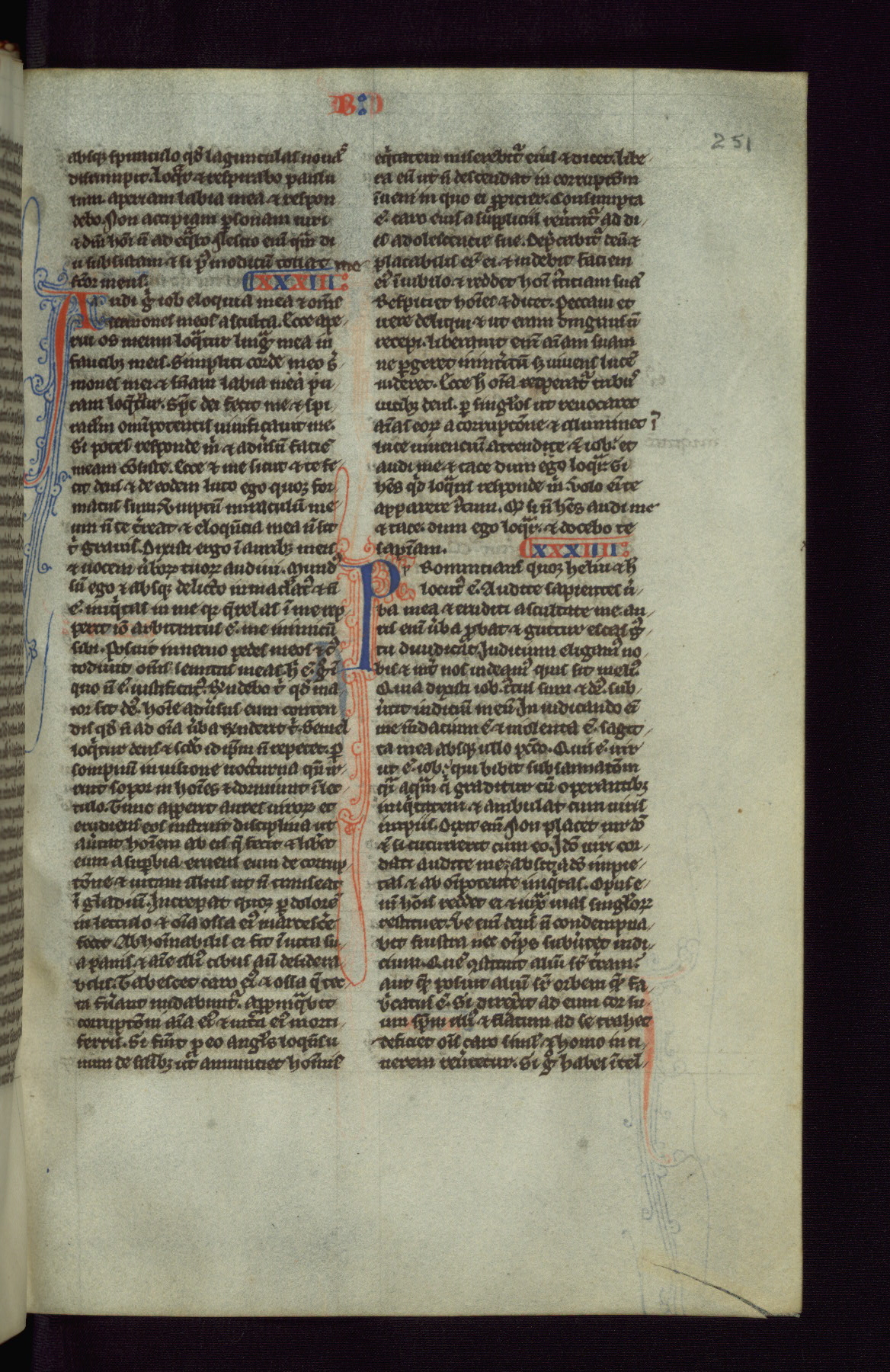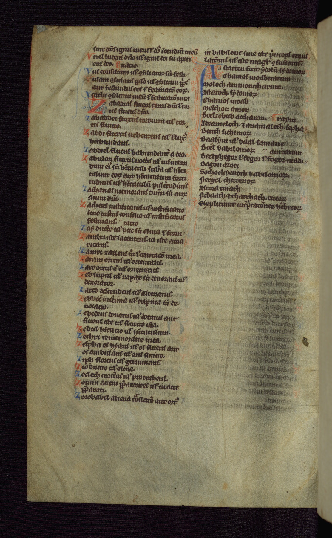 This pocket-size Bible was created around the middle of the thirteenth century in England. It contains the Vulgate text of the Old and New Testaments, arranged in order and divided into chapters. Such Bibles, designed for individual rather than institutional use, began to be created on a large scale during the thirteenth century, especially in Paris. This manuscript is illuminated with a large number of small historiated initials, and also includes a somewhat later image of the Three Living and the Three Dead, a popular scene based on a French poem of the same century.