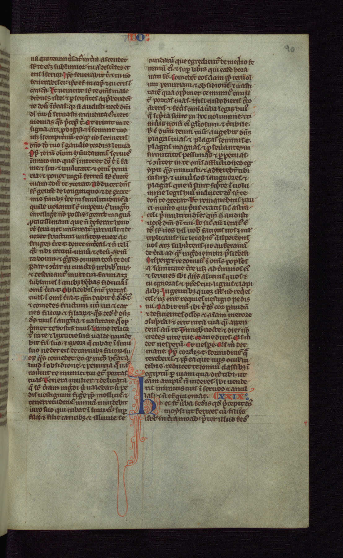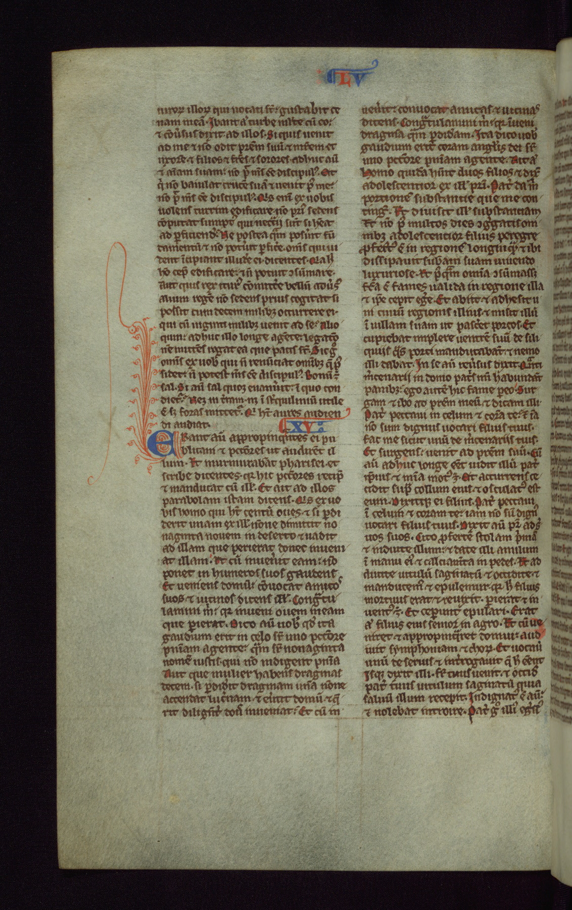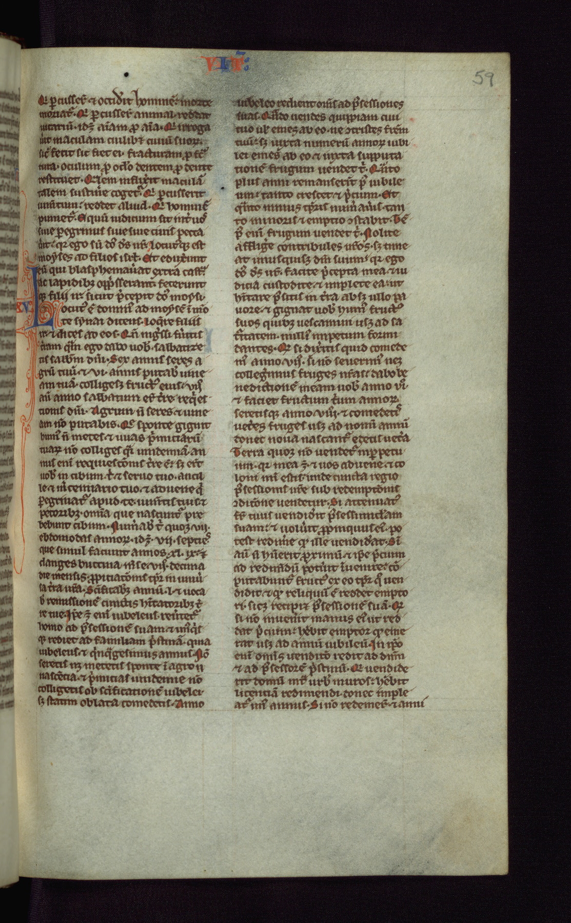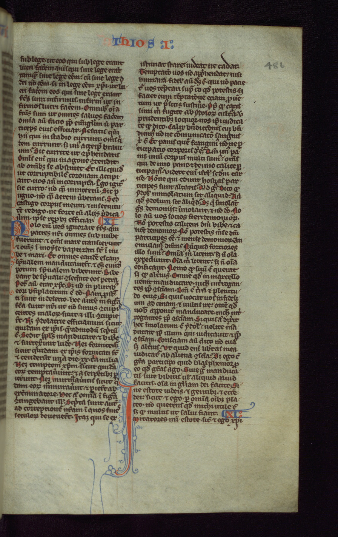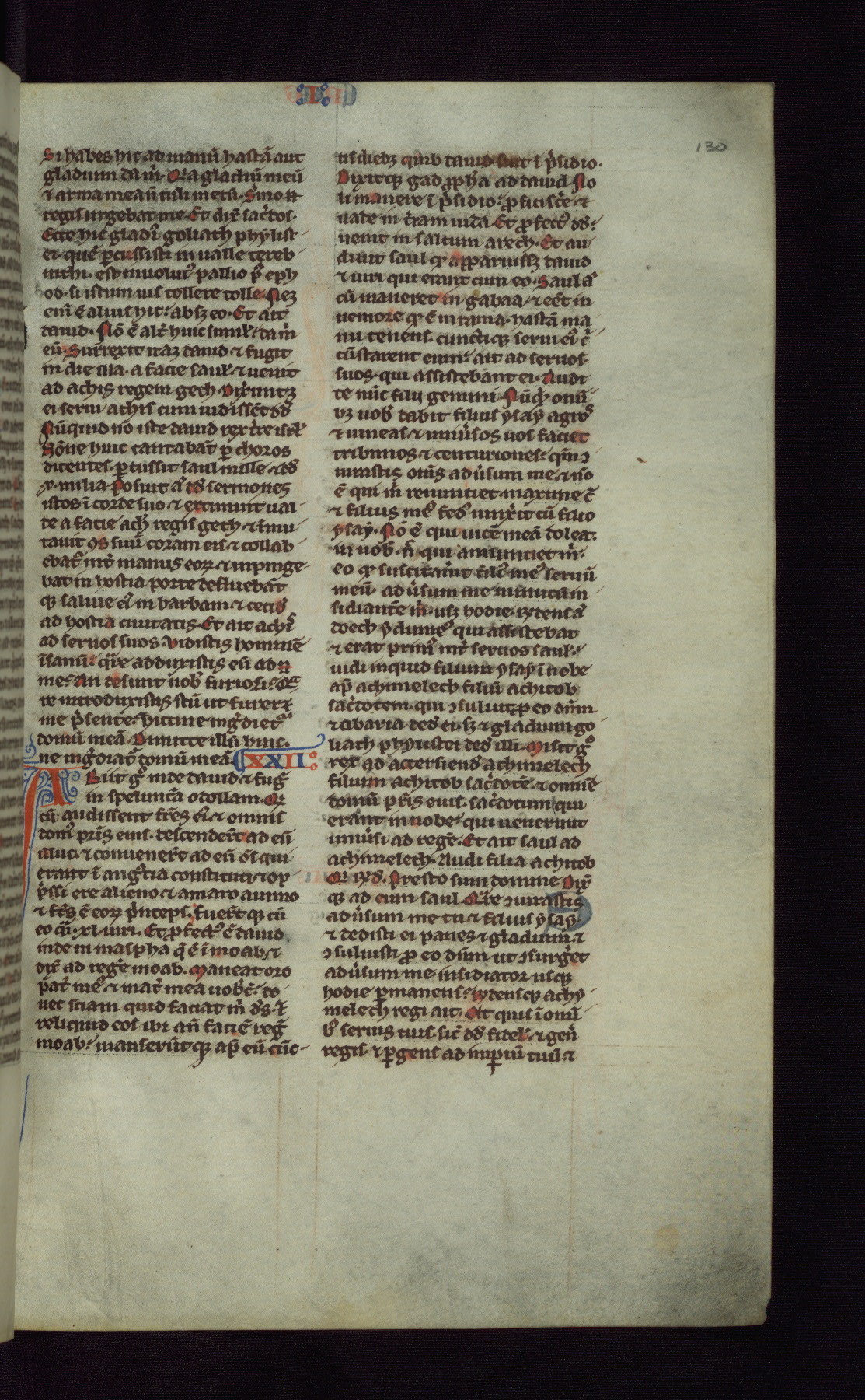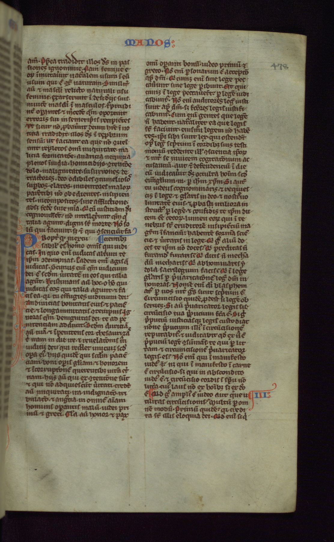 This pocket-size Bible was created around the middle of the thirteenth century in England. It contains the Vulgate text of the Old and New Testaments, arranged in order and divided into chapters. Such Bibles, designed for individual rather than institutional use, began to be created on a large scale during the thirteenth century, especially in Paris. This manuscript is illuminated with a large number of small historiated initials, and also includes a somewhat later image of the Three Living and the Three Dead, a popular scene based on a French poem of the same century.