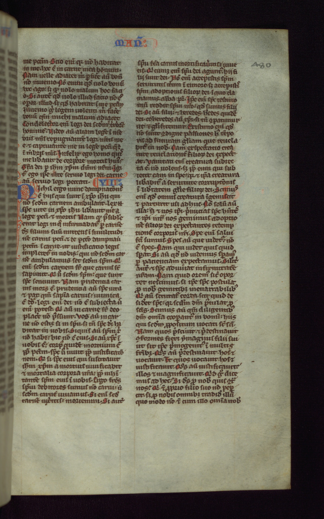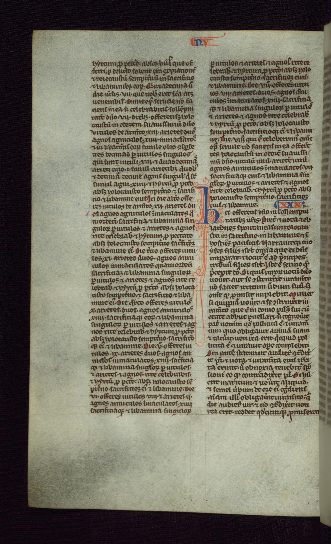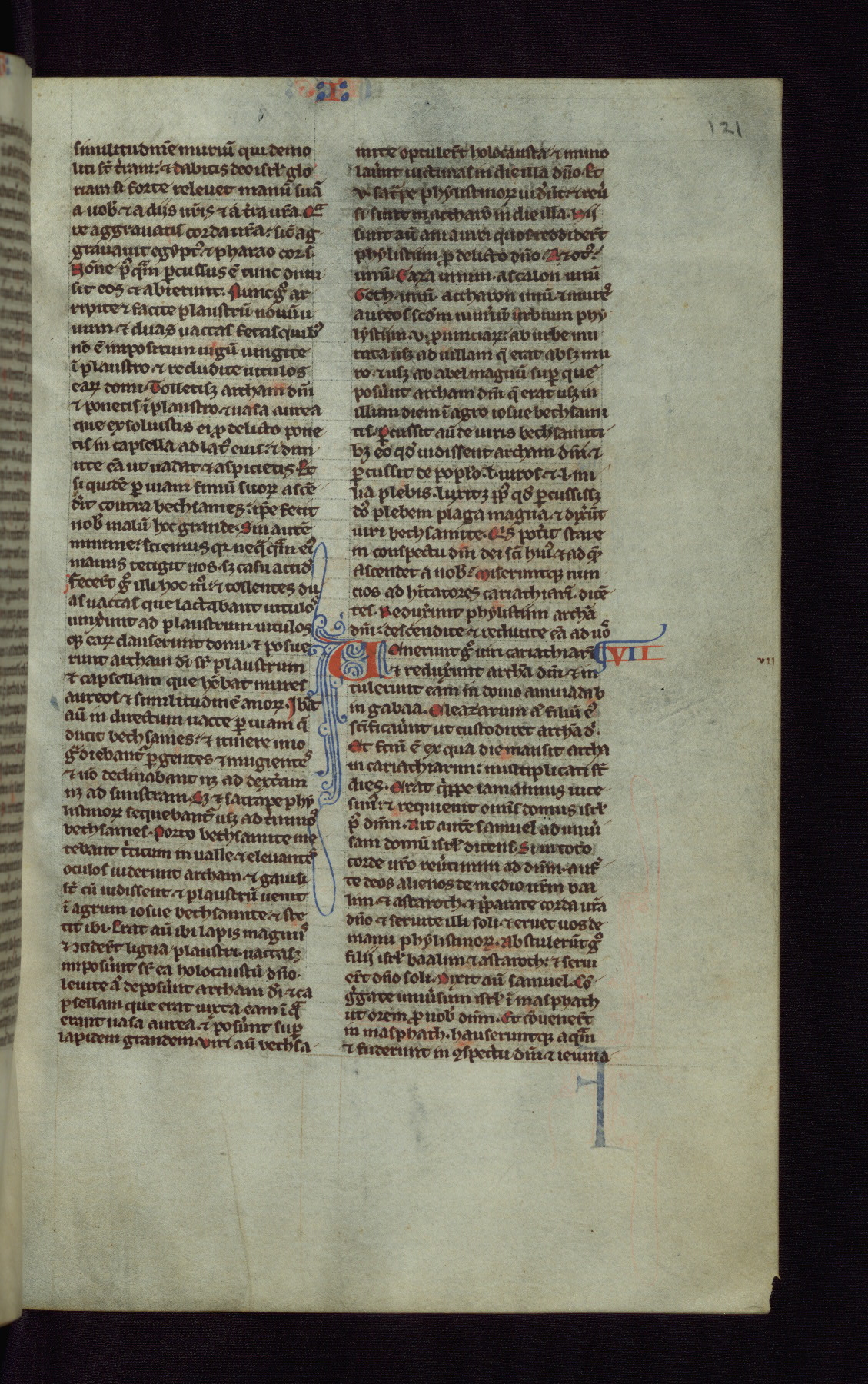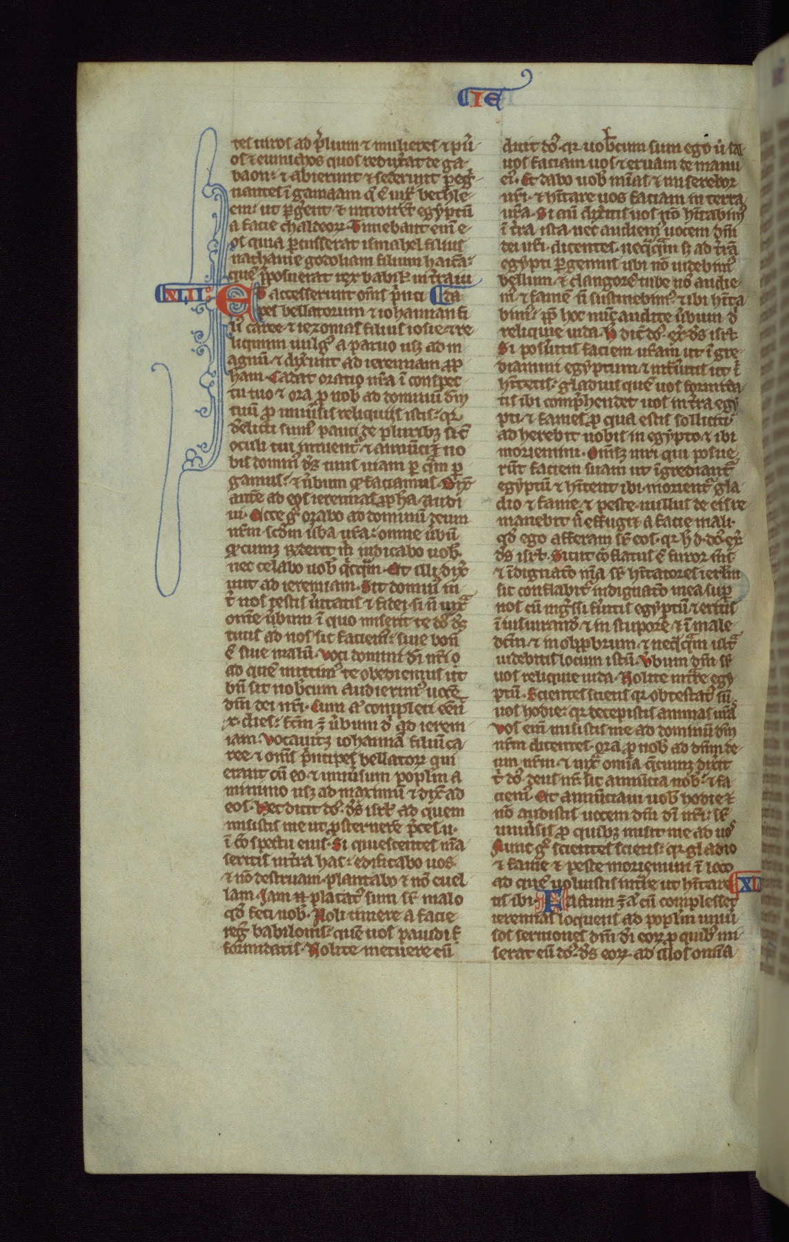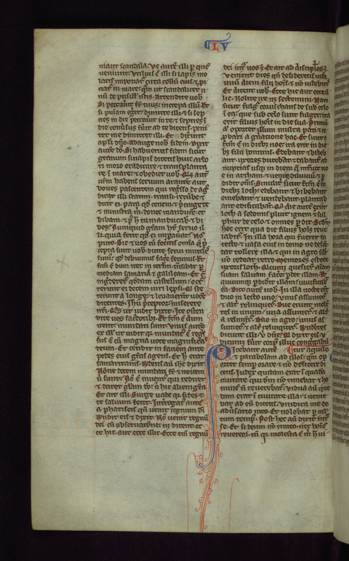 This pocket-size Bible was created around the middle of the thirteenth century in England. It contains the Vulgate text of the Old and New Testaments, arranged in order and divided into chapters. Such Bibles, designed for individual rather than institutional use, began to be created on a large scale during the thirteenth century, especially in Paris. This manuscript is illuminated with a large number of small historiated initials, and also includes a somewhat later image of the Three Living and the Three Dead, a popular scene based on a French poem of the same century.