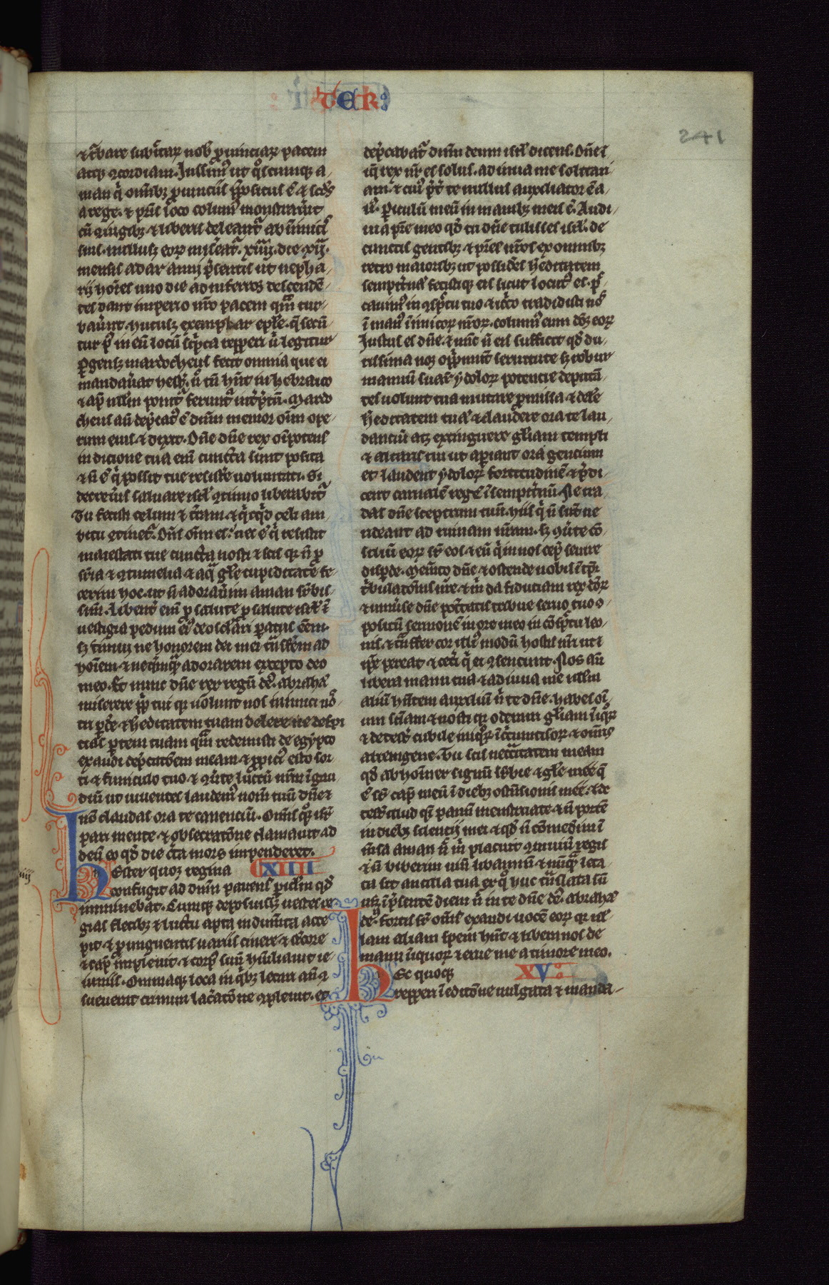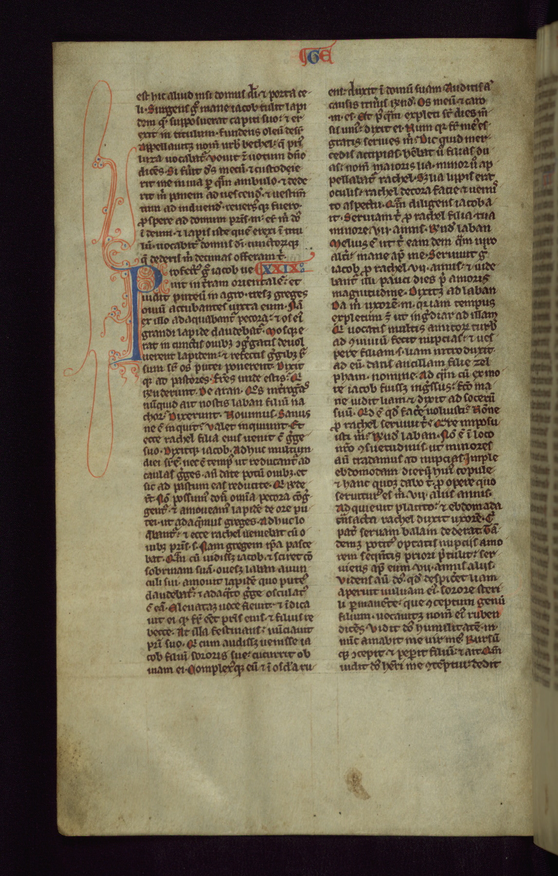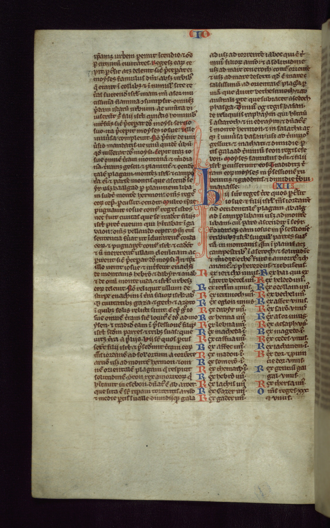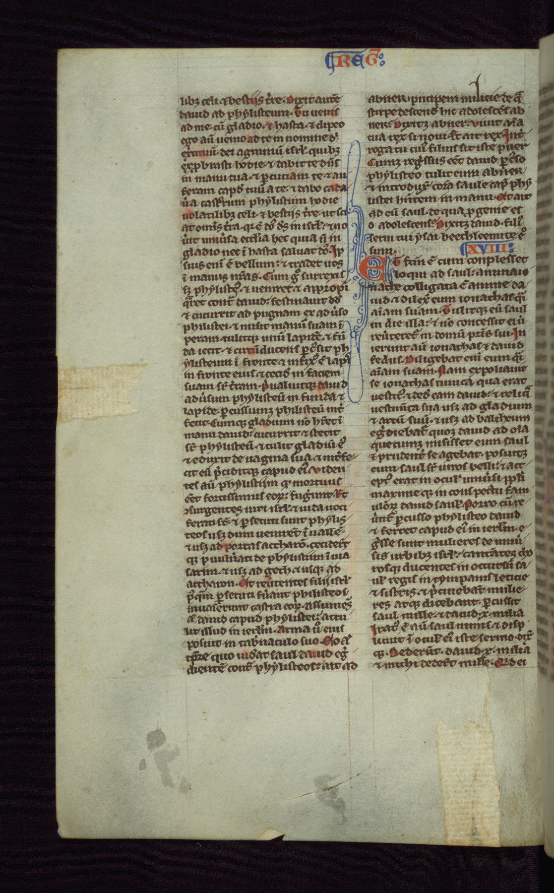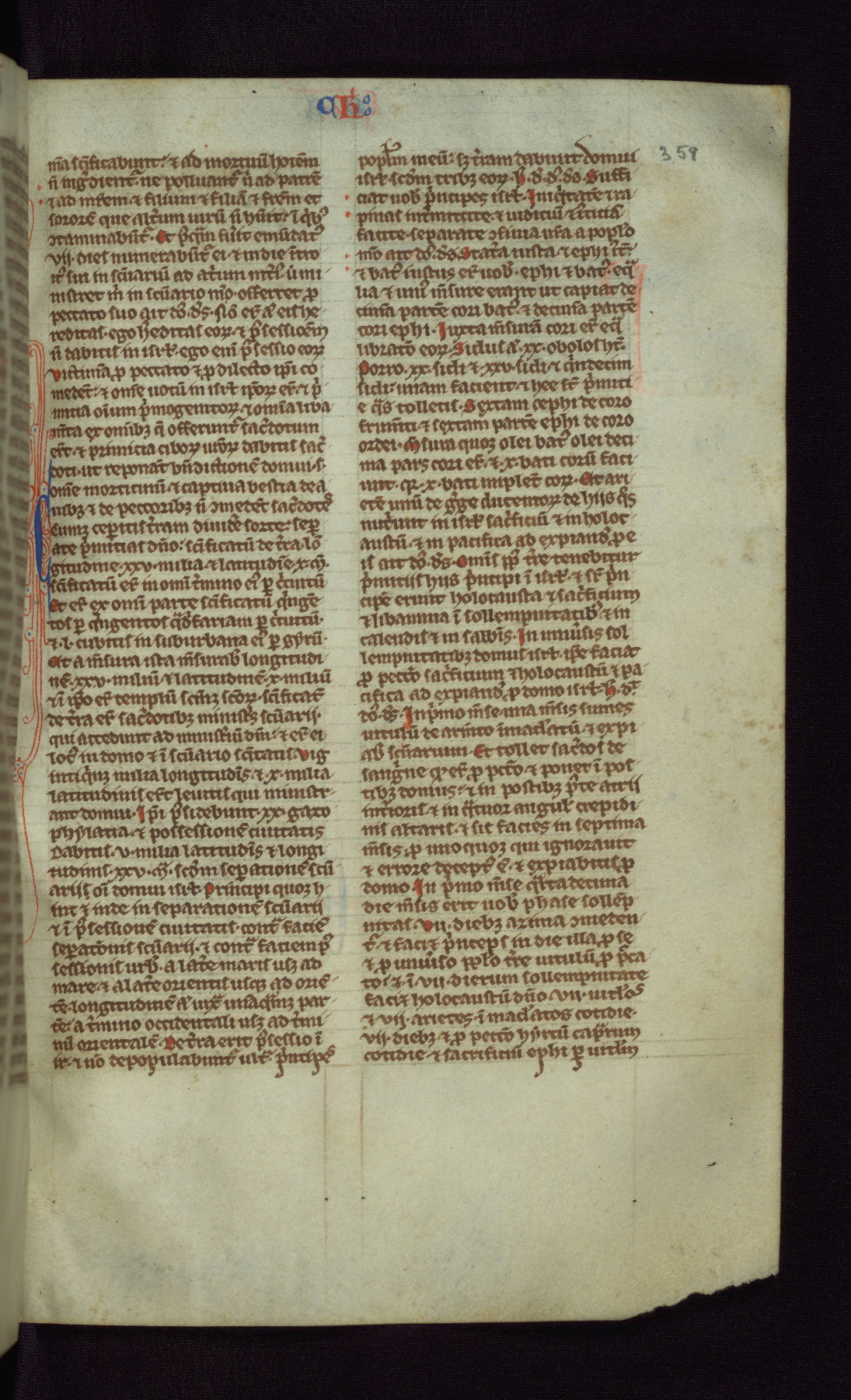 This pocket-size Bible was created around the middle of the thirteenth century in England. It contains the Vulgate text of the Old and New Testaments, arranged in order and divided into chapters. Such Bibles, designed for individual rather than institutional use, began to be created on a large scale during the thirteenth century, especially in Paris. This manuscript is illuminated with a large number of small historiated initials, and also includes a somewhat later image of the Three Living and the Three Dead, a popular scene based on a French poem of the same century.